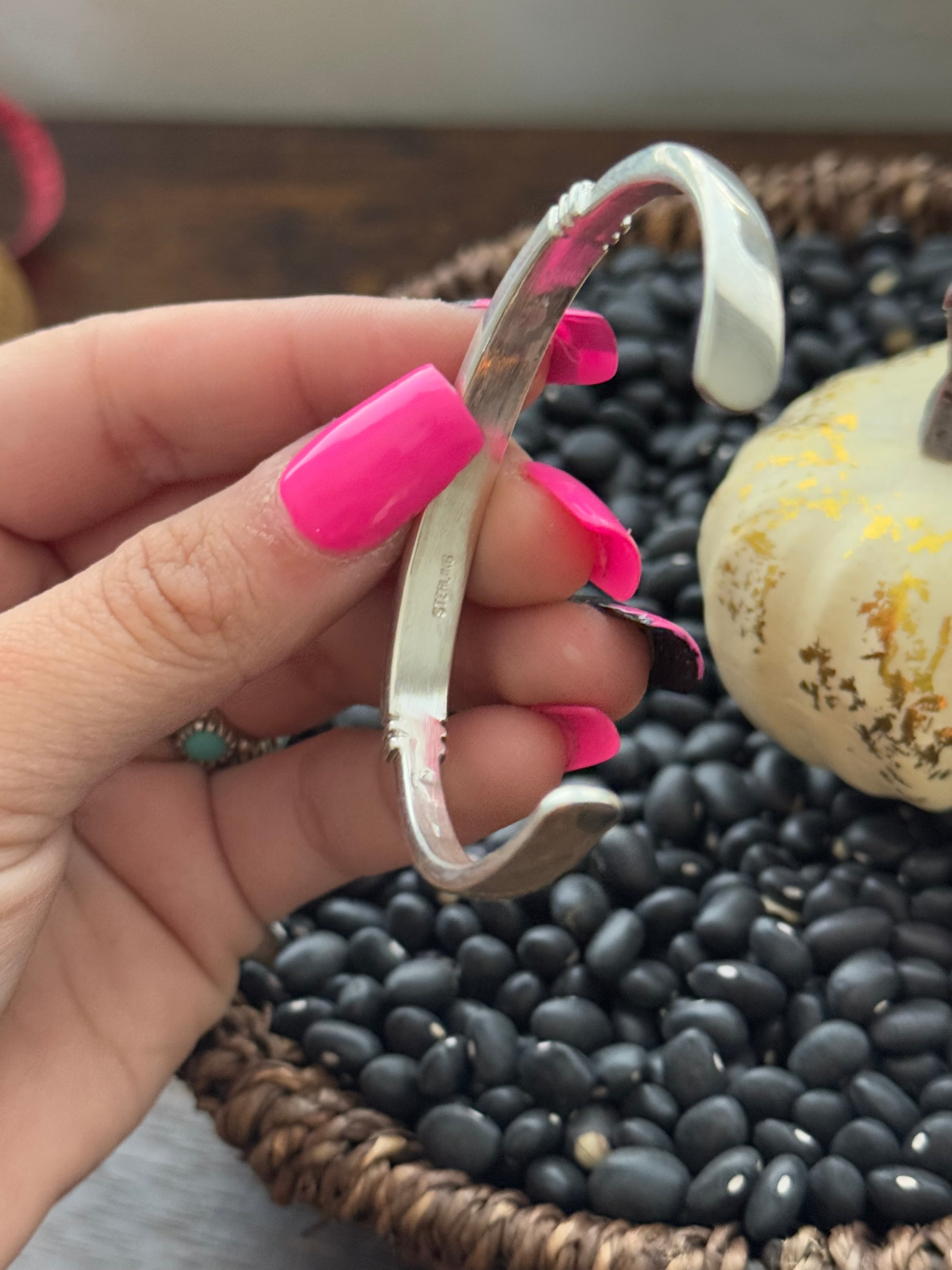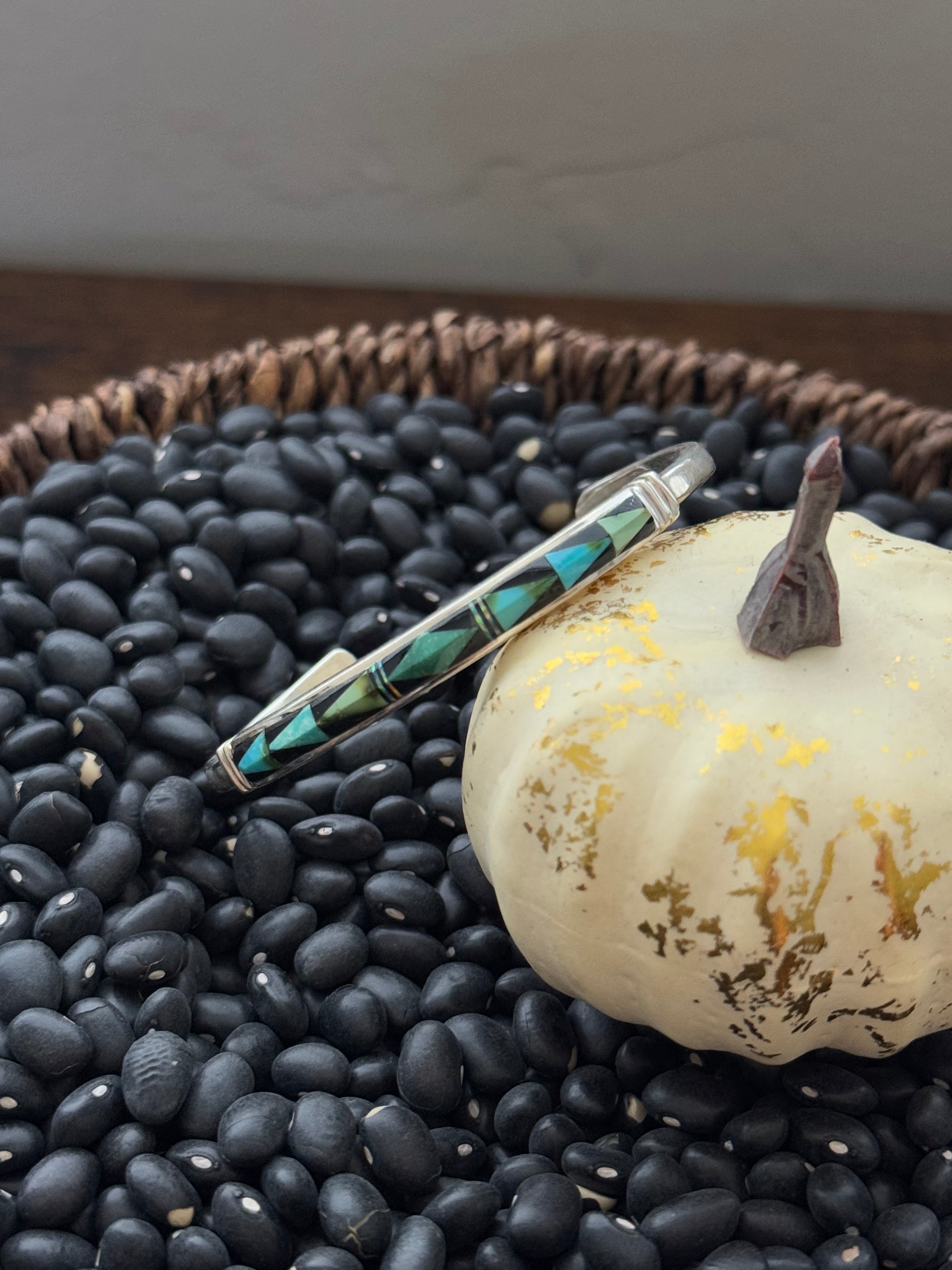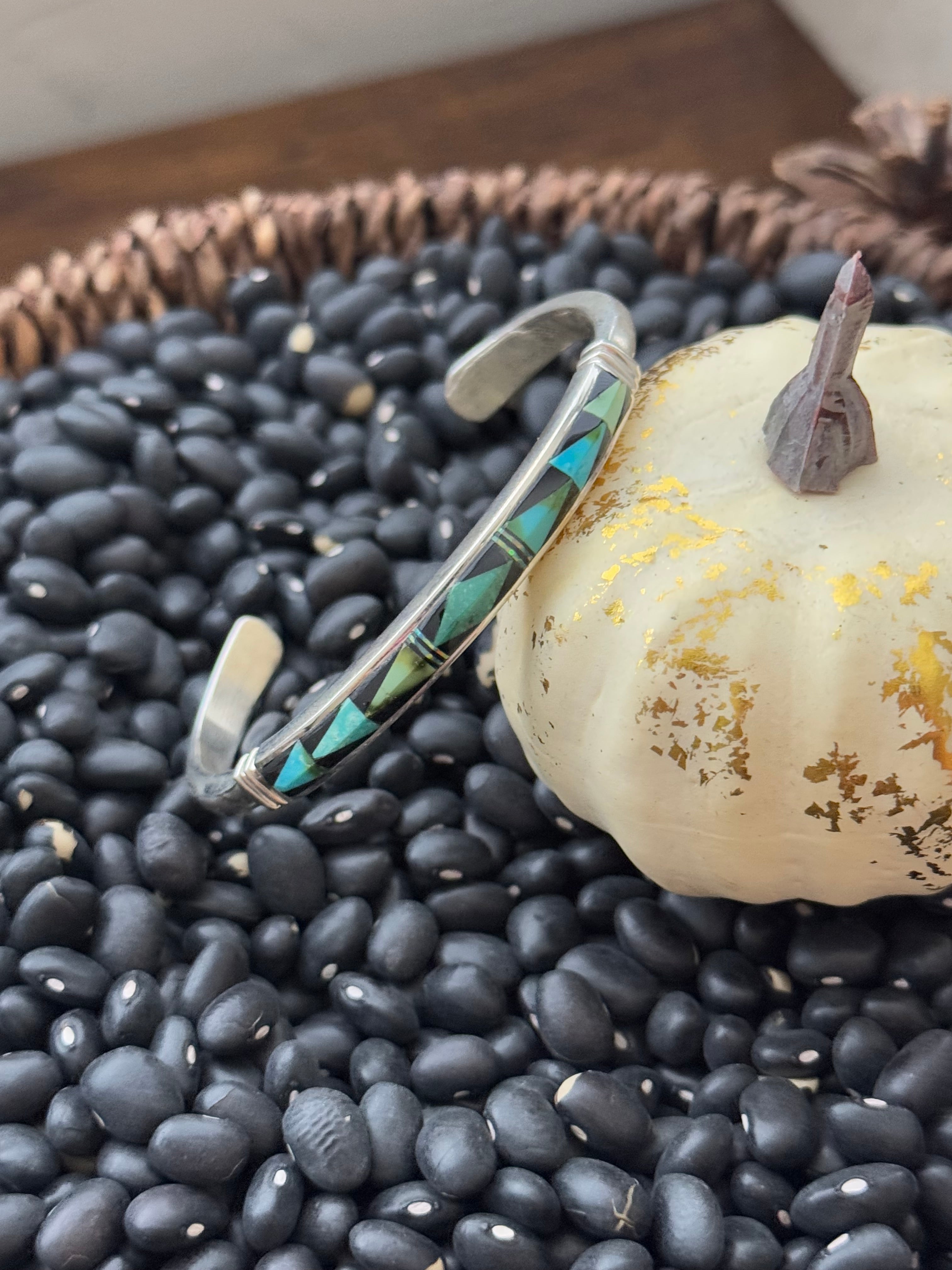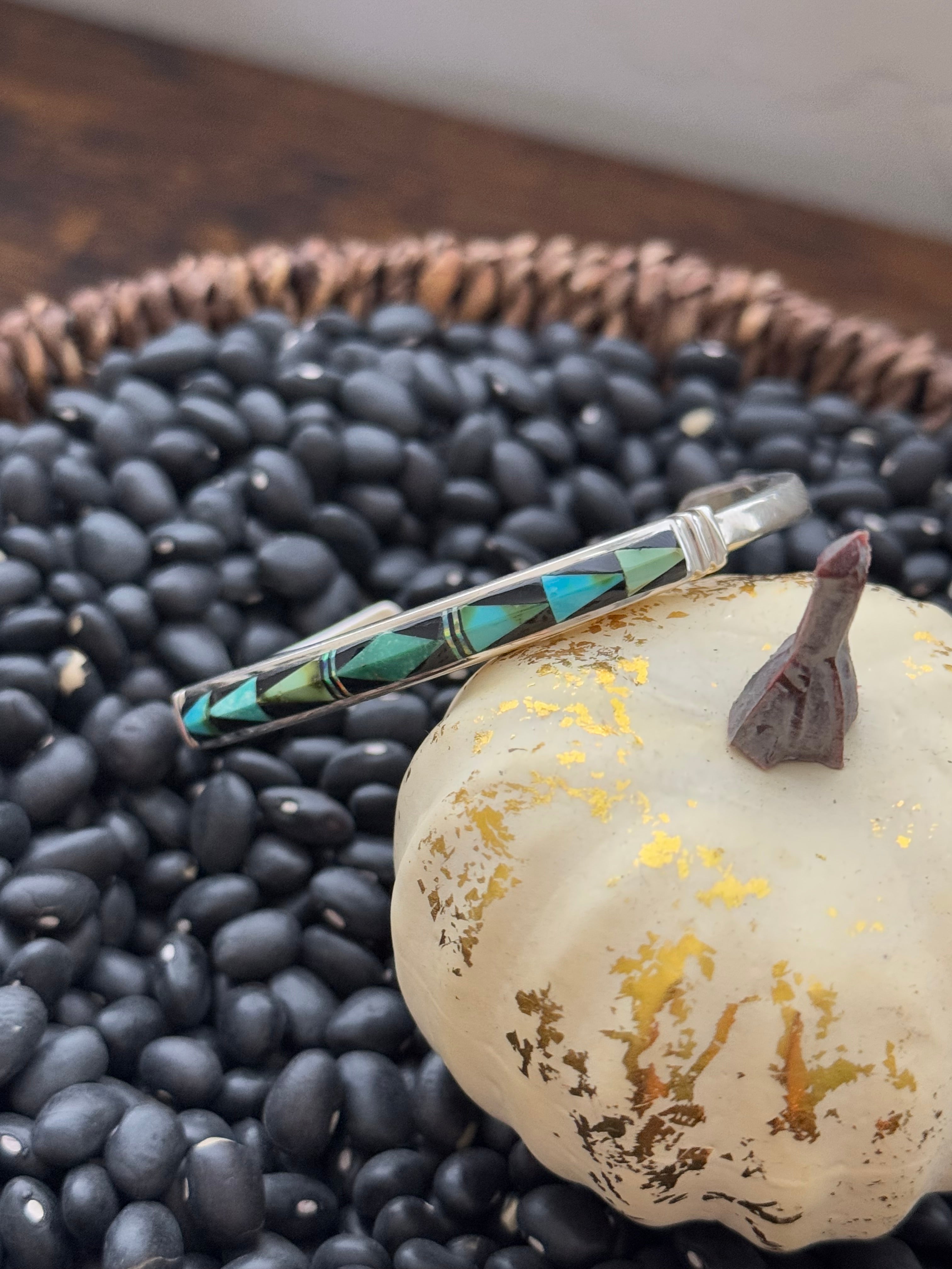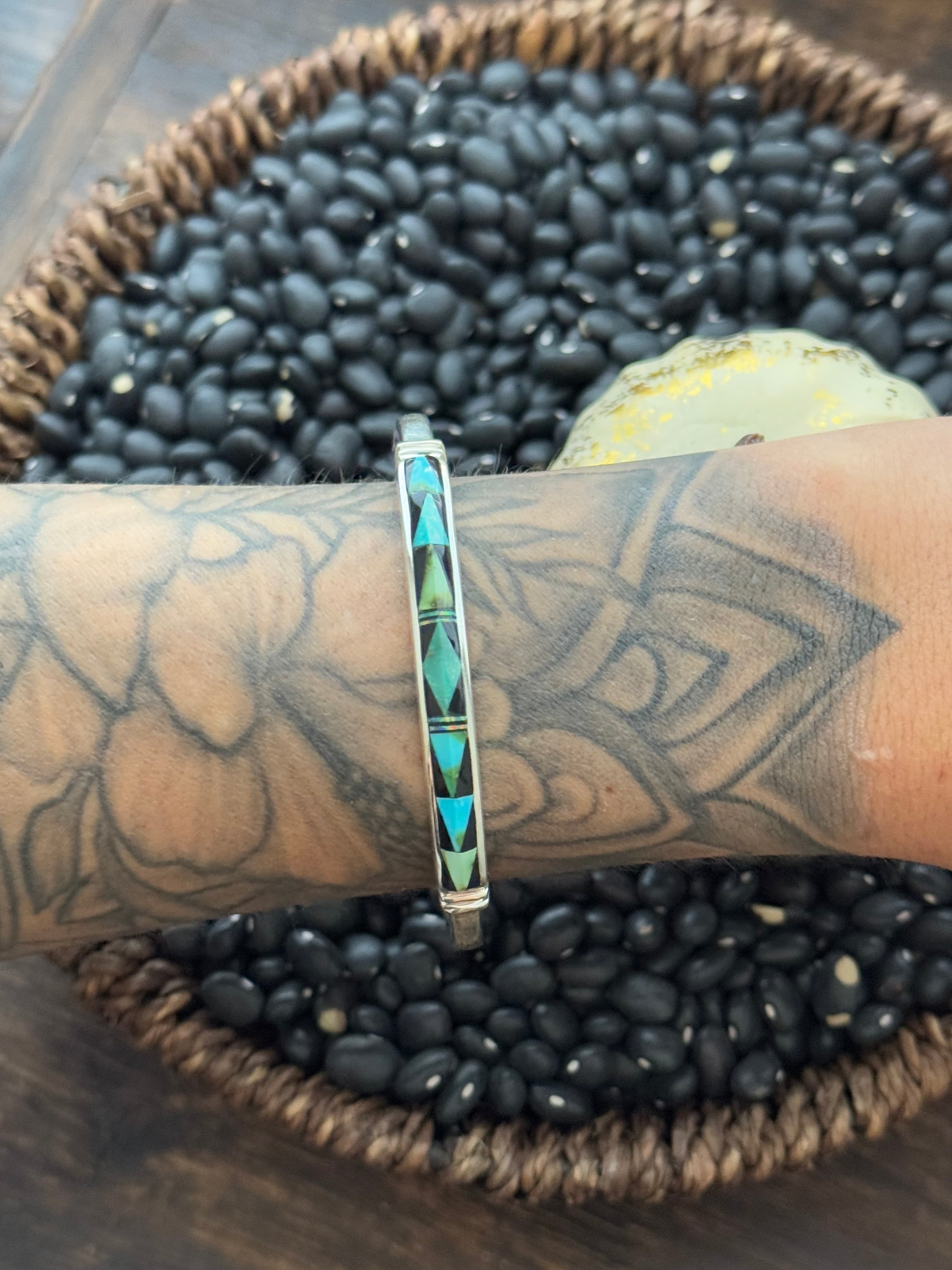 Rick Tolino Multi Stone & Sterling Silver Inlay Cuff Bracelet. It measures 1/4 of an inch wide with an inside circumference of 5 inches and a gap of 1 1/4 inches. Signed by artist and stamped sterling silver.