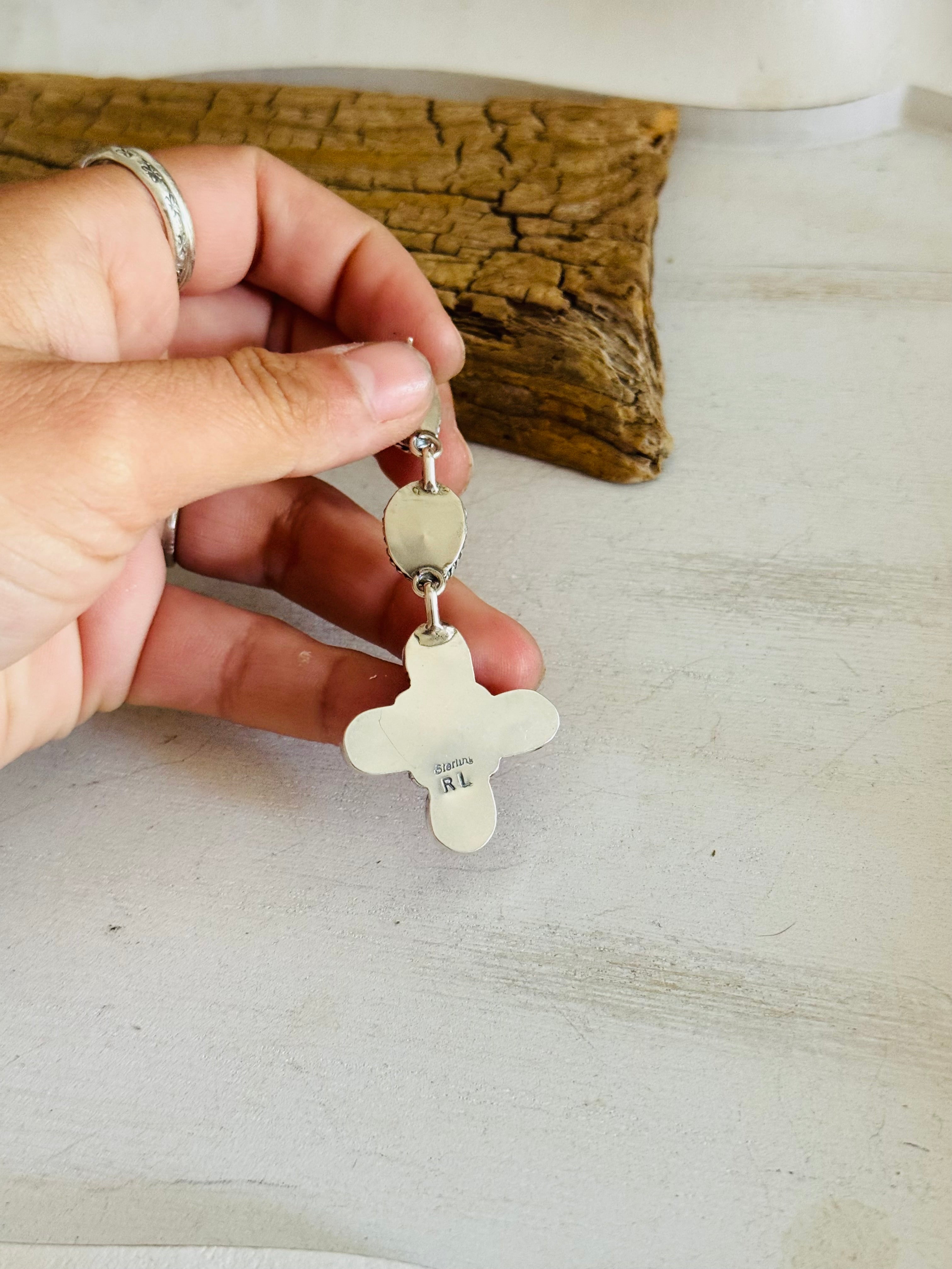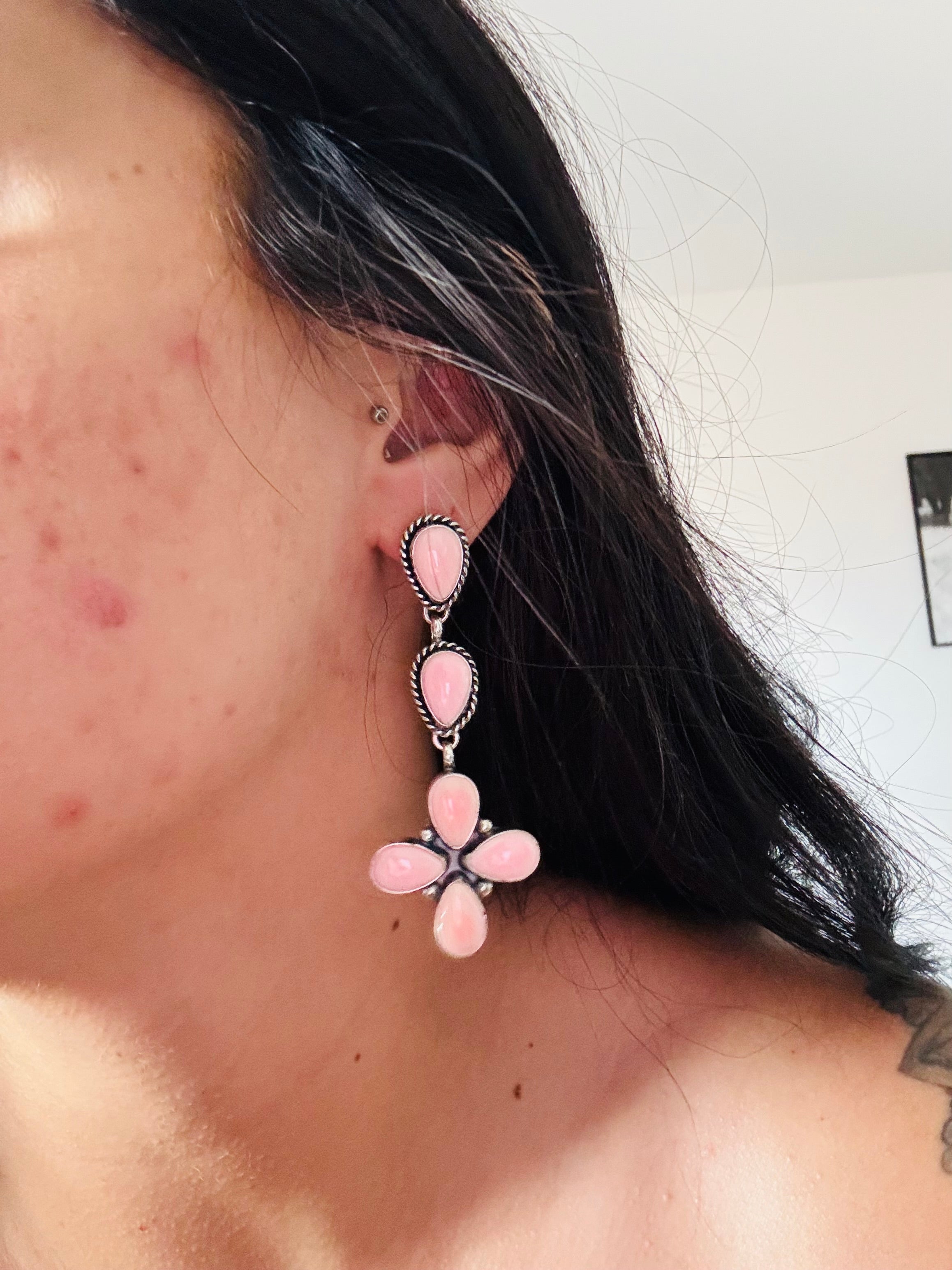 Rita Lee Pink Conch & Sterling Silver Post Dangle Cluster Earrings. It measures 2 7/8 inches long and just over 1 1/8 inches wide. Signed by artist and stamped sterling silver.