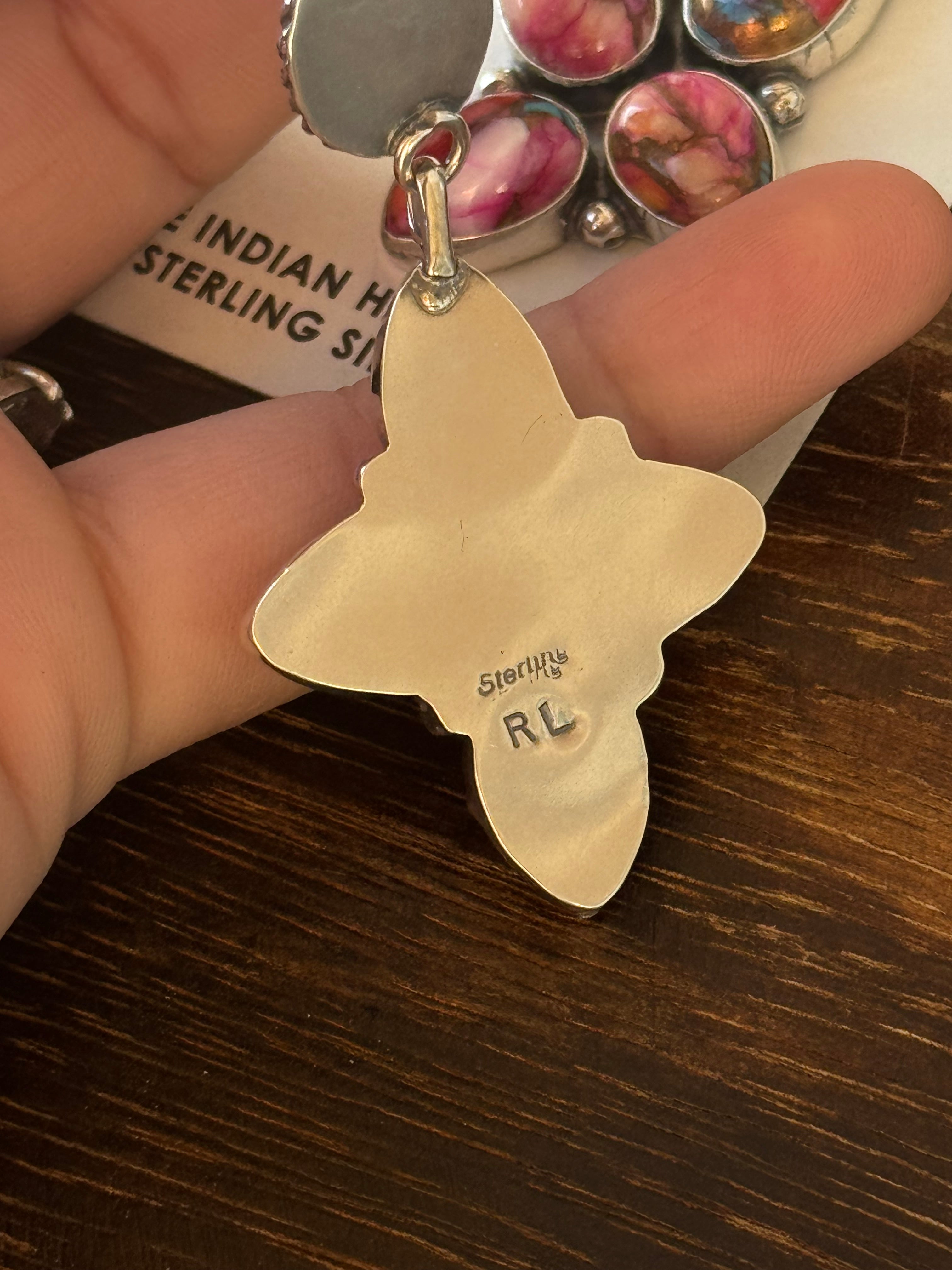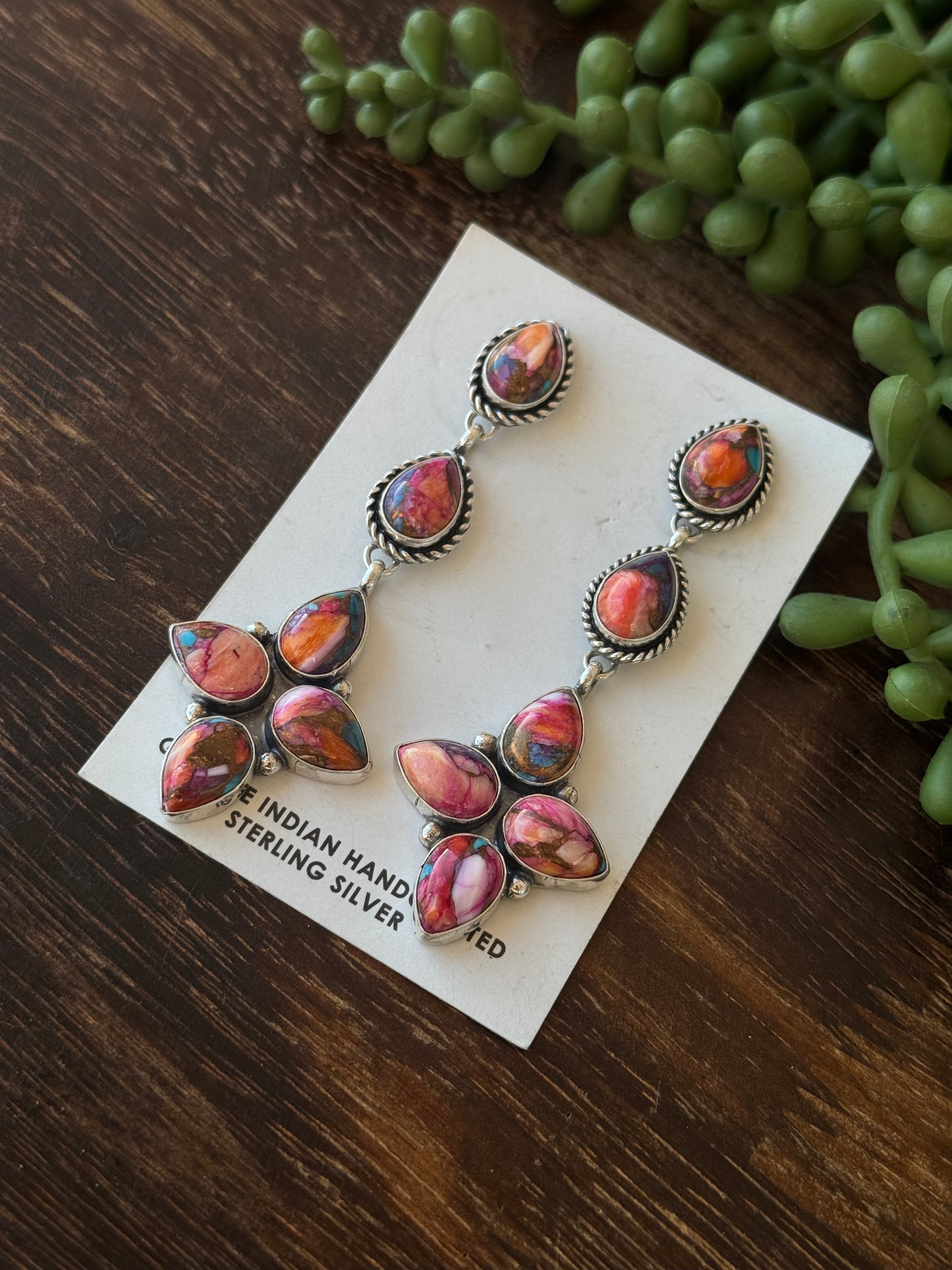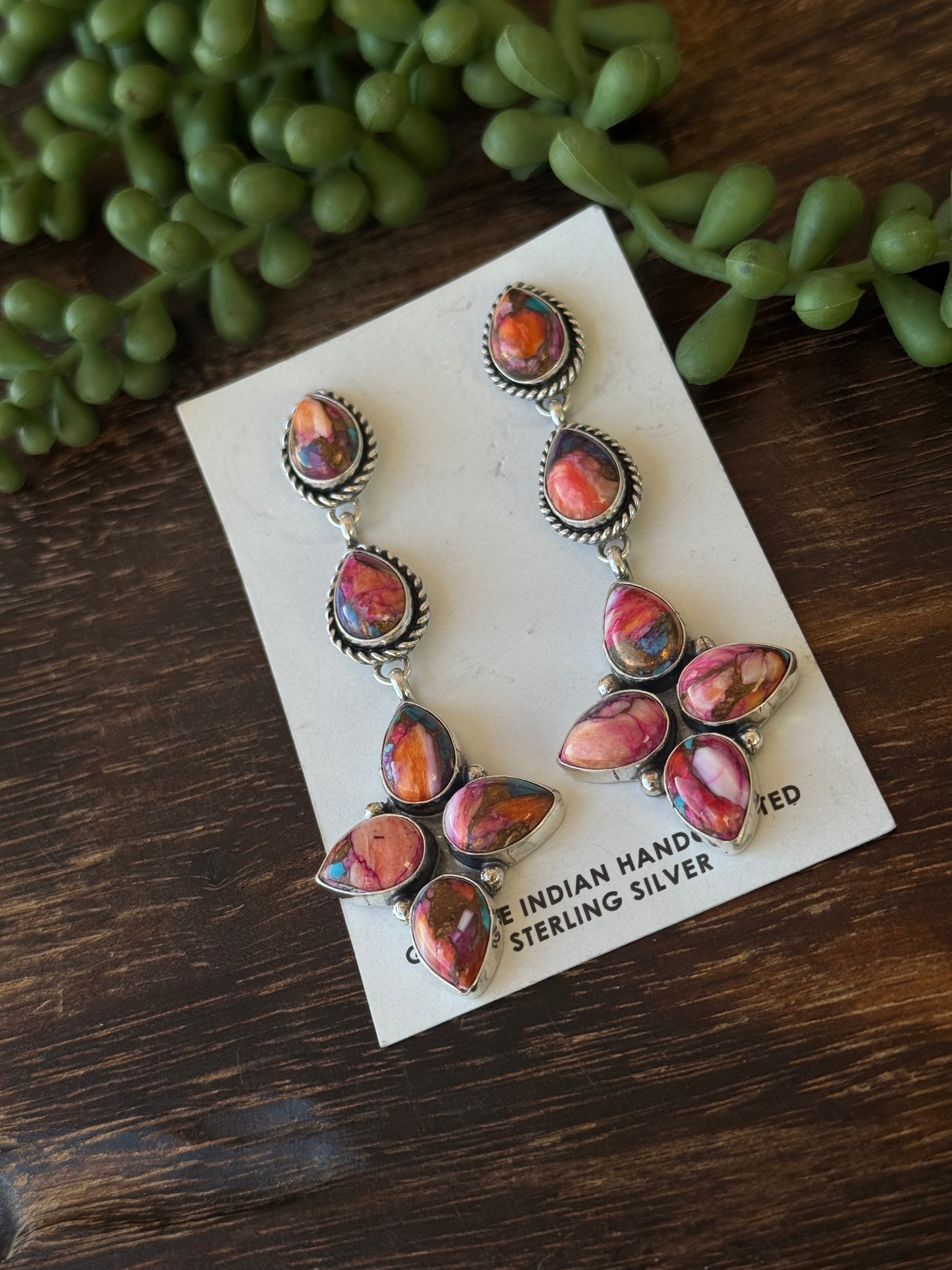 Ronald Lee Pink Mohave Turquoise & Sterling Silver Post Earrings. They measure 3 3/8 inches long and 1 1/8 inches wide. Signed by the artist and stamped sterling silver.