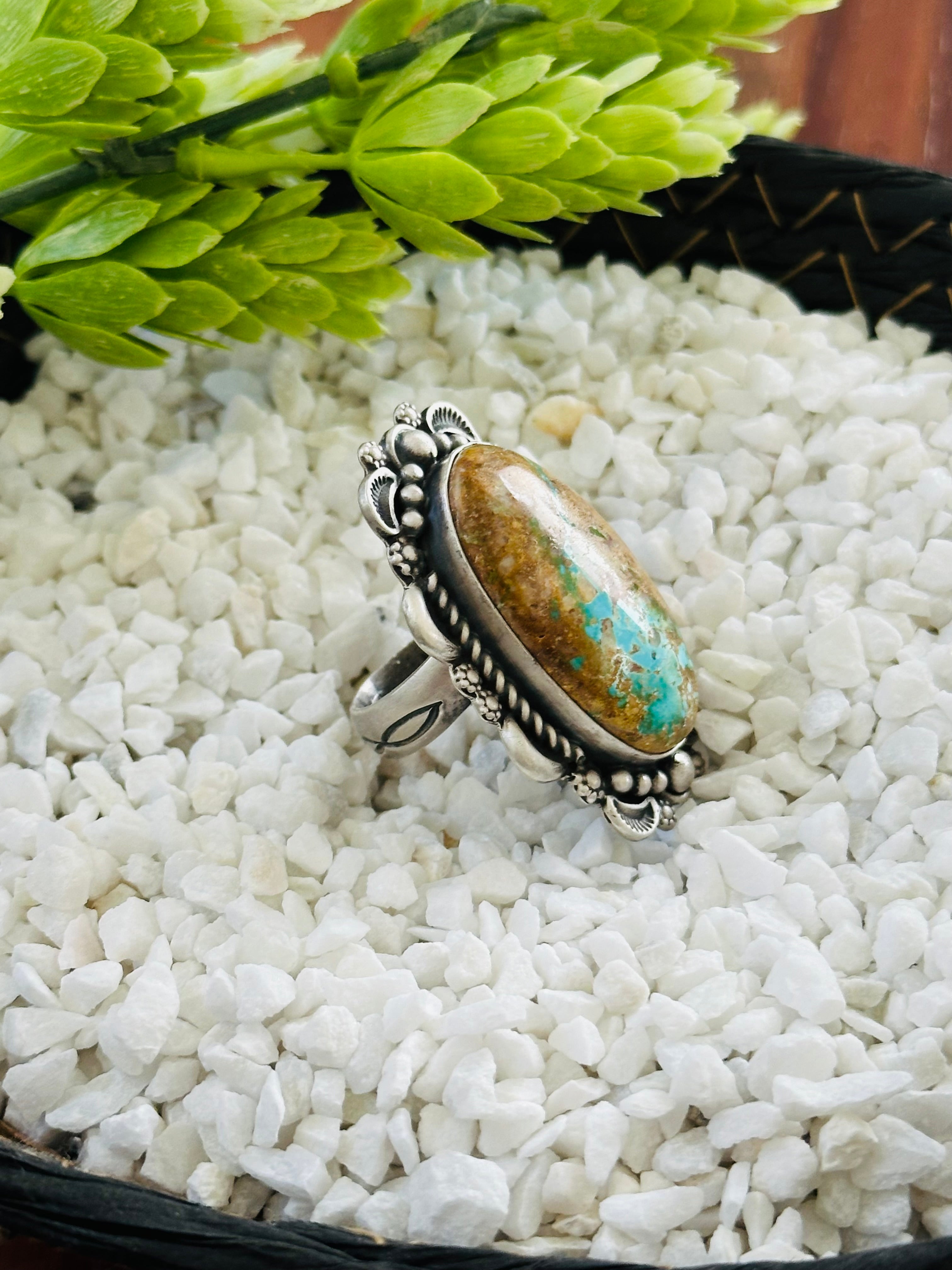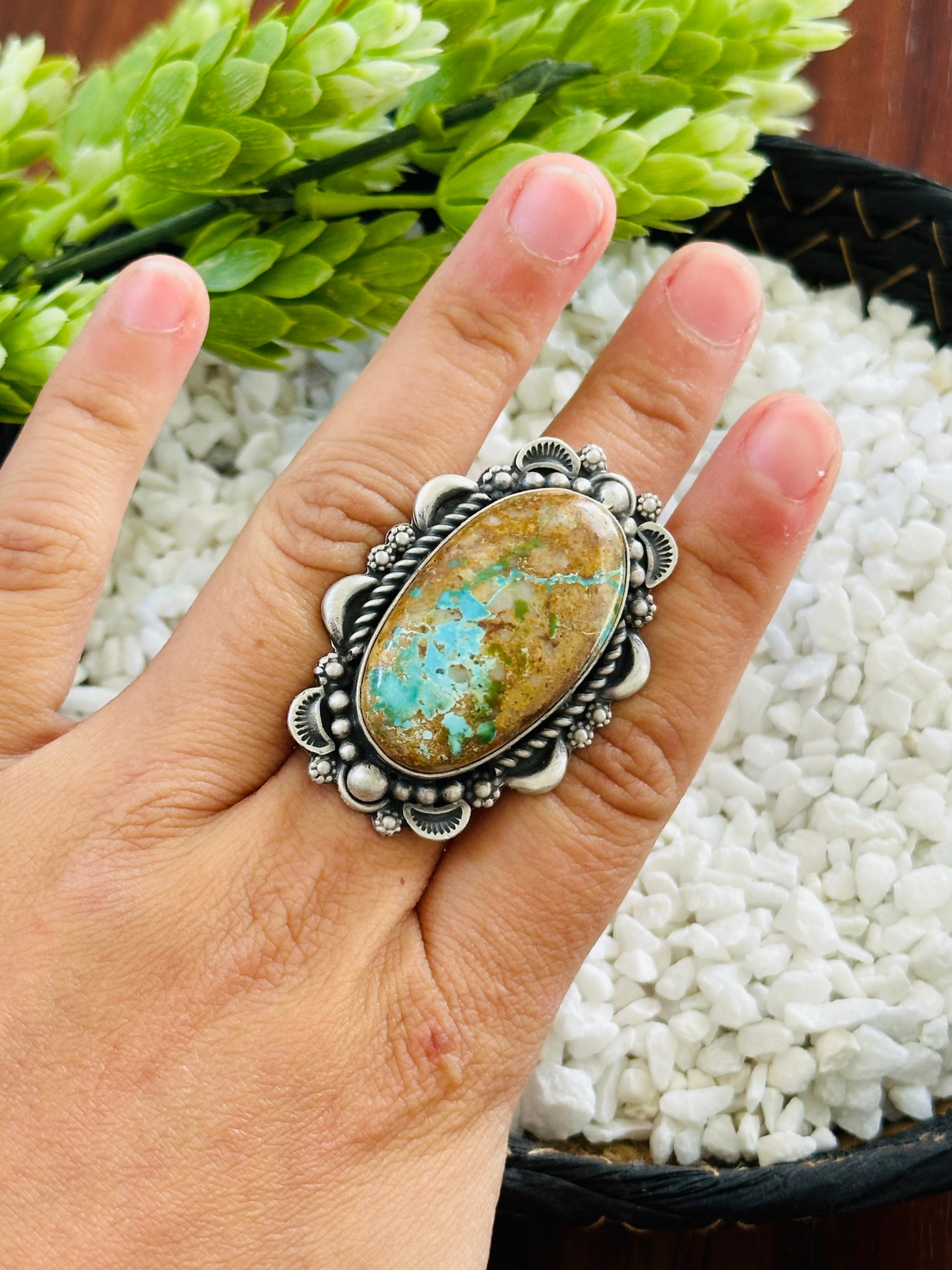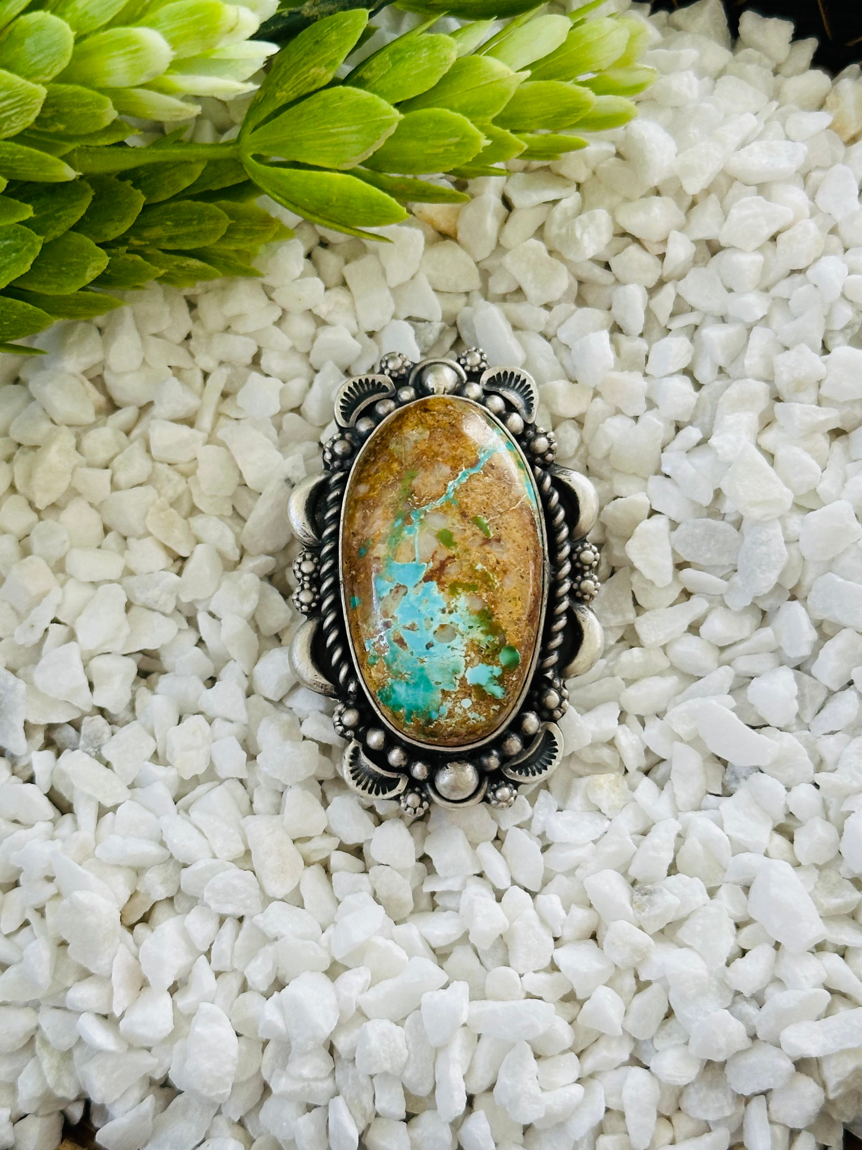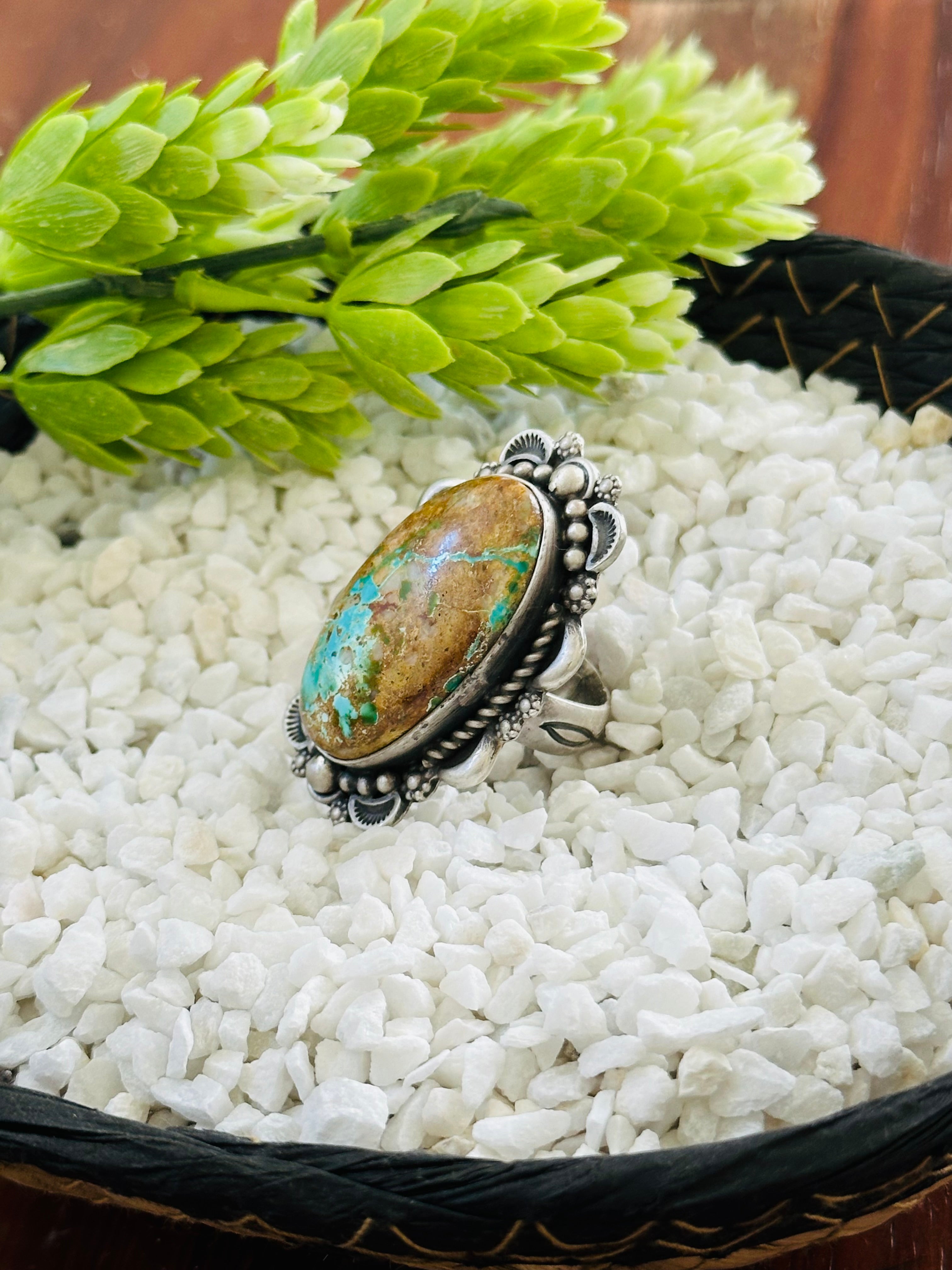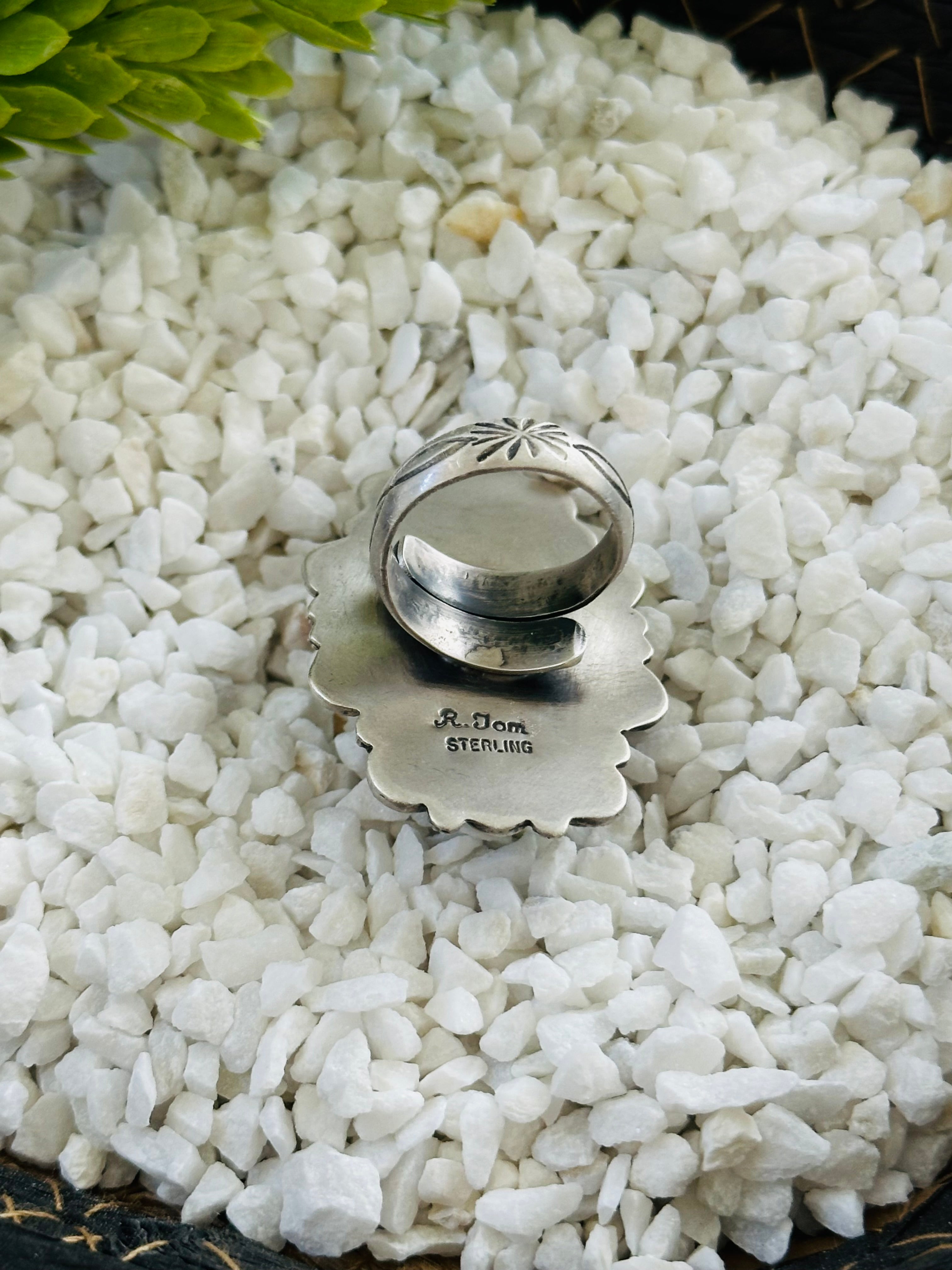 Beautiful ring. Ronald Tom Royston Turquoise & Sterling Silver Adjustable Ring. It measures 1 7/8 inches long and 1 1/4 inches wide. Signed by the artist and stamped sterling silver.