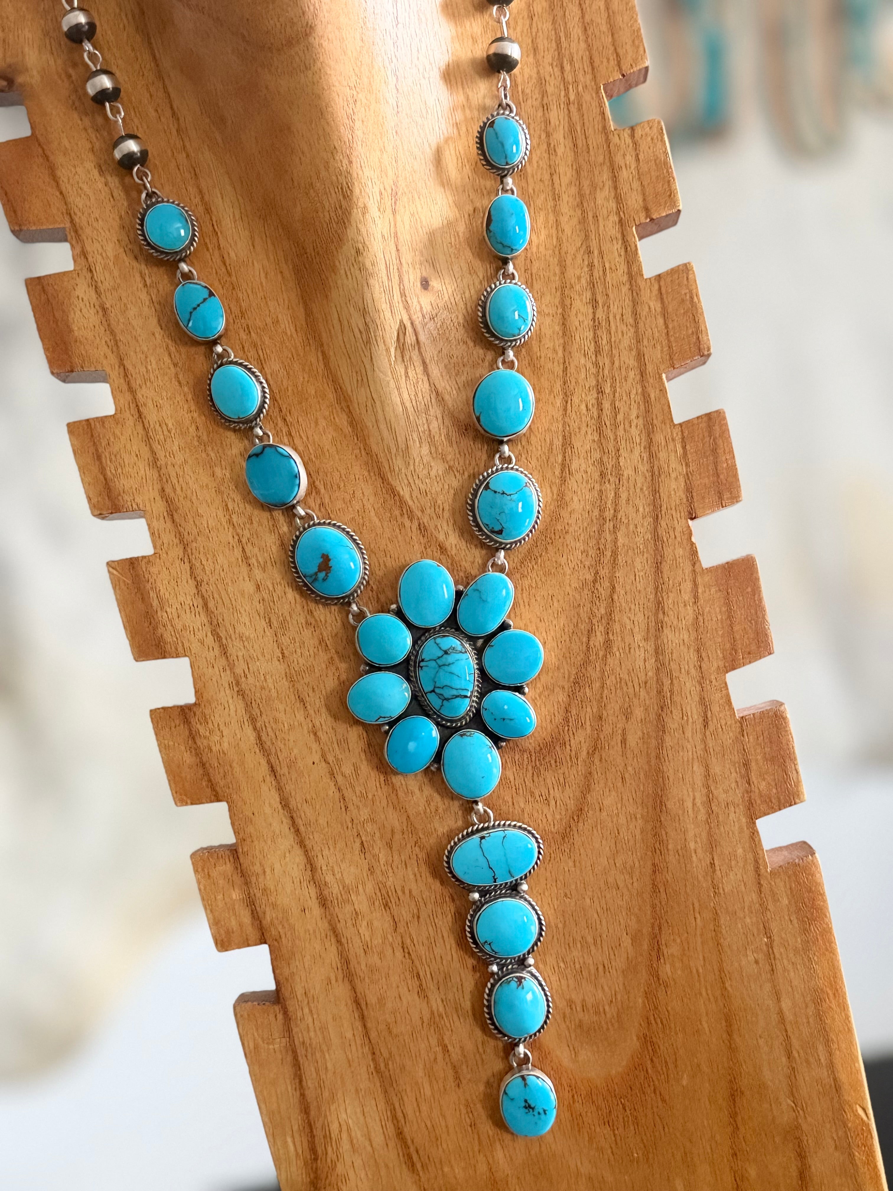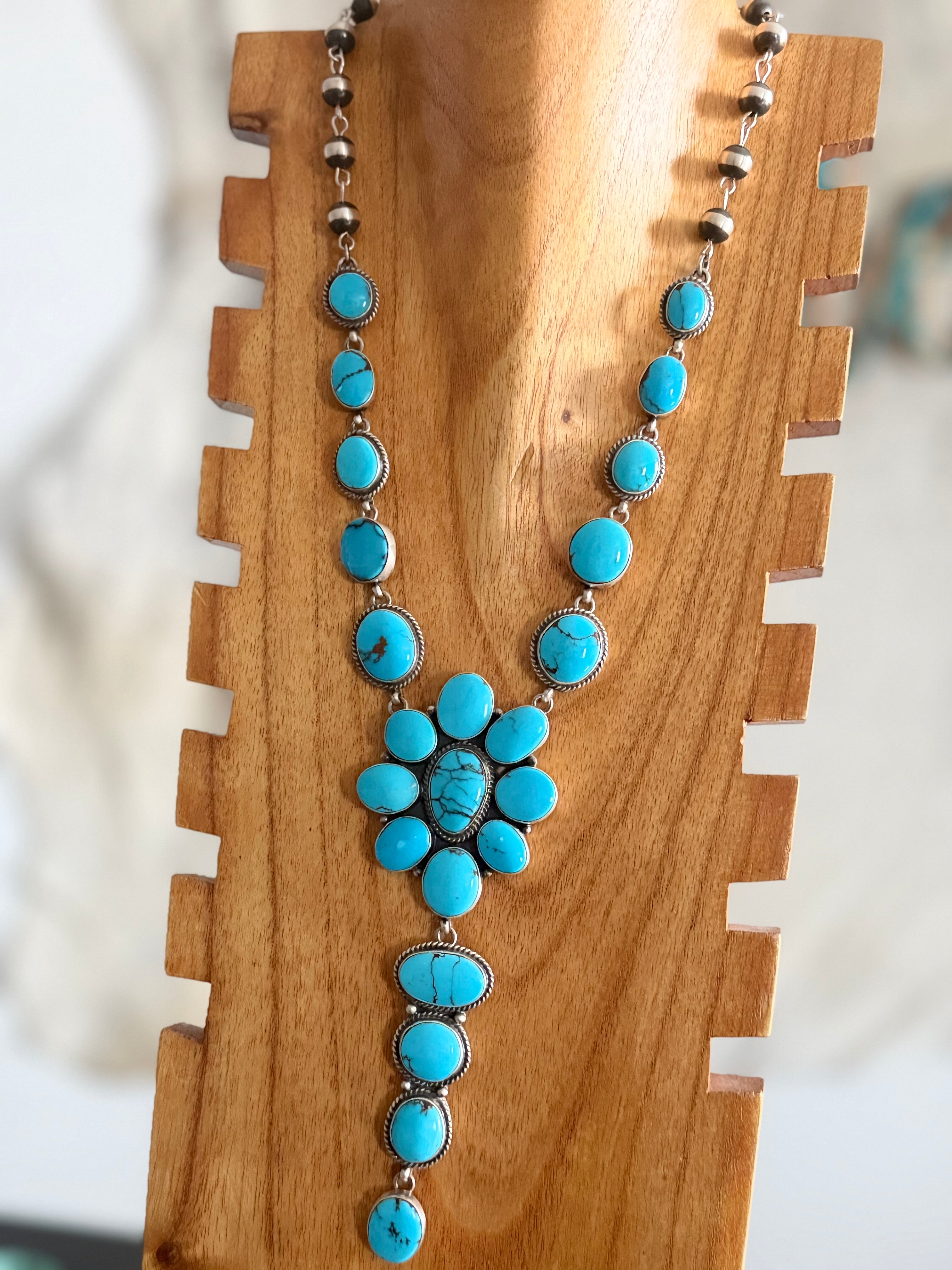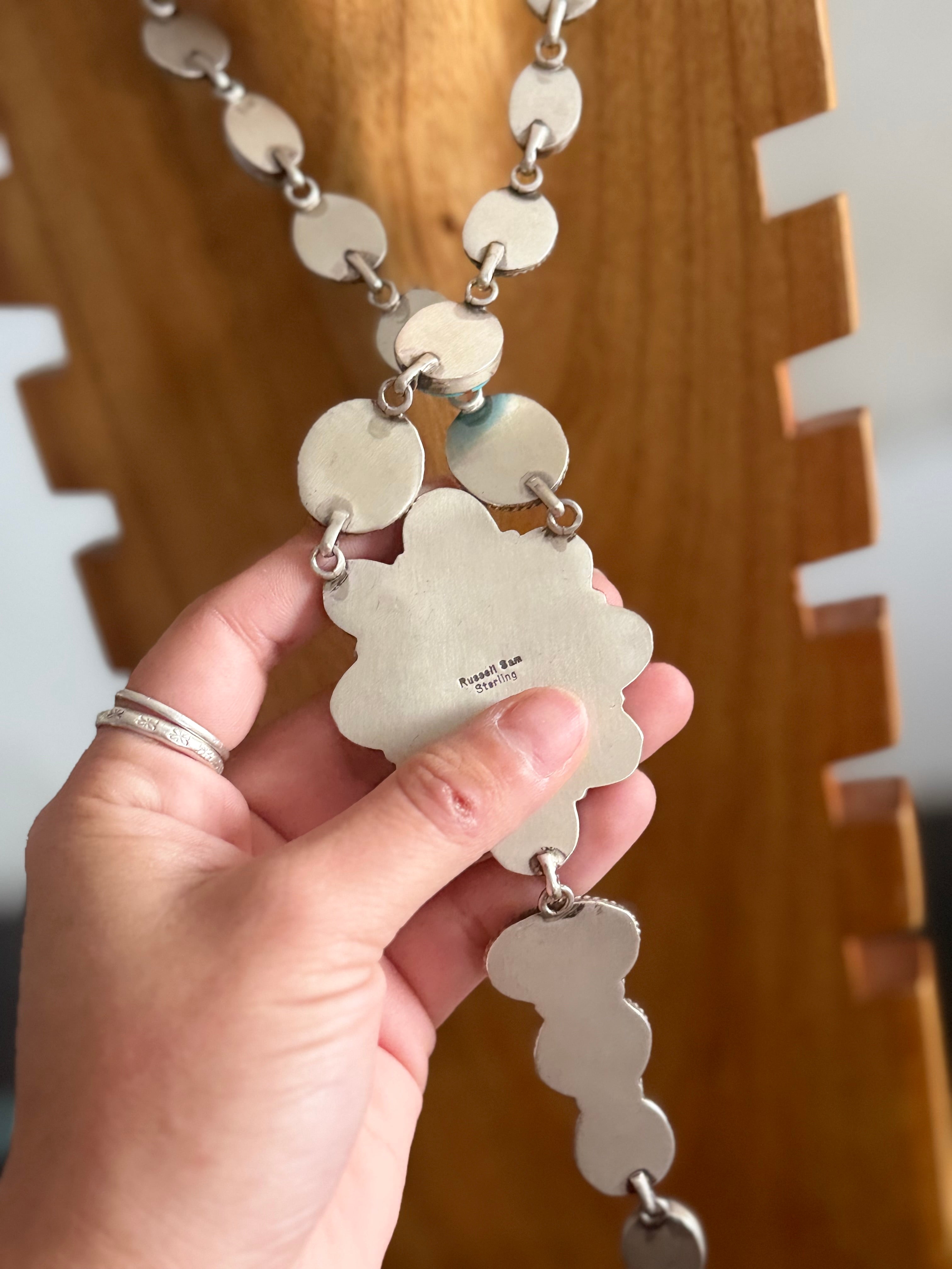 Russell Sam Egyptian Turquoise & Sterling Silver Lariat Necklace Set. It measures 30 inches long while the chain alone measures 20 inches. Signed by the artist and stamped sterling silver.