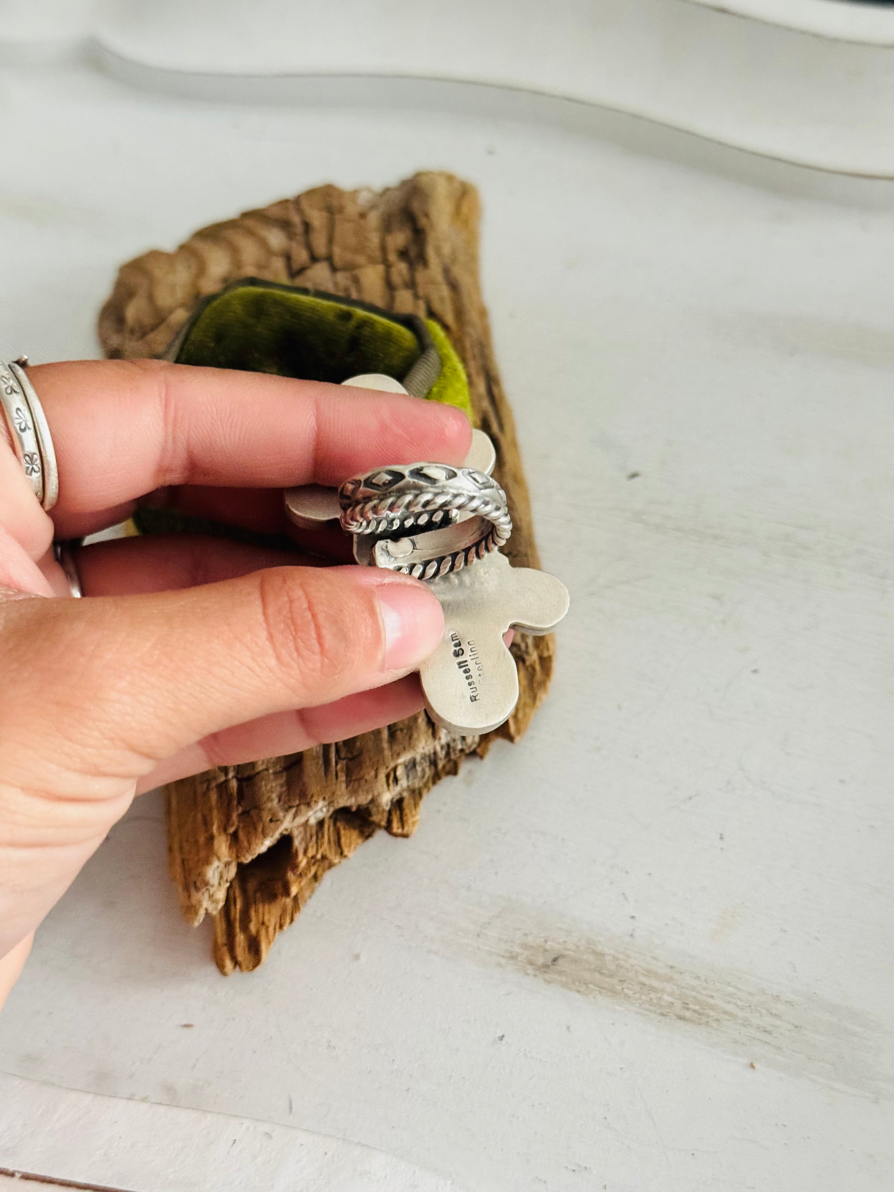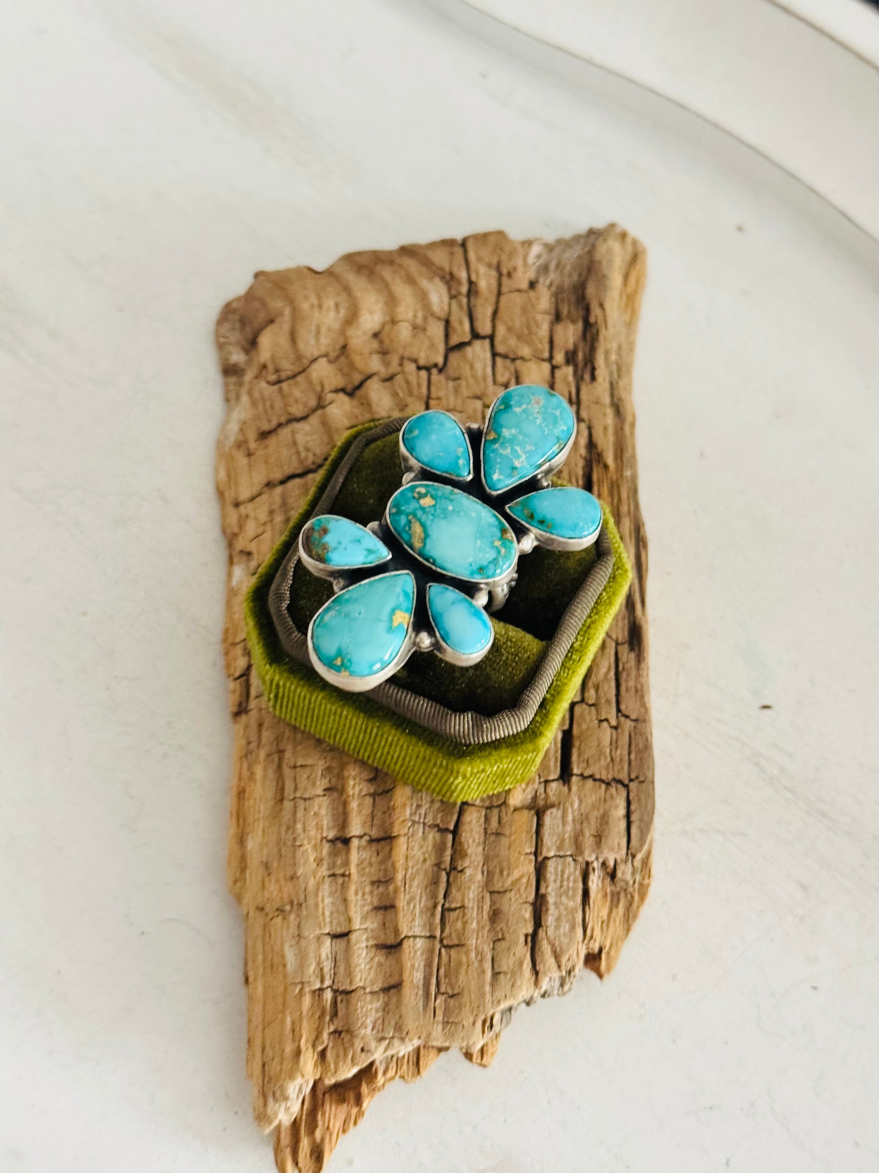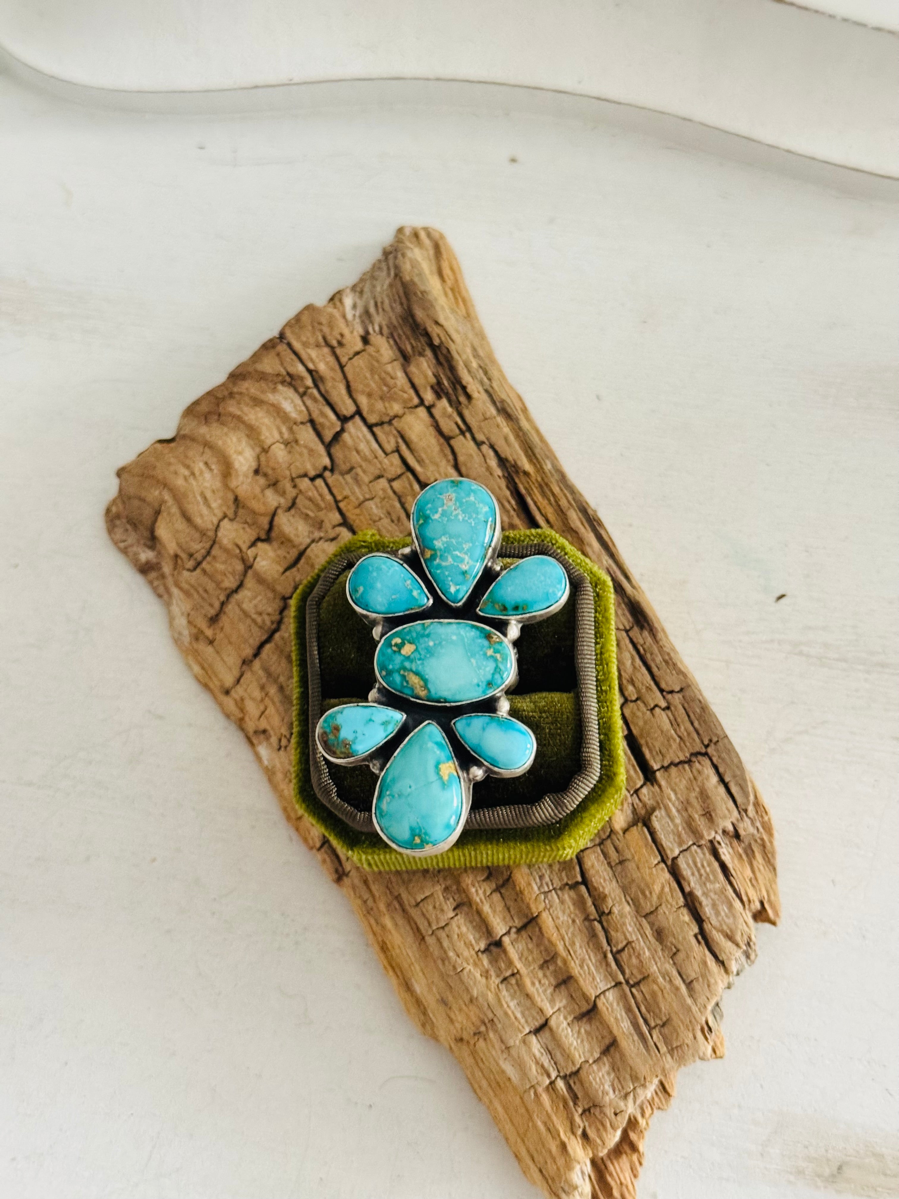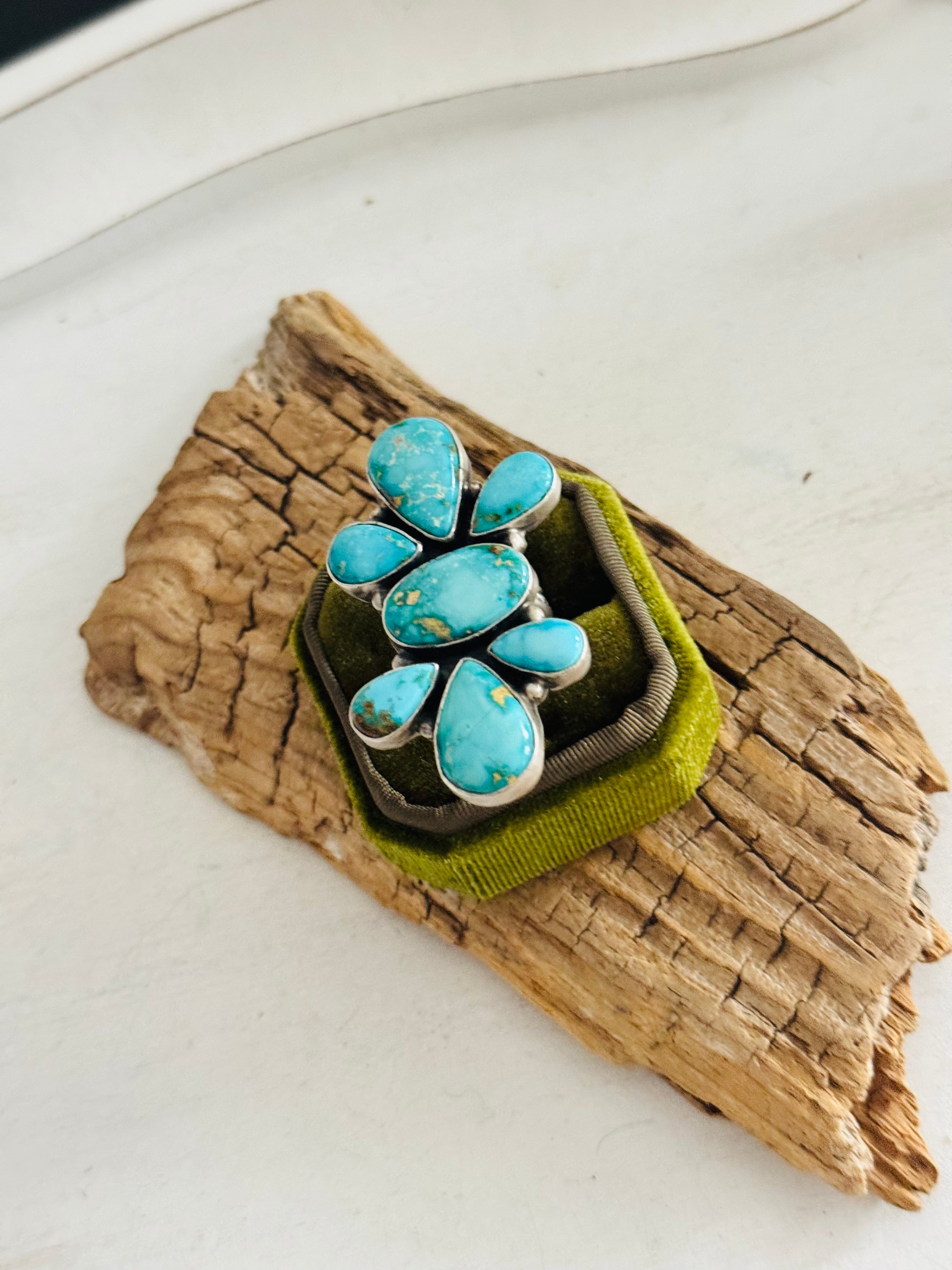 Russell Sam Sonoran Mountain Turquoise & Sterling Silver Adjustable Cluster Ring. It measures 2 1/8 inches long and 1 1/4 inches wide. Signed by the artist and stamped sterling silver.