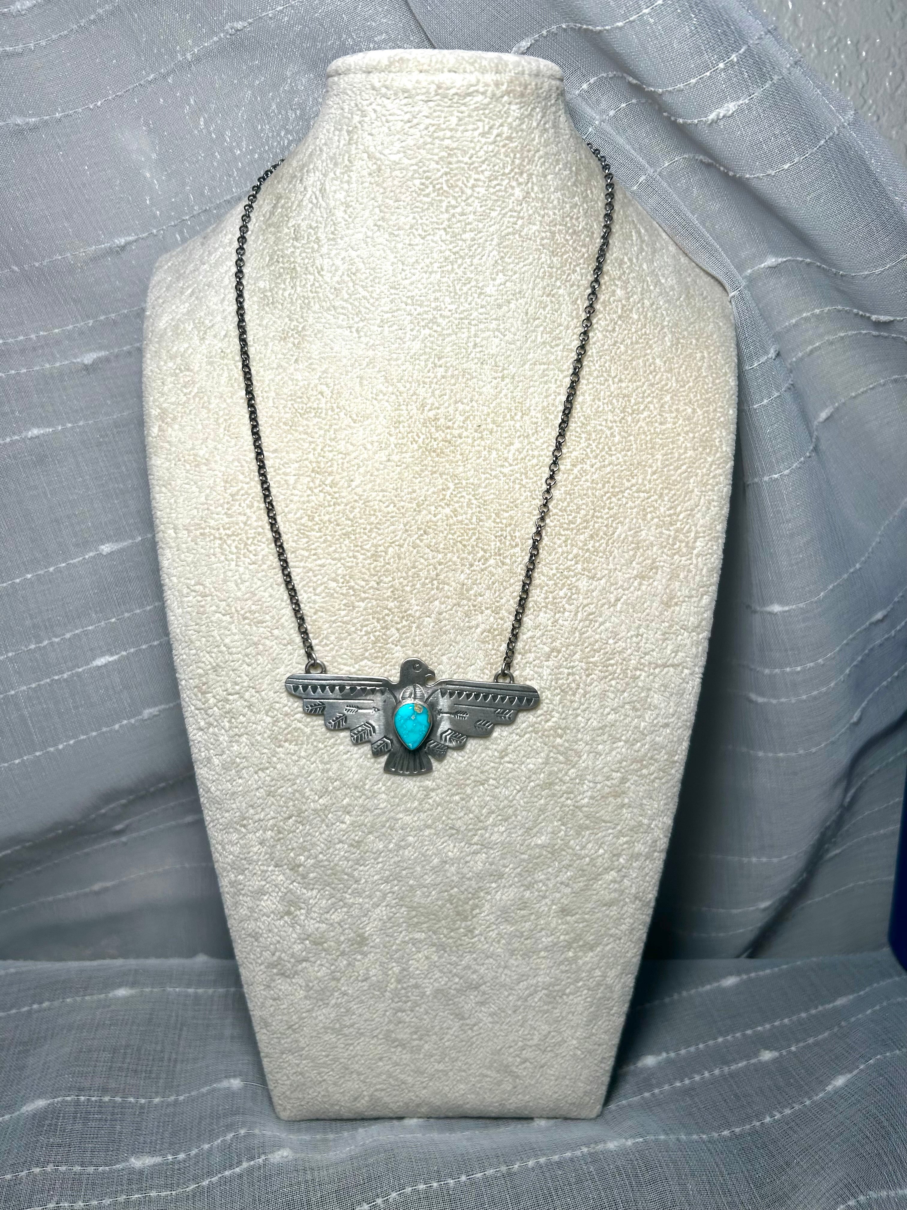 Russell Sam Royston Turquoise & Sterling Silver Necklace. It measures 21 inches long with hang while the chain measures 19 inches long. Signed by the artist and stamped sterling silver.