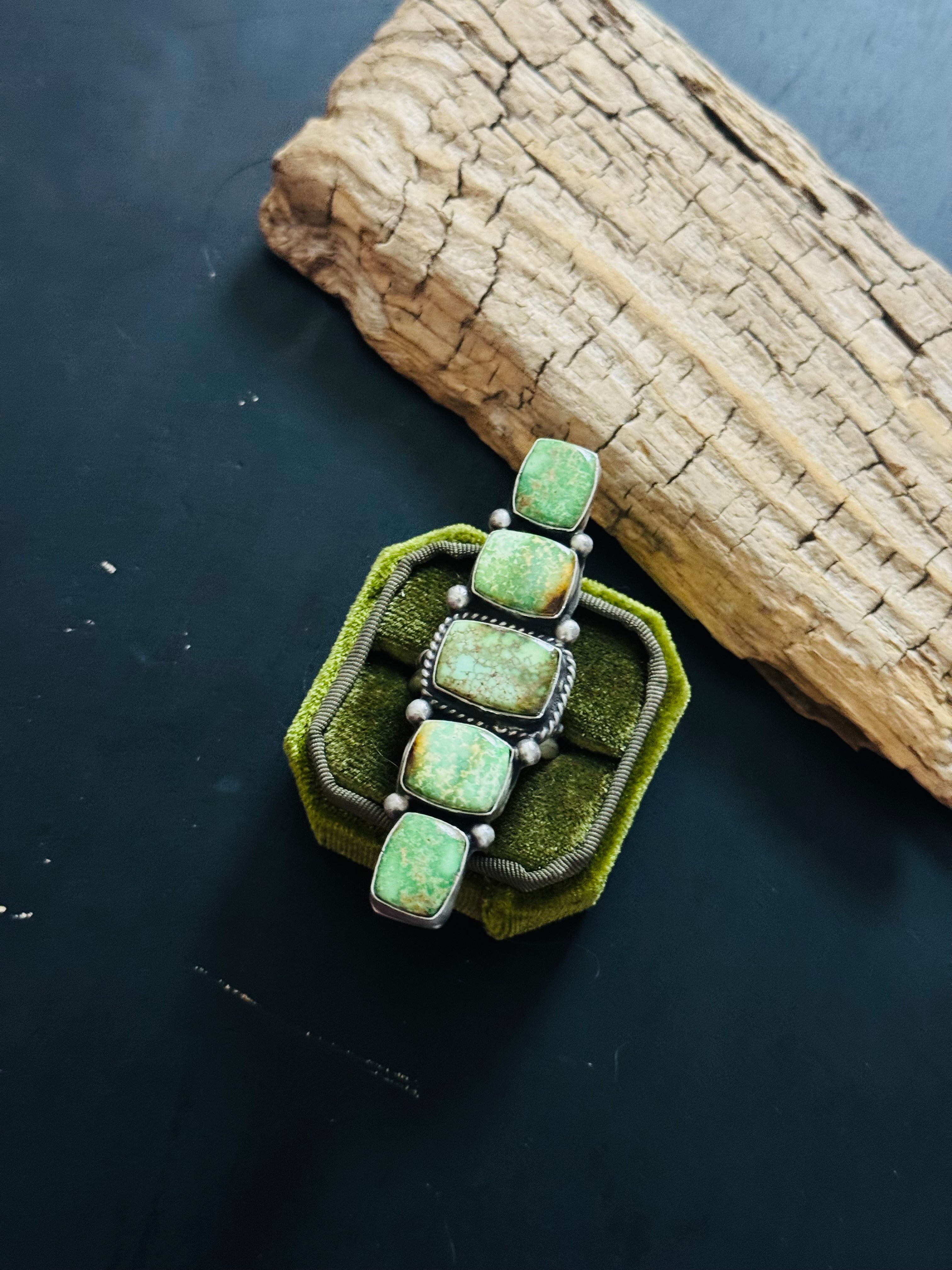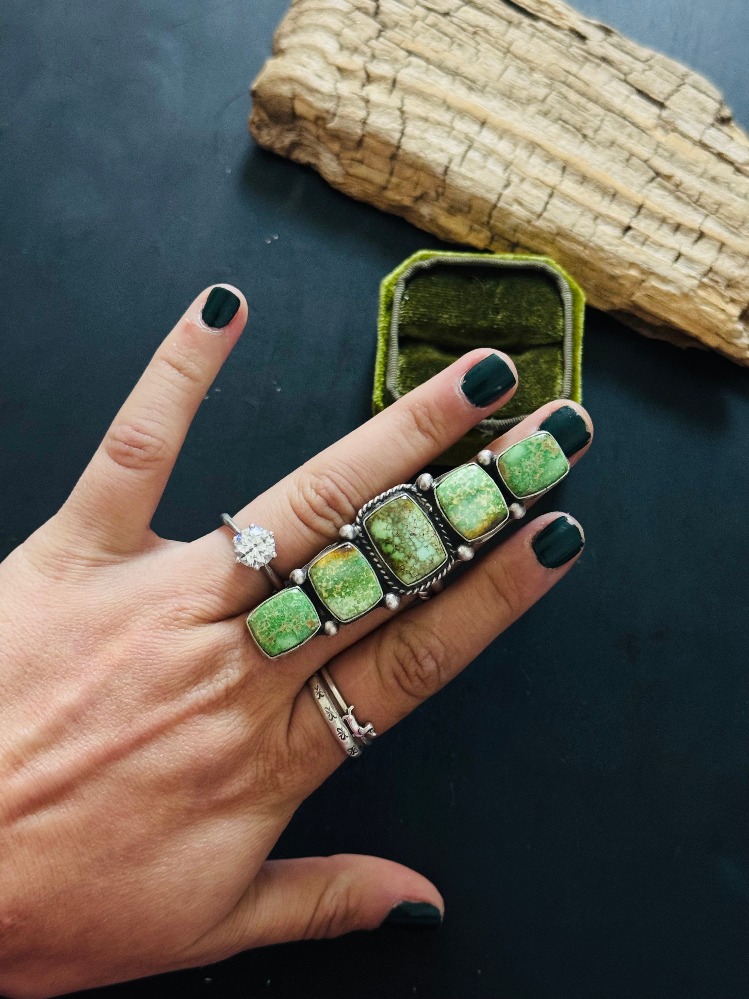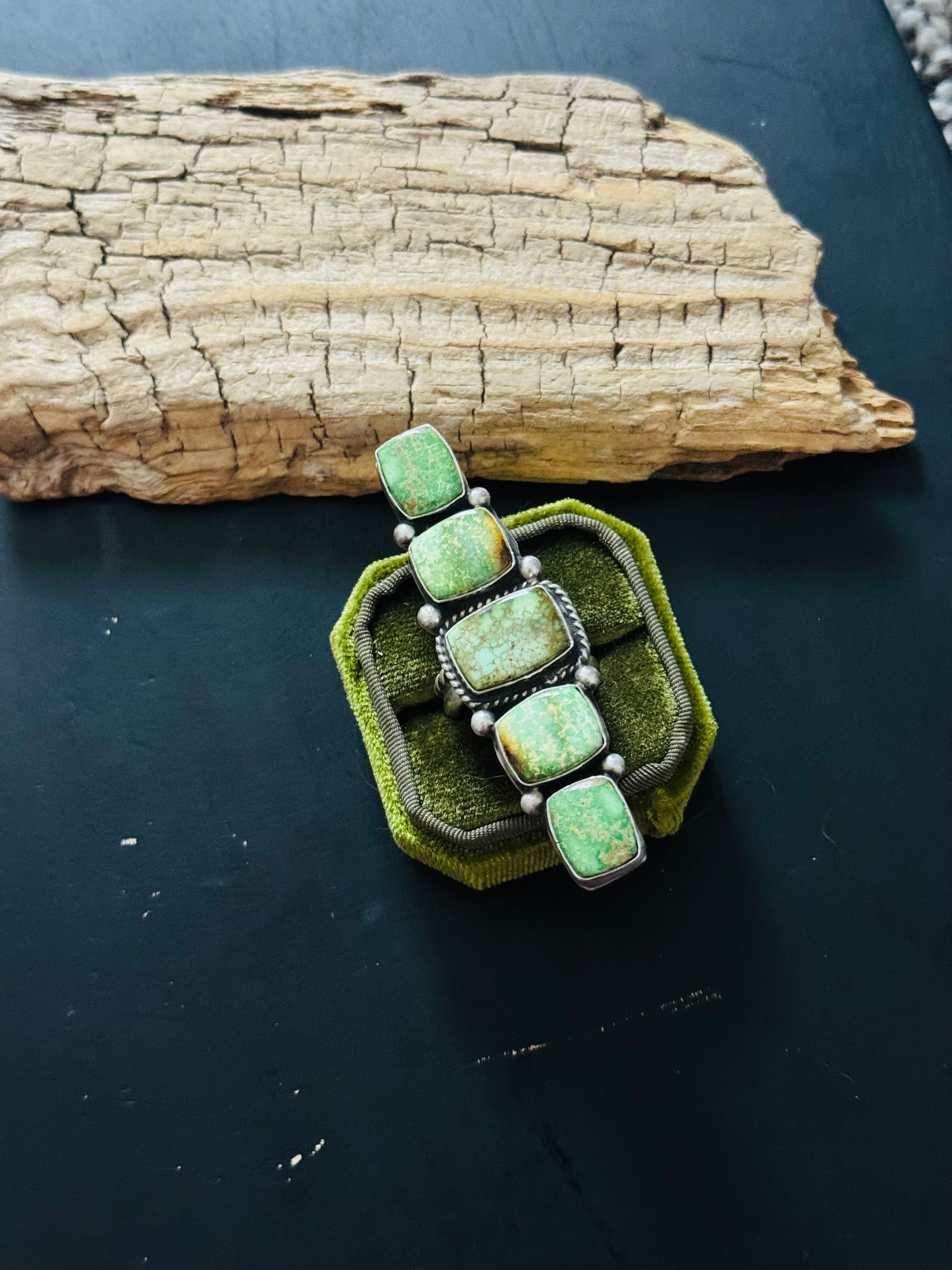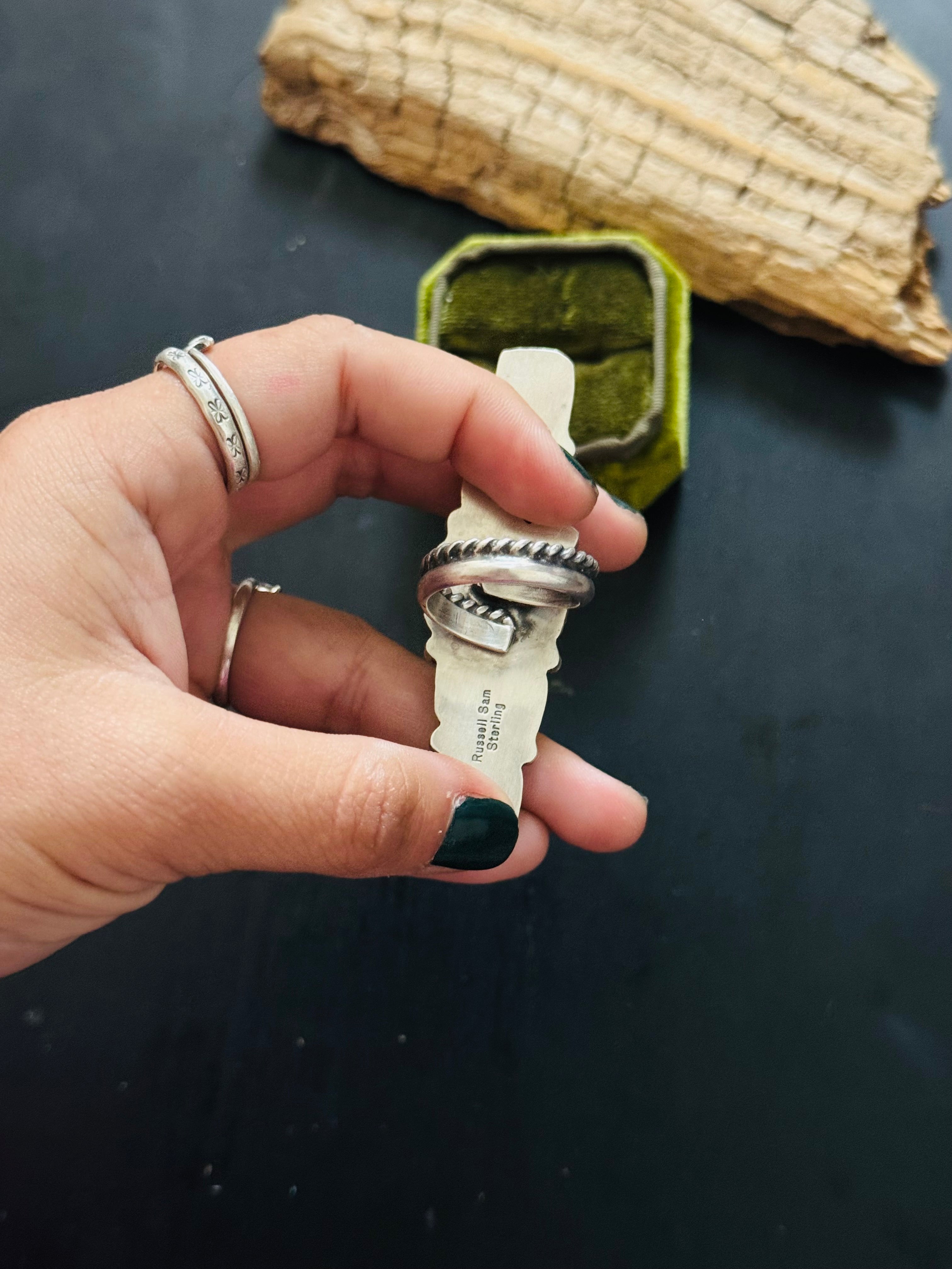 Russell Sam Royston Turquoise & Sterling Silver Adjustable Cluster Ring. It measures 2 7/8 inches long and just over 3/4 of an inch wide. Signed by the artist and stamped sterling silver.