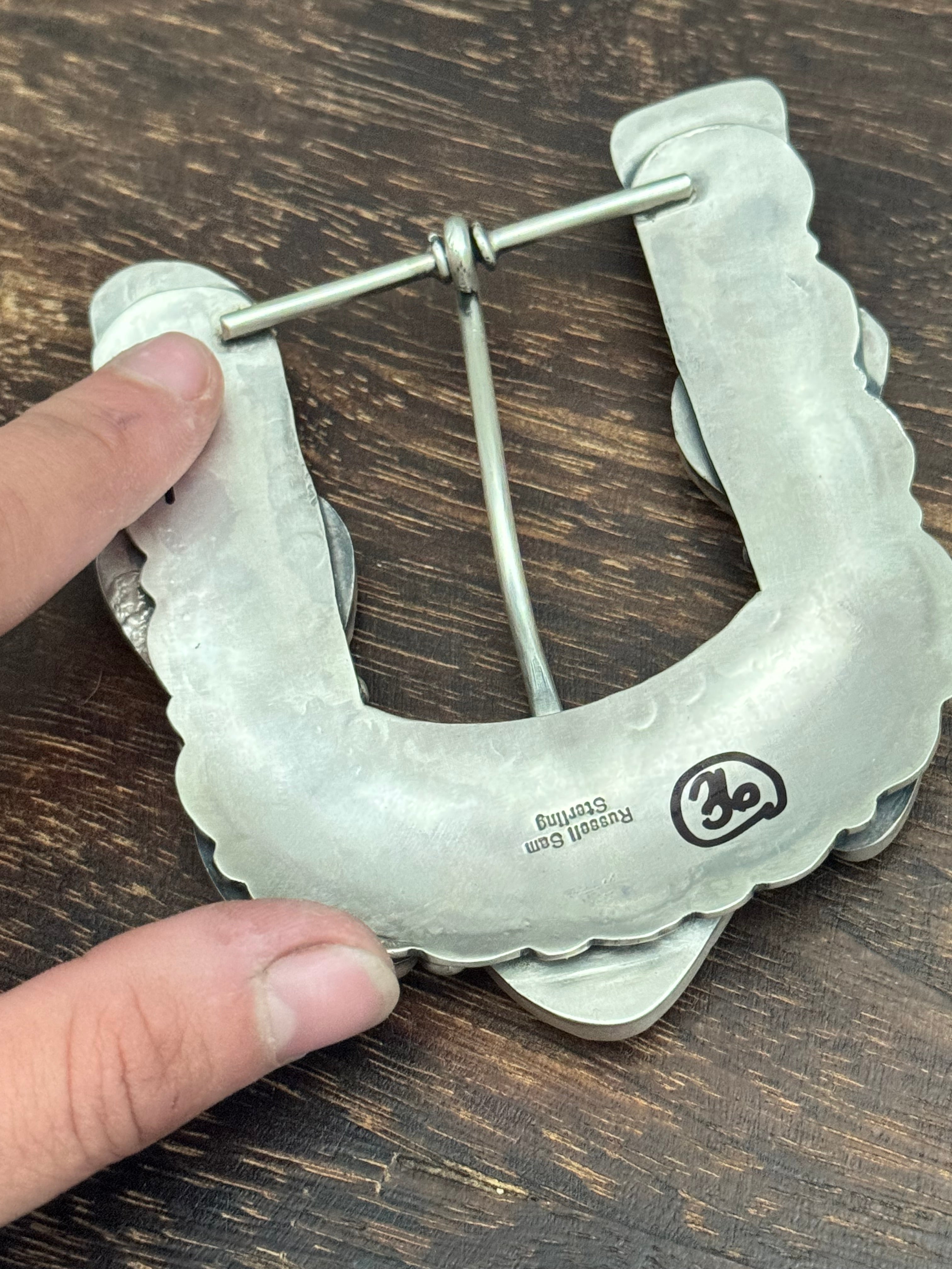 Sam Russel Natural Lapis & Sterling Silver Belt Buckle. It measures 3 3/4 inches long and 3 inches wide. Signed by the artist and stamped sterling silver.