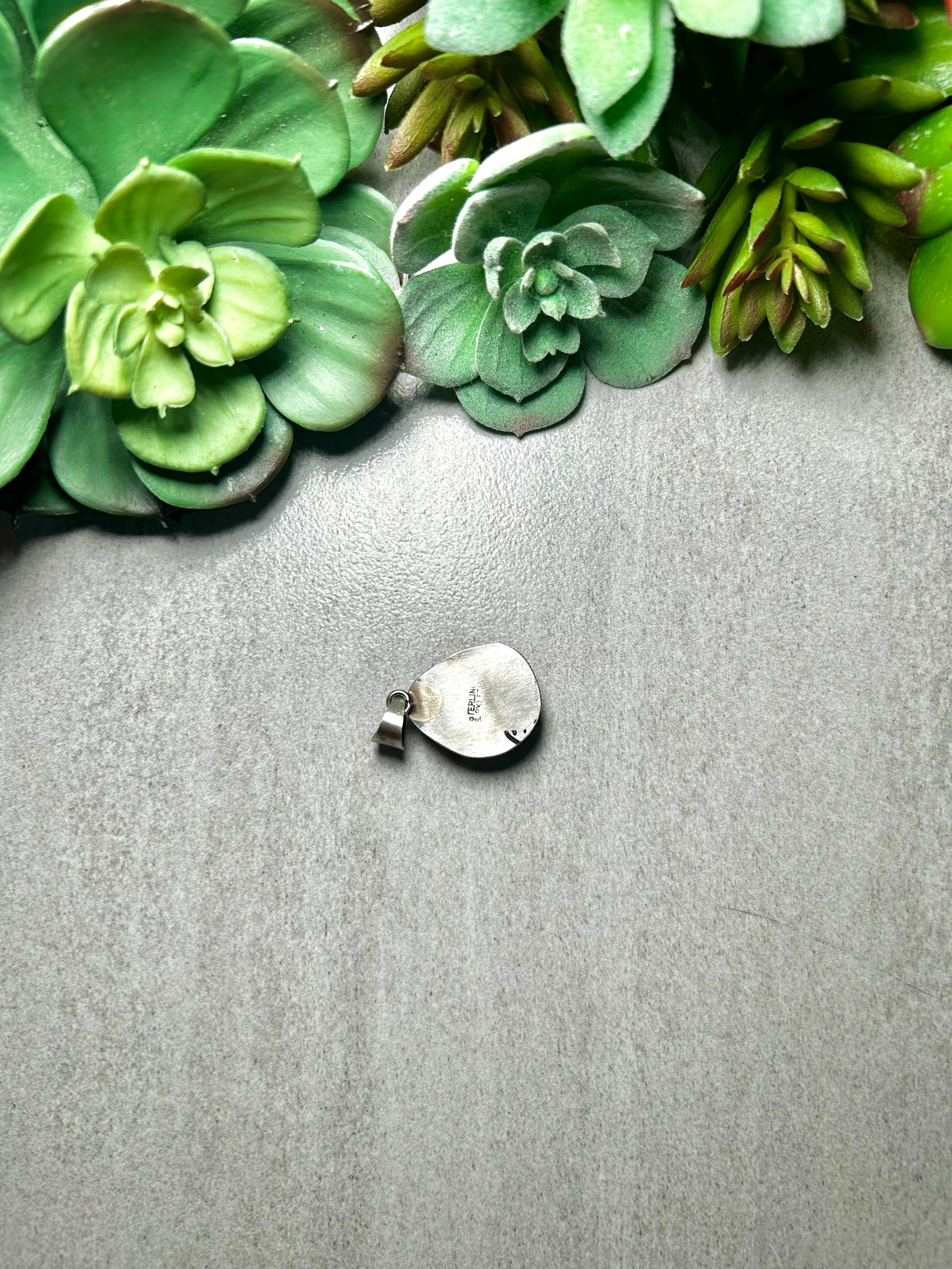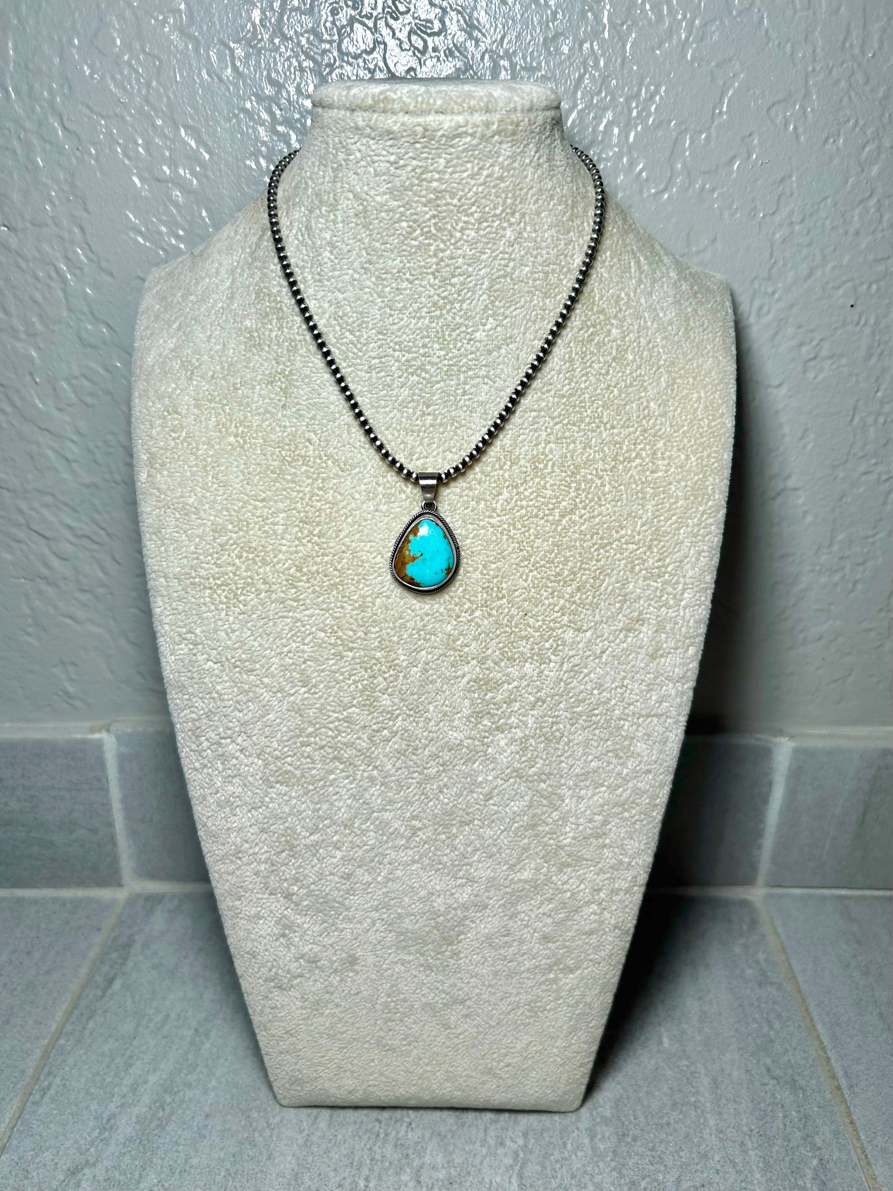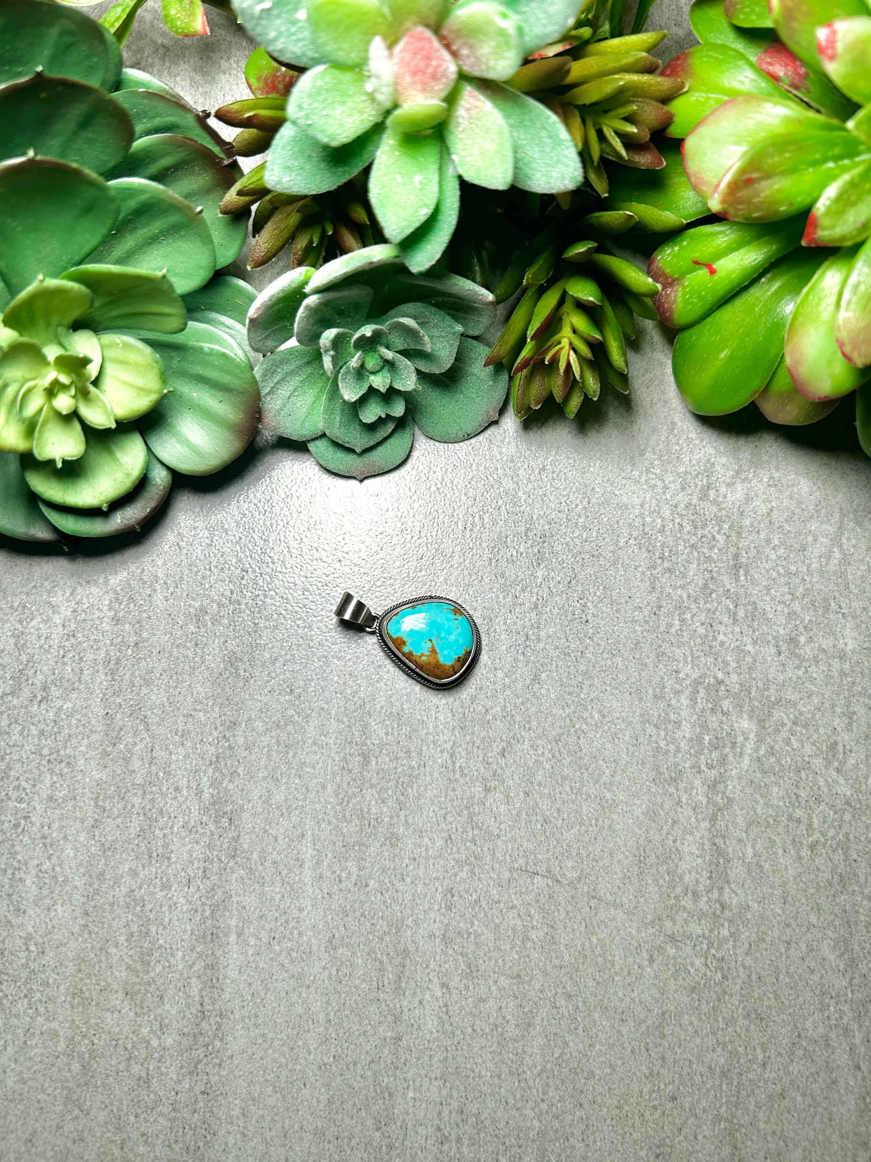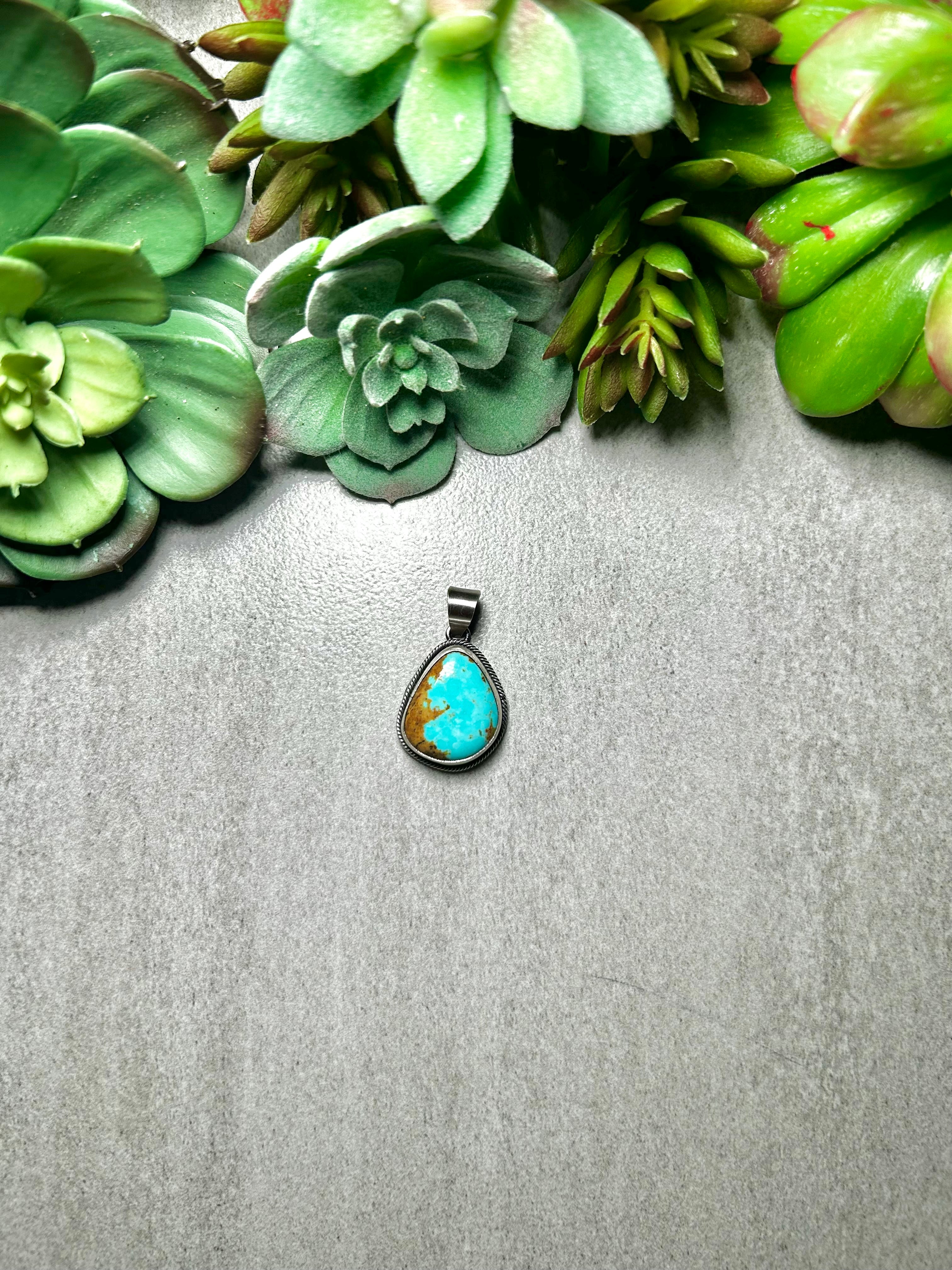 Scott Skeet #8 Turquoise & Sterling Silver Pendant. It measures 1 3/8 inches long and 7/8 of an inch wide. Pendant Only! Signed by the artist and stamped sterling silver.
