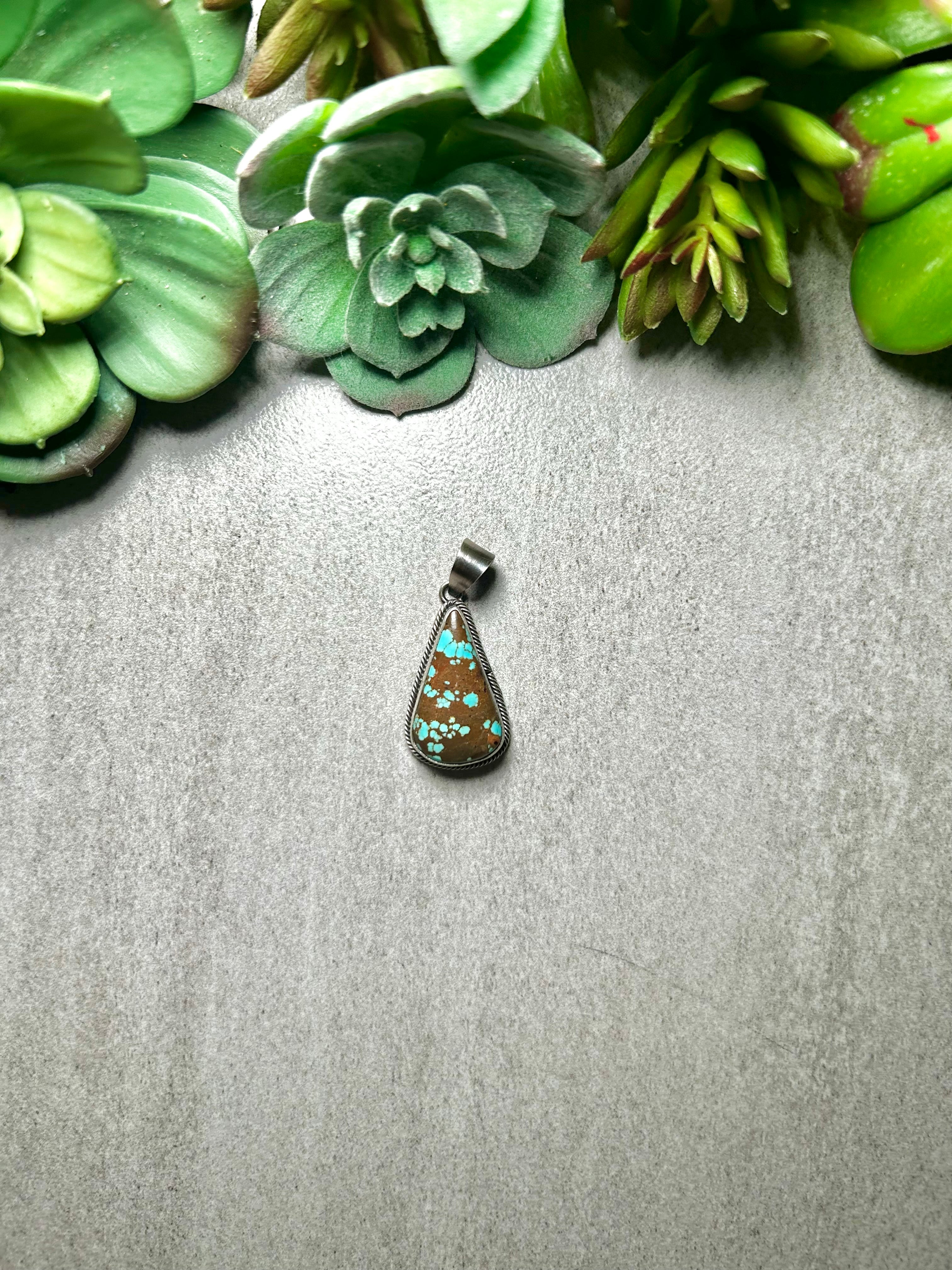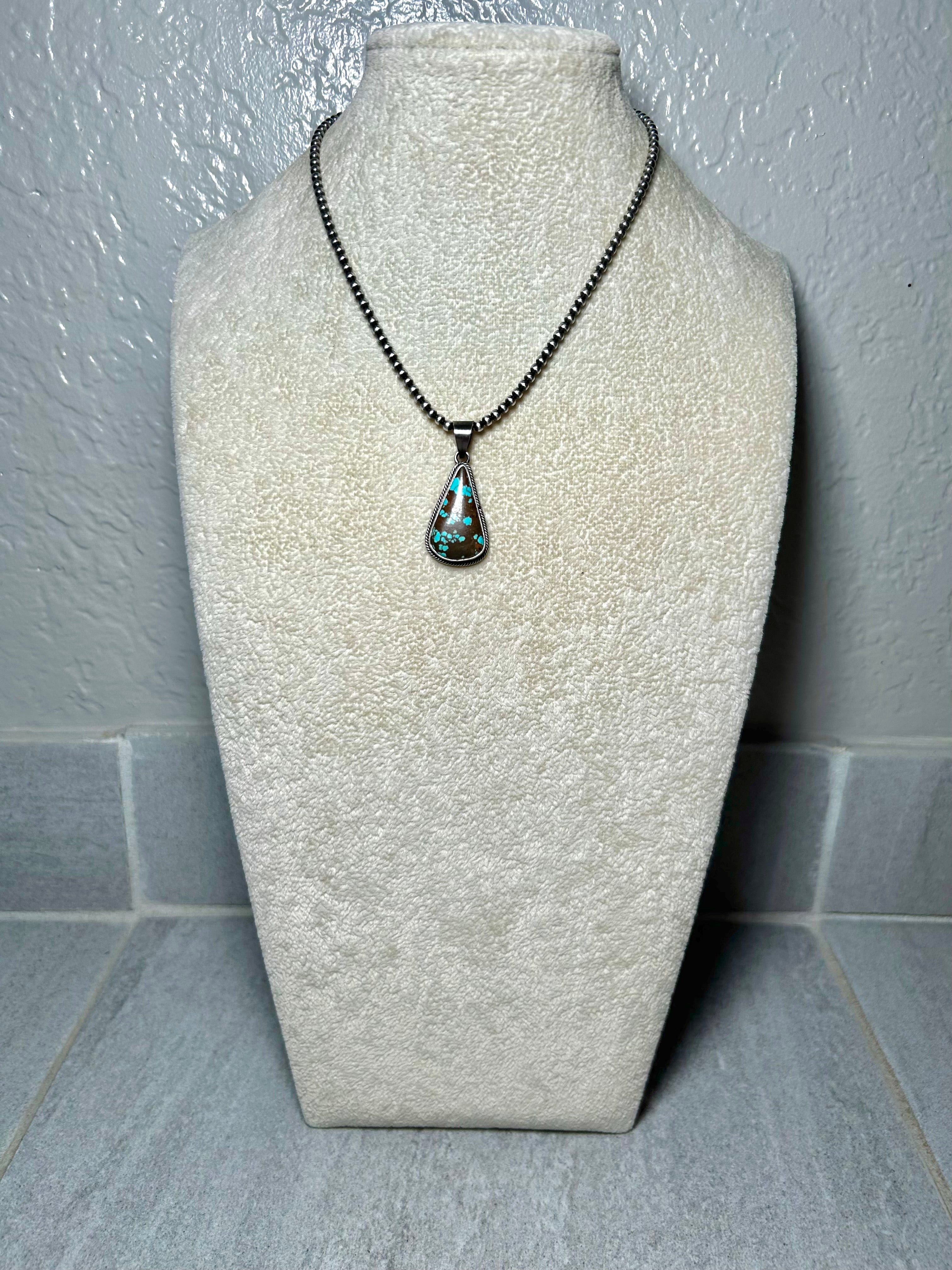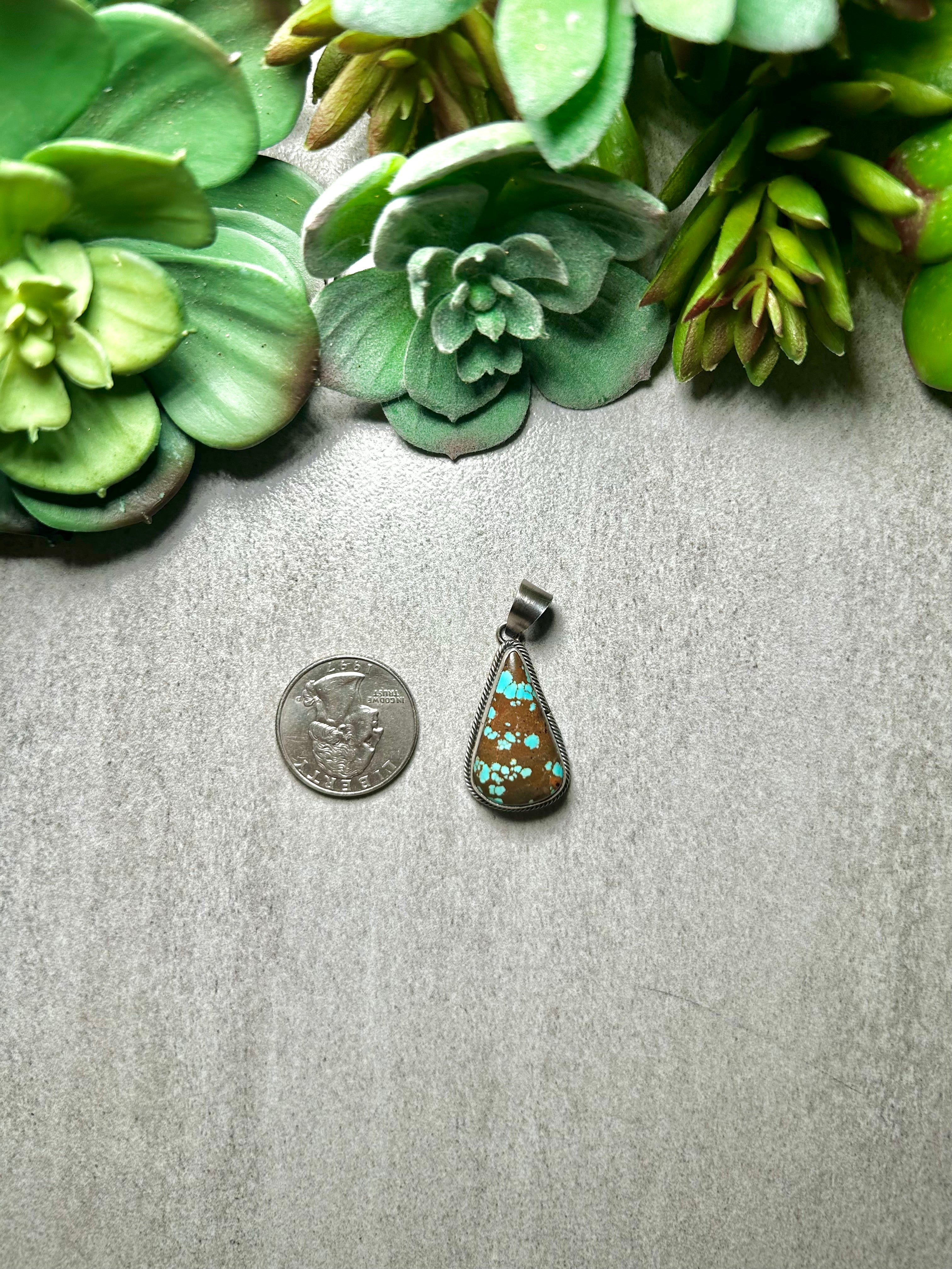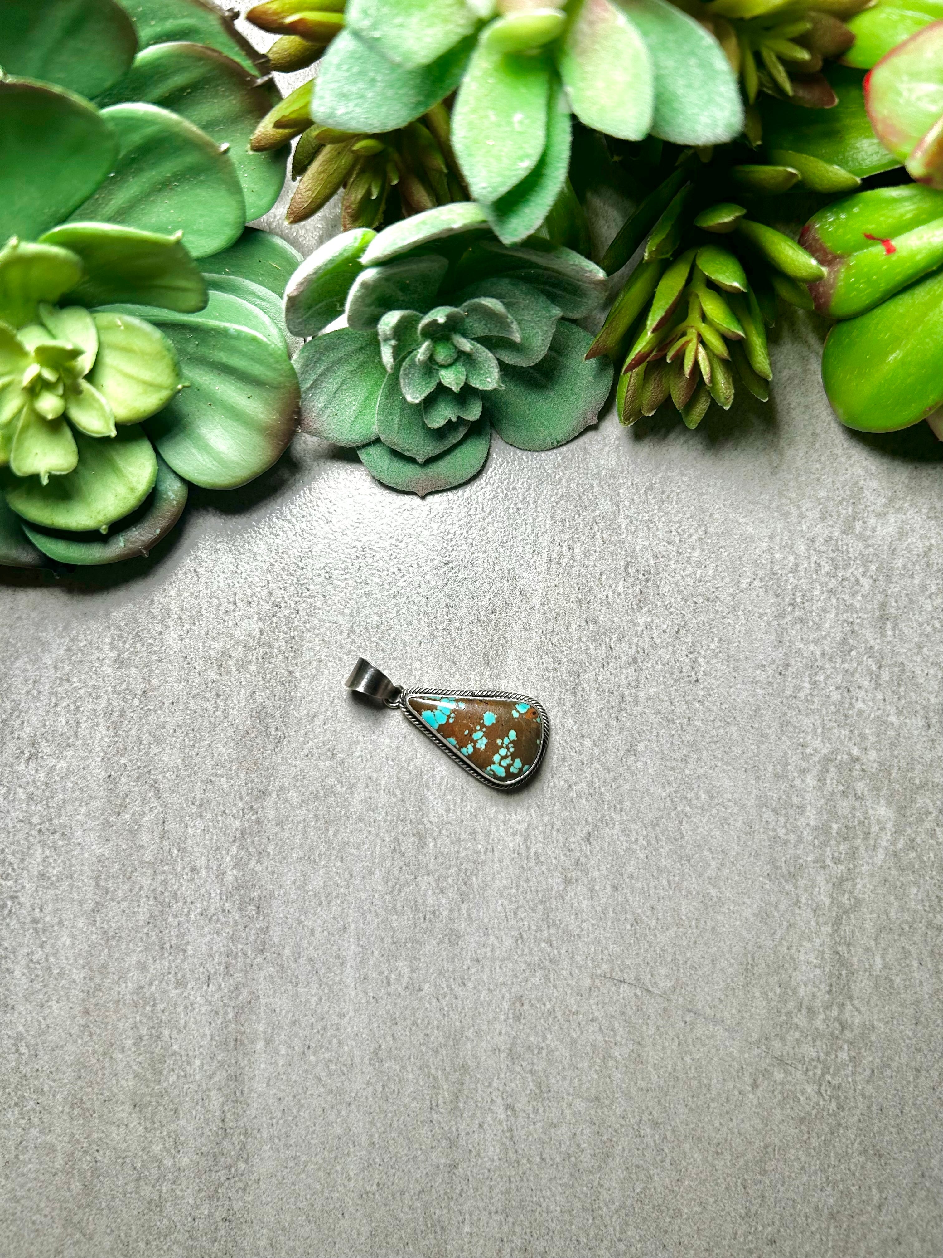 Scott Skeet #8 Turquoise & Sterling Silver Pendant. It measures 1 1/2 inches long and 3/4 of an inch wide. Pendant Only! Signed by the artist and stamped sterling silver.