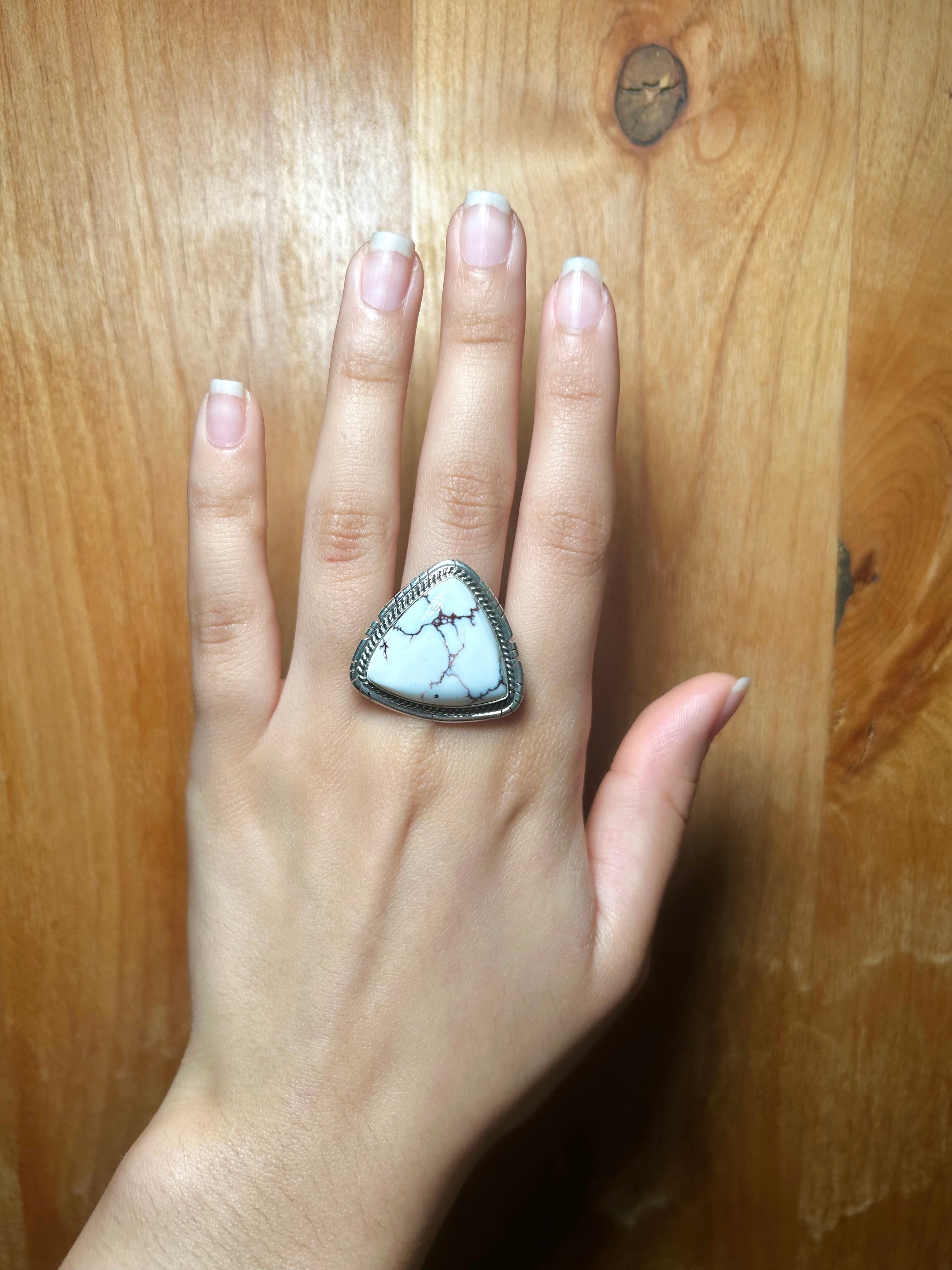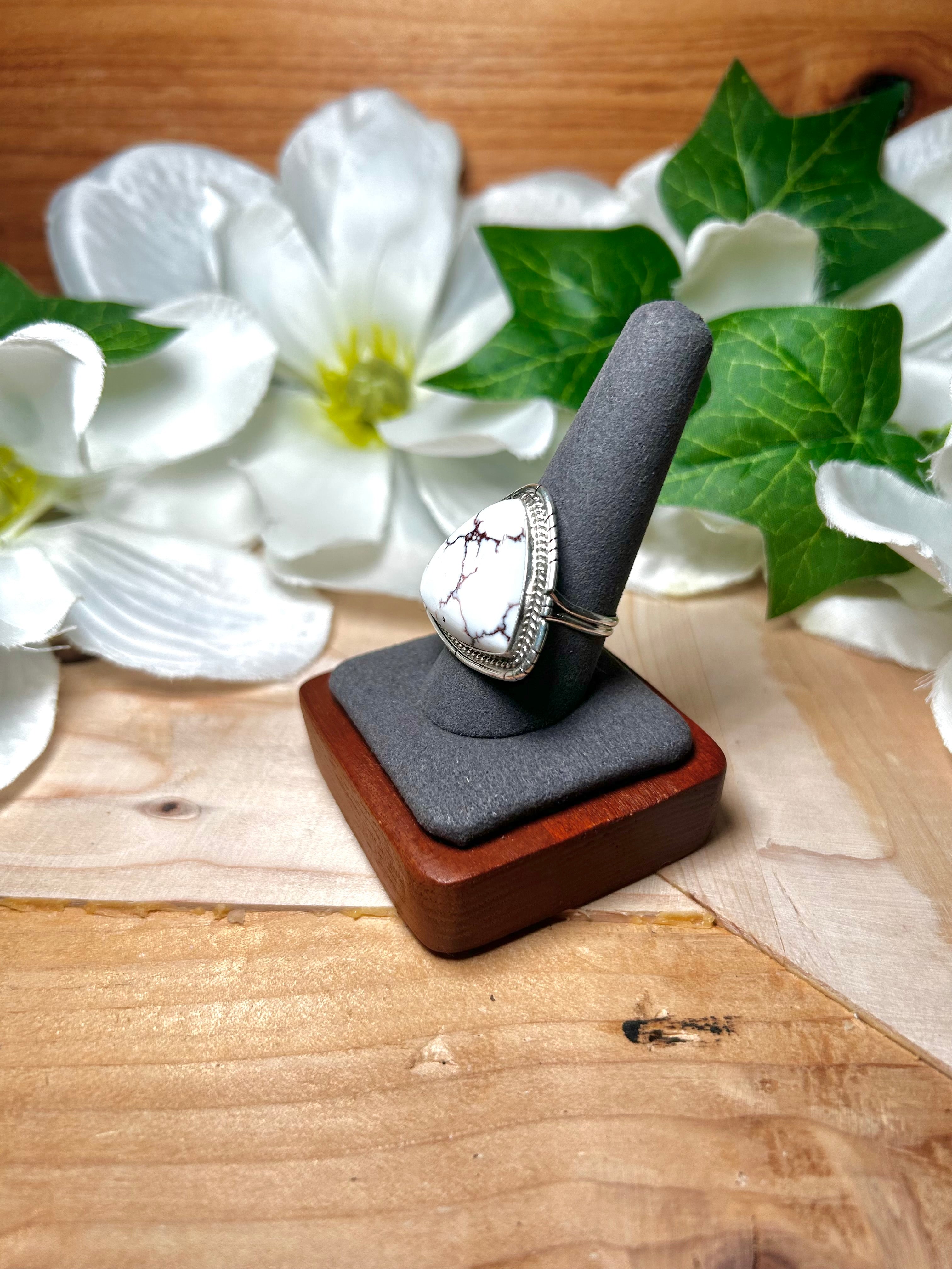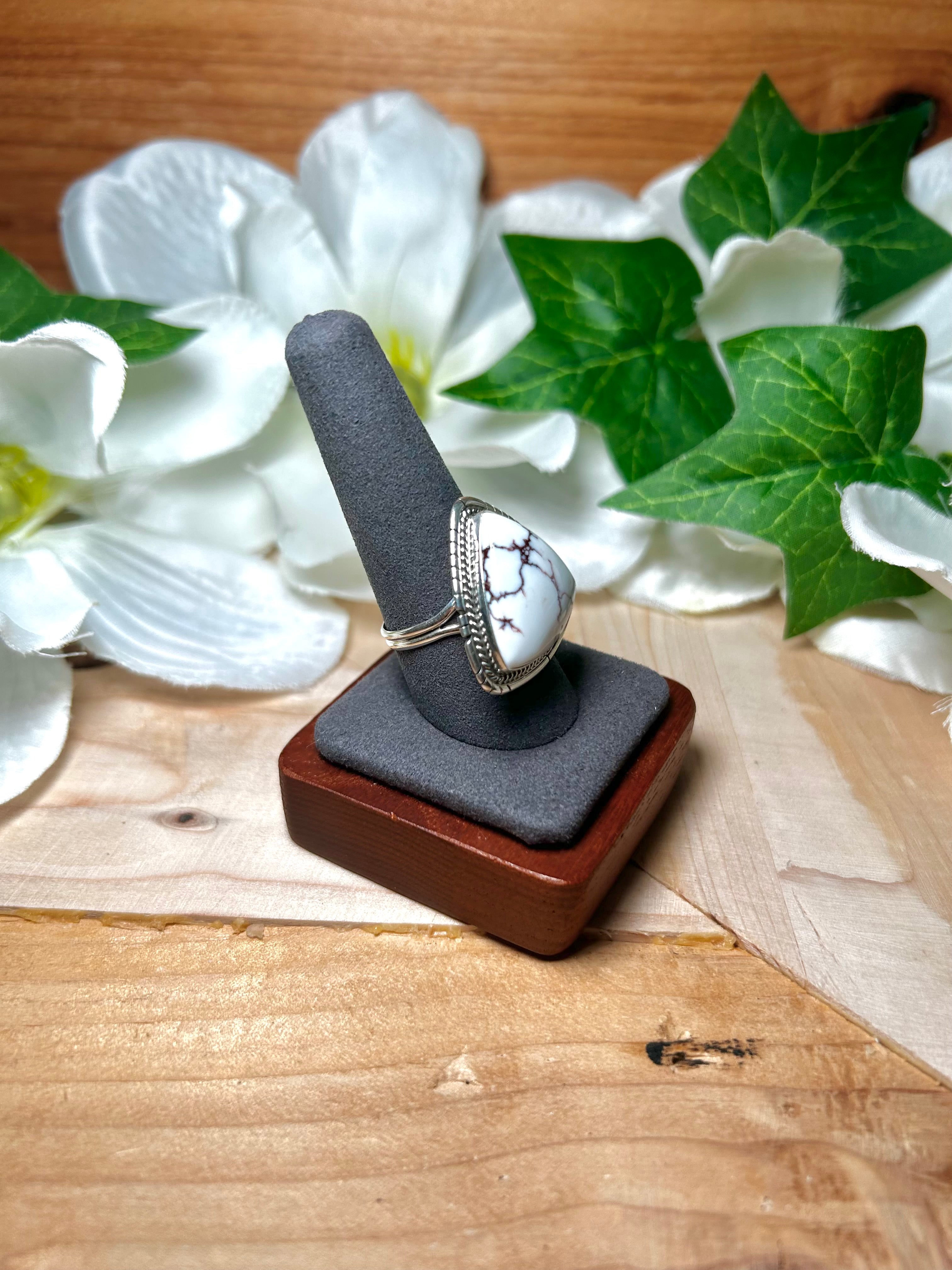 Dave Skeets Wild Horse & Sterling Silver Ring Size 9.75. It measures 1 1/8 inches long and 1 1/8 inches wide. Signed by the artist and stamped sterling silver.