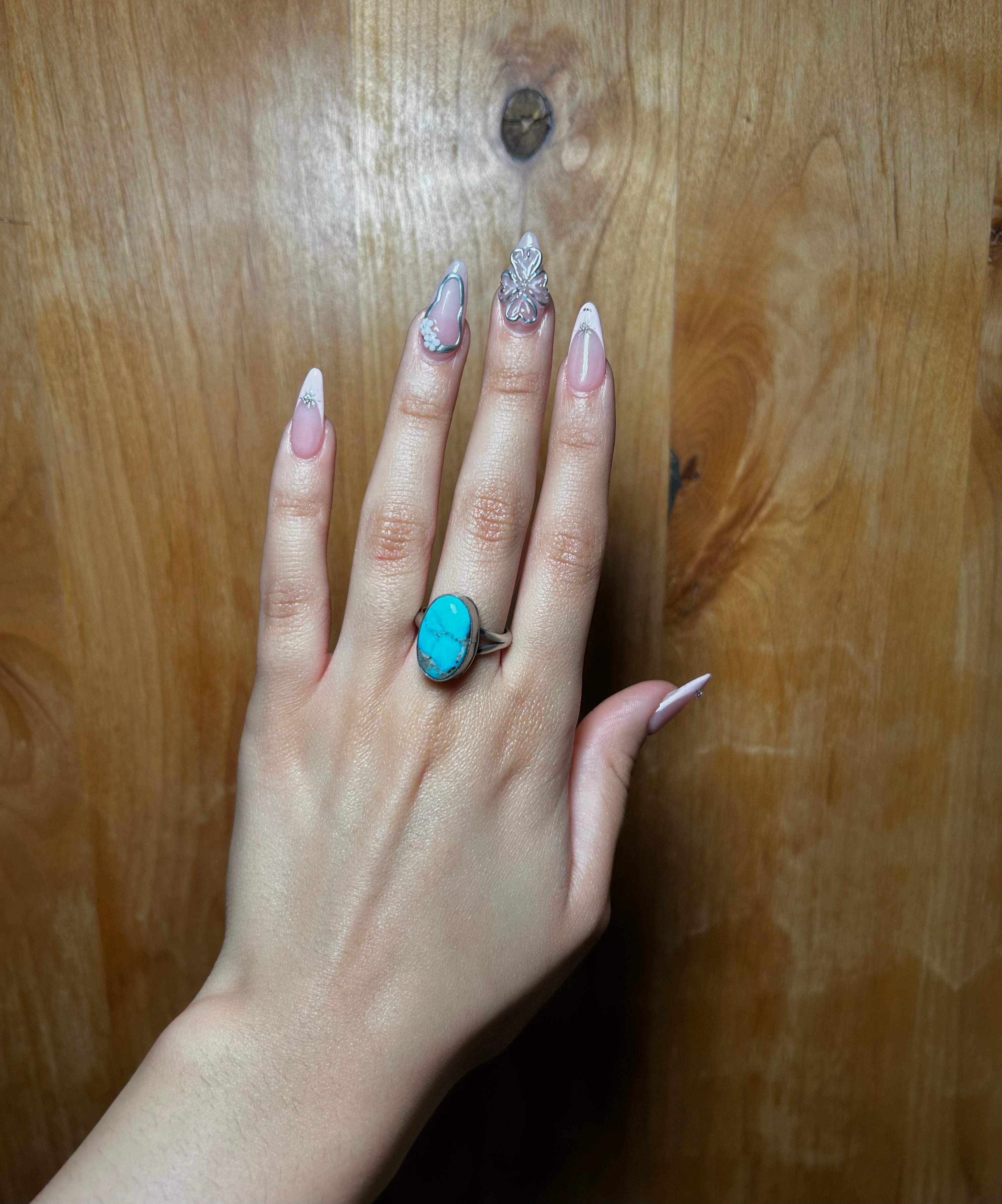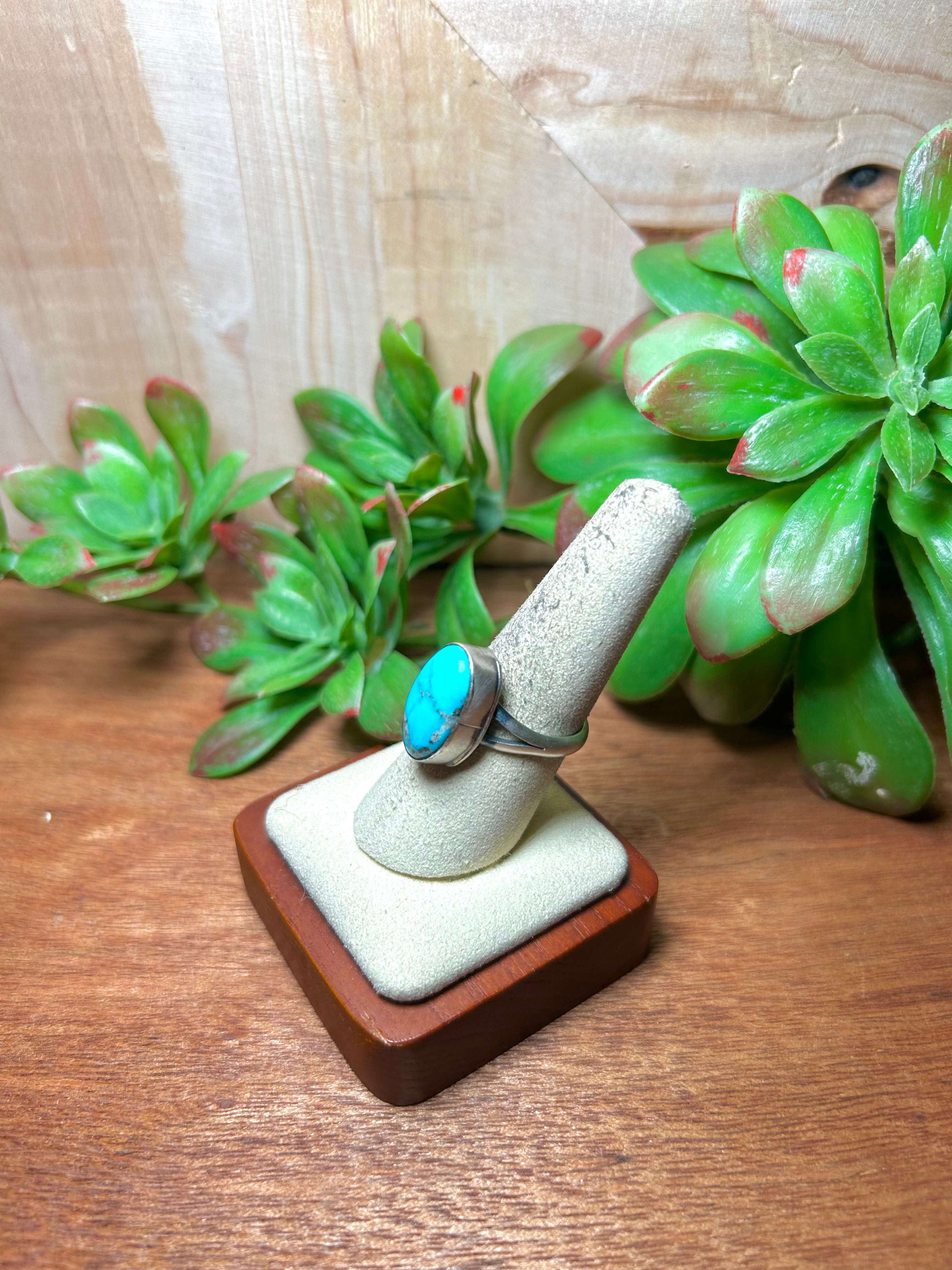 Scott Skeets Kingman Turquoise & Sterling Silver Adjustable Ring. It measures 5/8 of an inch long and 3/8 of an inch wide. Signed by artist and stamped sterling silver.