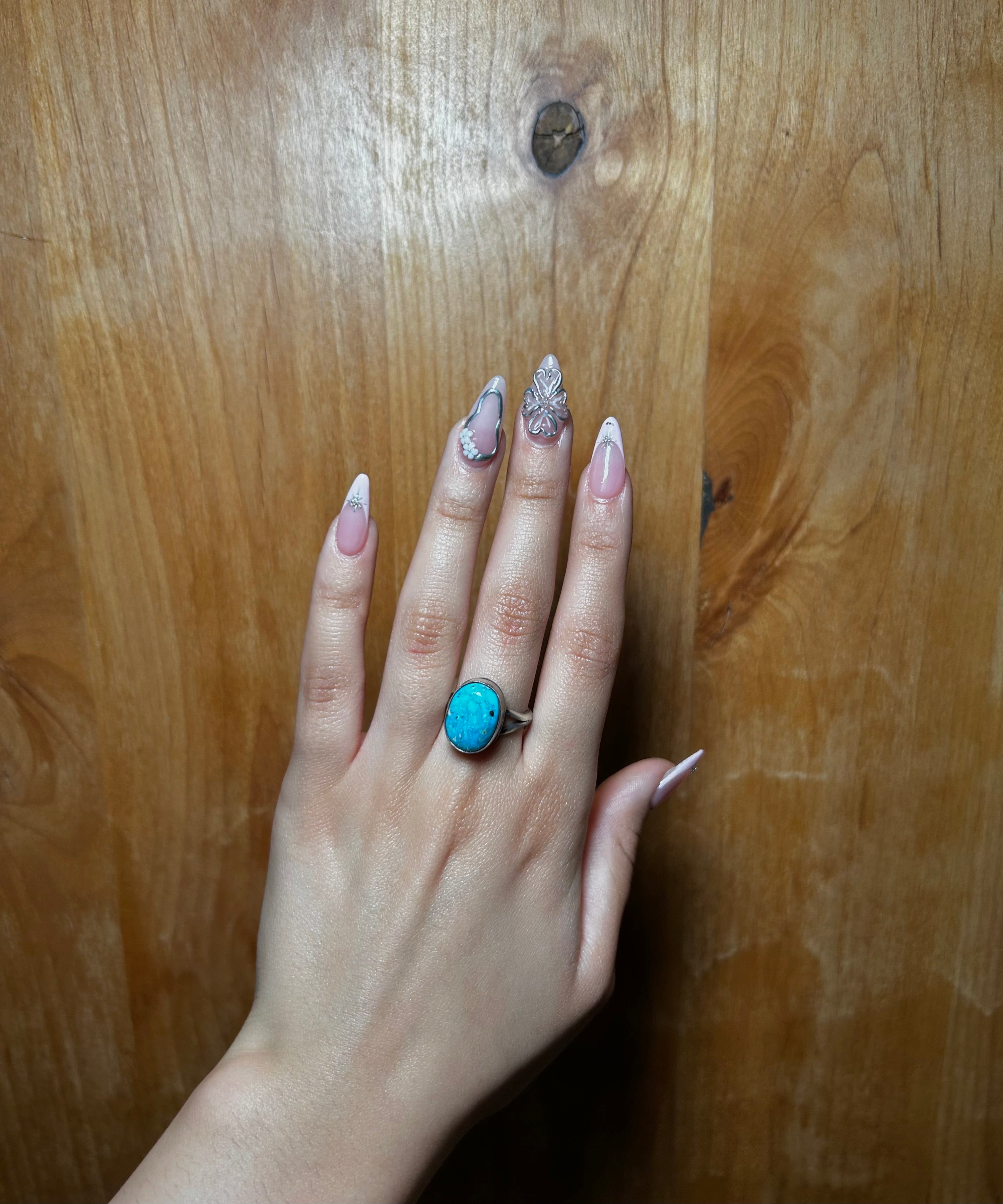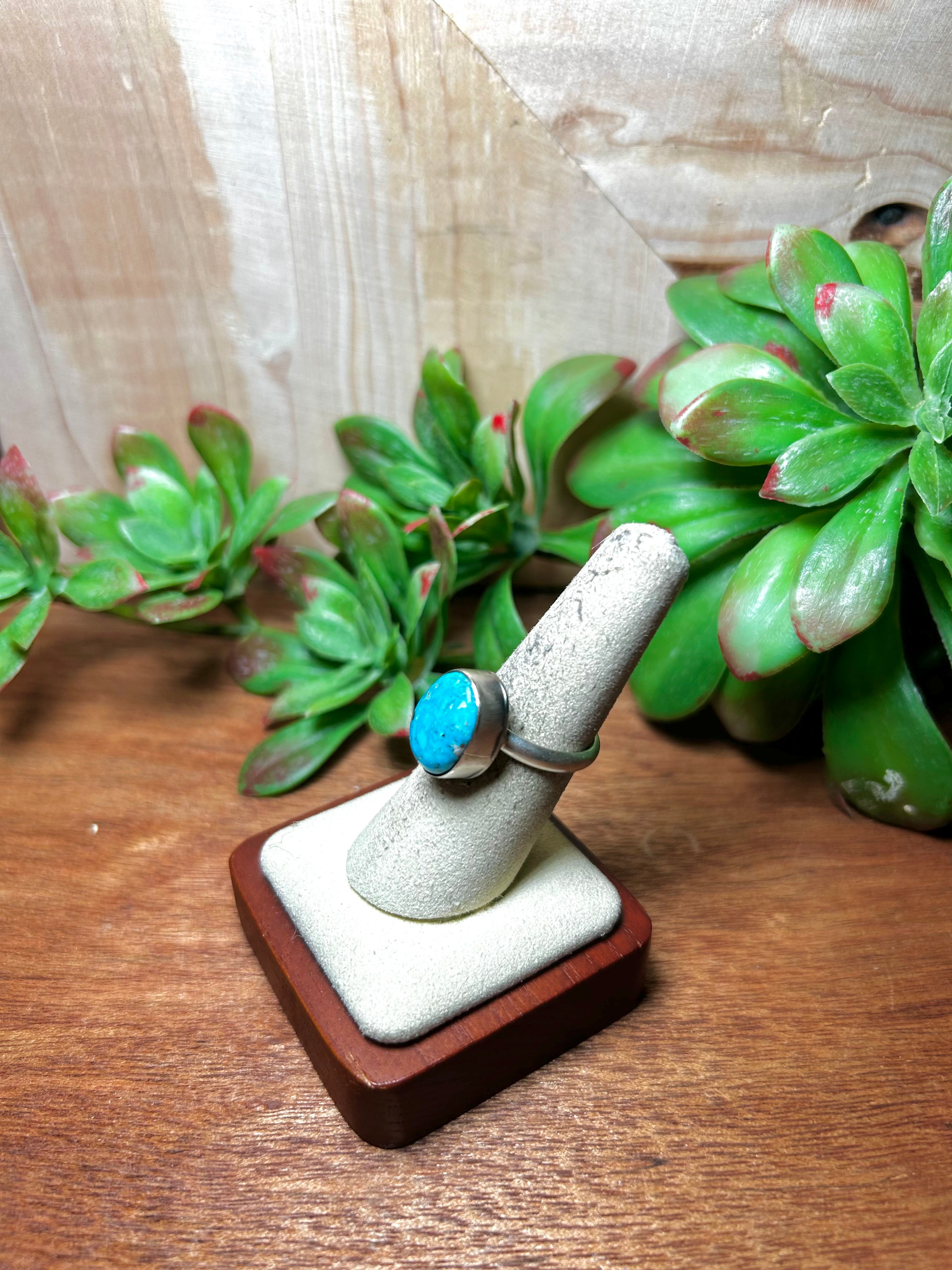 Scott Skeets Kingman Turquoise & Sterling Silver Adjustable Ring. It measures 5/8 of an inch long and 1/2 of an inch wide. Signed by artist and stamped sterling silver.