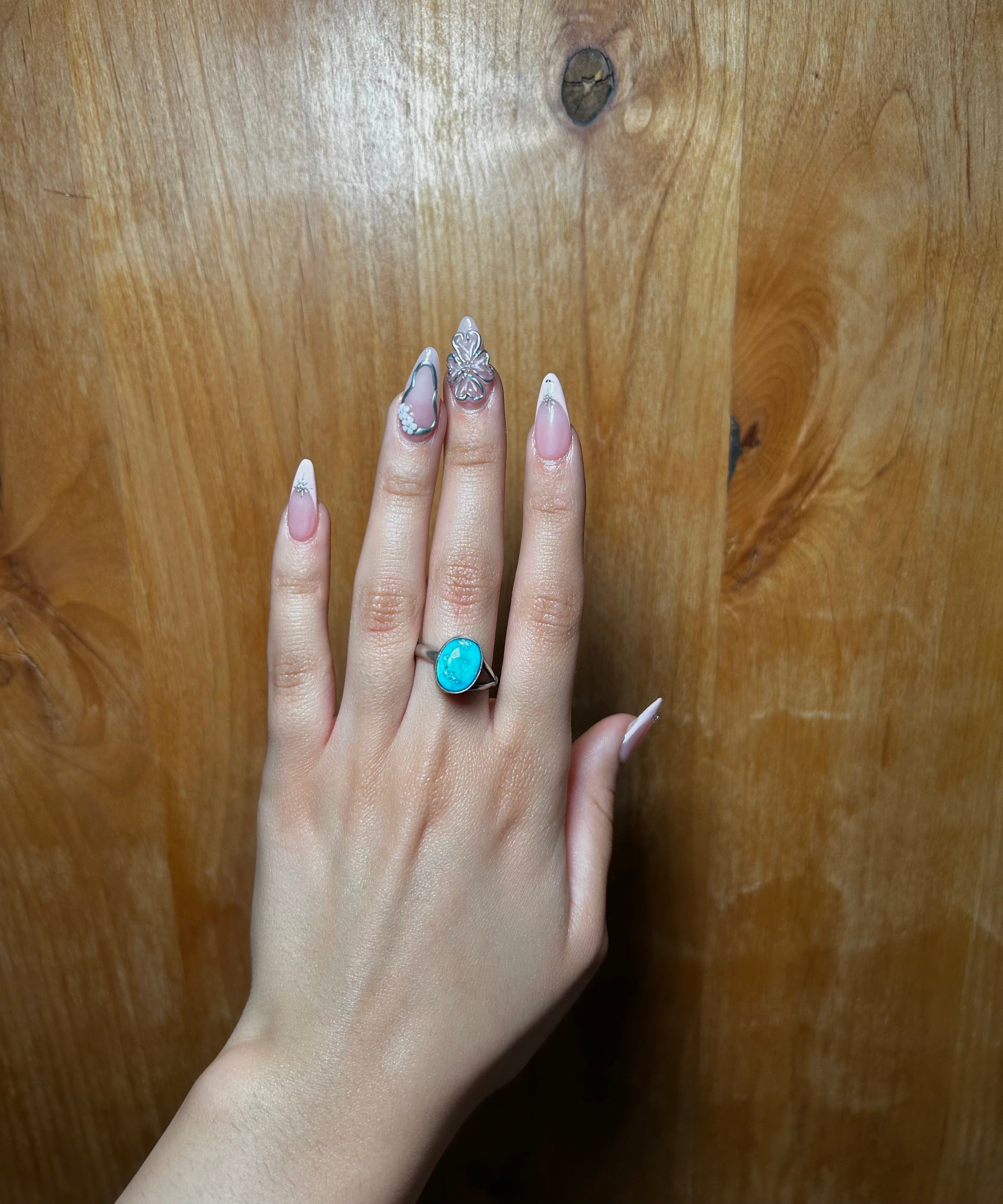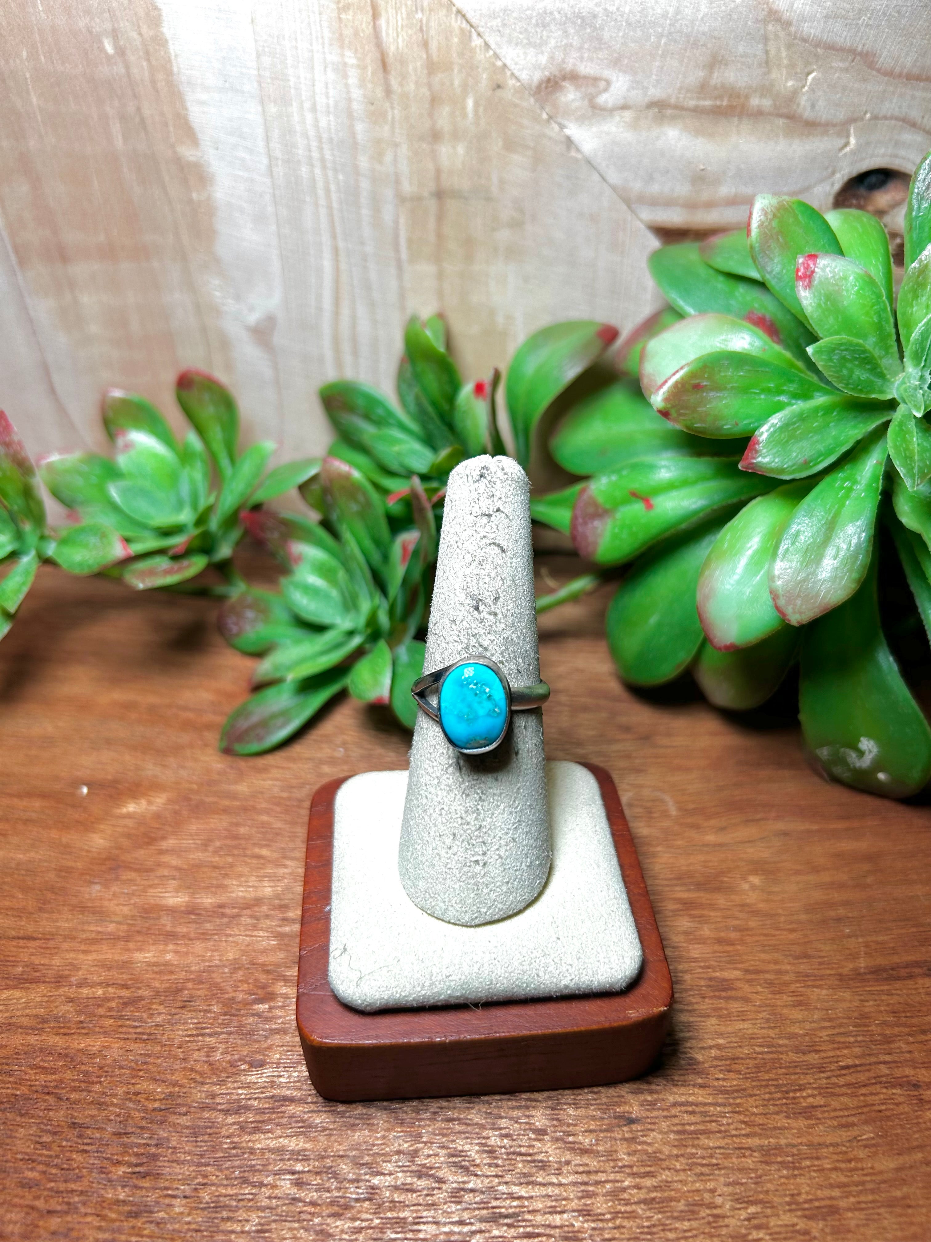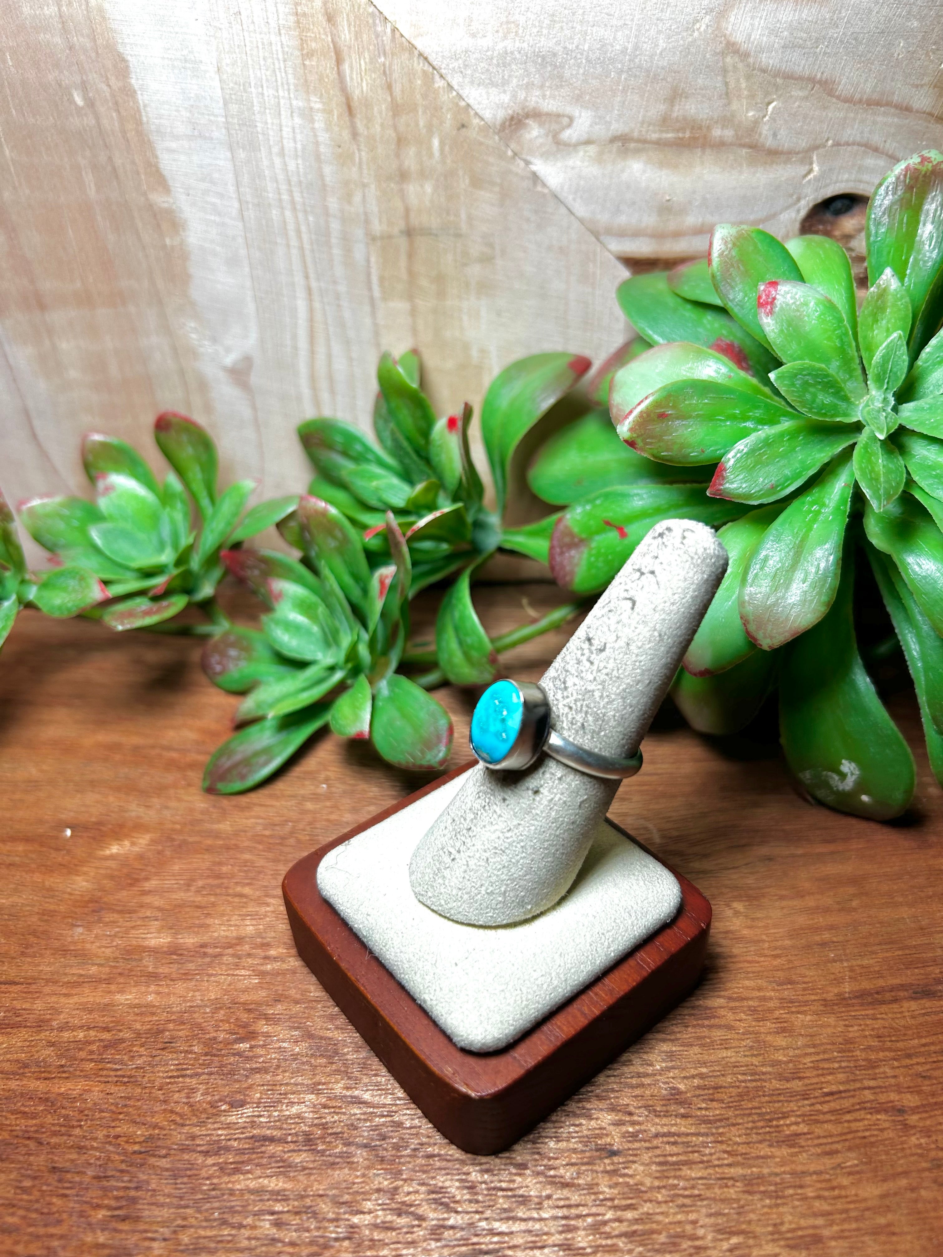 Scott Skeets Kingman Turquoise & Sterling Silver Adjustable Ring. It measures 1/2 of an inch long and 3/8 of an inch wide. Signed by artist and stamped sterling silver.