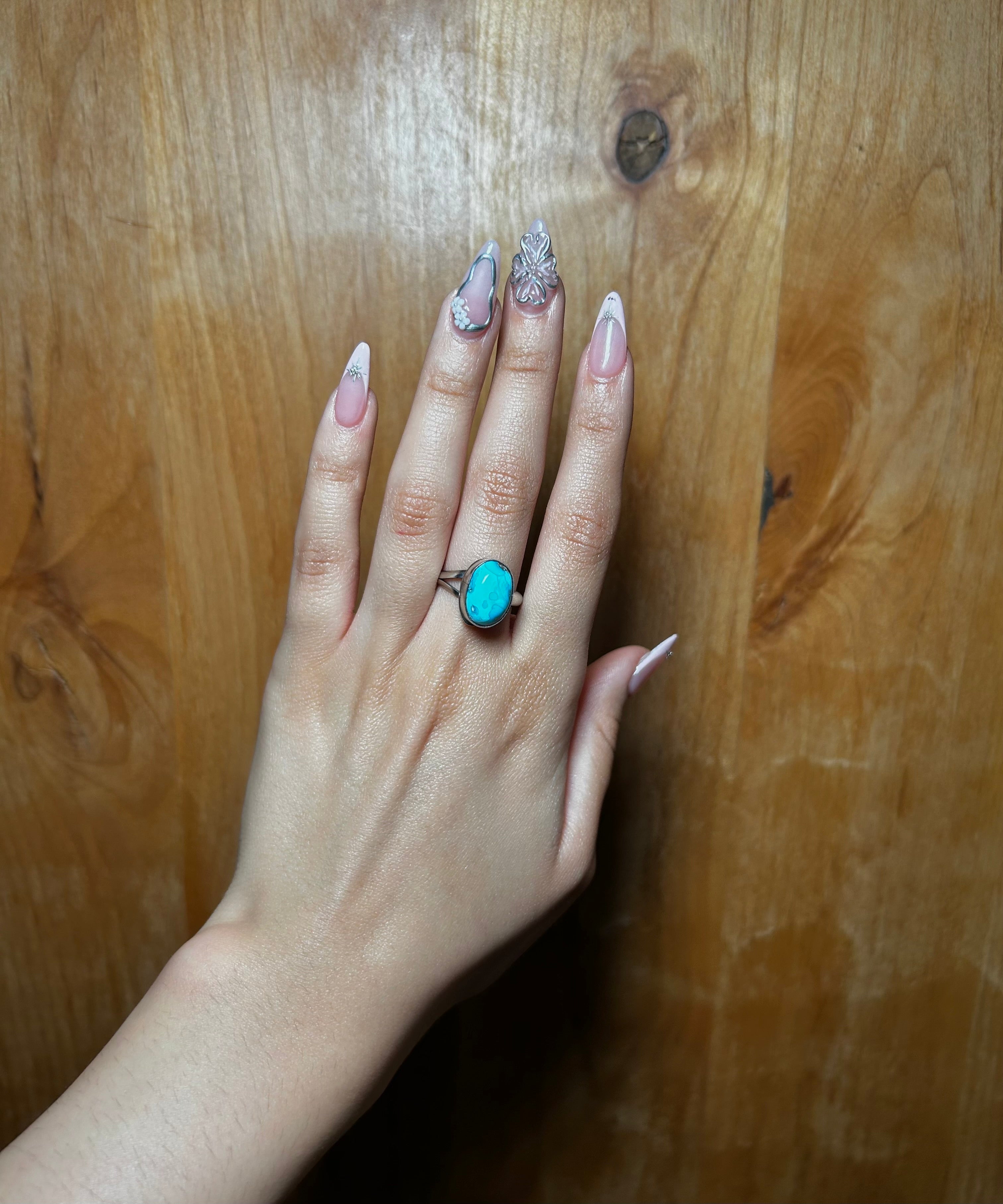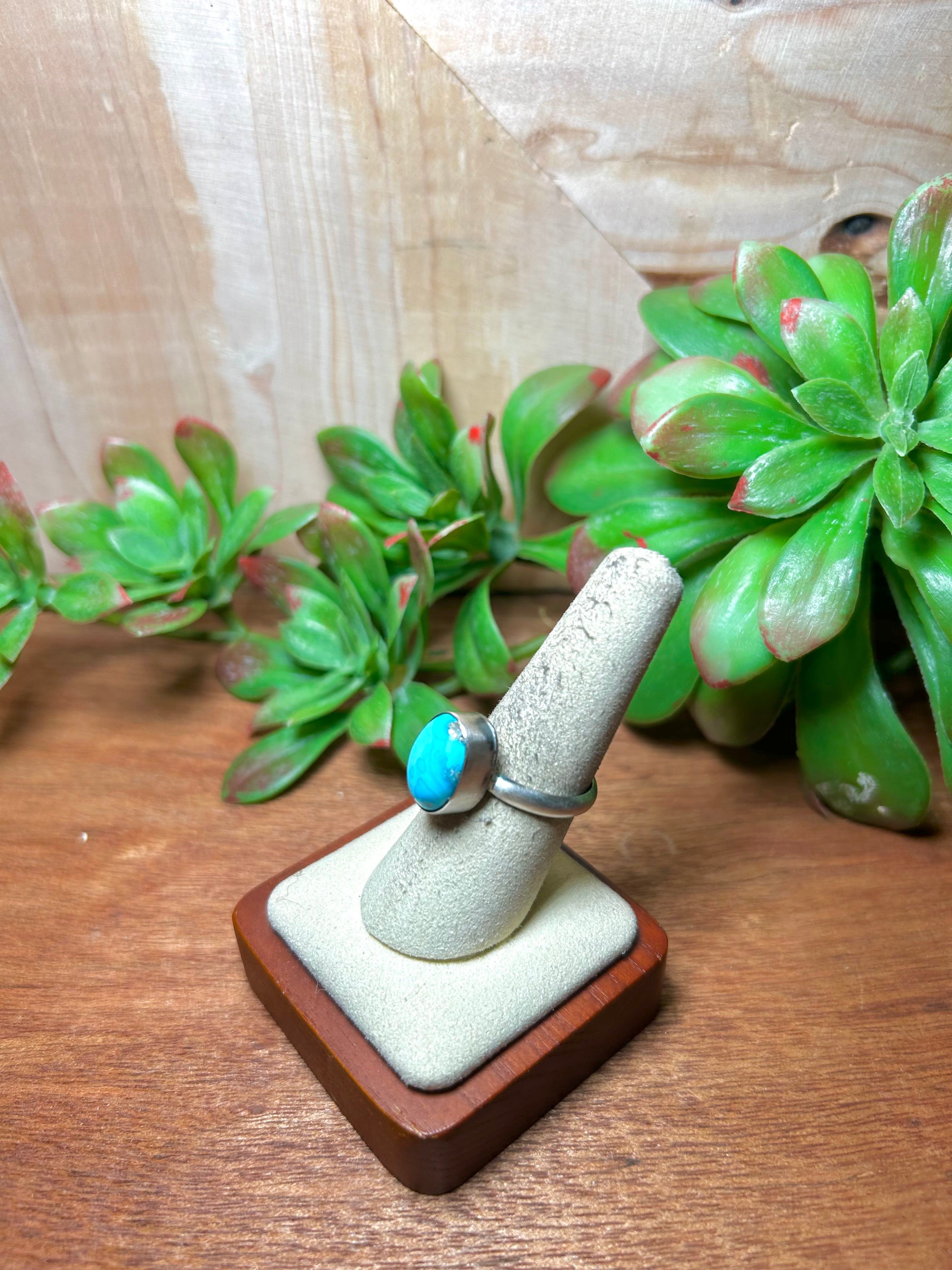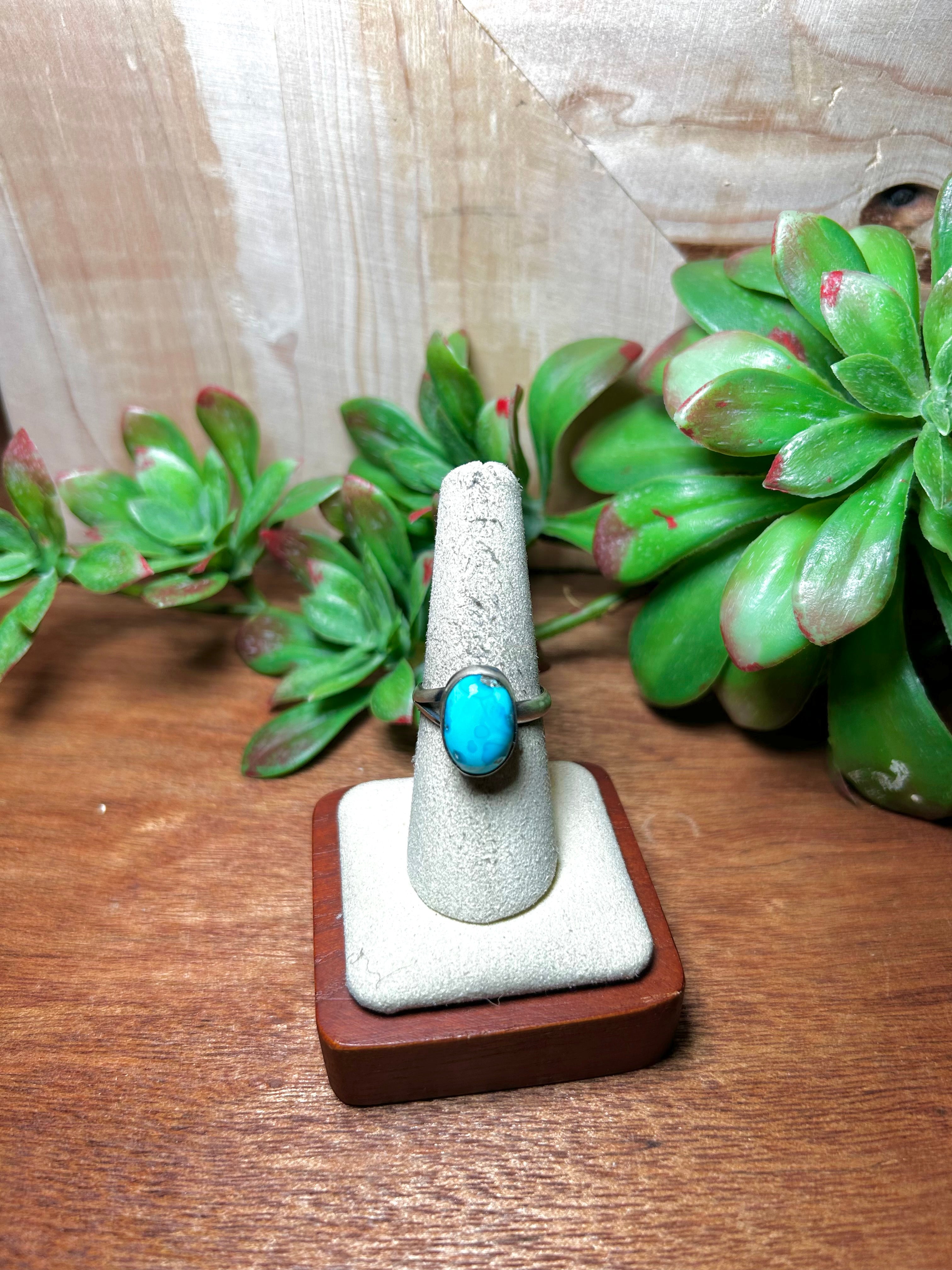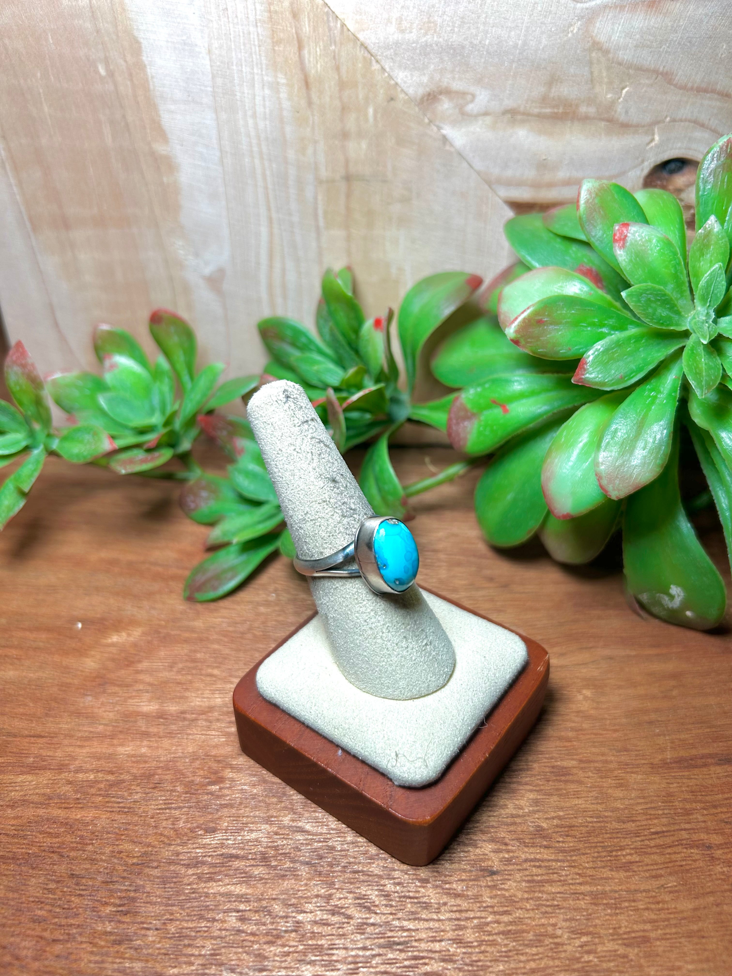 Scott Skeets Kingman Turquoise & Sterling Silver Adjustable Ring. It measures 5/8 of an inch long and 3/8 of an inch wide. Signed by artist and stamped sterling silver.