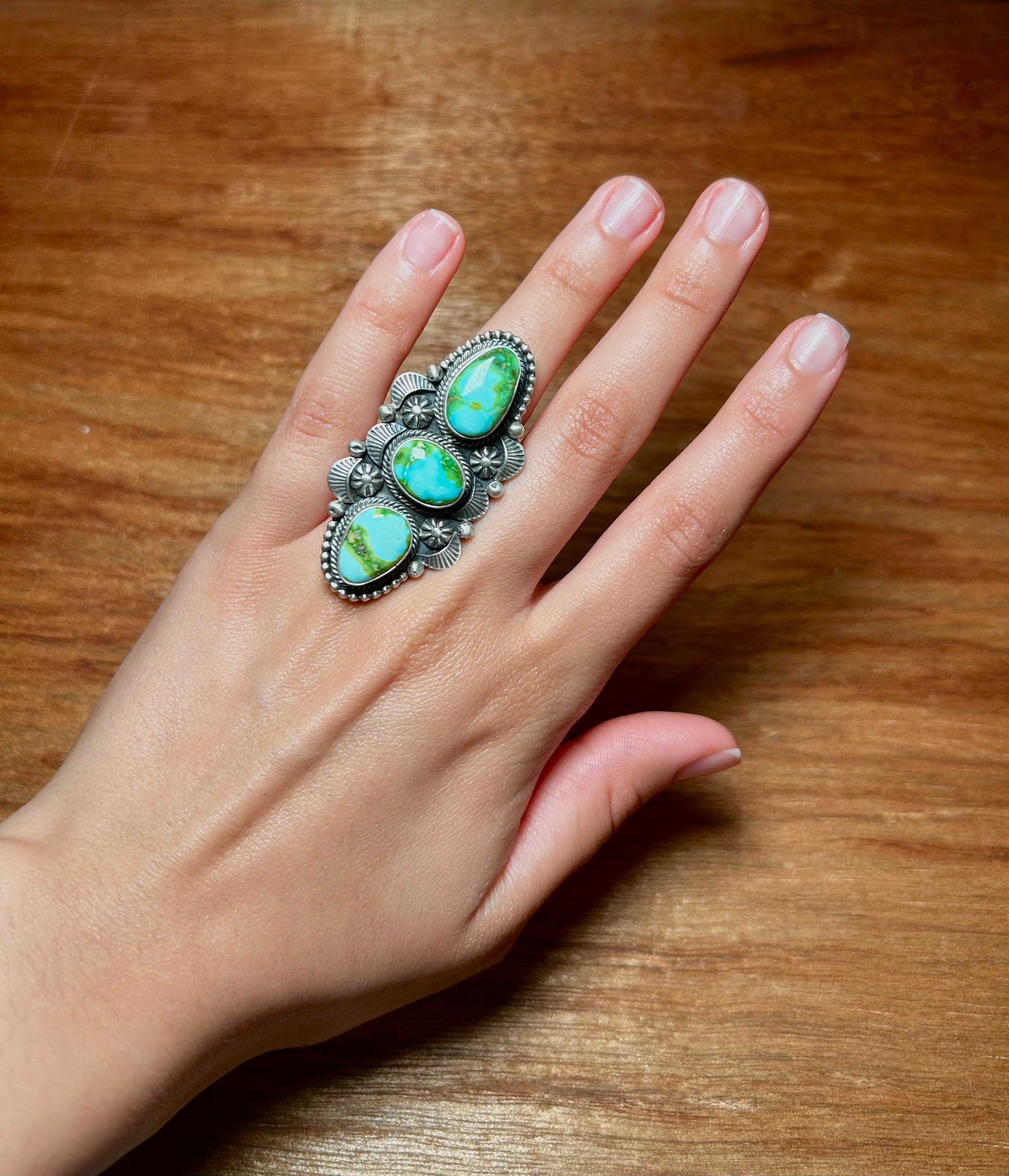 Eli Skeets Made Sonoran Mountain Turquoise & Sterling Silver Ring Size 7.5. It measures 2 inches long and 1 inch wide. Signed by the artist and stamped sterling silver.