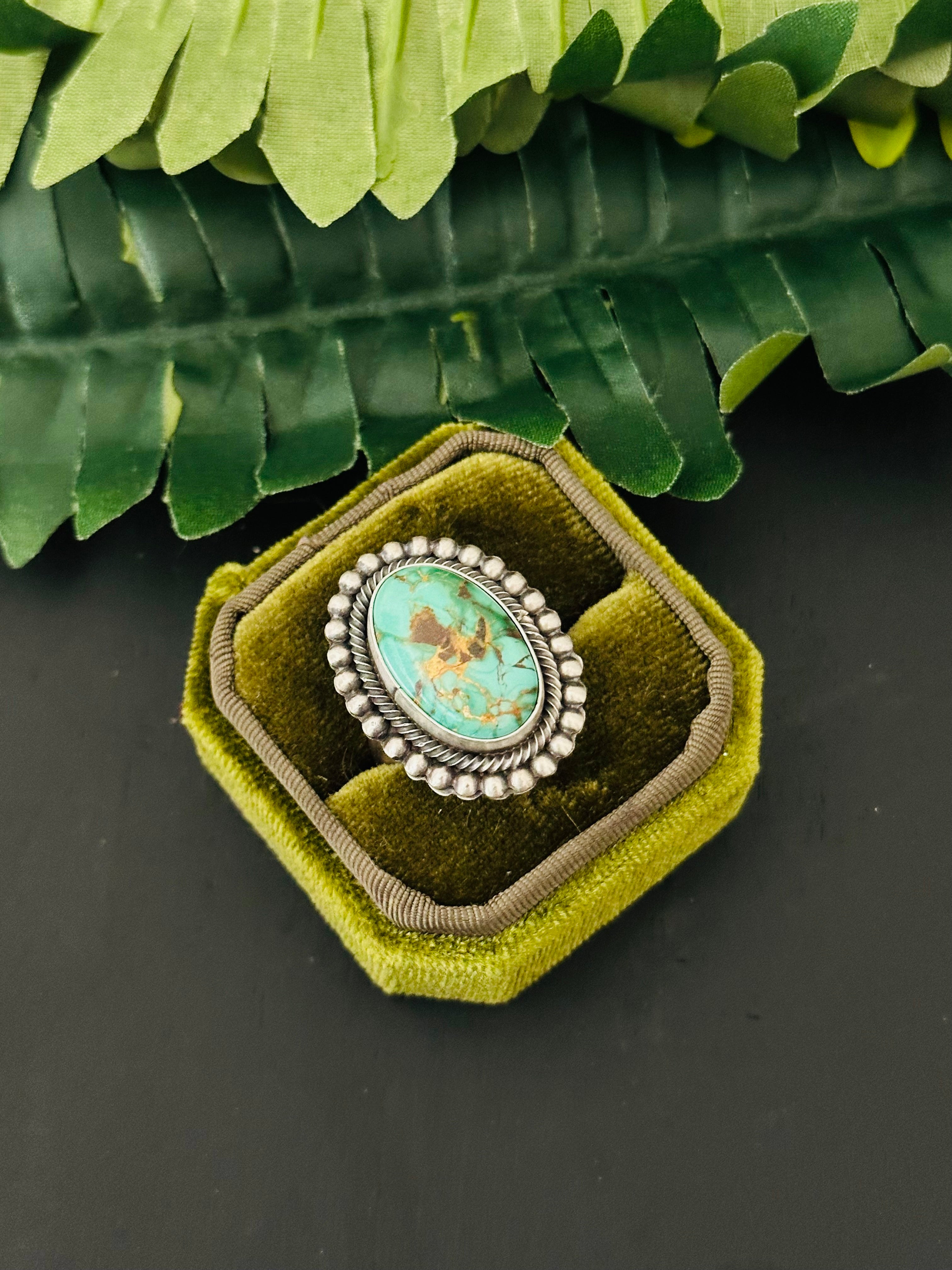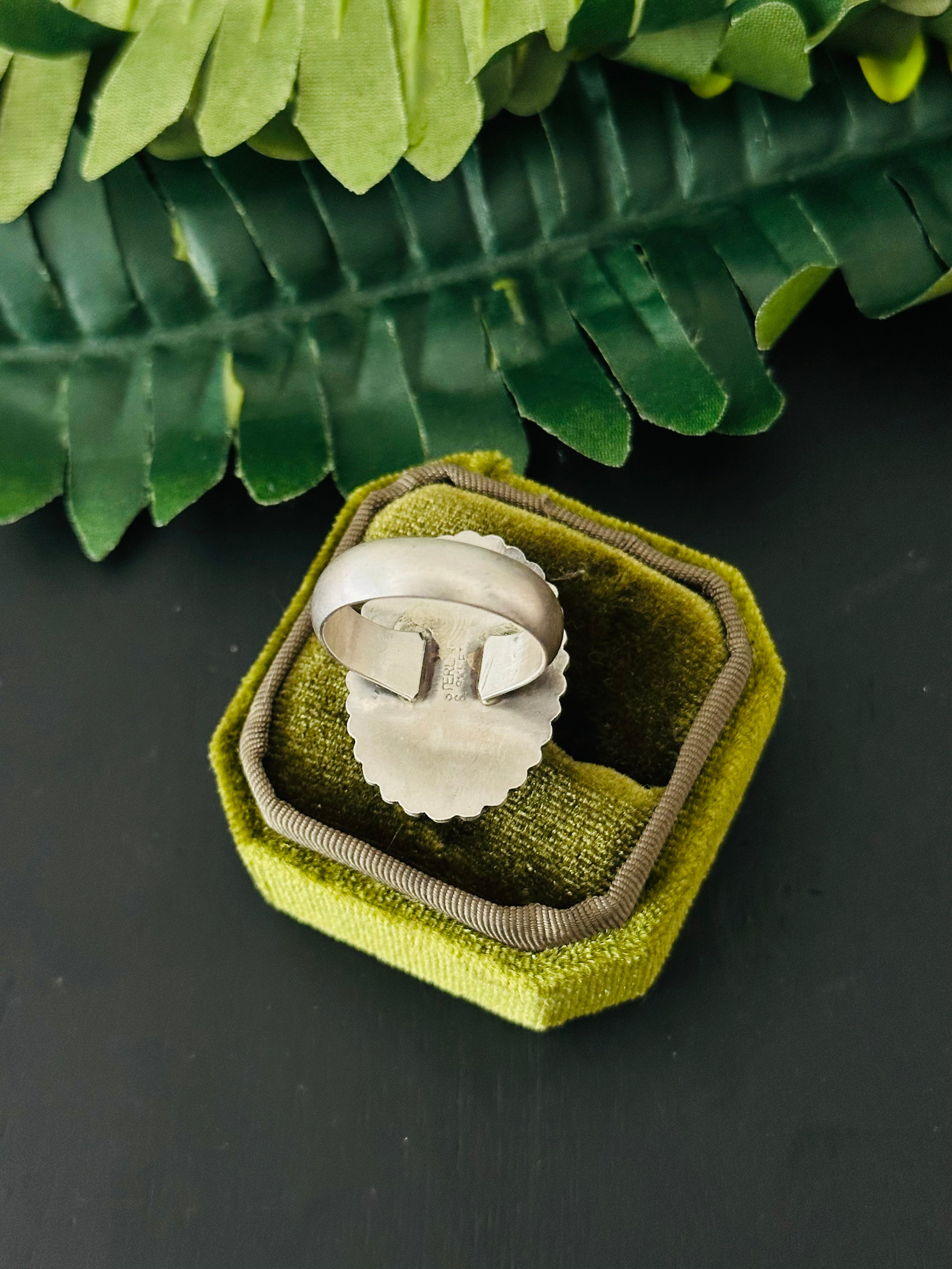 Scott Skeets Royston Turquoise & Sterling Silver Ring Size 7.25. It measures 1 1/4 inches long and 7/8 of an inch wide. Signed by the artist and stamped sterling silver.