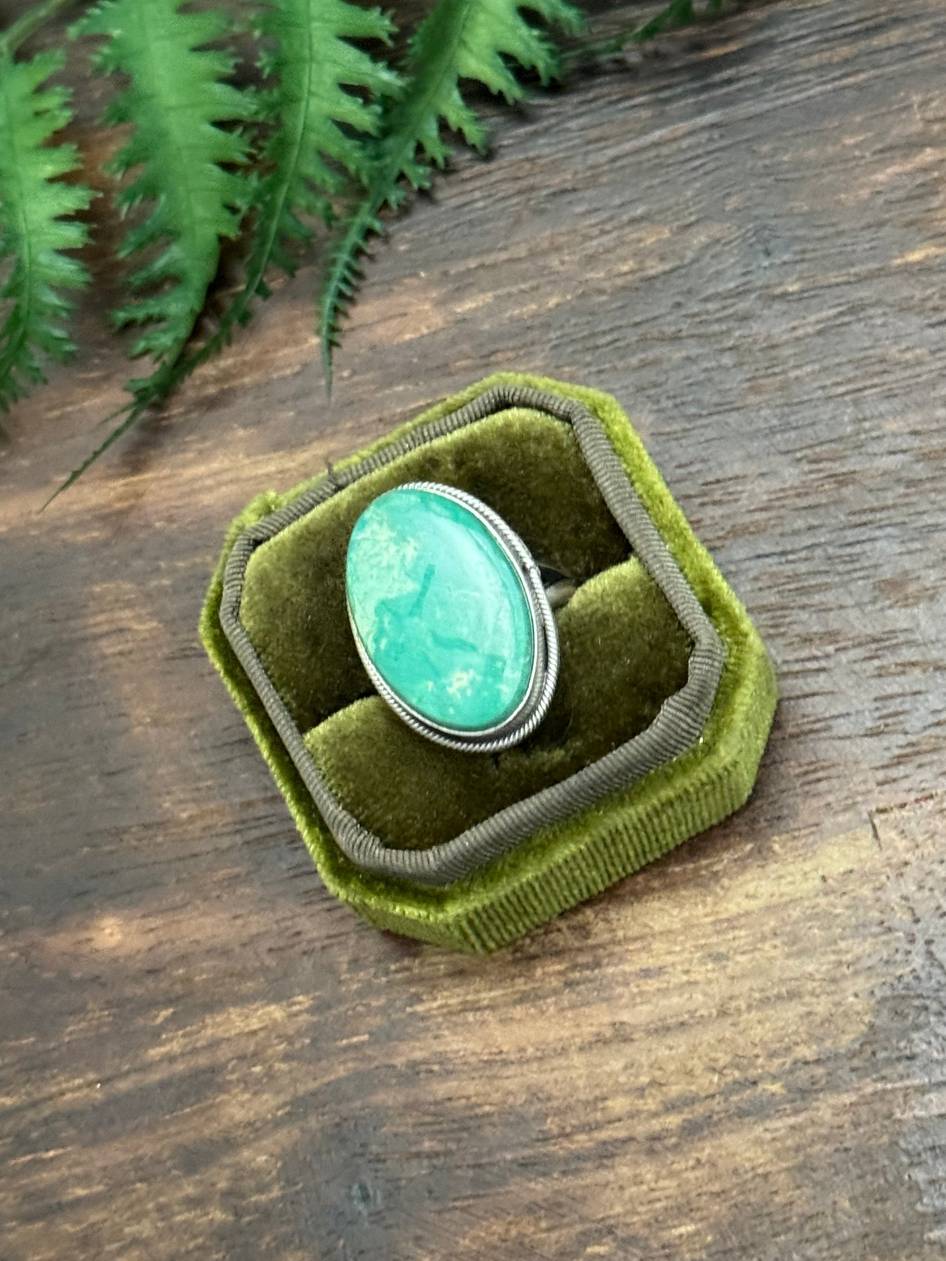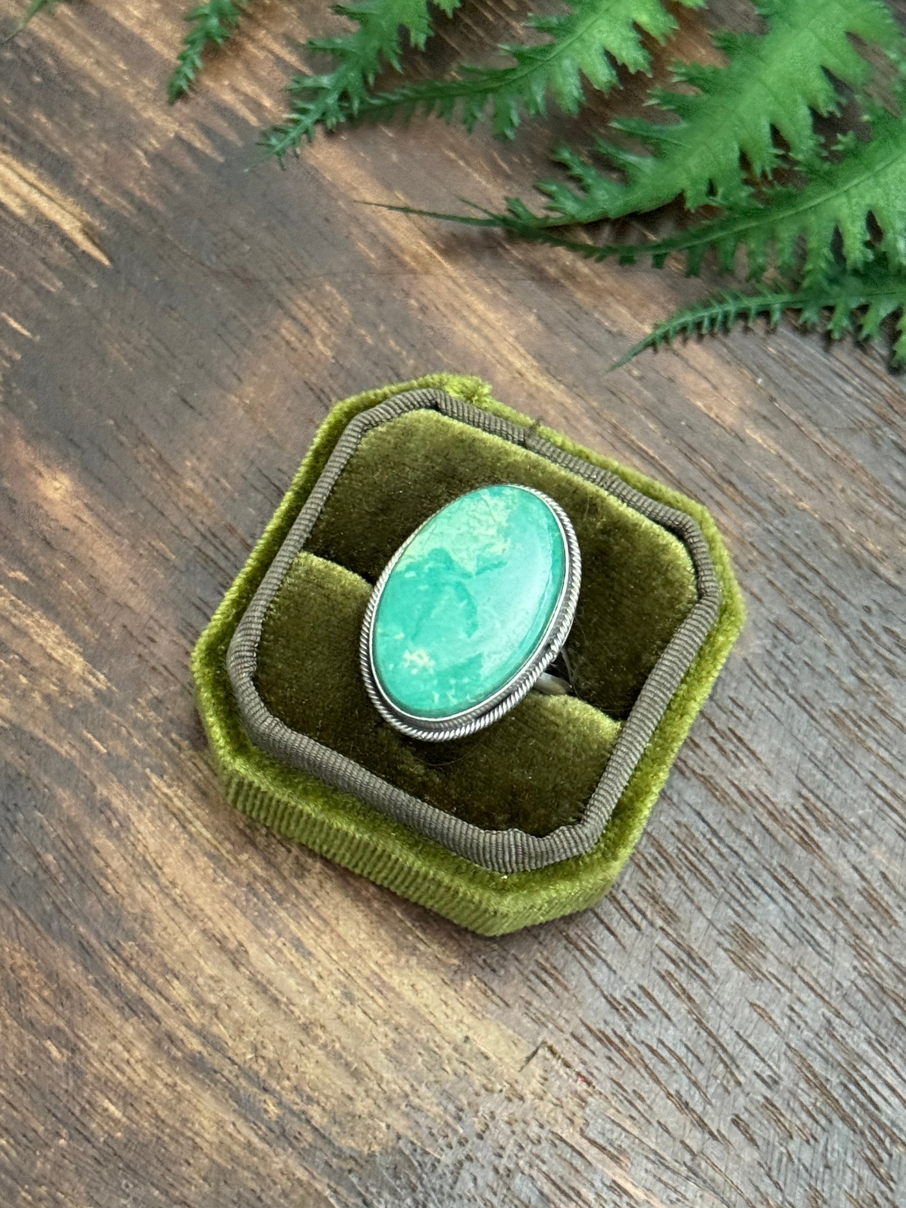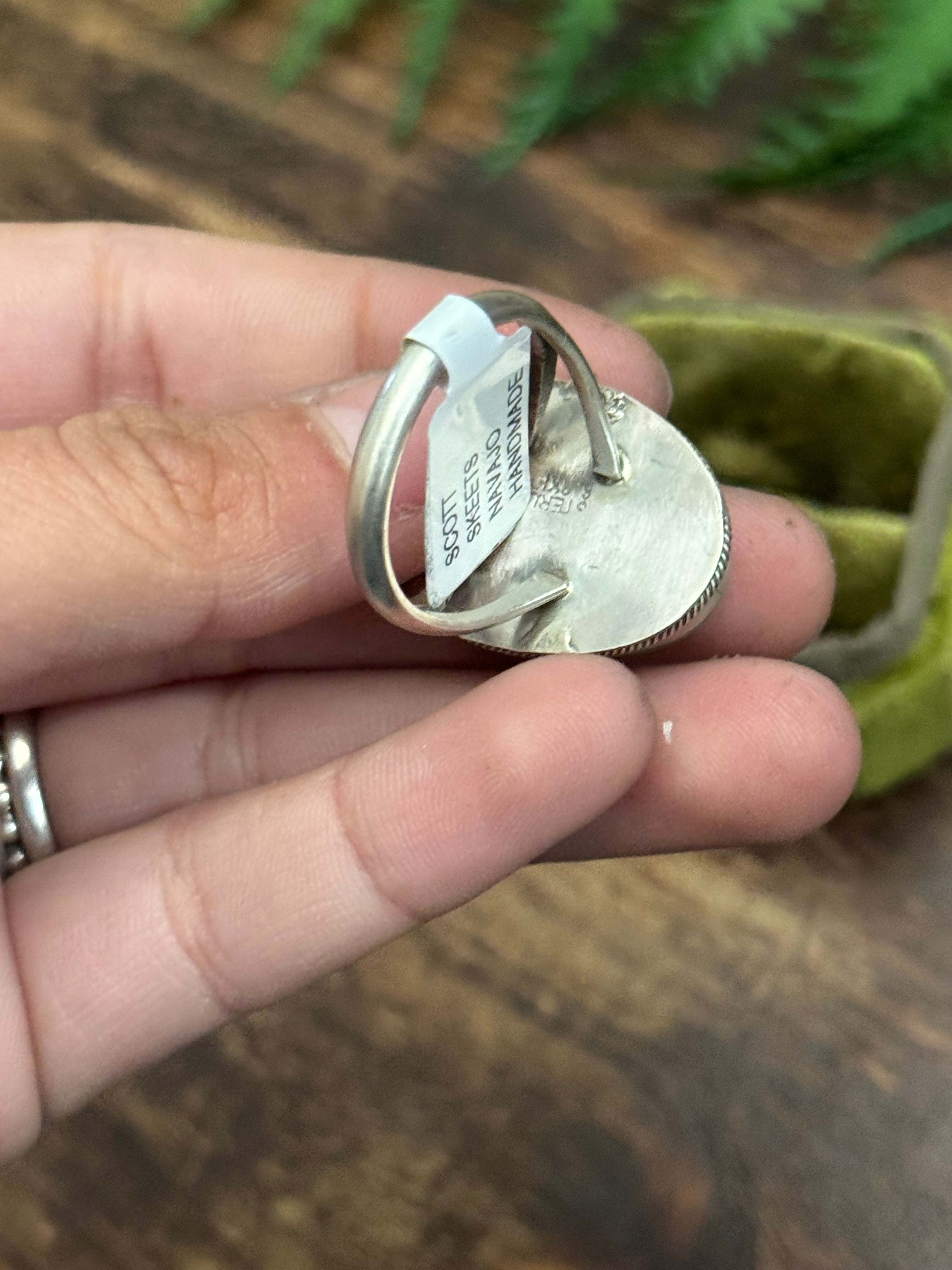 Scott Skeets Royston Turquoise & Sterling Silver Ring Size 10.25. It measures 1 1/8 inches long and 3/4 of an inch wide. Signed by the artist and stamped sterling silver.