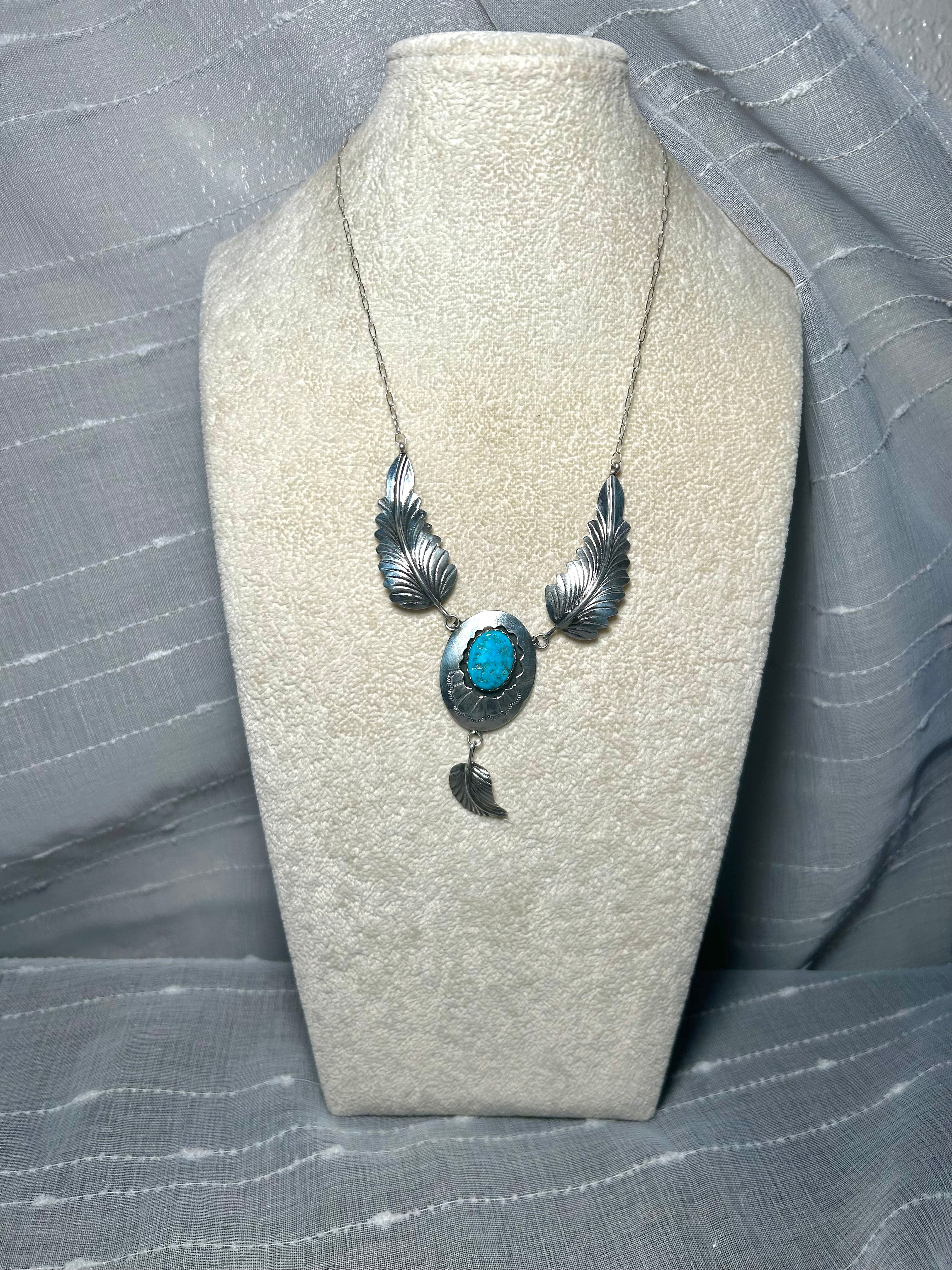 Margie Chee Kingman Turquoise & Sterling Silver Necklace. It measures 22 inches long with hang while the chain measures 13 inches long. Signed by the artist and stamped sterling silver.