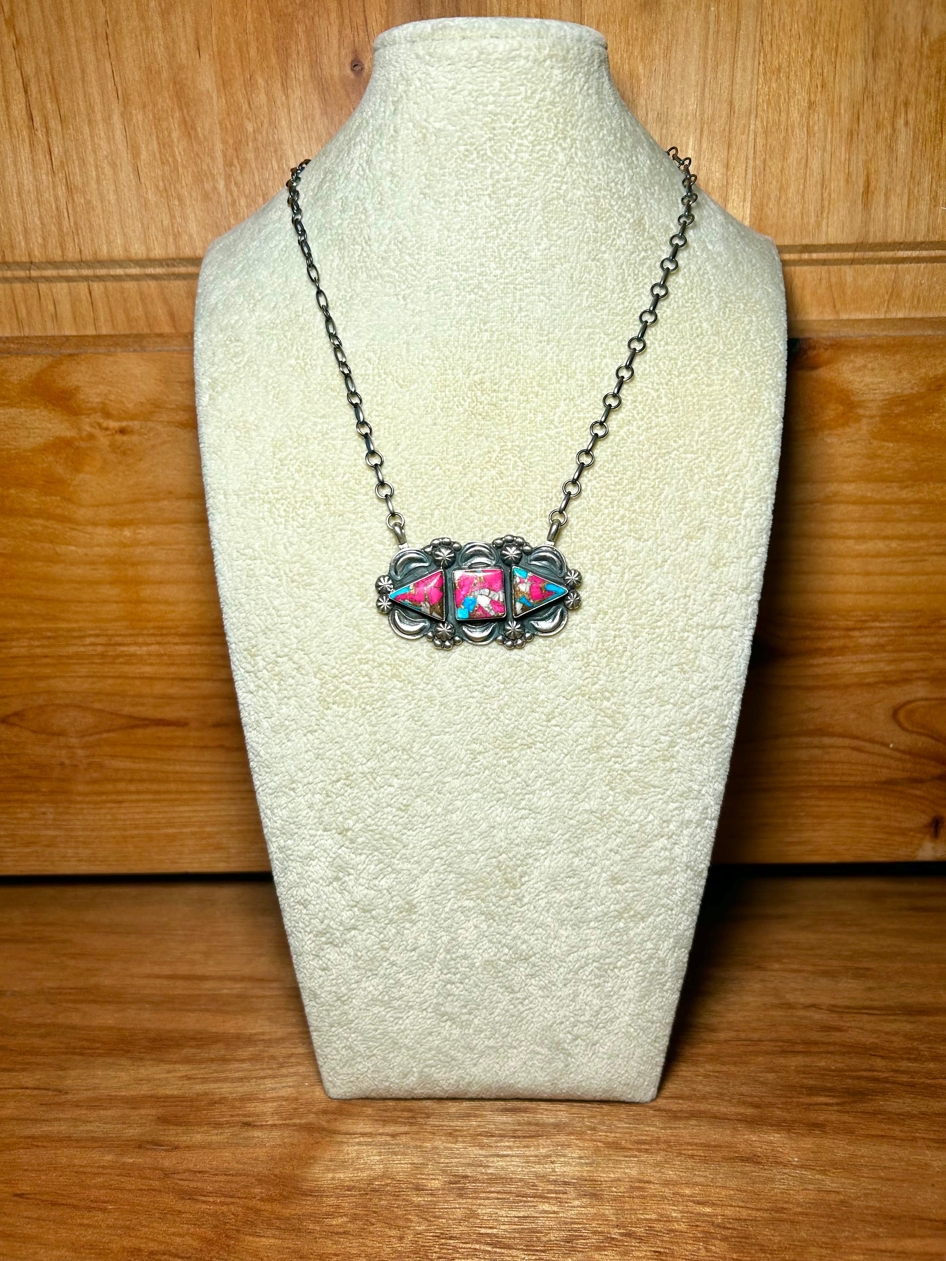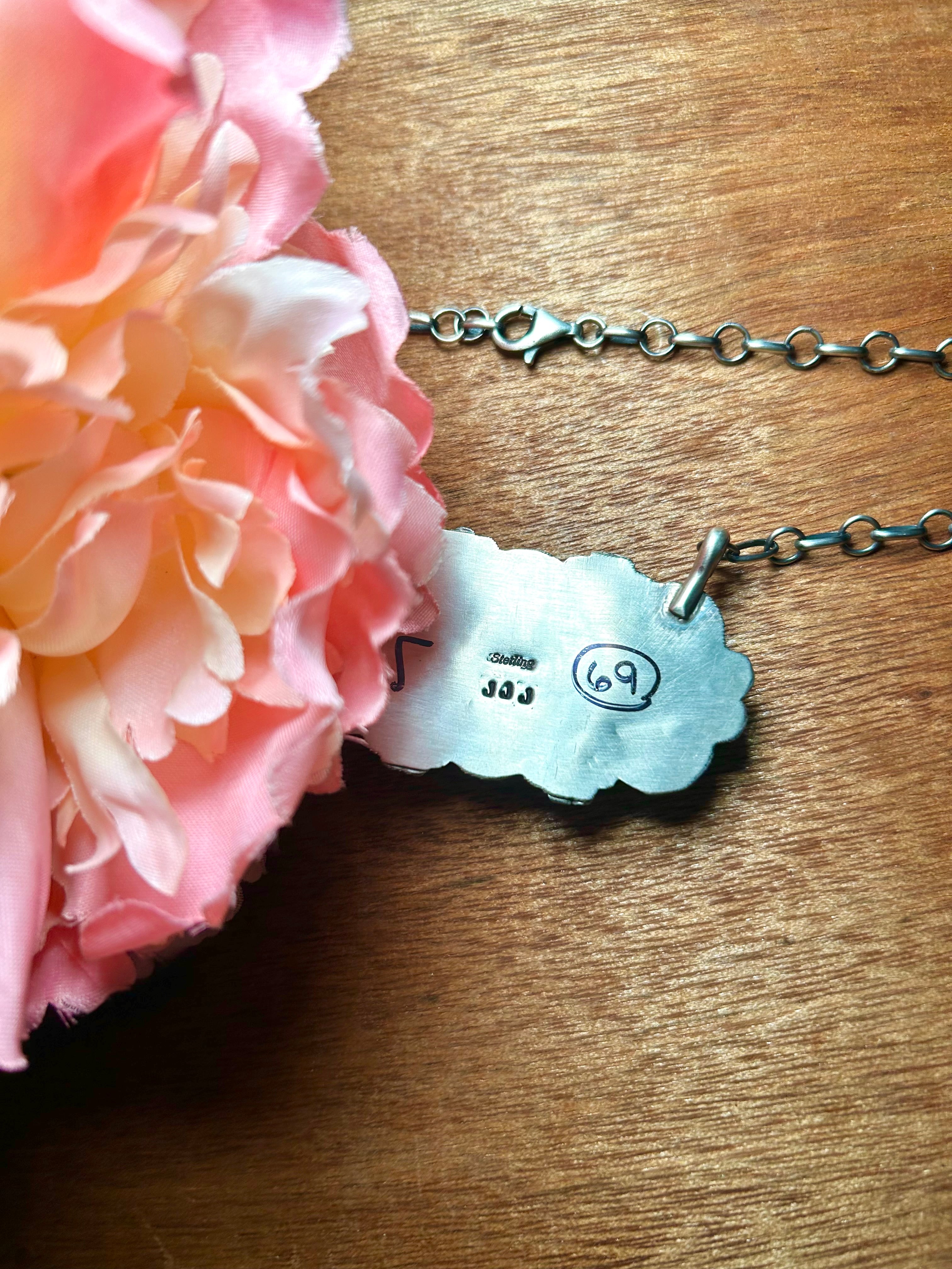 Jeff James Mohave Turquoise & Sterling Sliver Necklace. It measures 19 3/4 inches long while the chain measure 17 inches long. Signed by the artist and stamped sterling silver. Stones will vary due to natural stones.