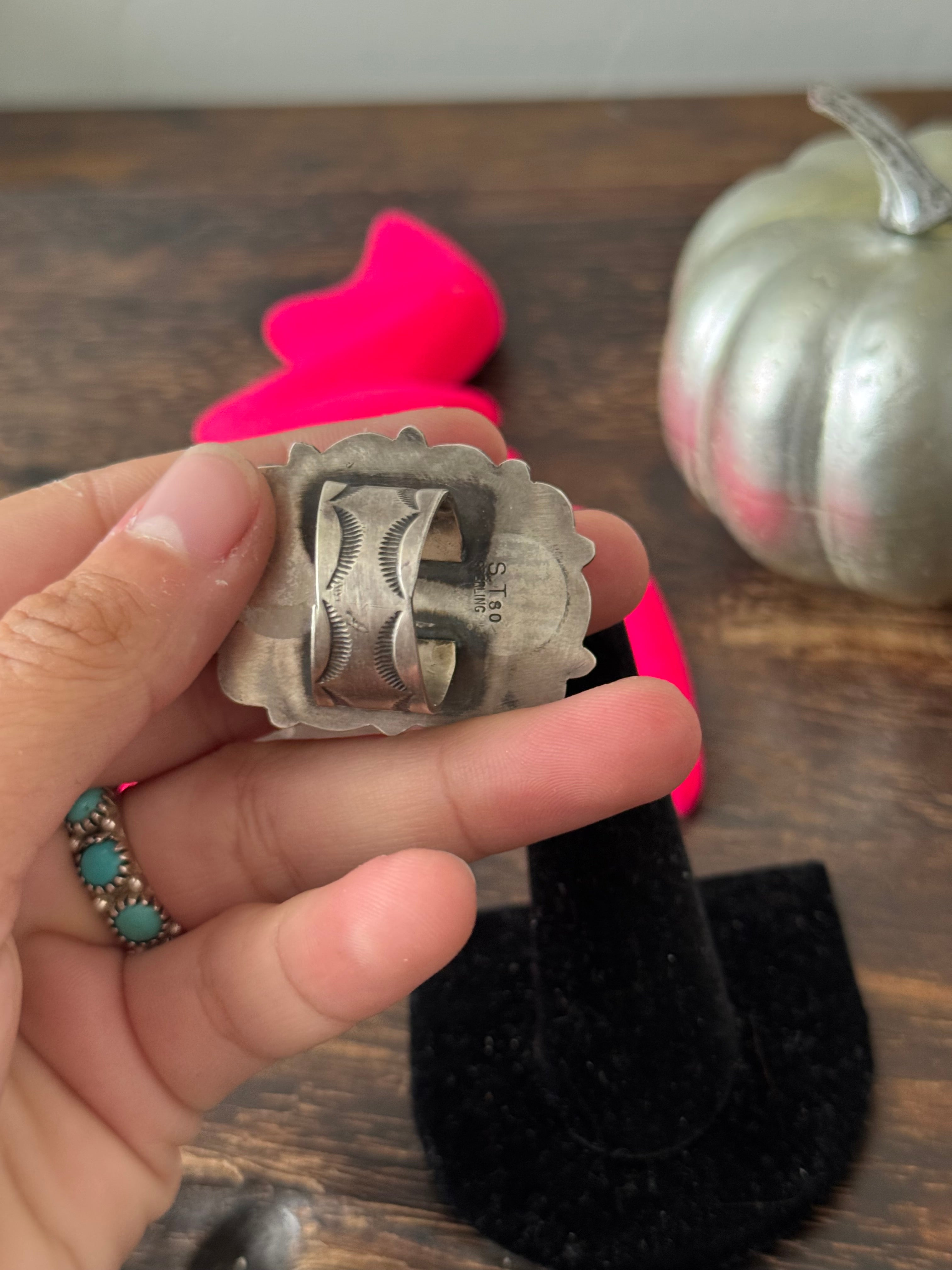 Sheila Becenti Kingan Turquoise Sterling Silver Ring Size 8.75. It measures 1 5/8 inches long and 1 1/4 inches wide. Signed by the artist and stamped sterling silver.