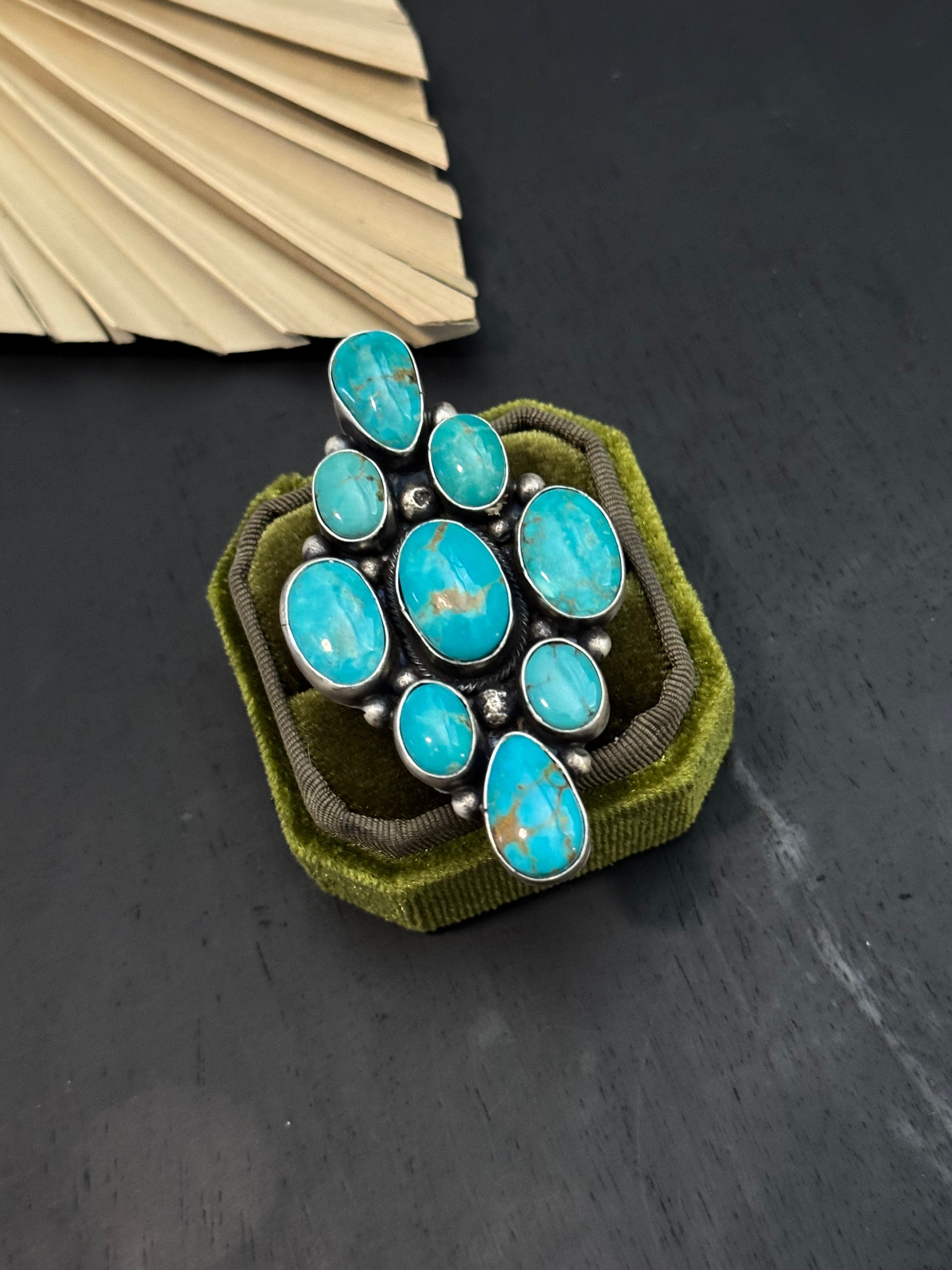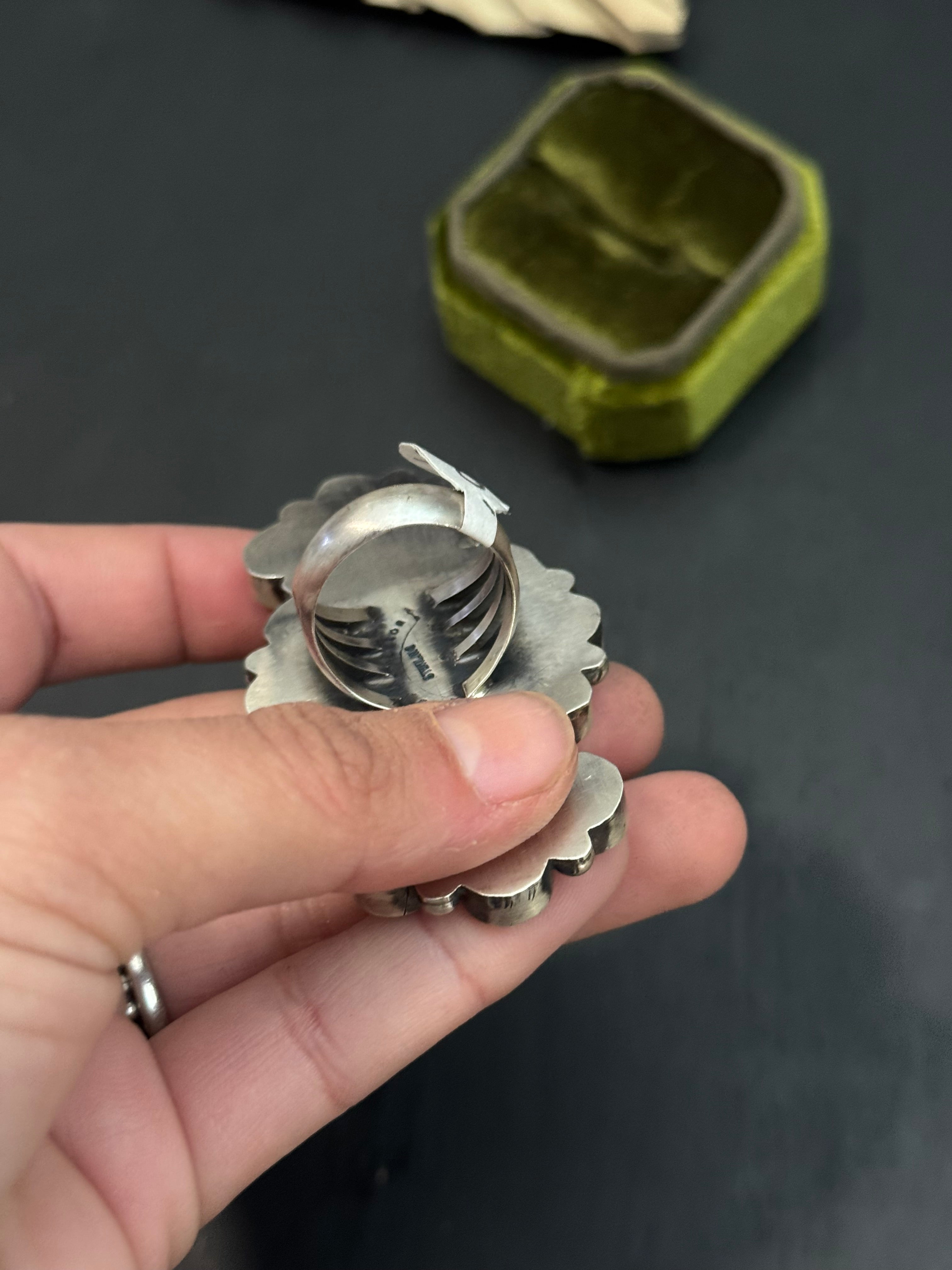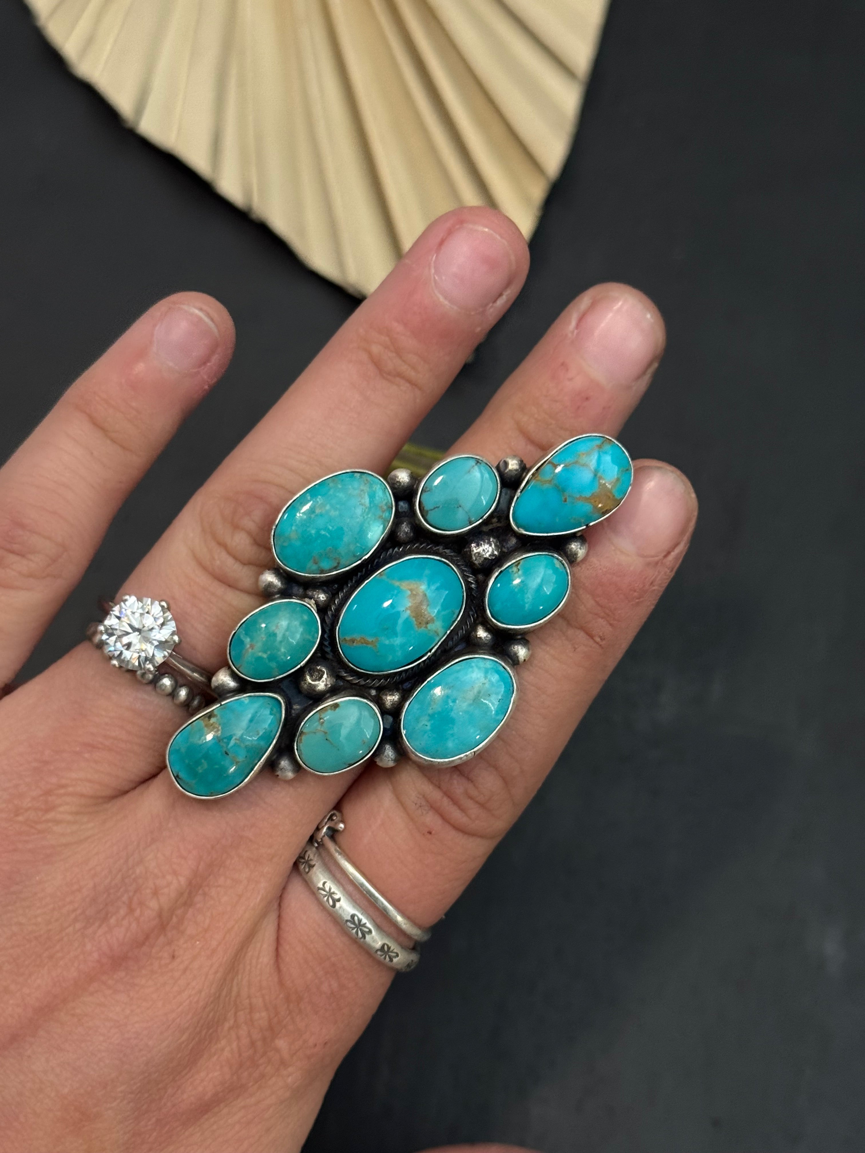 Sheila Becenti Kingan Turquoise Sterling Silver Ring Size 9.25. It measures 2 3/8 inches long and 1 3/8 inches wide. Signed by the artist and stamped sterling silver.