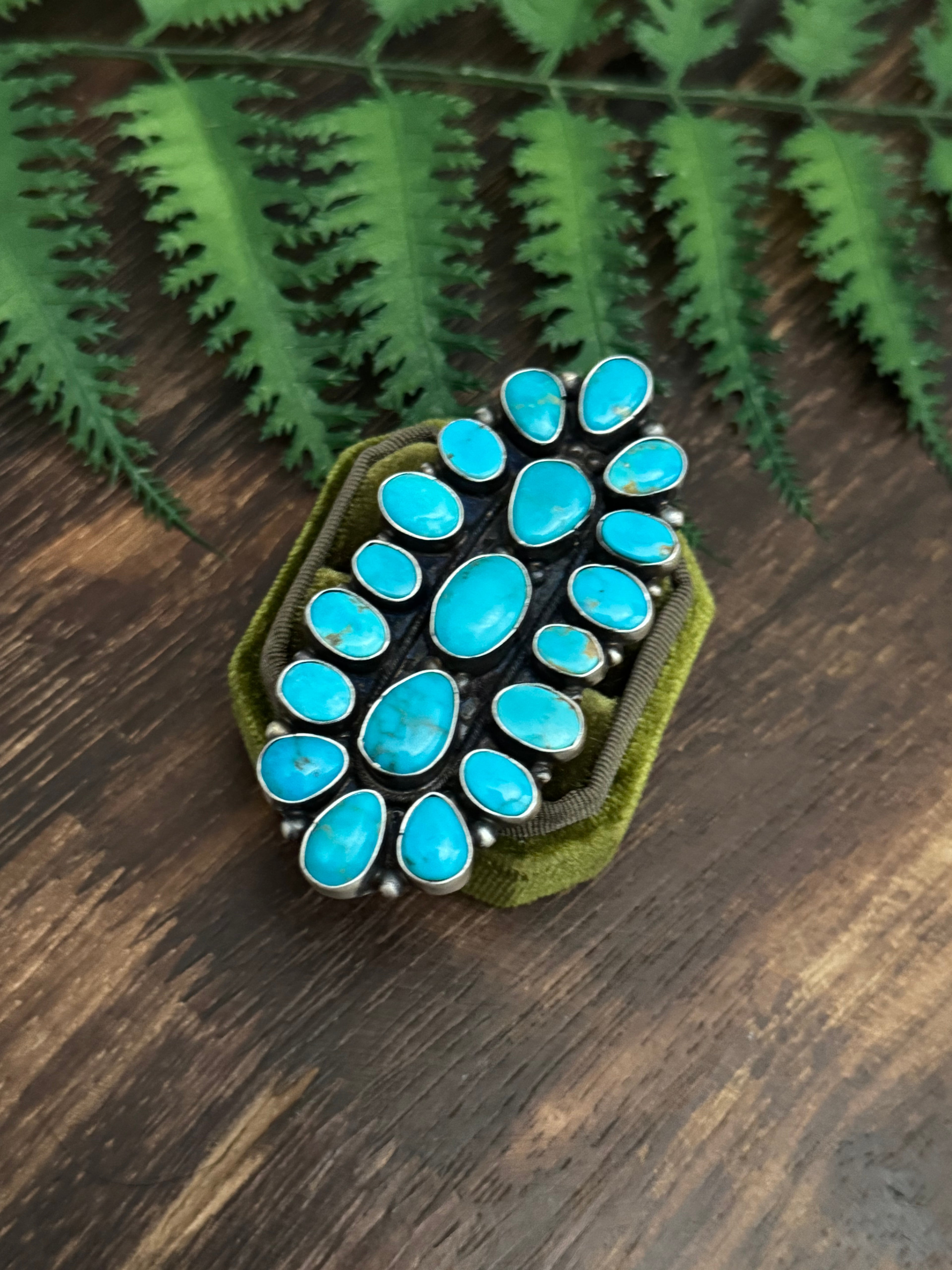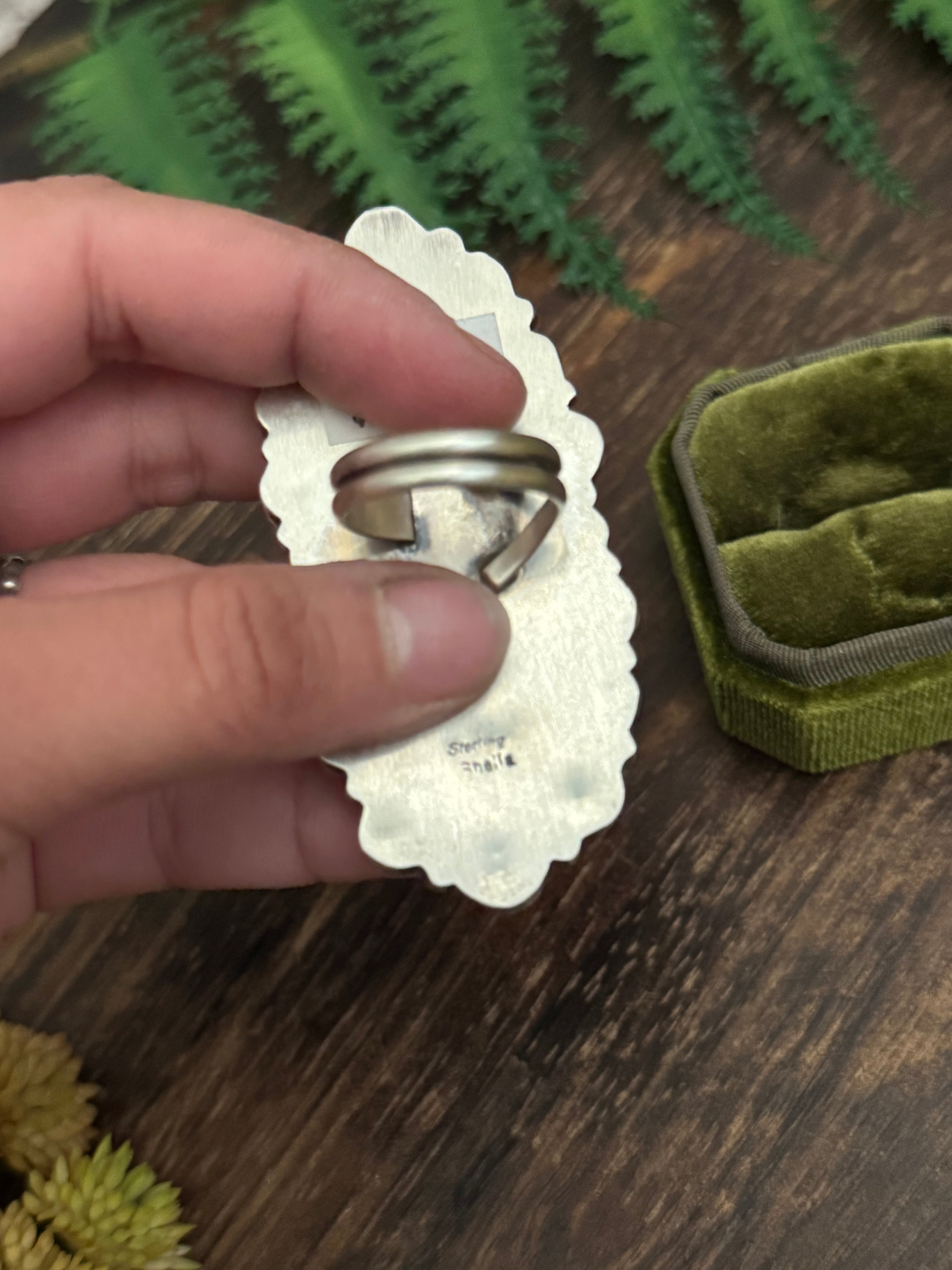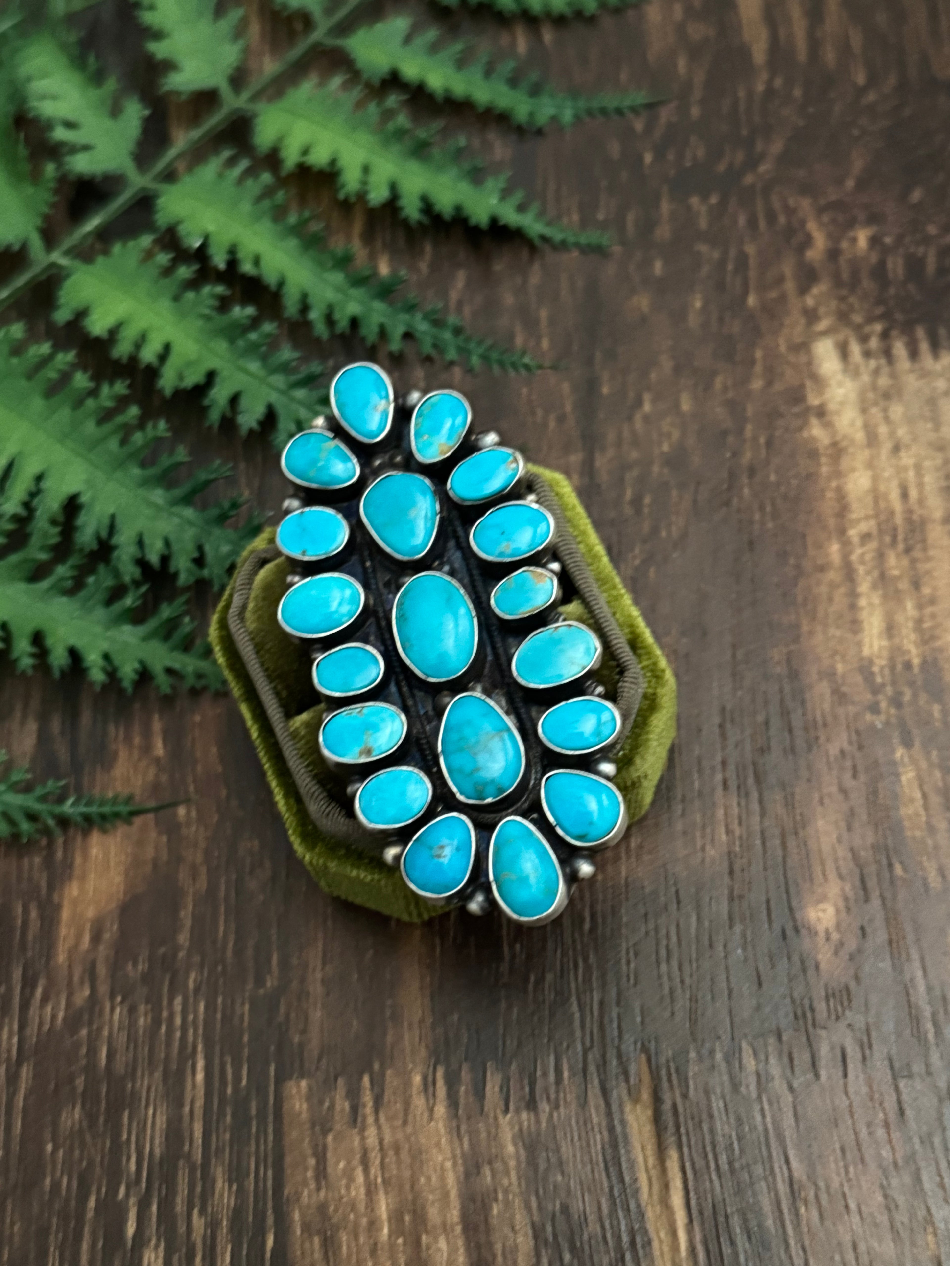 Sheila Becenti Kingman Turquoise Sterling Silver Adjustable Ring. It measures 2 7/8 inches long and 1 1/4 inches wide. Signed by the artist and stamped sterling silver.