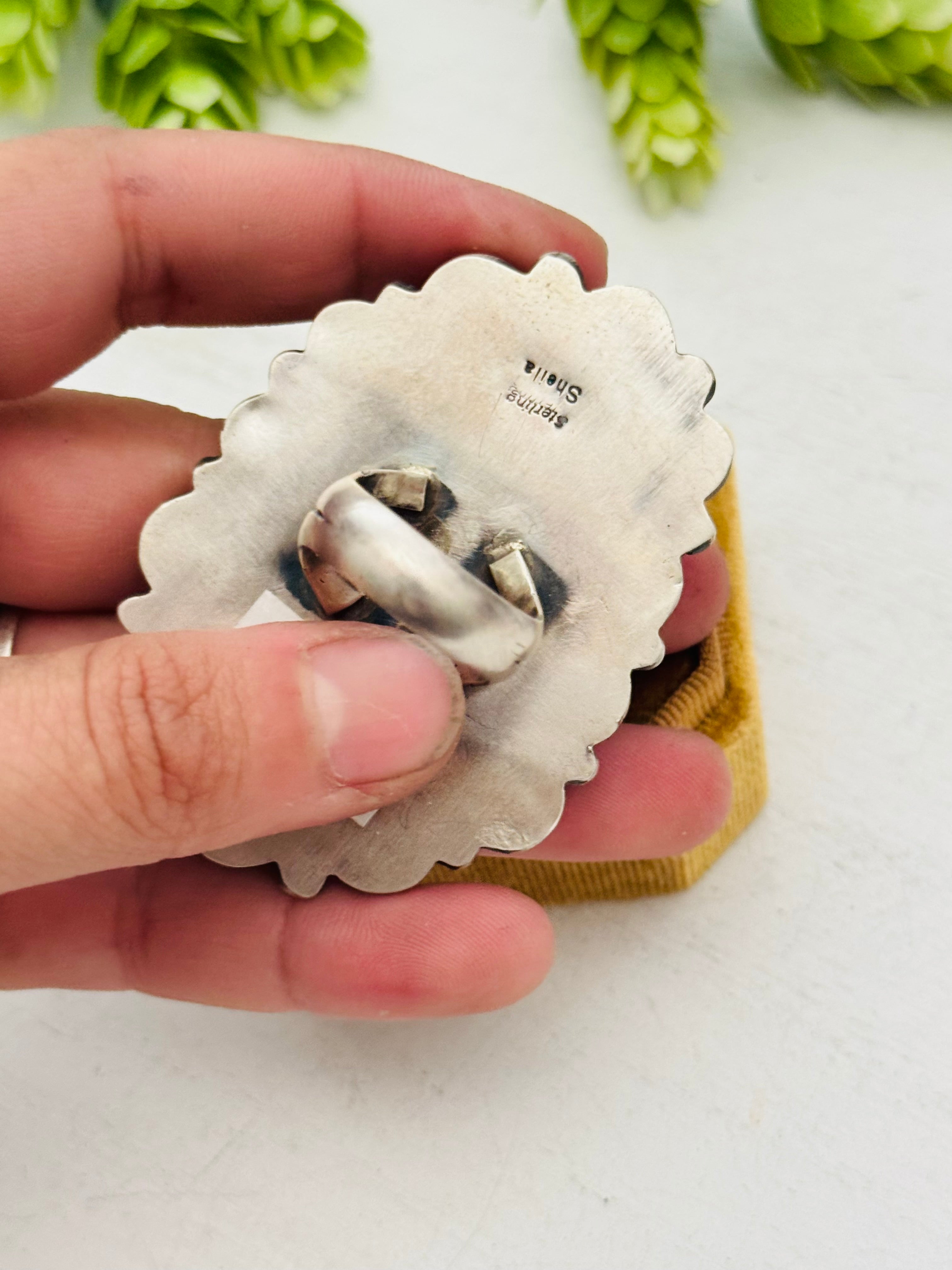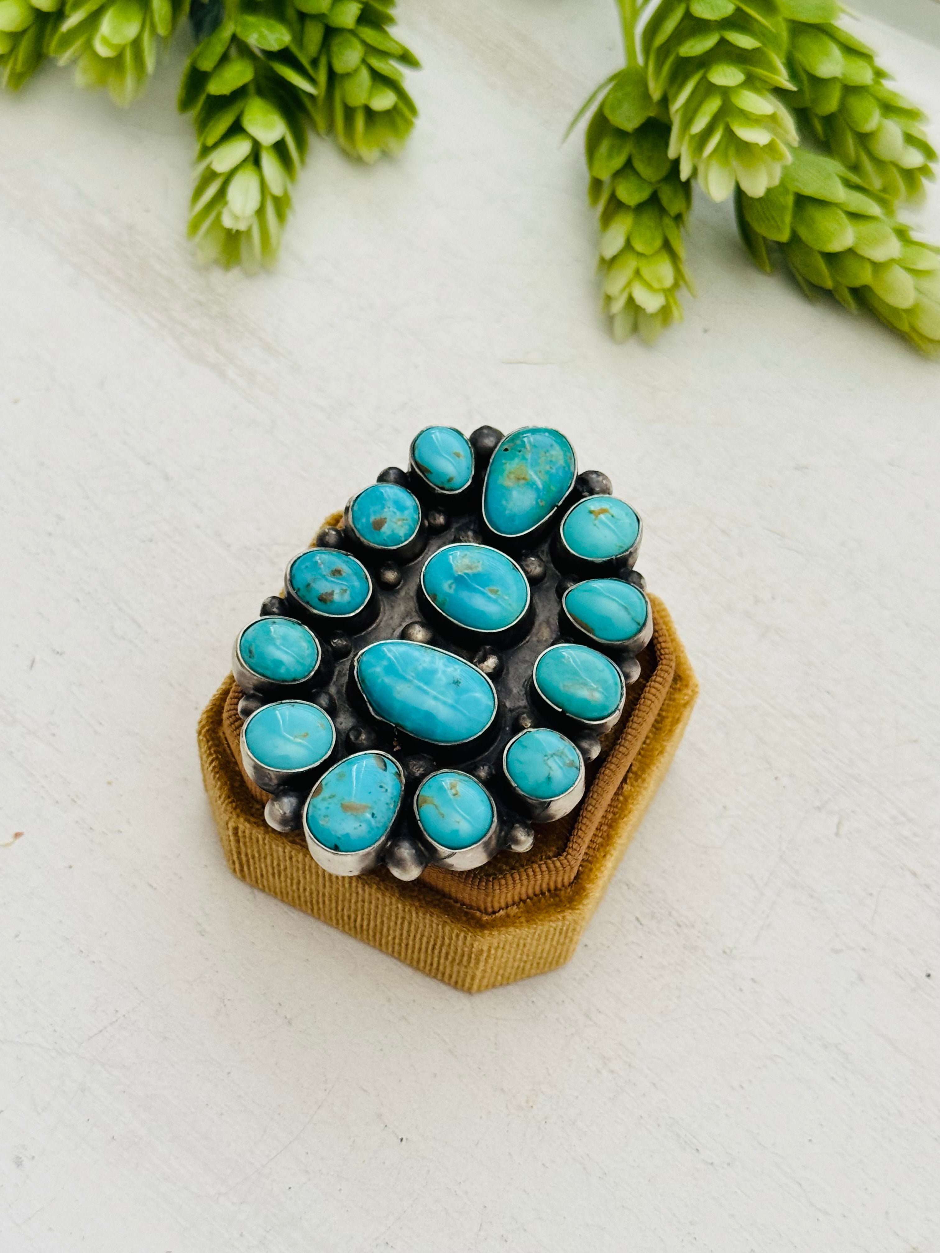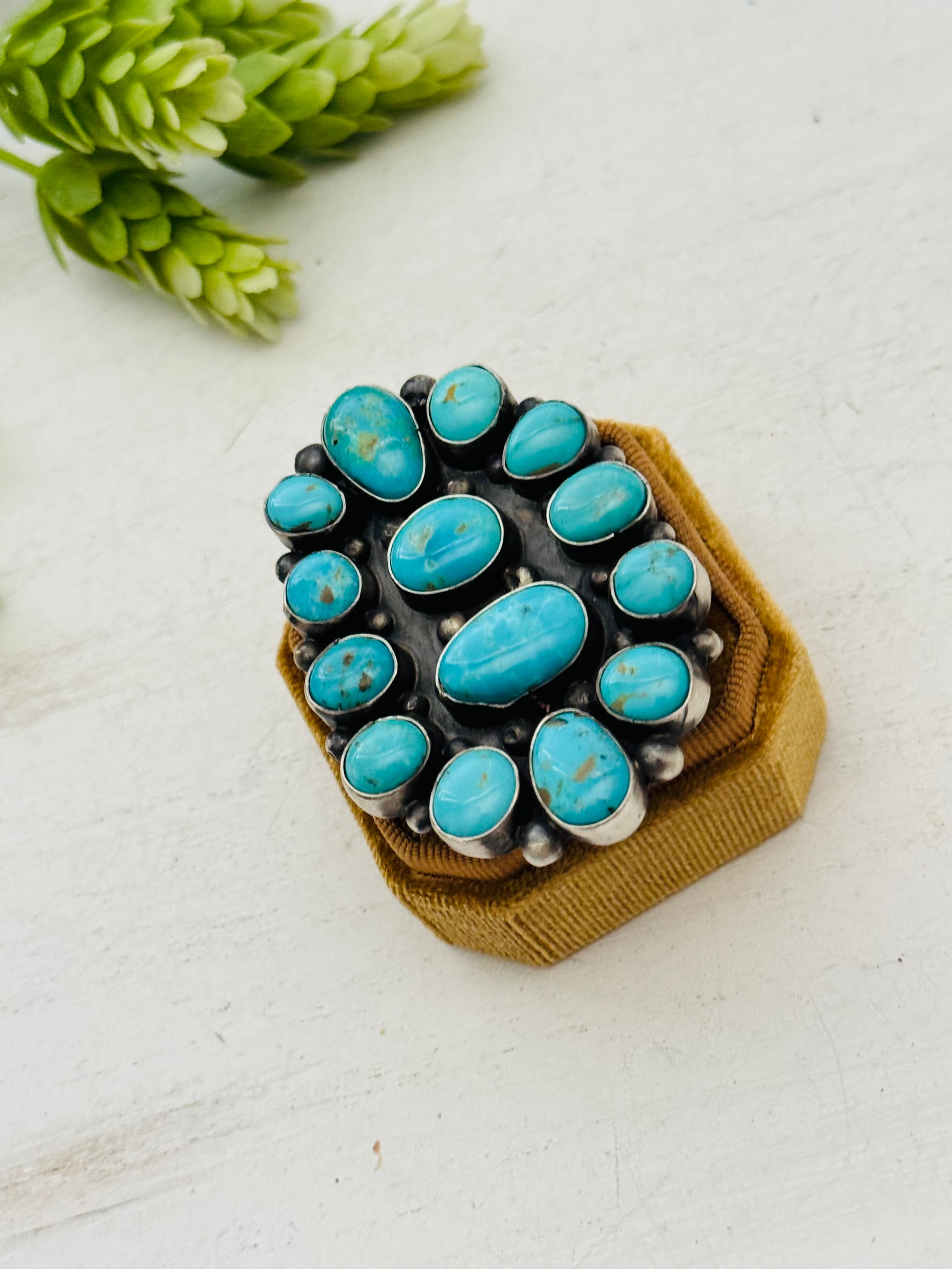 Sheila Becenti Kingan Turquoise Sterling Silver Ring Size 7. It measures 2 1/4 inches long and 1 5/8 inches wide. Signed by the artist and stamped sterling silver.