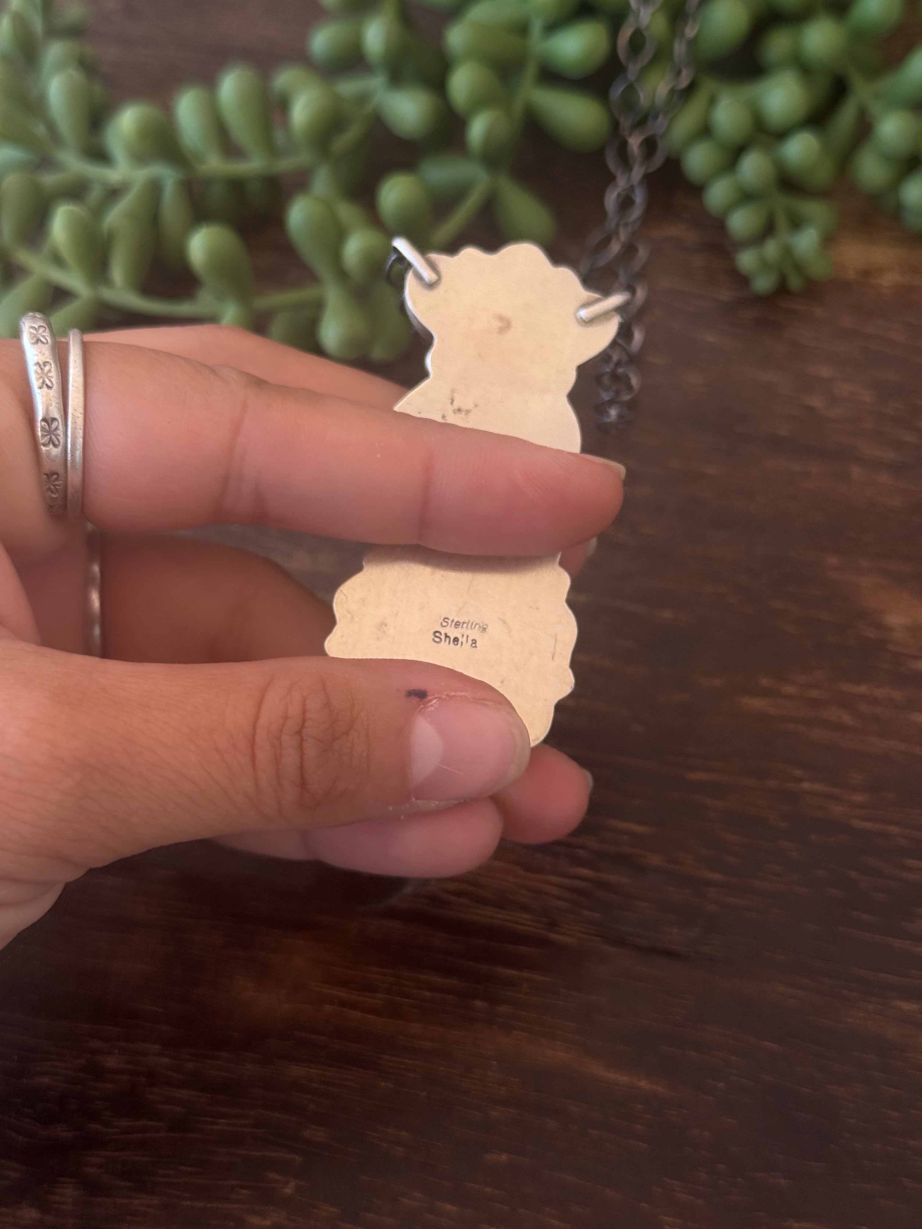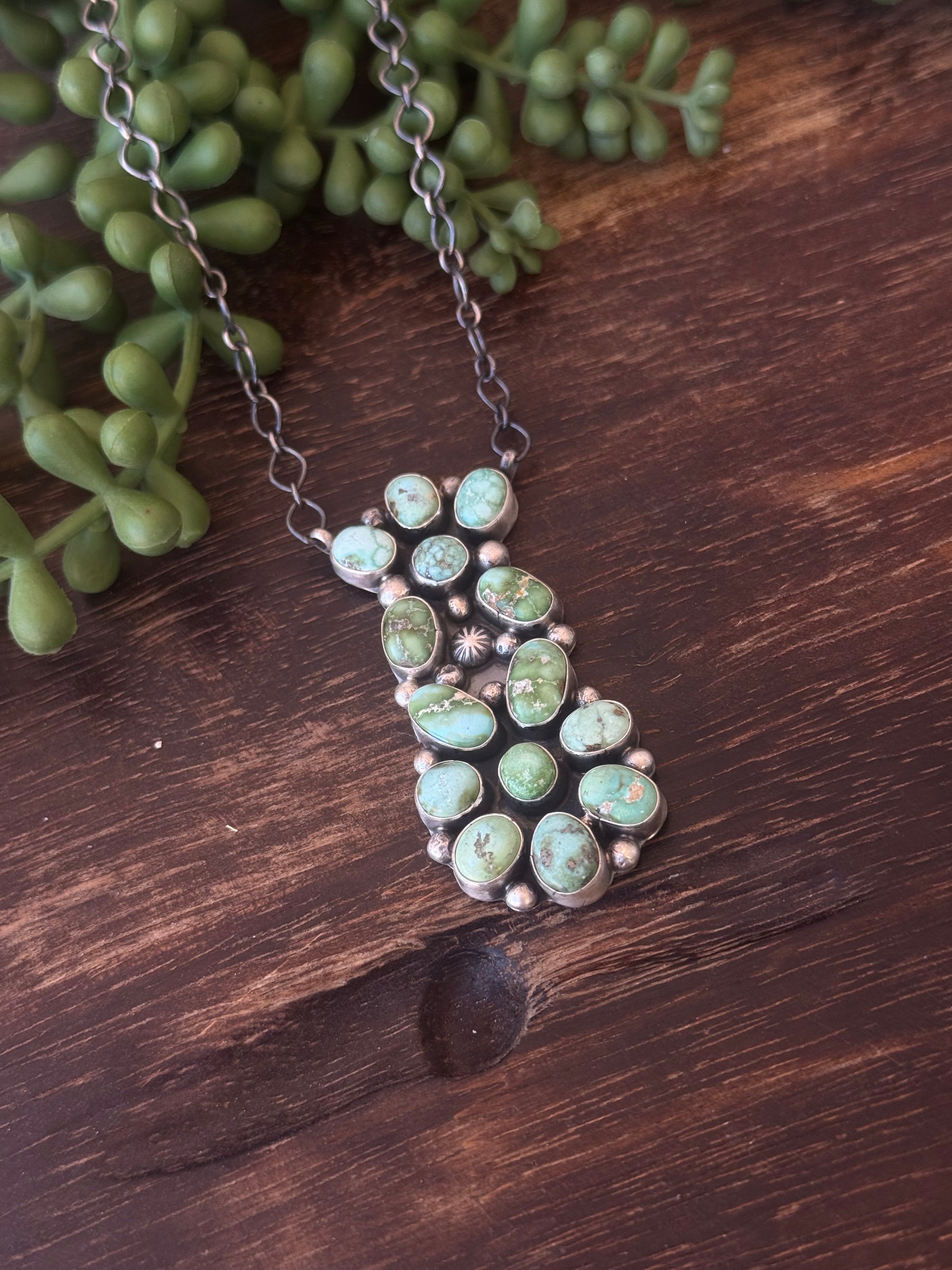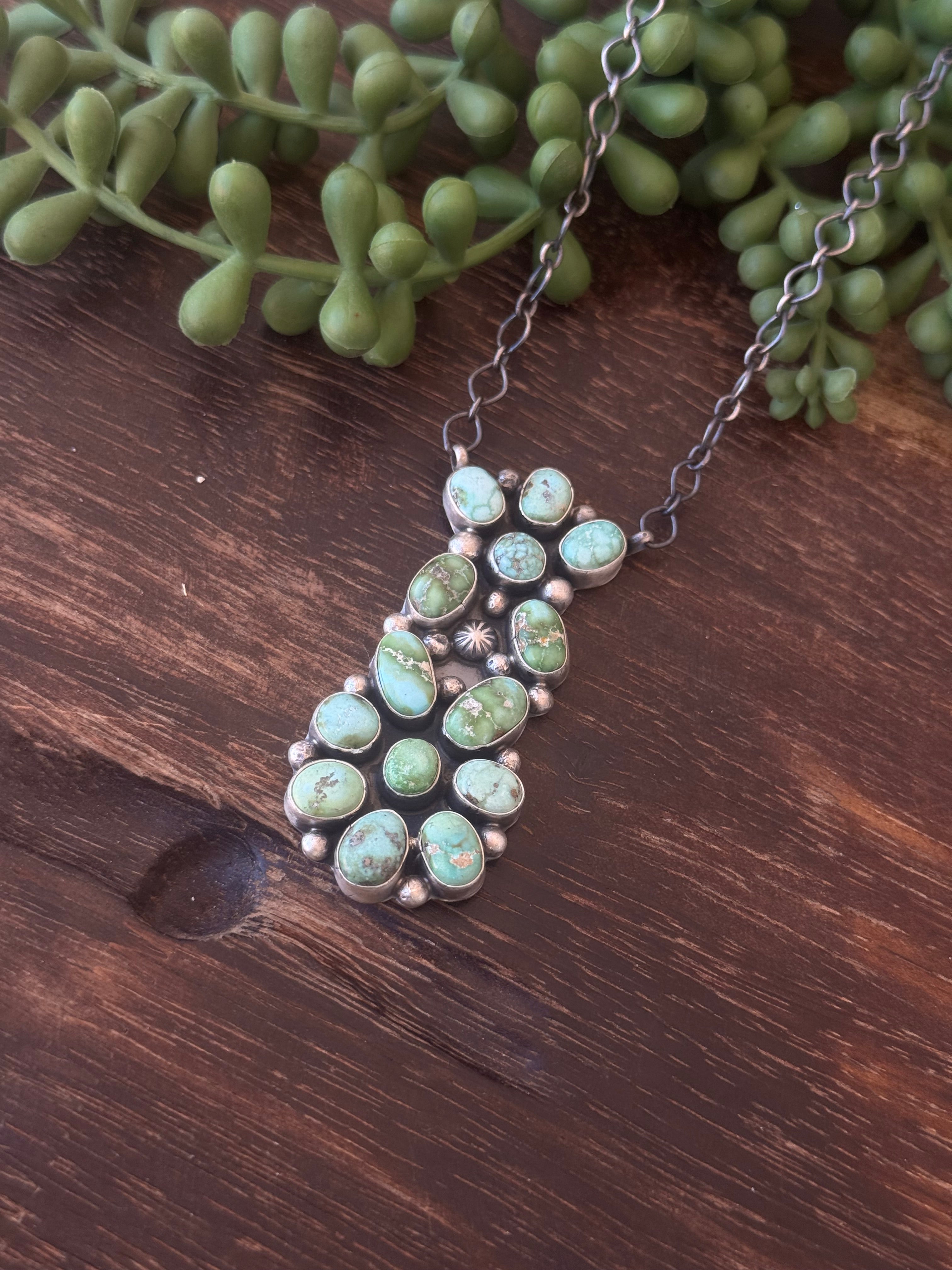Sheila Becenti Sonoran Gold Turquoise & Sterling Sliver Cluster Necklace. It measures 22 inches long while the chain measure 17 inches. Signed by the artist and stamped sterling silver.
