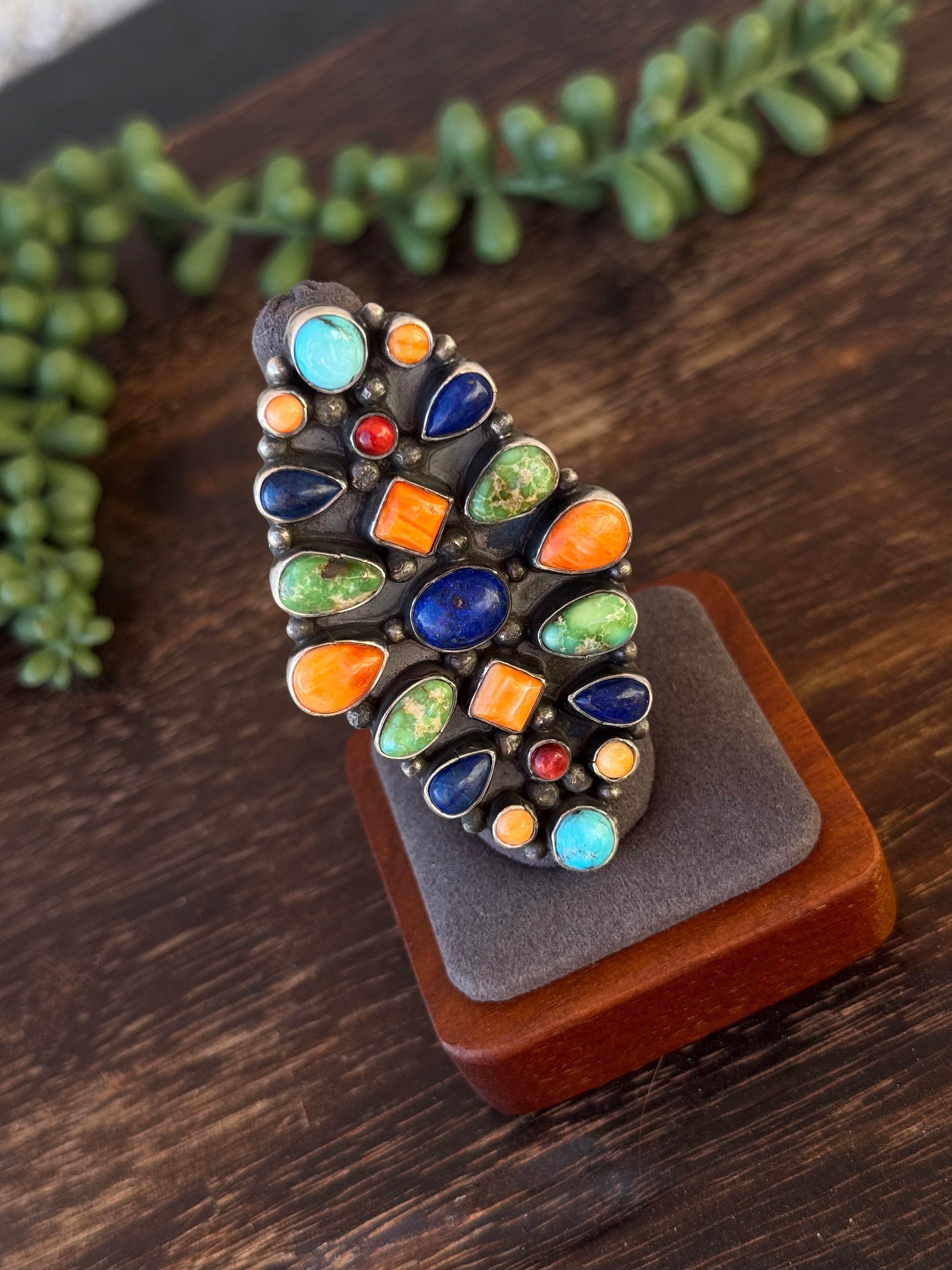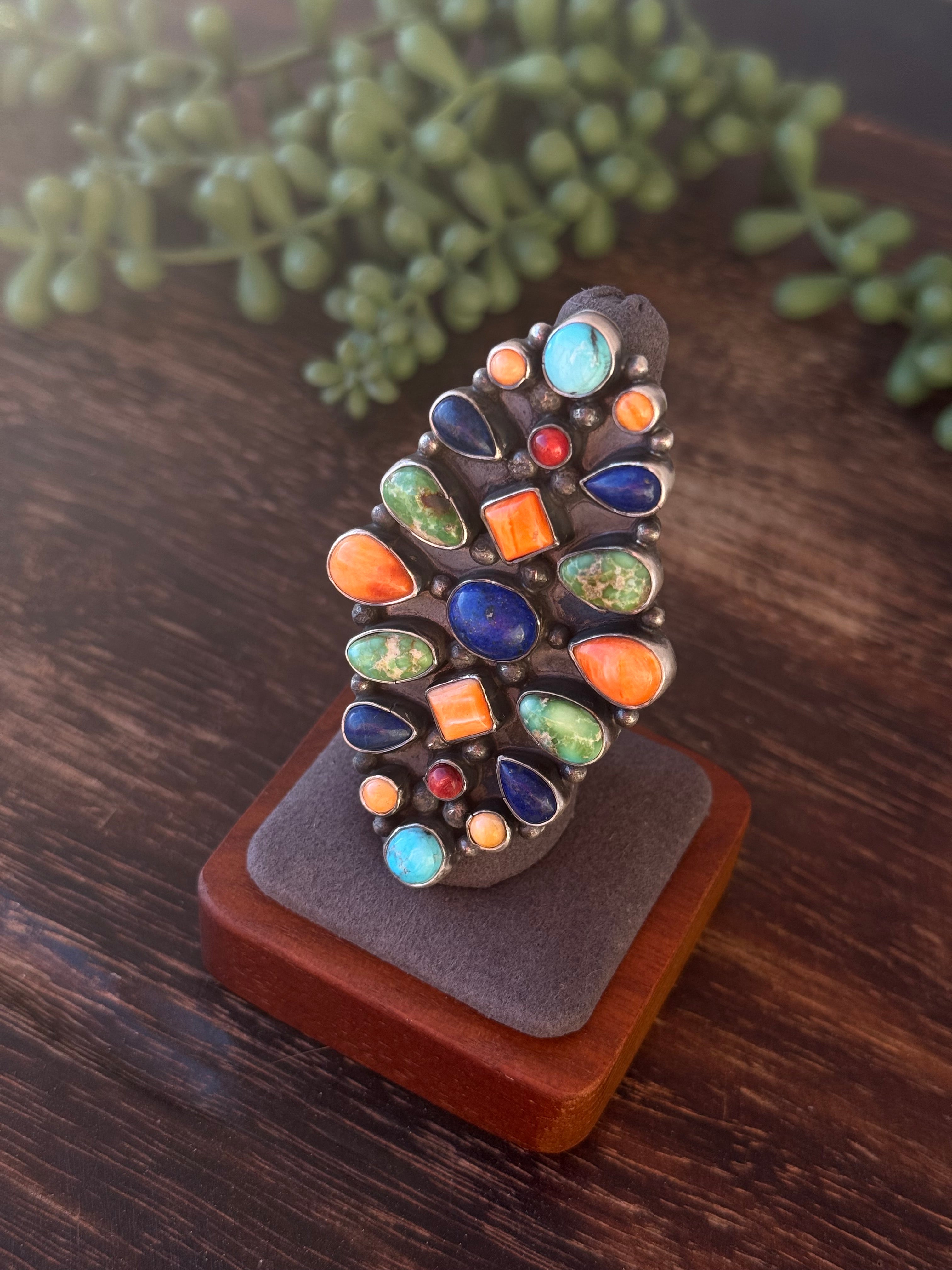 Sheila Becenti Multi Stone & Sterling Silver Adjustable Ring. It measures 2 1/2 inches long and 1 1/2 inches wide.