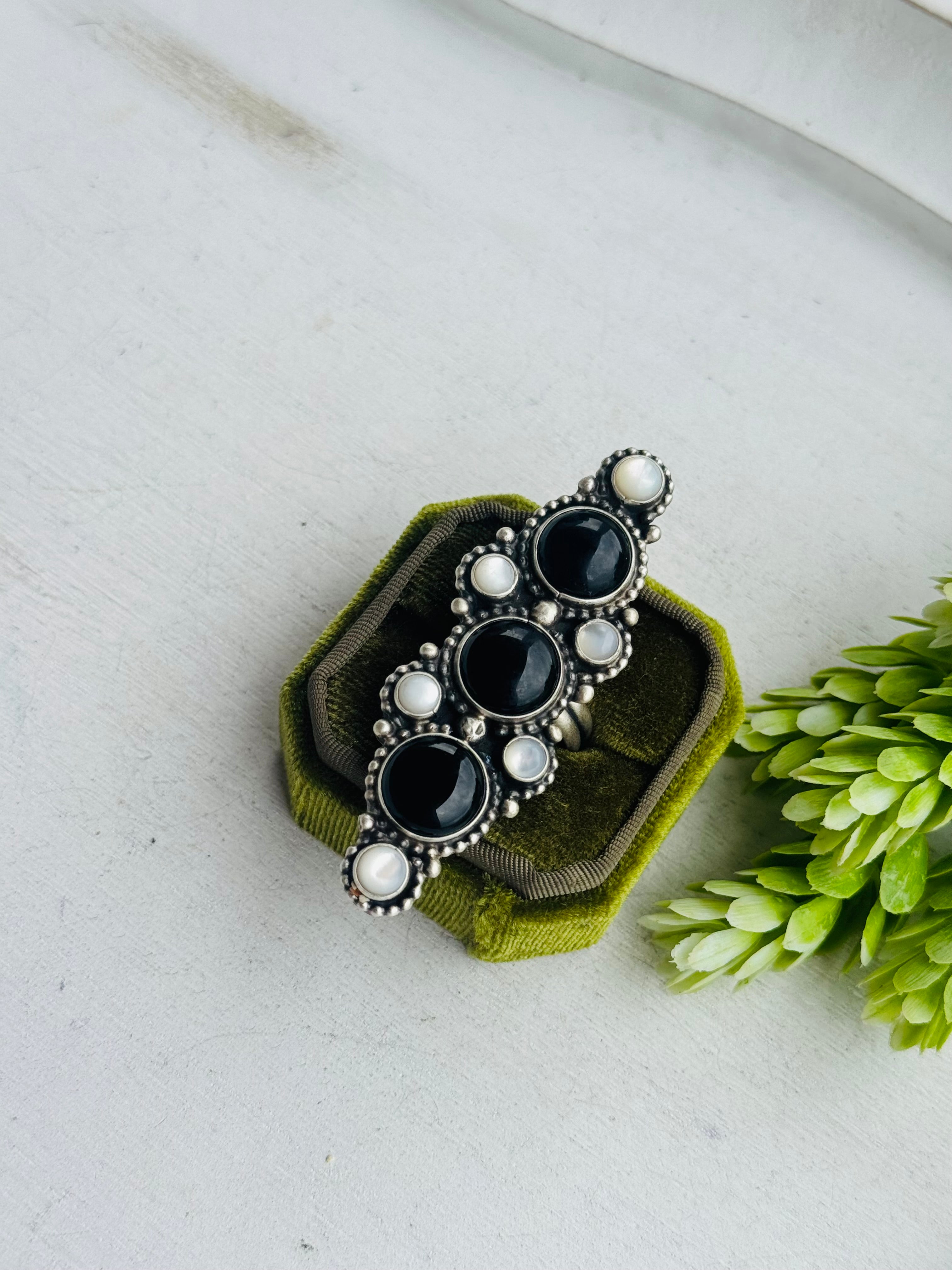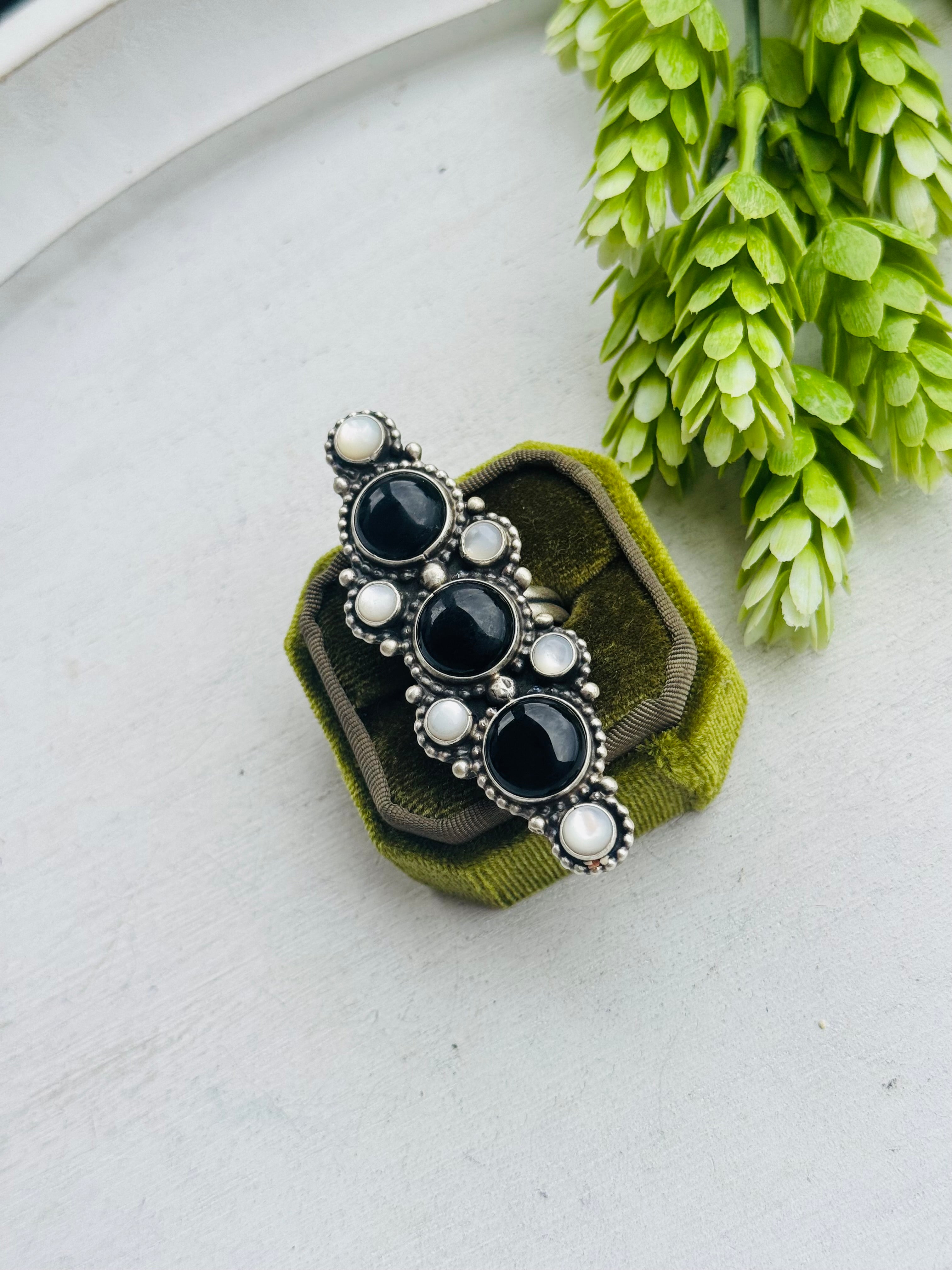 Sheila Becenti Multi Stone & Sterling Silver Cluster Adjustable Ring. It measures 2 3/4 inches long and 1 inch wide. Signed by the artist and stamped sterling silver.