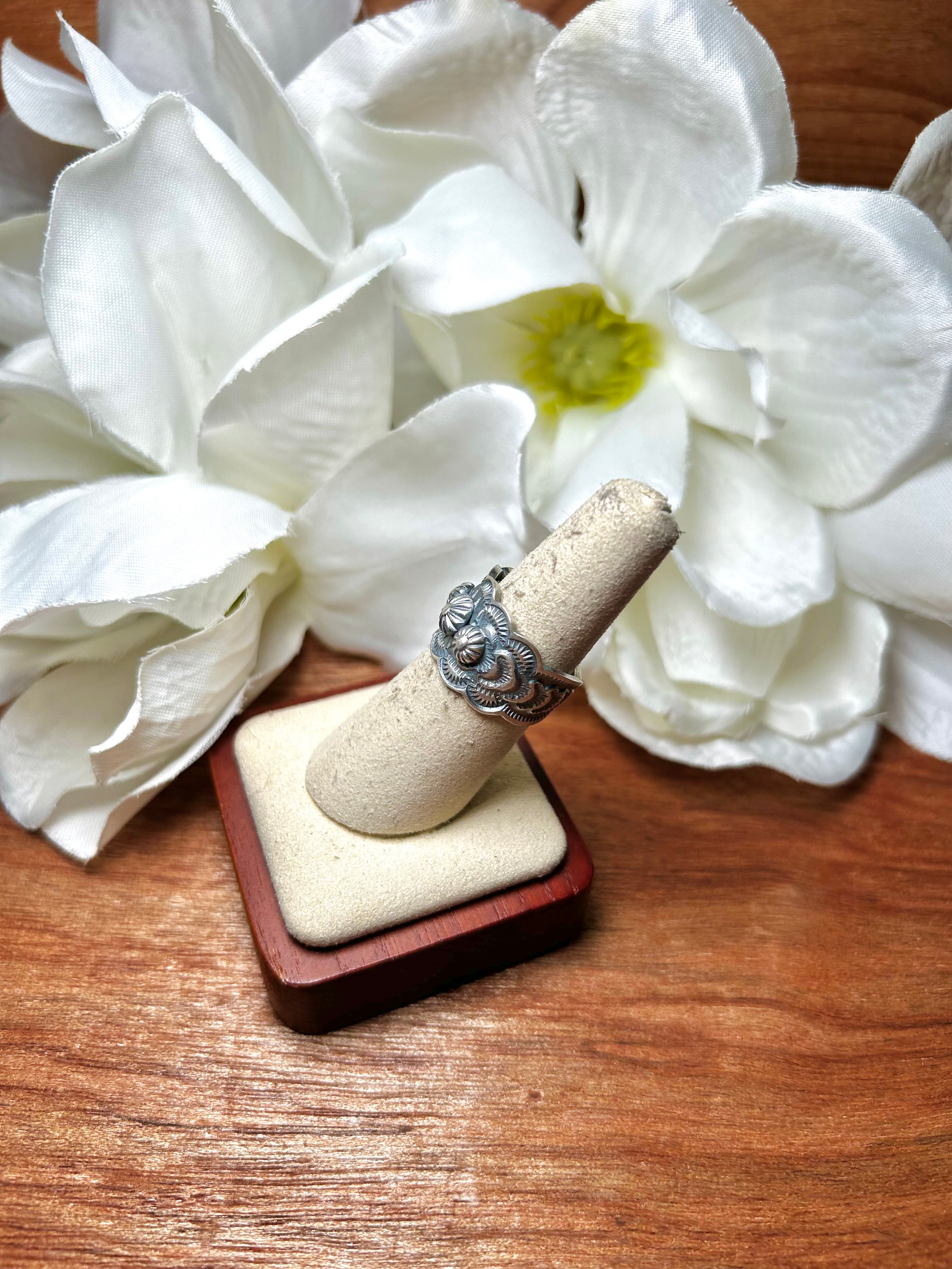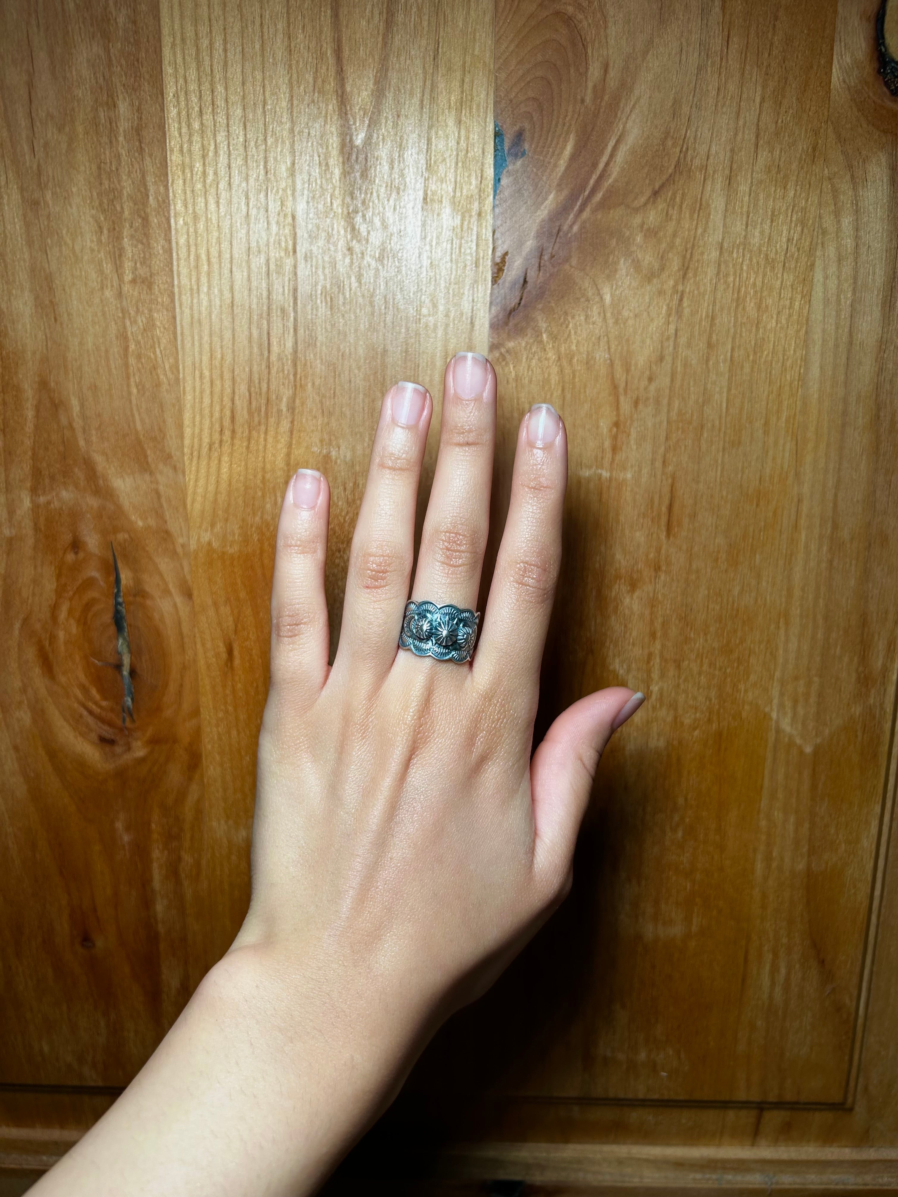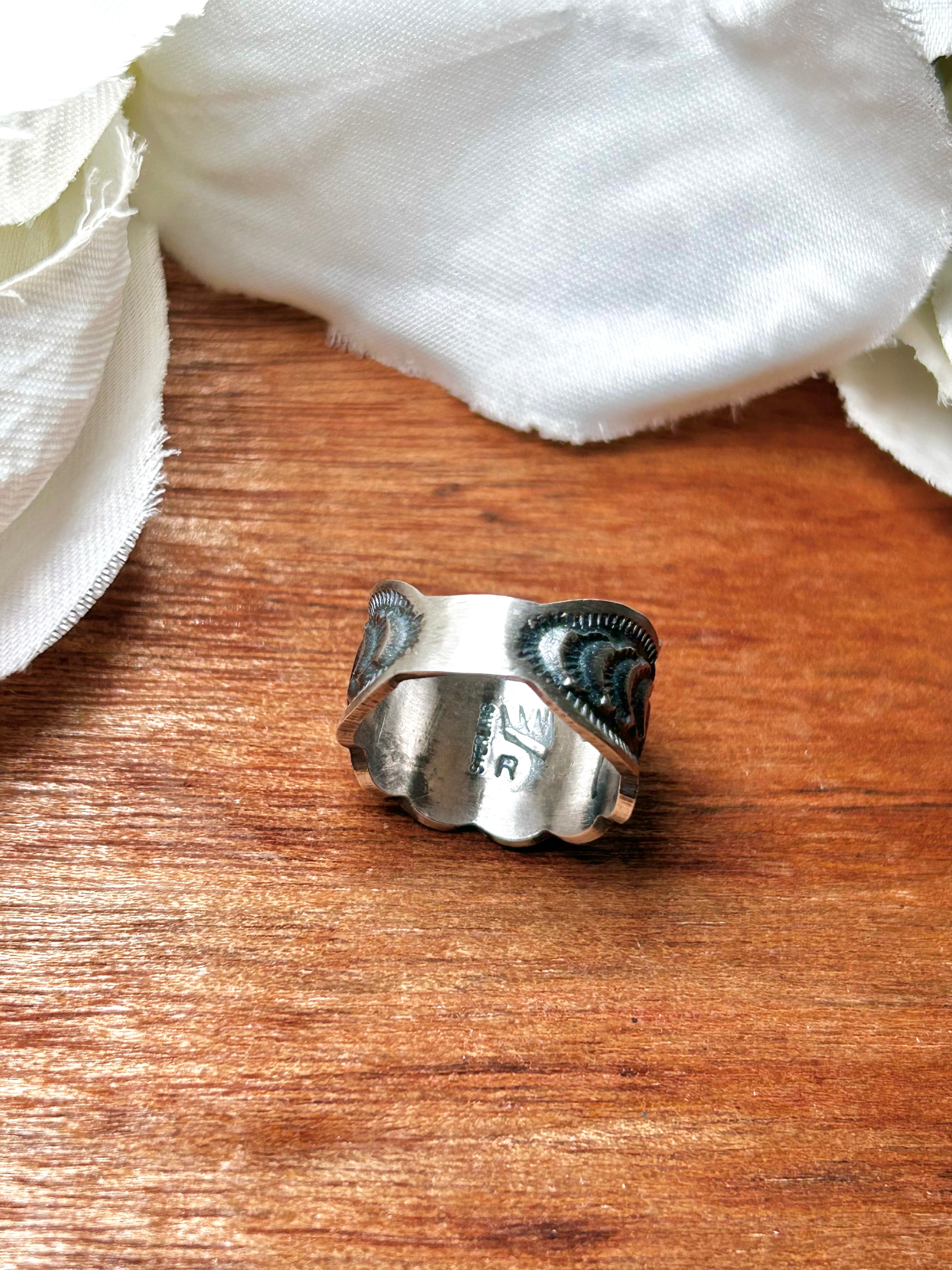 Bennie Ramone Sterling Silver Ring. It measures 5/8 of an inch long and it measures 5/8 of an inch wide. Signed by the artist and stamped sterling silver.