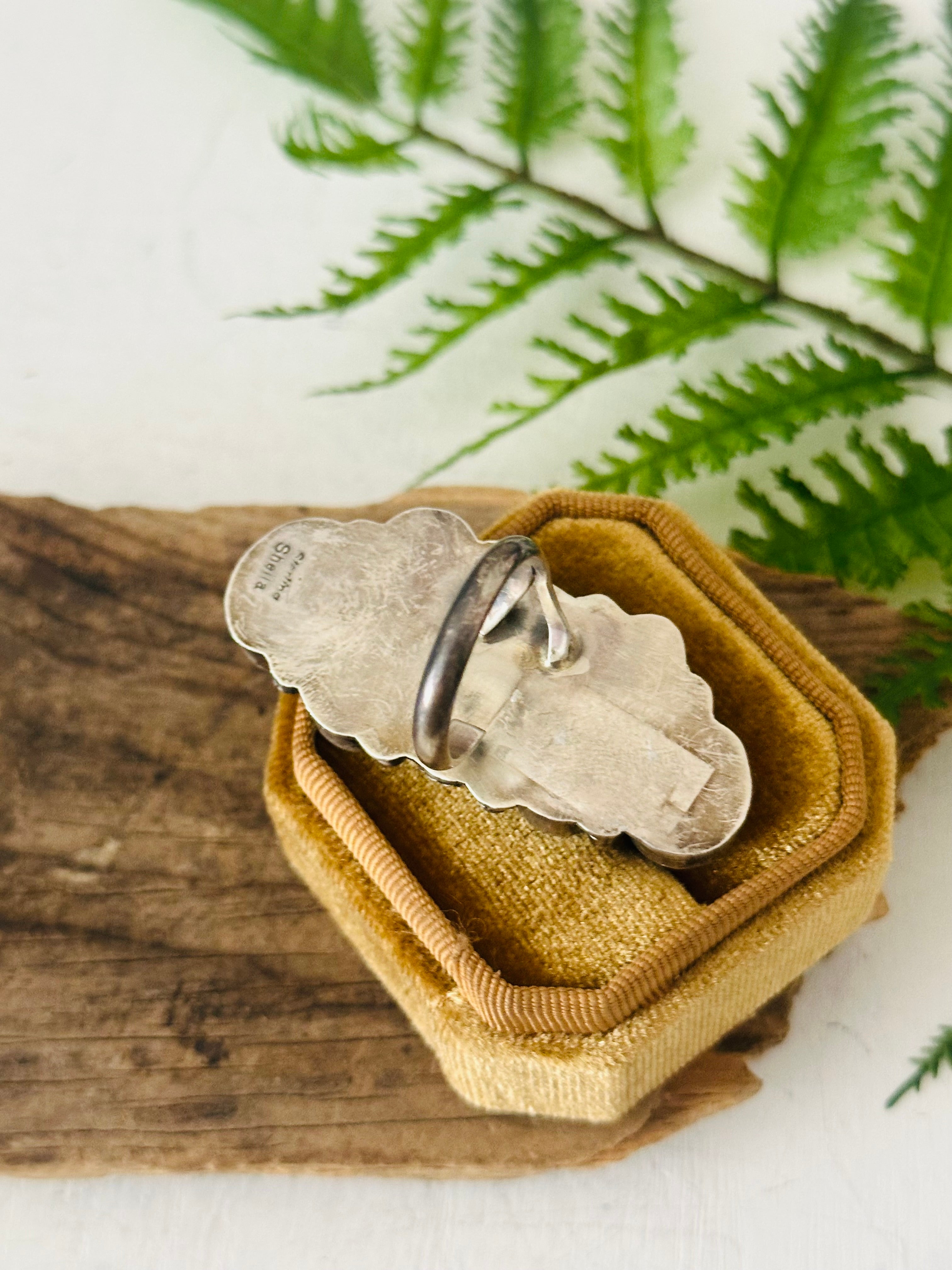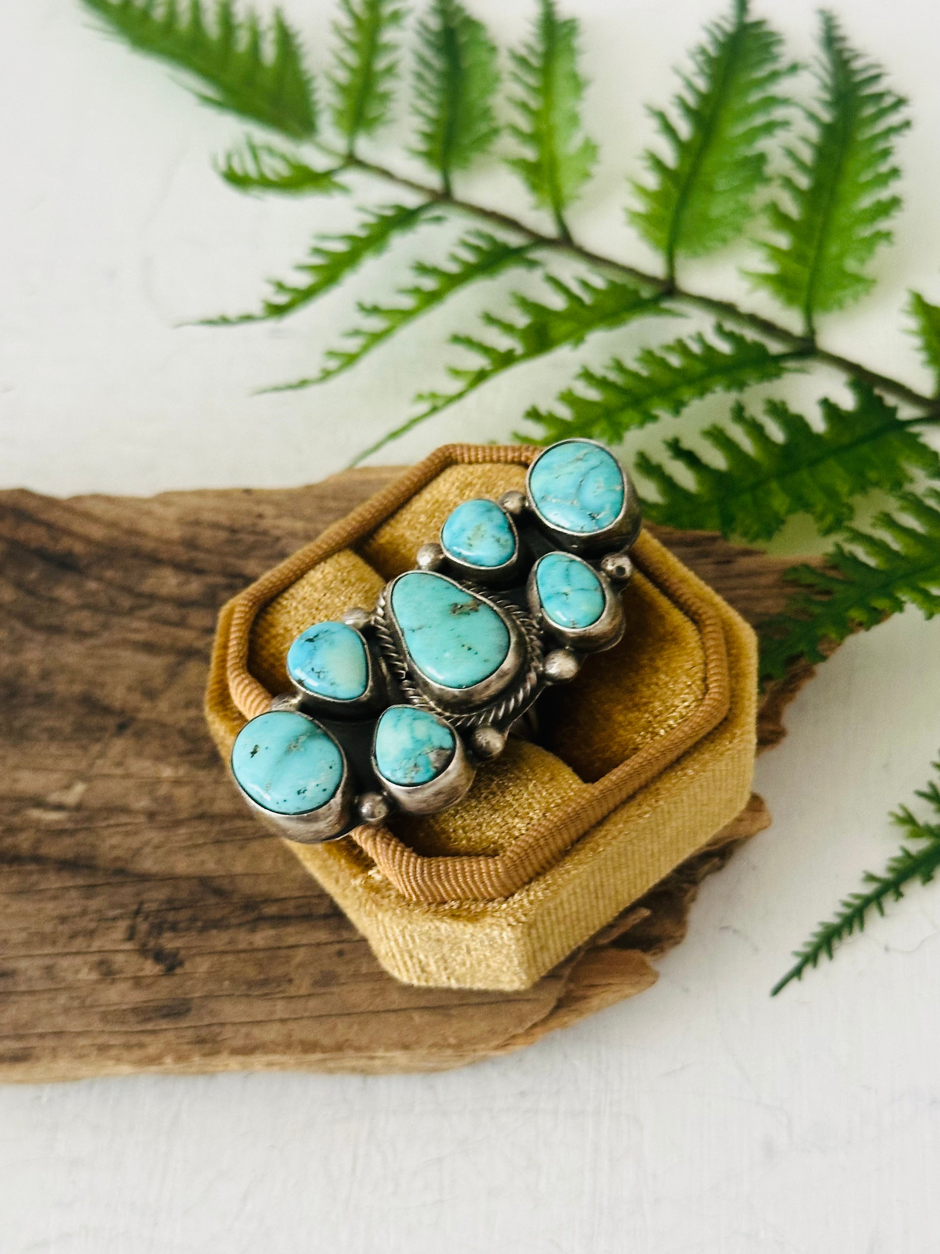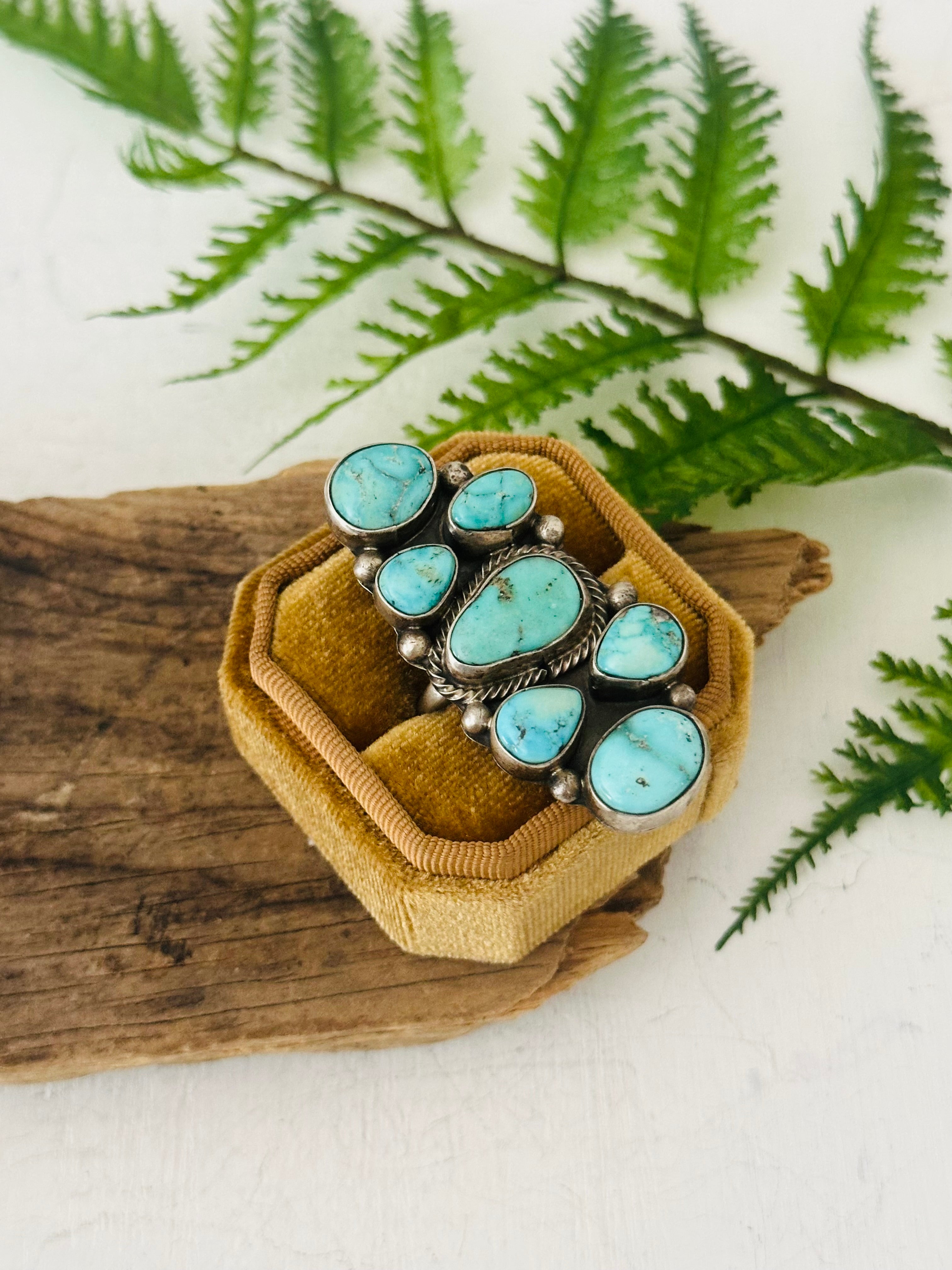 Sheila Becenti White Water Turquoise & Sterling Silver Adjustable Cluster Ring. It measures 2 3/8 inches long and 3/4 of an inch wide. Signed by the artist and stamped sterling silver.