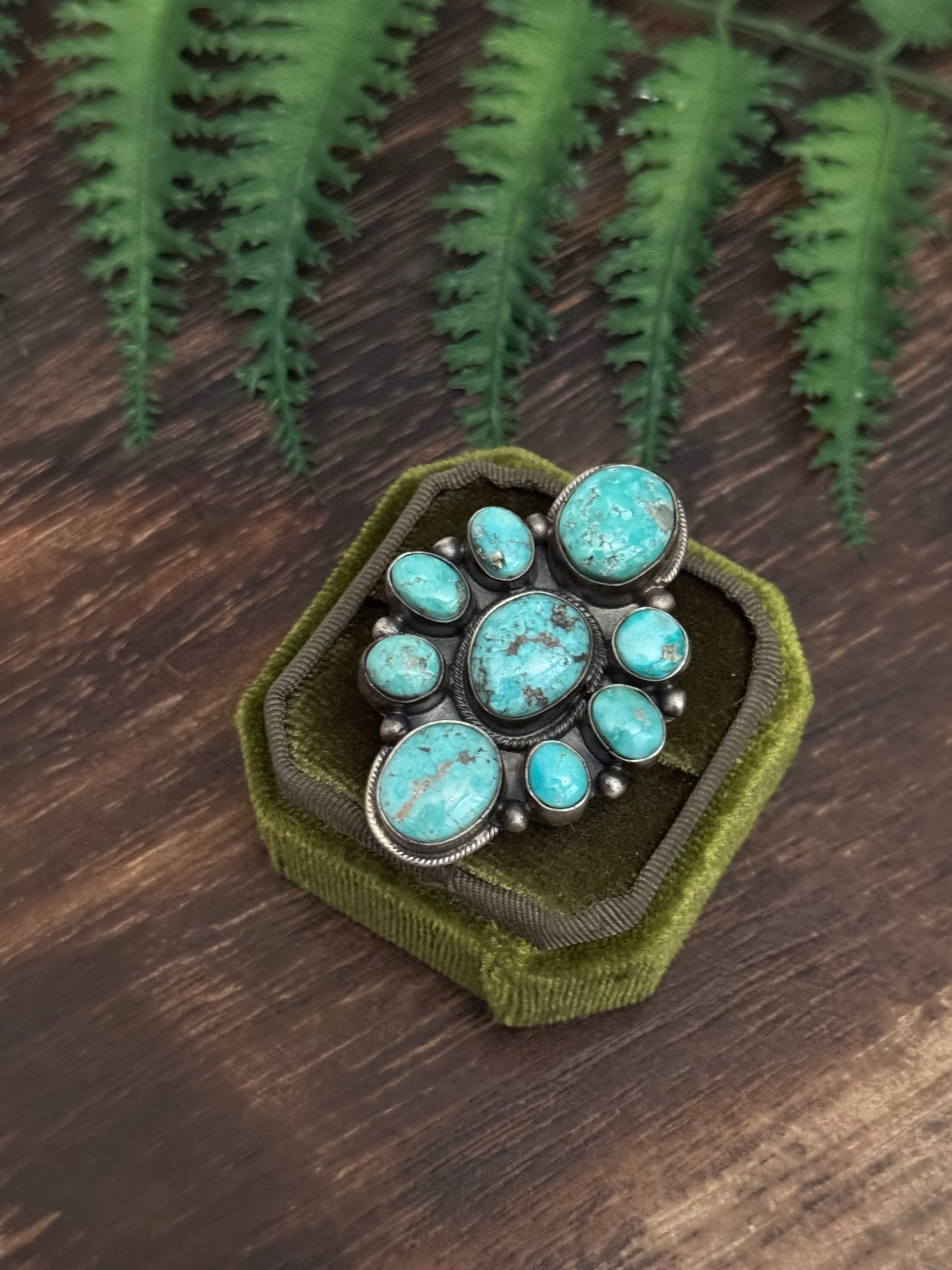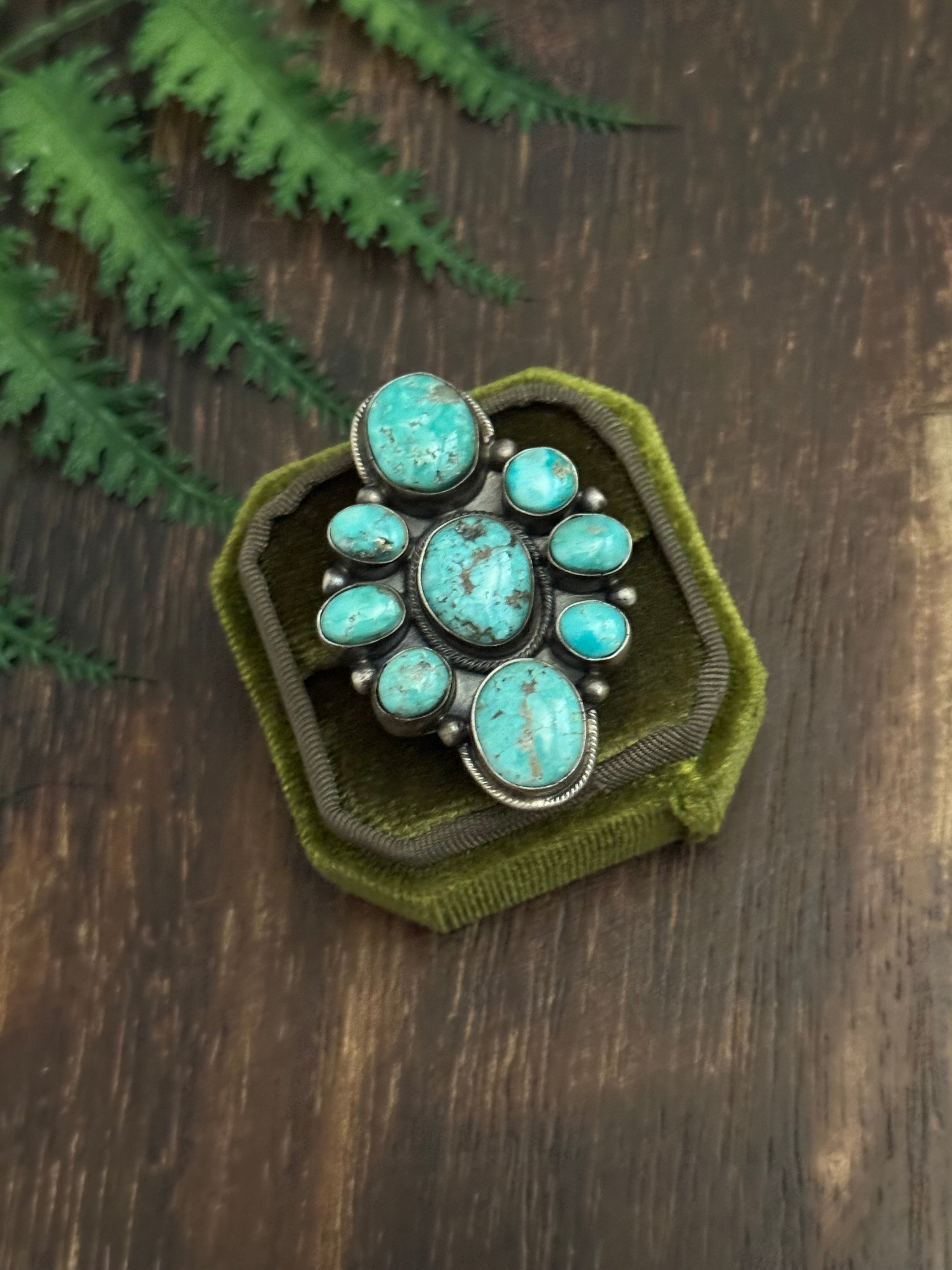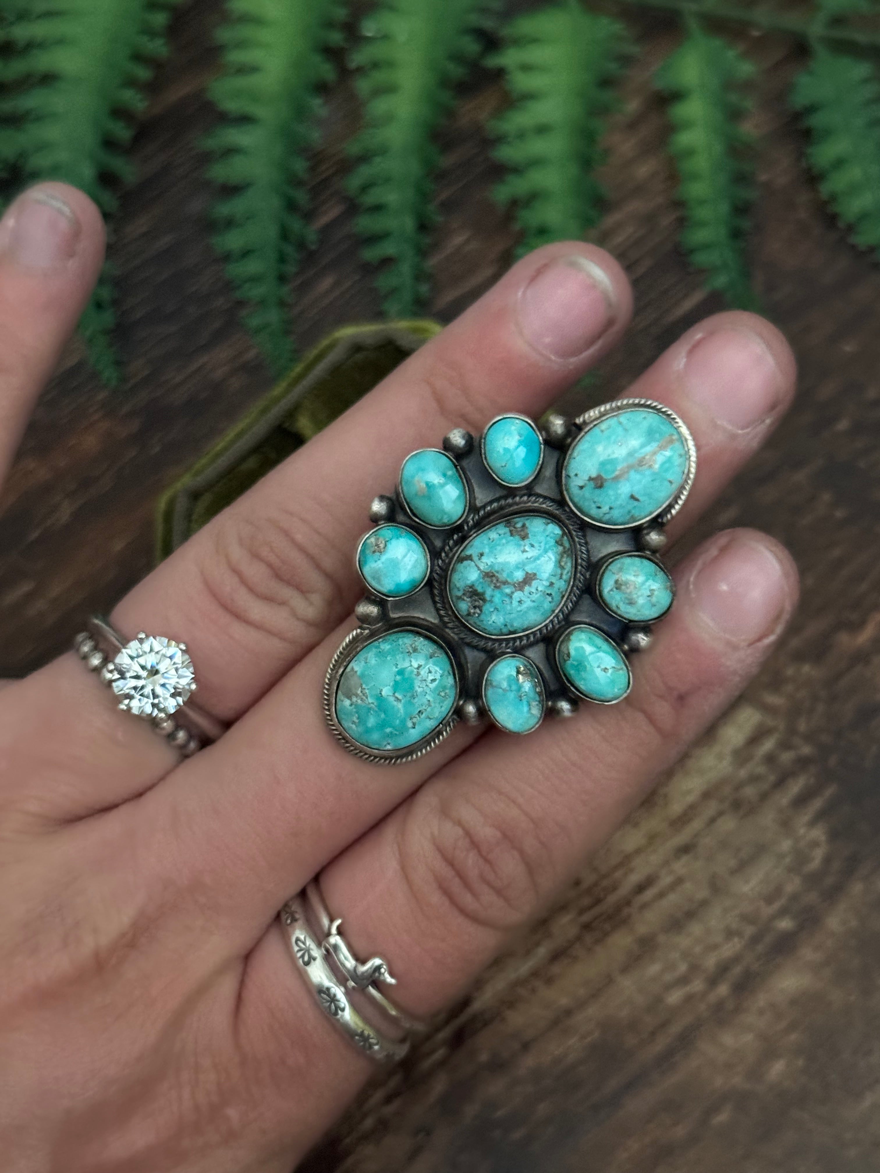 Sheila Becenti White Water Turquoise & Sterling Silver Cluster Ring Size 8.5. It measures 1 7/8 inches long and 1 1/4 inches wide. Signed by the artist and stamped sterling silver.