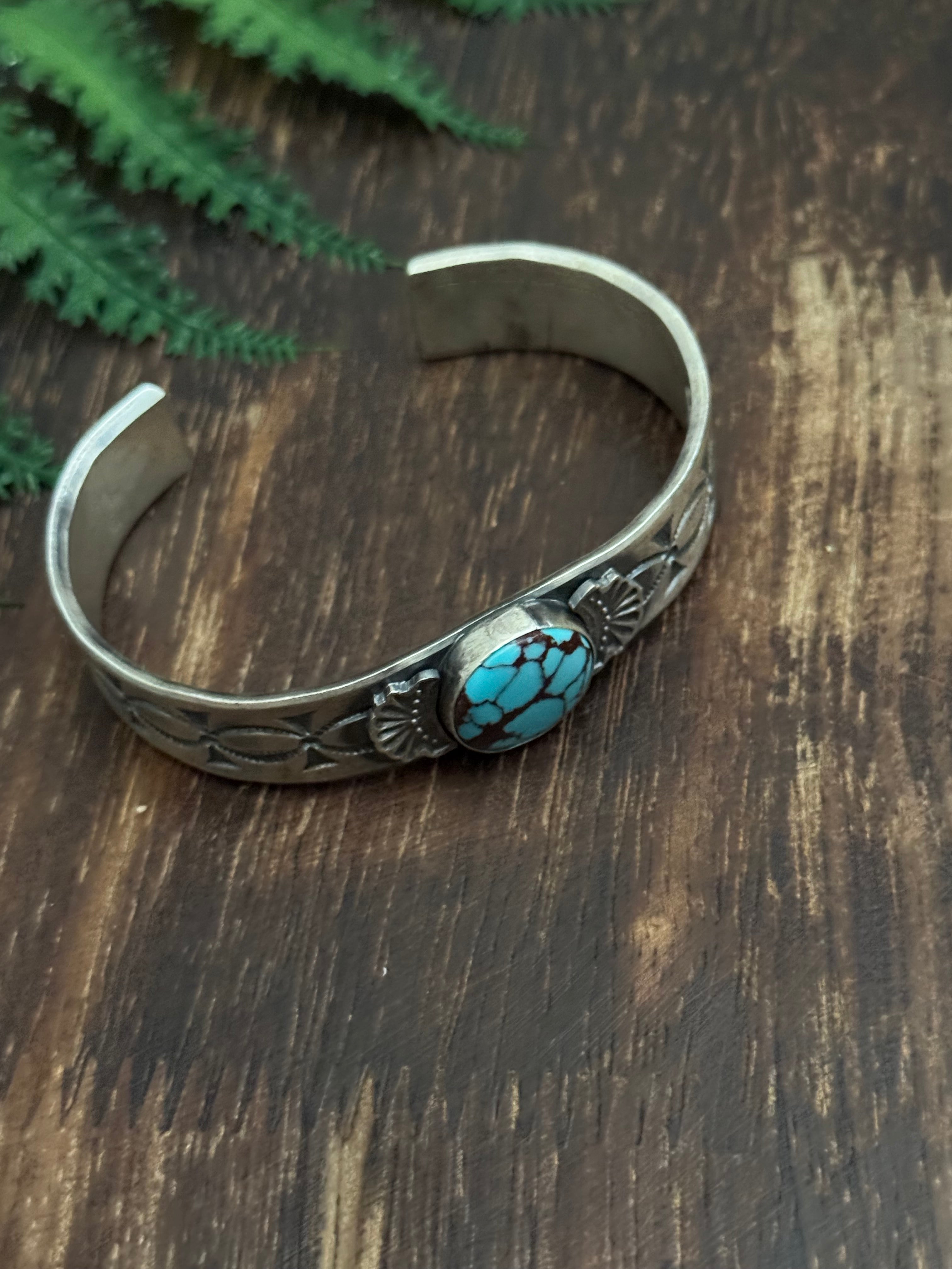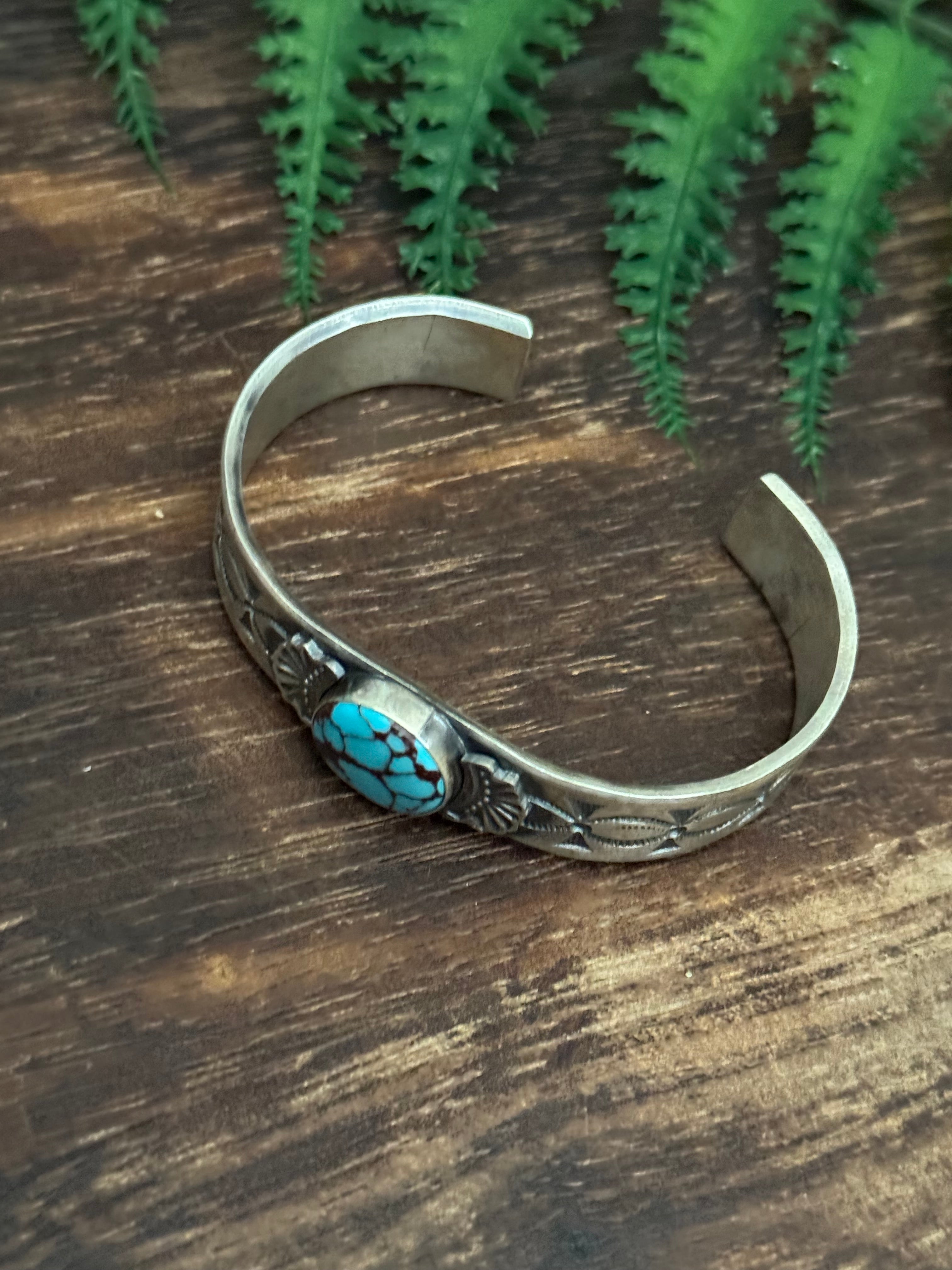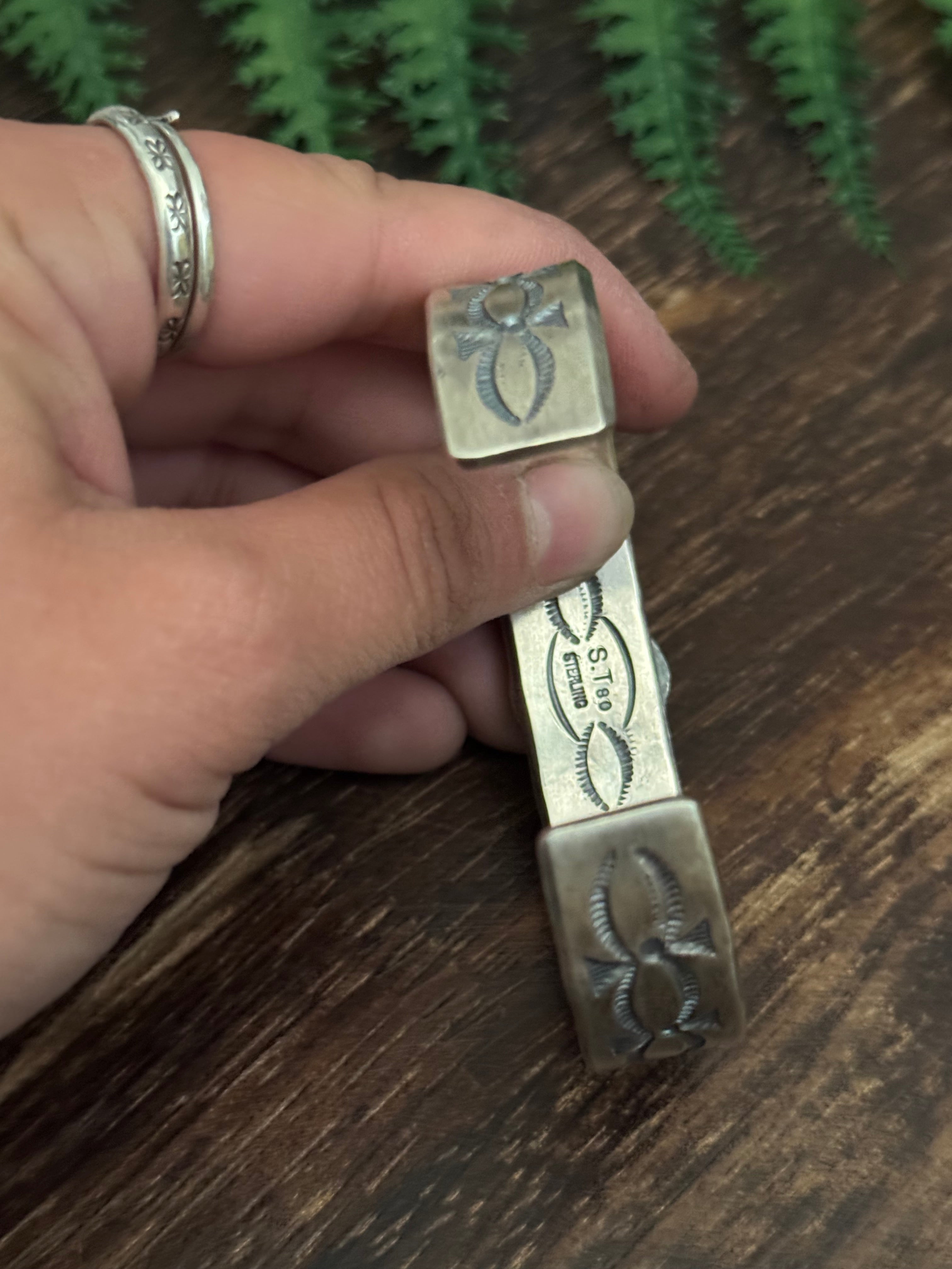 Sheila Tso Egyptian Turquoise & Sterling Silver Cuff Bracelet. It measures 3/4 of an inch wide with an inside circumference of 5 3/4 inches and a gap of 1 inch. Signed by the artist and stamped sterling silver.