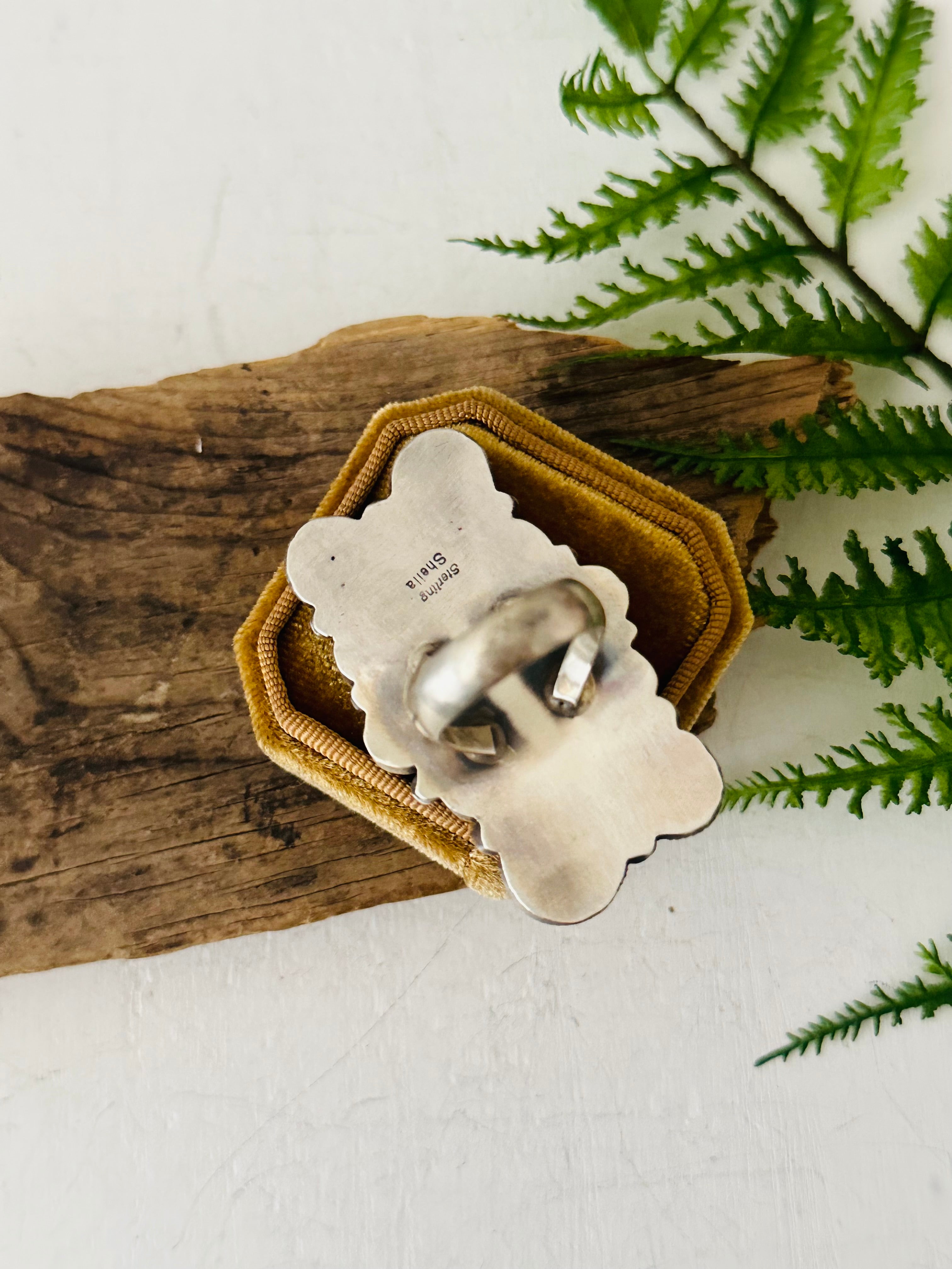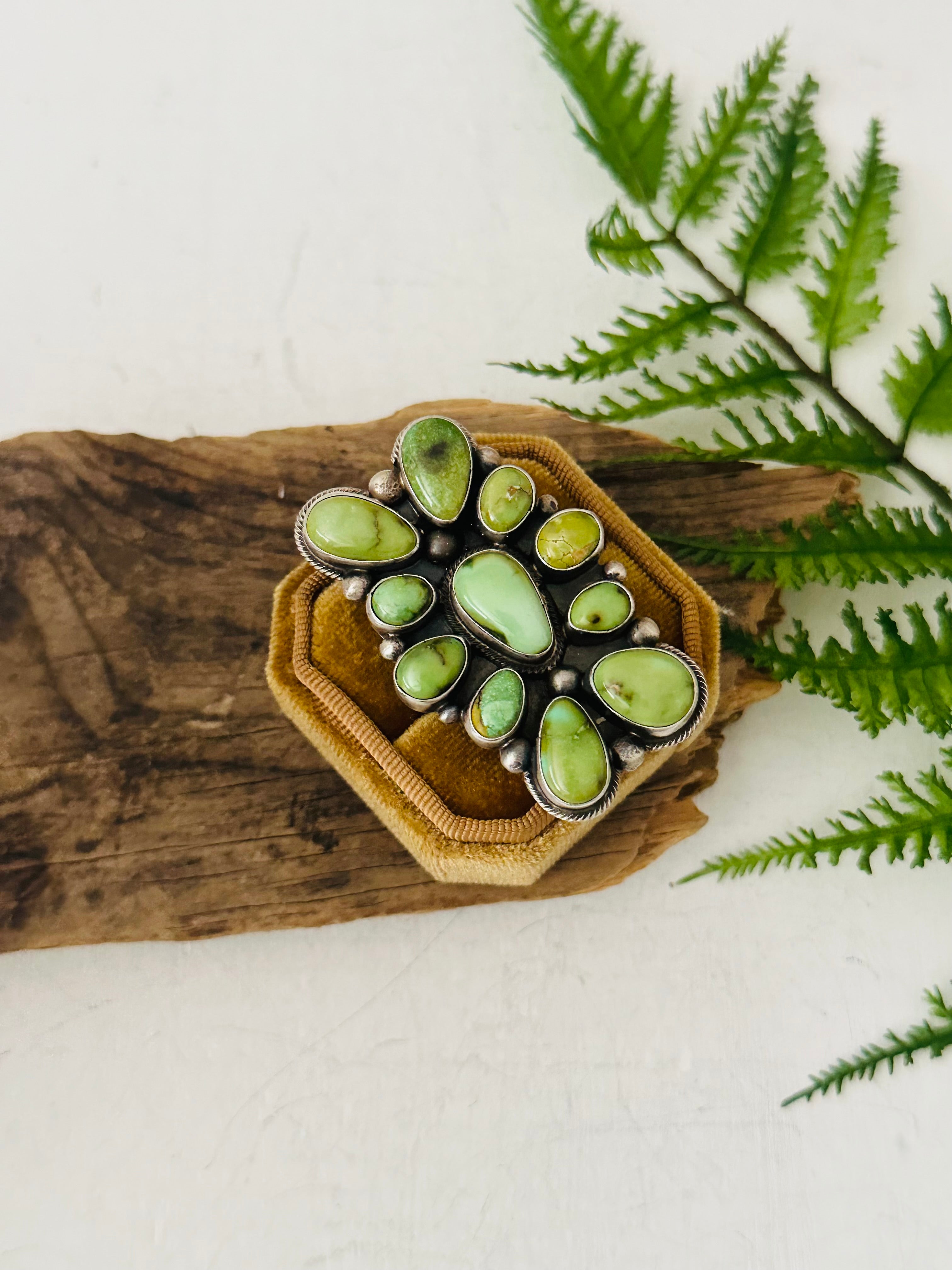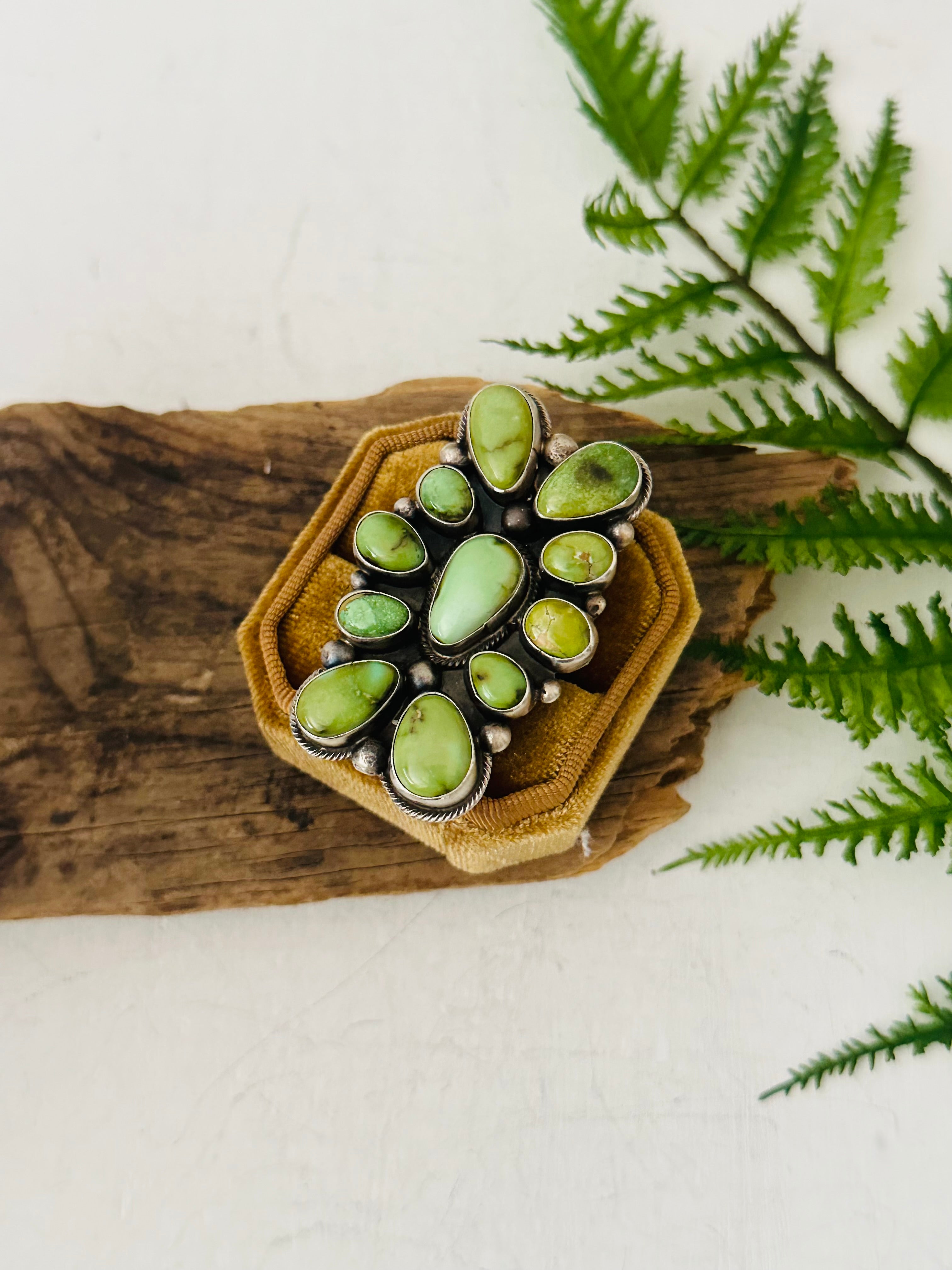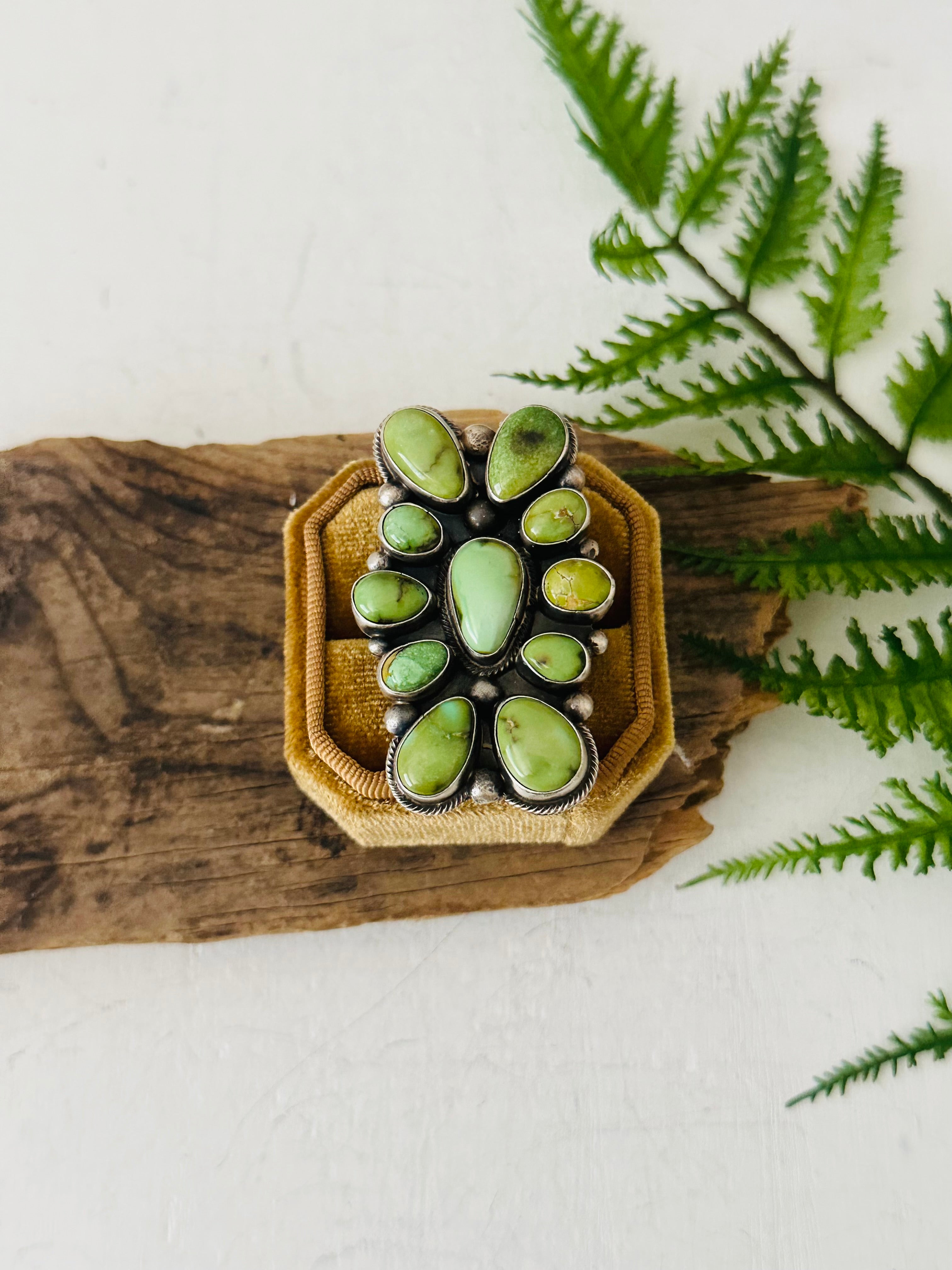 Sheila Tso Sonoran Gold Turquoise Sterling Silver Cluster Ring Size 8. It measures 2 1/2 inches long and 1 3/8 inches wide. Signed by the artist and stamped sterling silver.