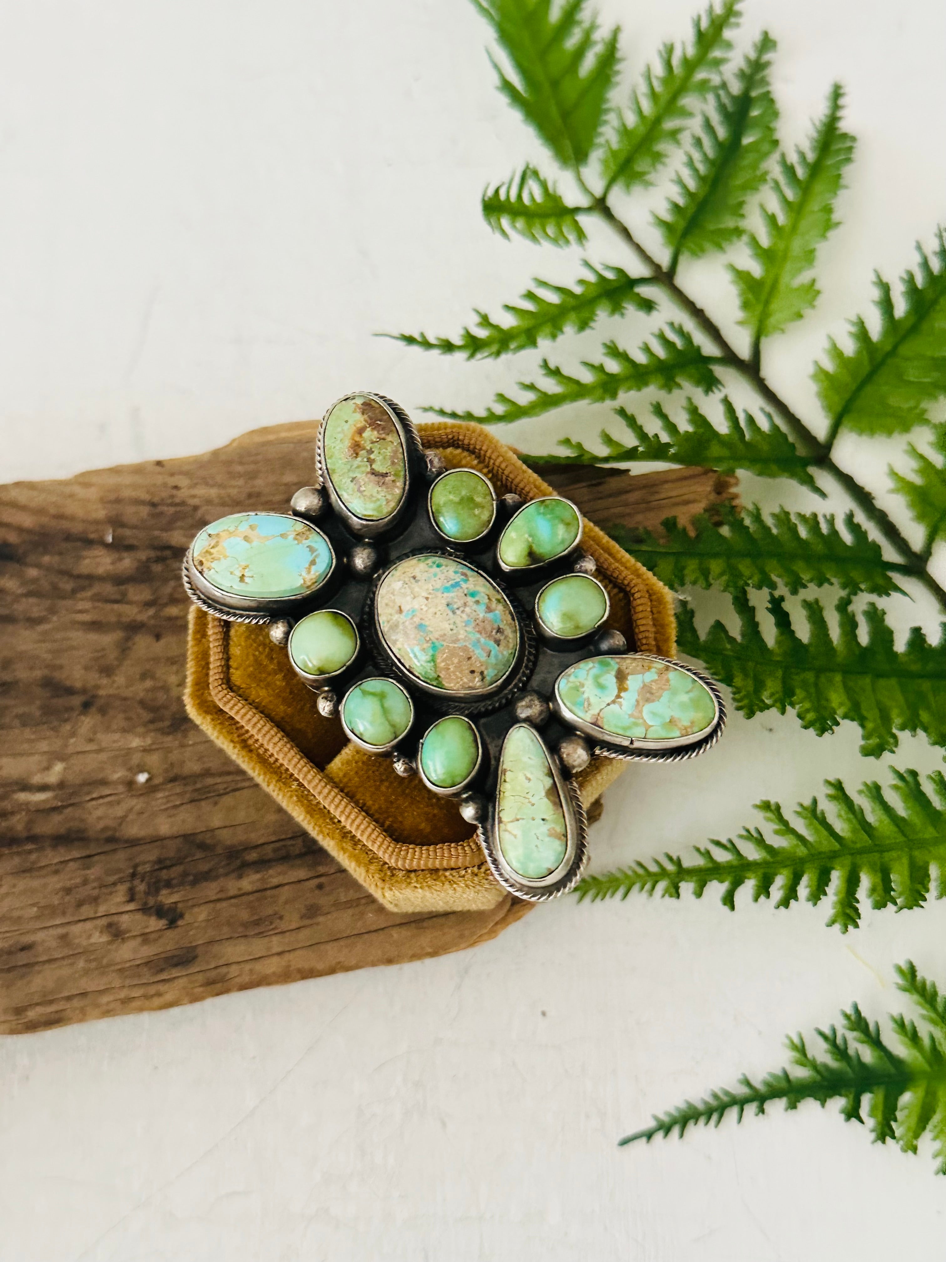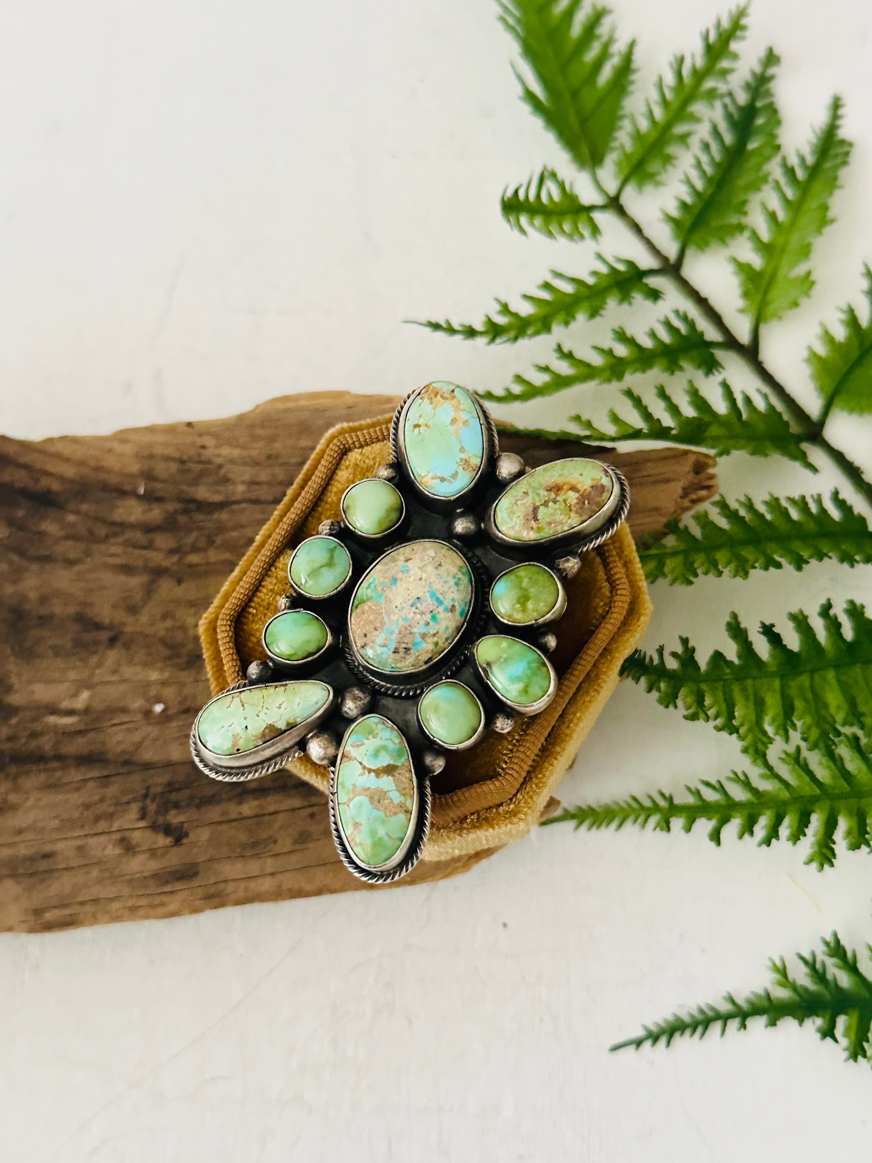 Sheila Tso Multi Turquoise Sterling Silver Cluster Ring Size 7.5. It measures 2 1/2 inches long and 1 3/8 inches wide. Signed by the artist and stamped sterling silver.