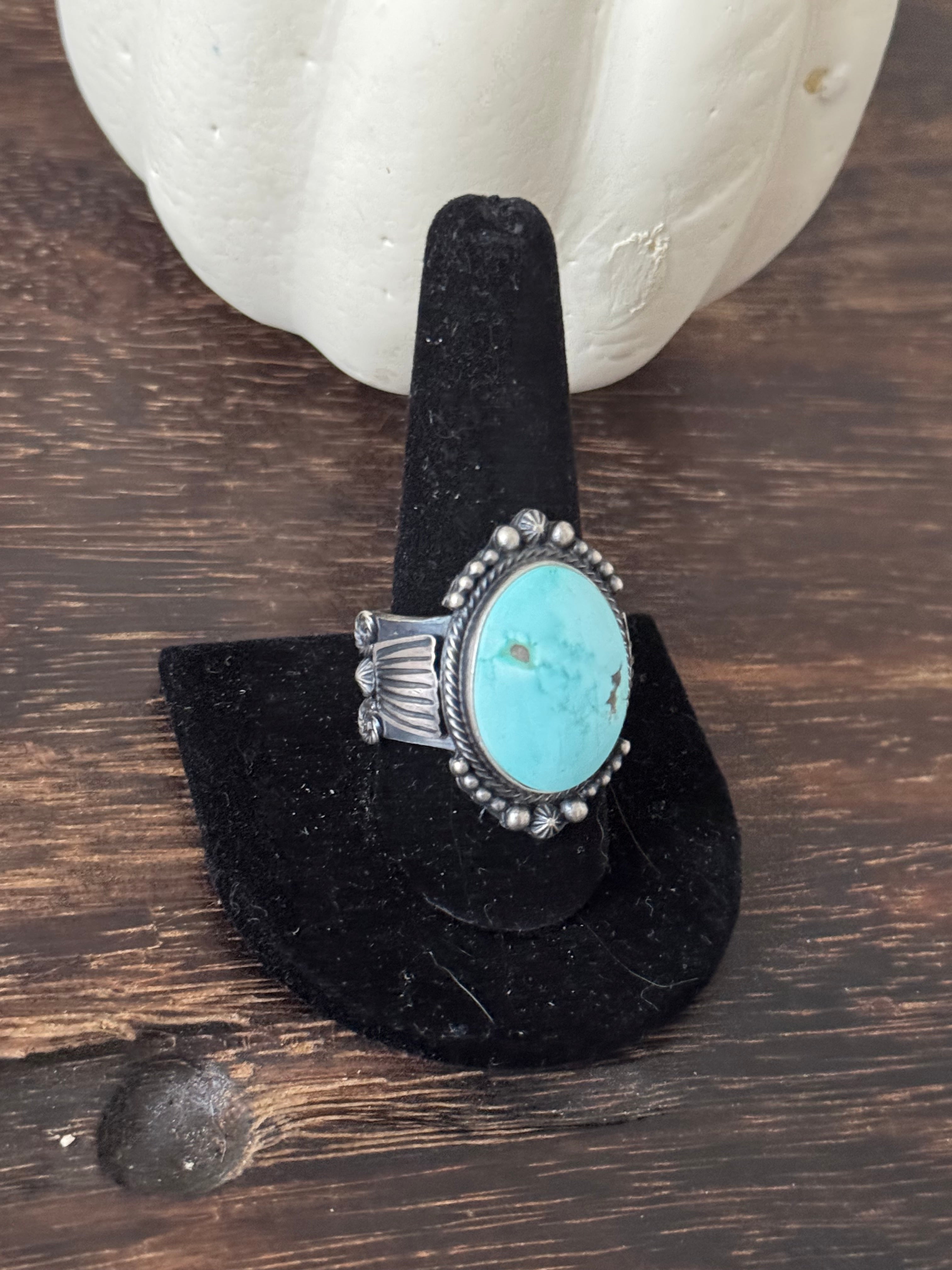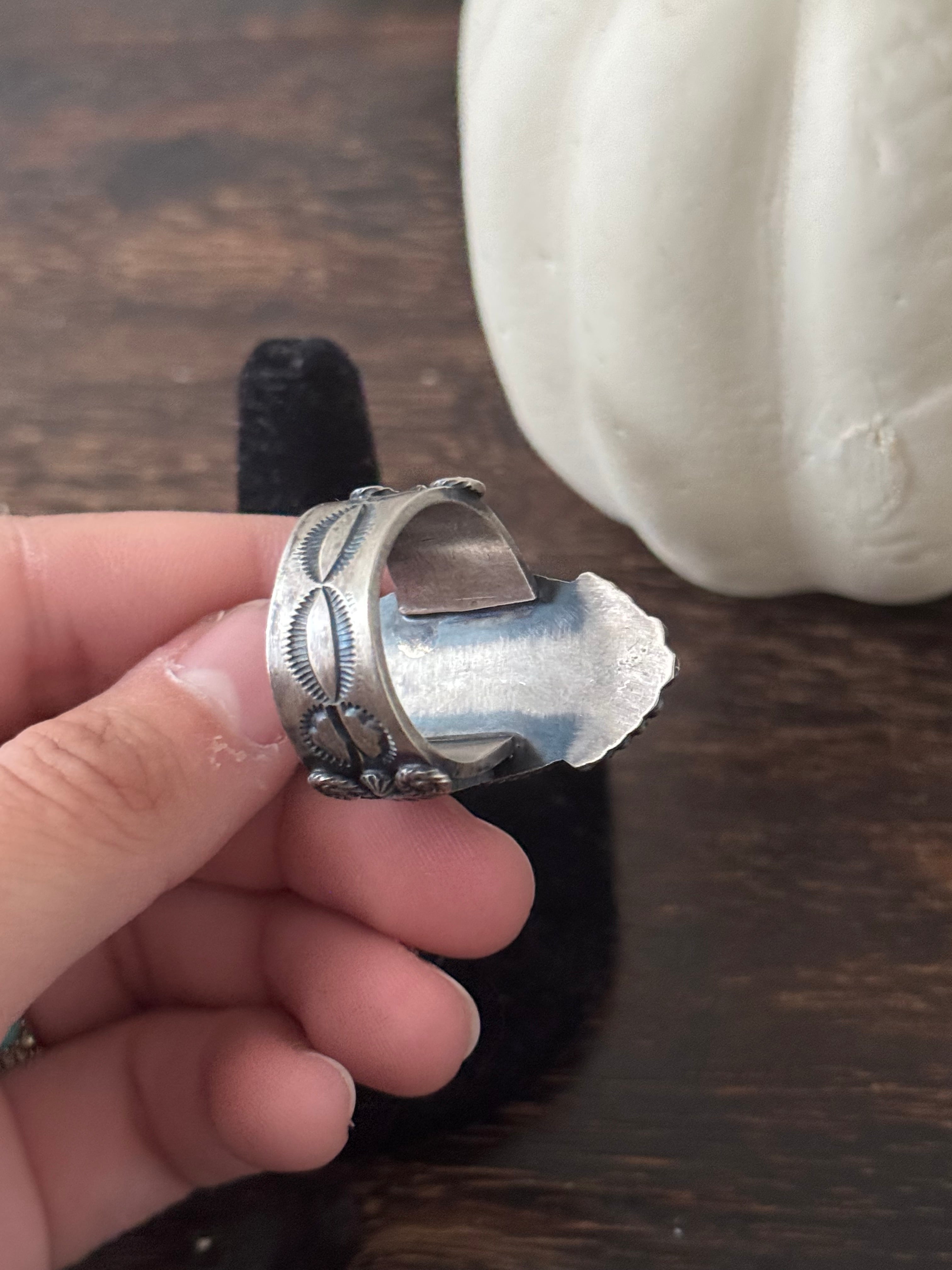 Sheila Tso Sonoran Mountain Turquoise Sterling Silver Ring Size 11. It measures 1 1/8 inches long and 3/4 of an inch wide. Signed by the artist and stamped sterling silver.