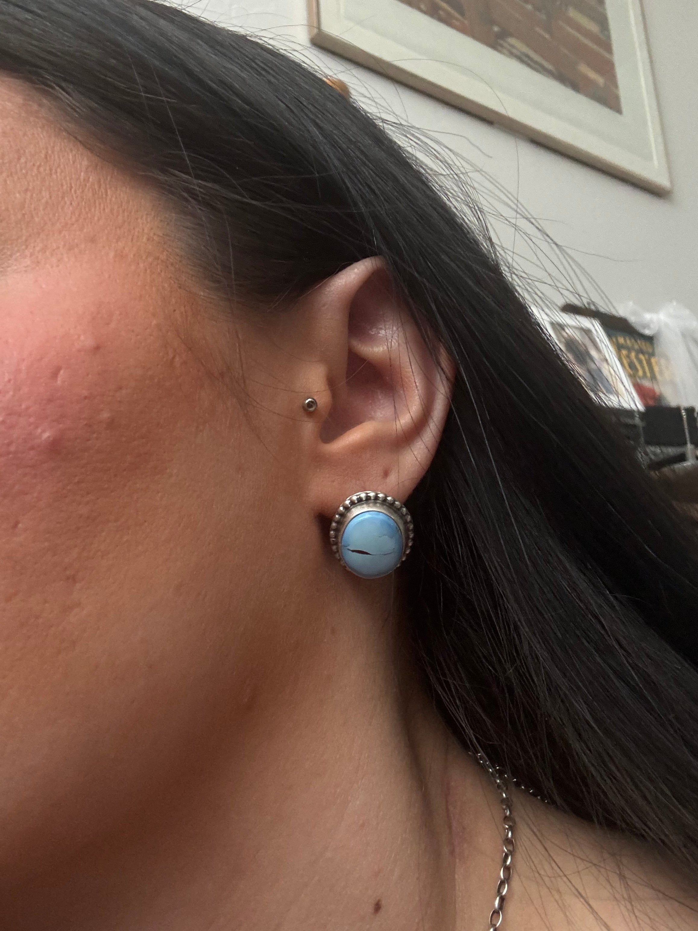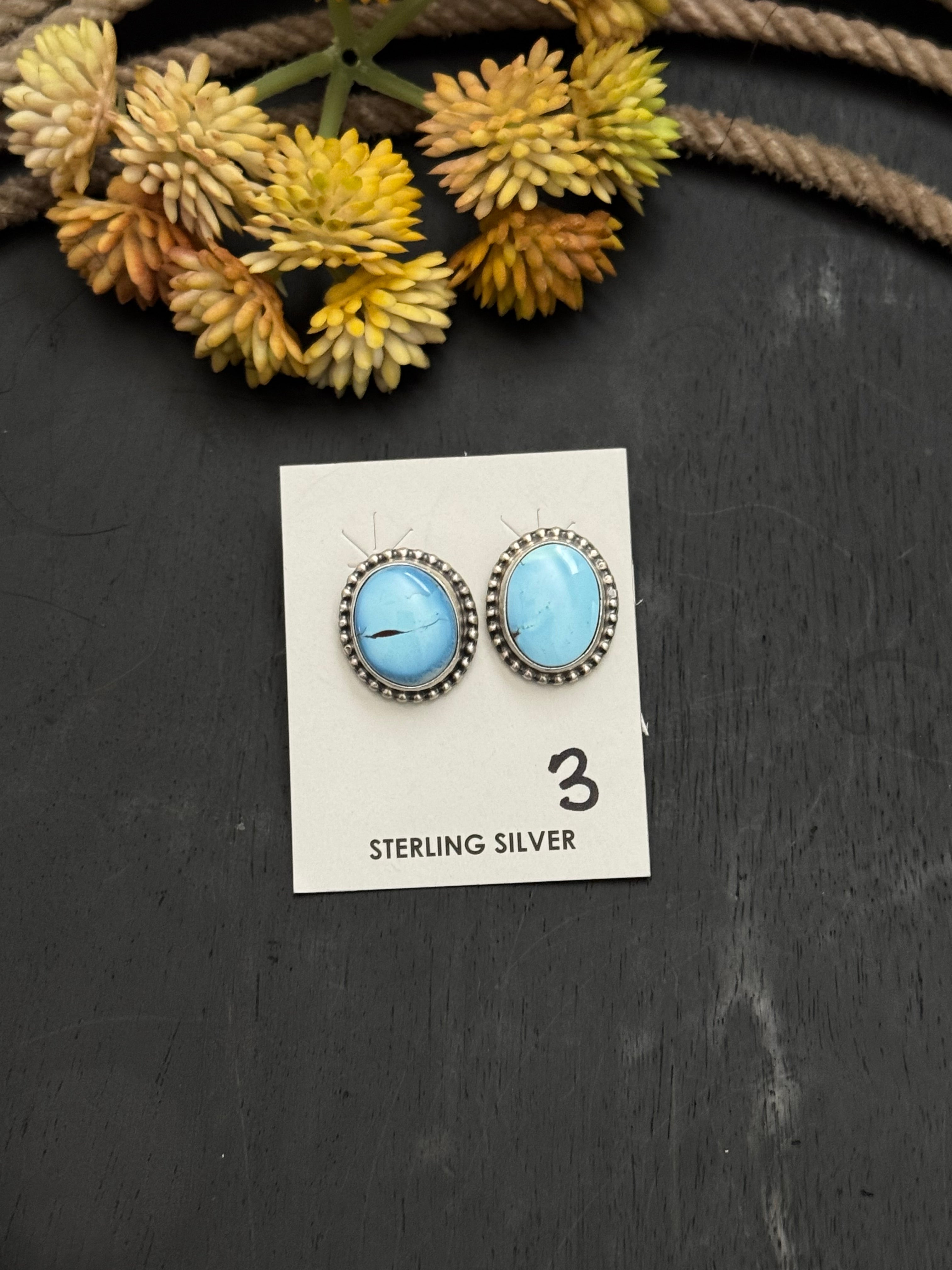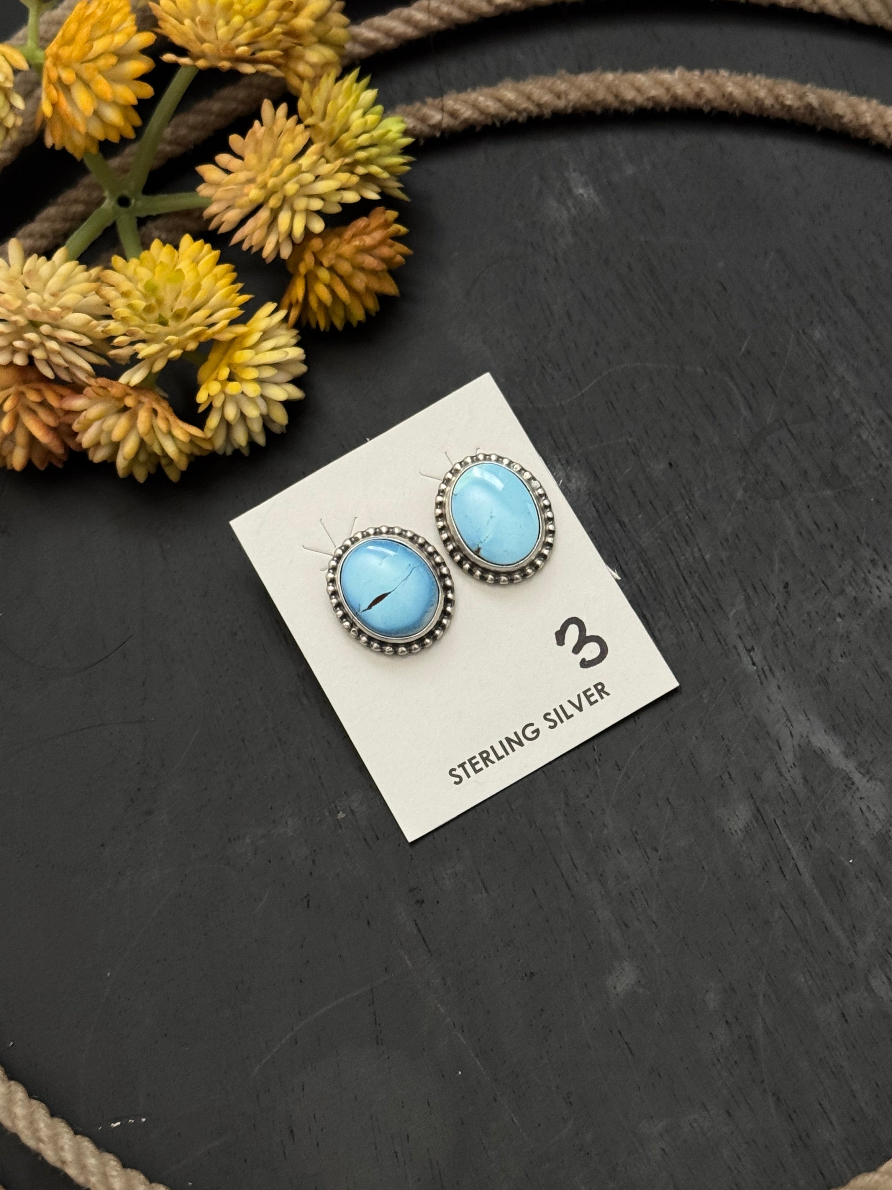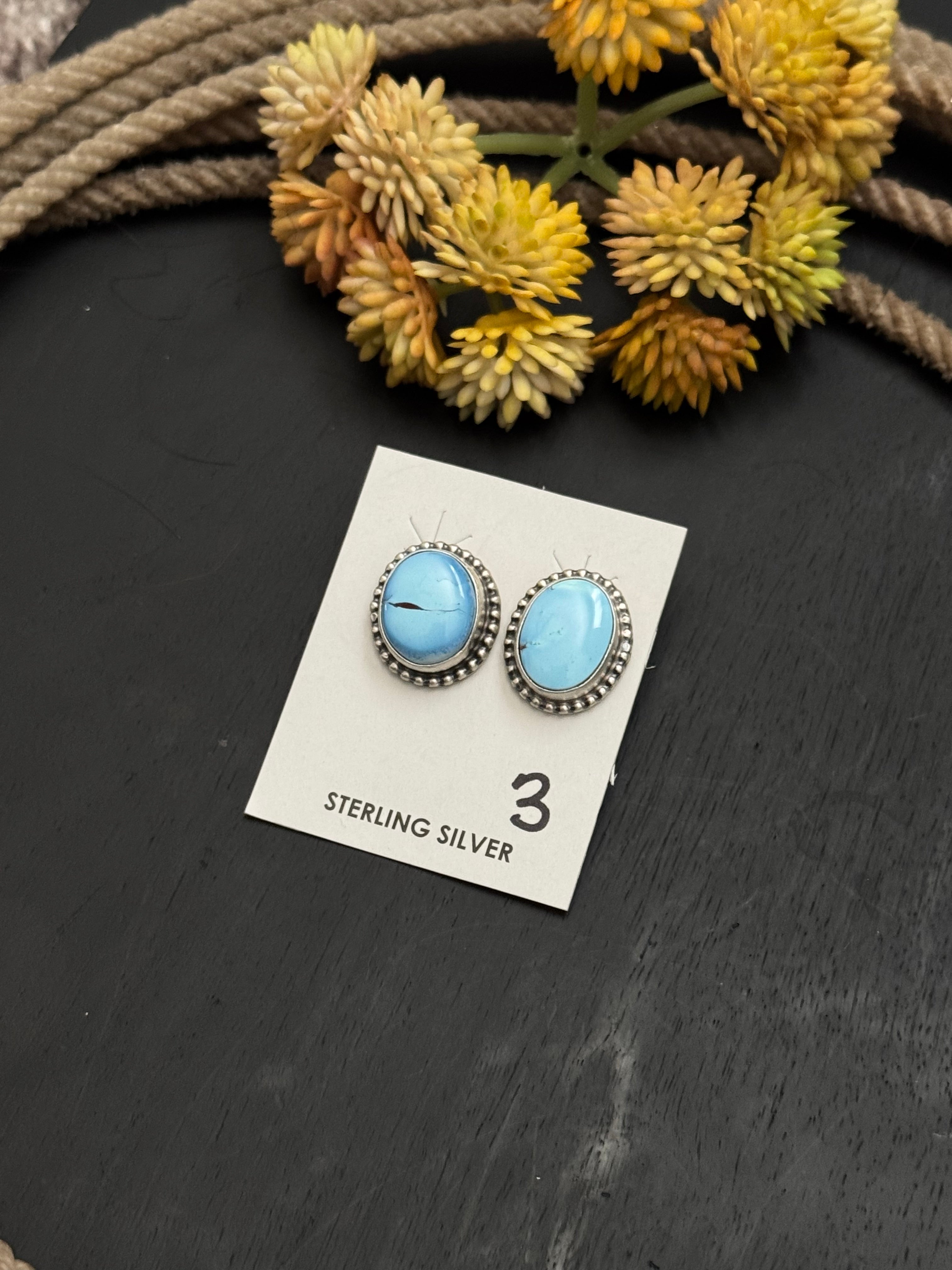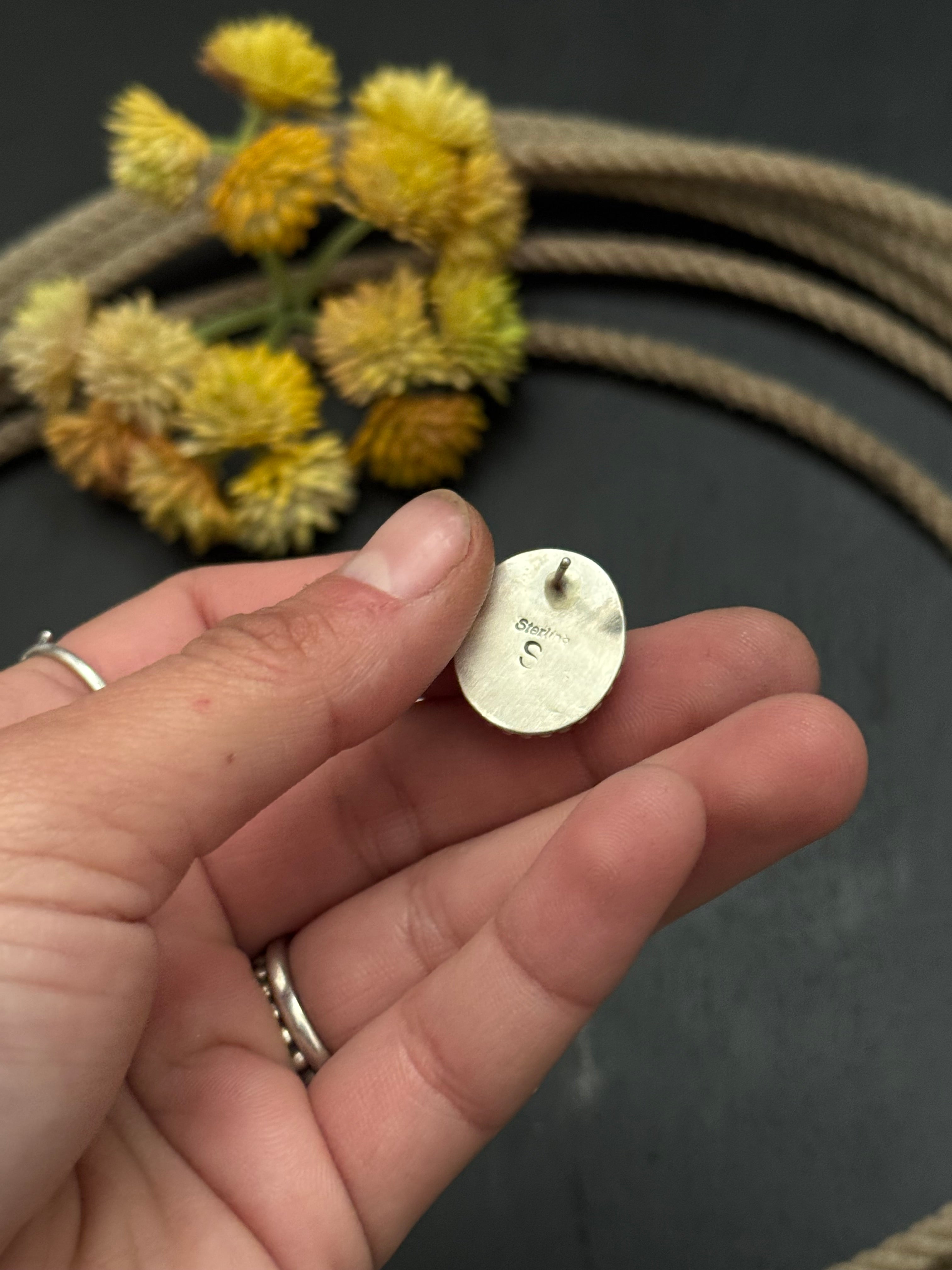 Sheryl Martinez Golden Hills Turquoise & Sterling Silver Post Earrings. They measure just over 3/4 of an inch long and 5/8 of an inch wide. Stamped sterling silver and signed by the artist.
