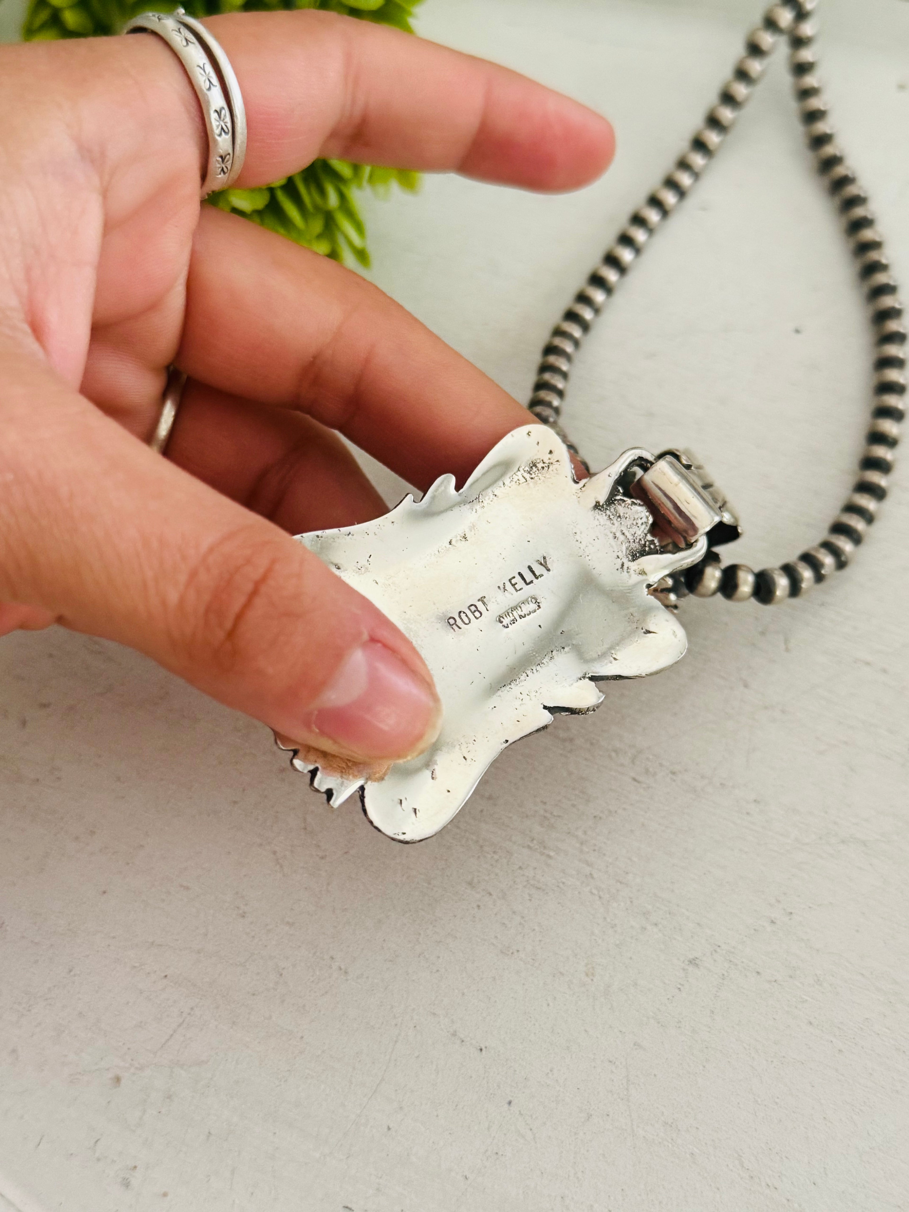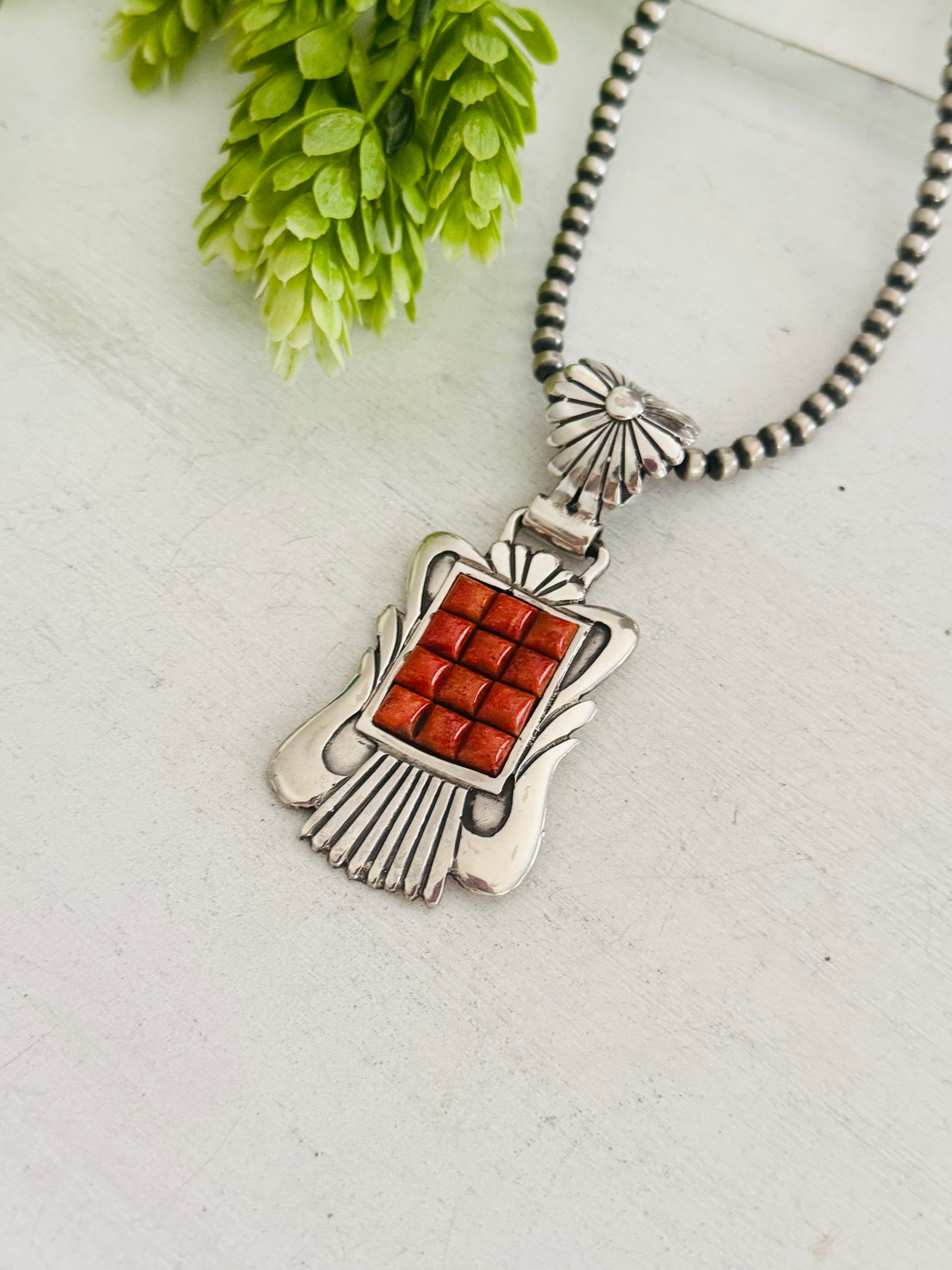 OldPawn Robt Kelly Apple Coral & Sterling Silver Pendant. It measures 3 1/4 inches long and 1 1/2 inches wide. Pendant Only. Signed by the artist and stamped sterling silver.