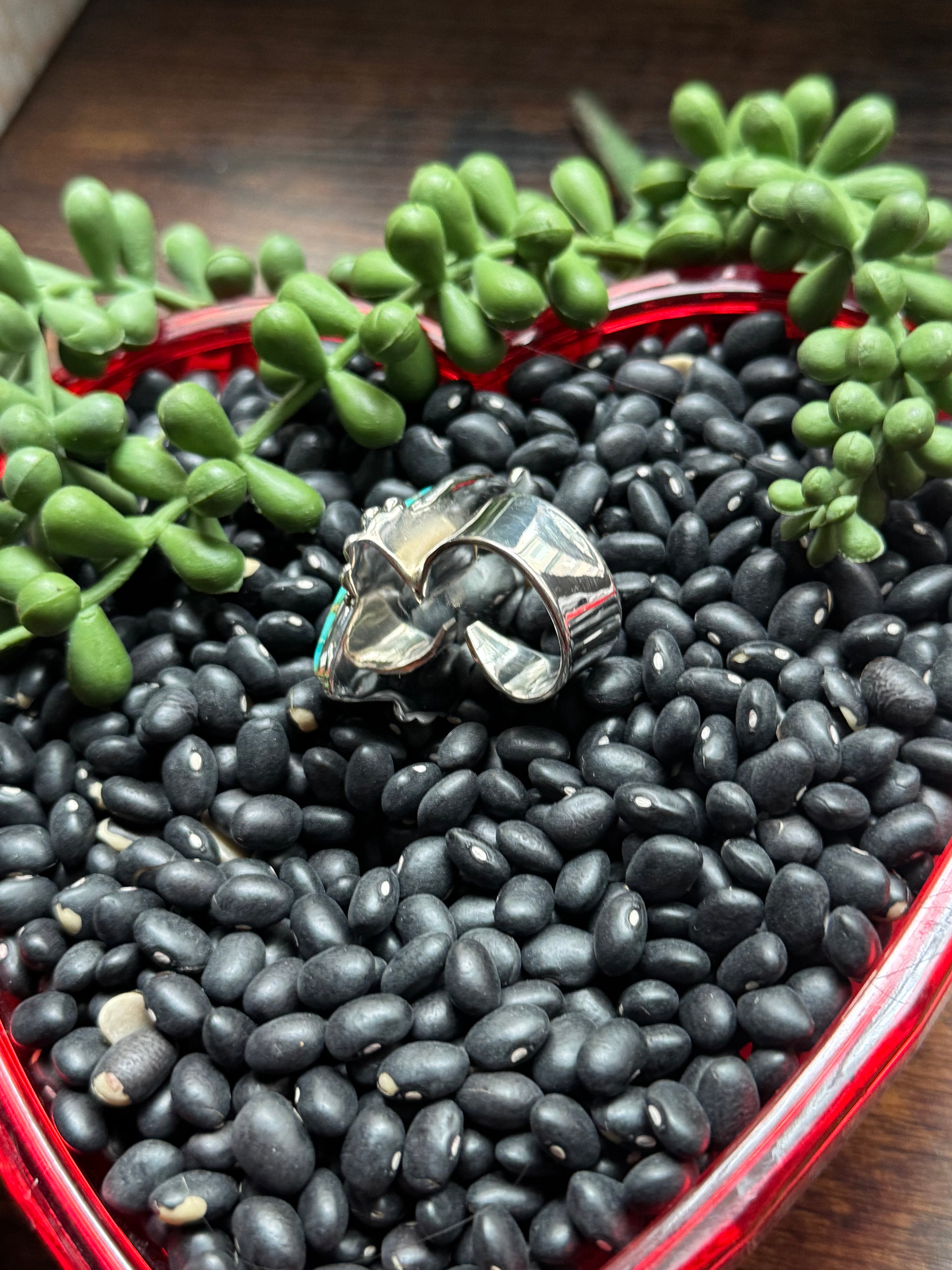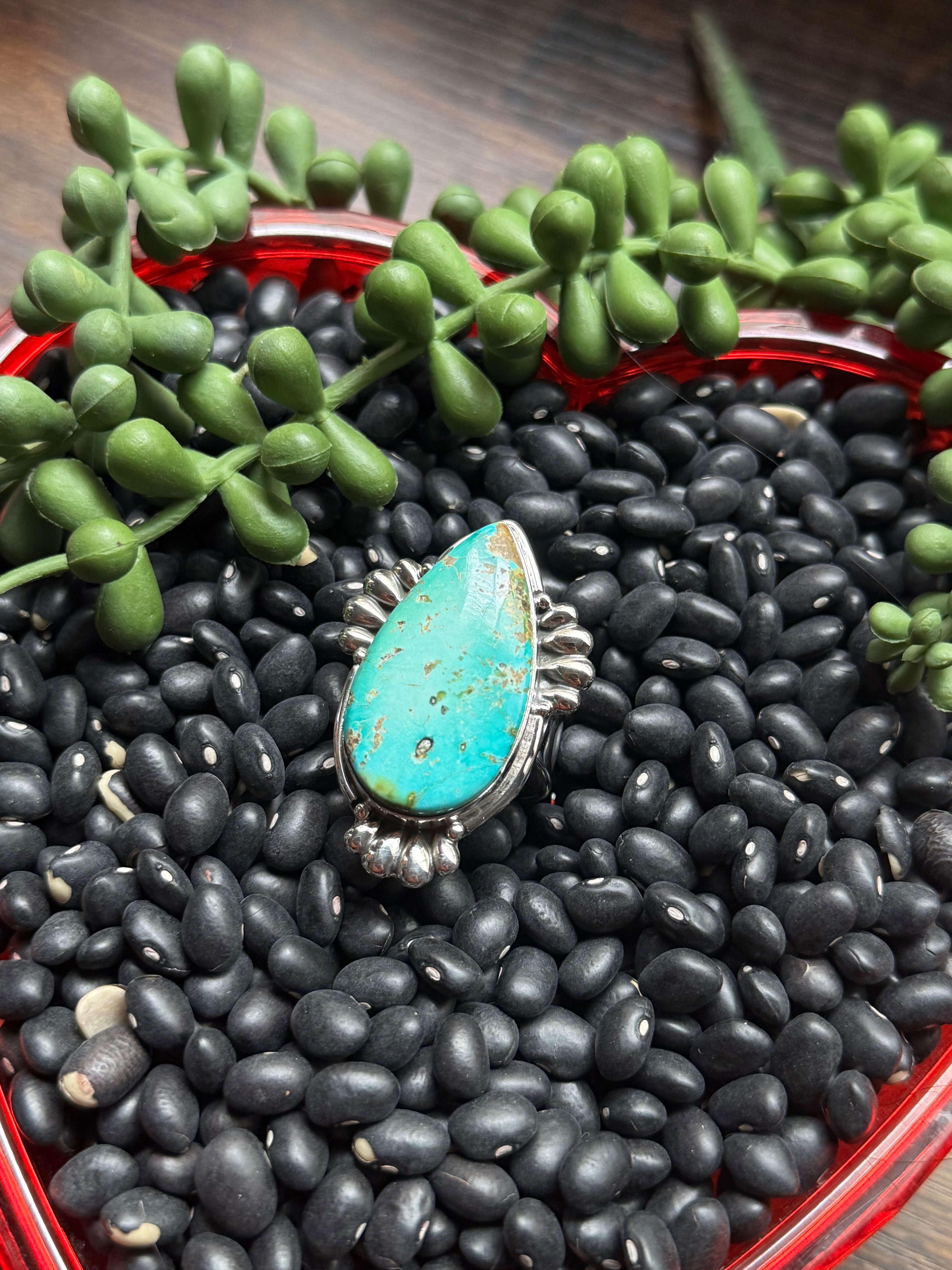 Beautiful ring. Southwest Handmade Sonoran Mountain Turquoise & Sterling Silver Adjustable Ring. It measures just over 1 5/8 inches long and 1 1/8 inches wide. Signed by the artist and stamped sterling silver.