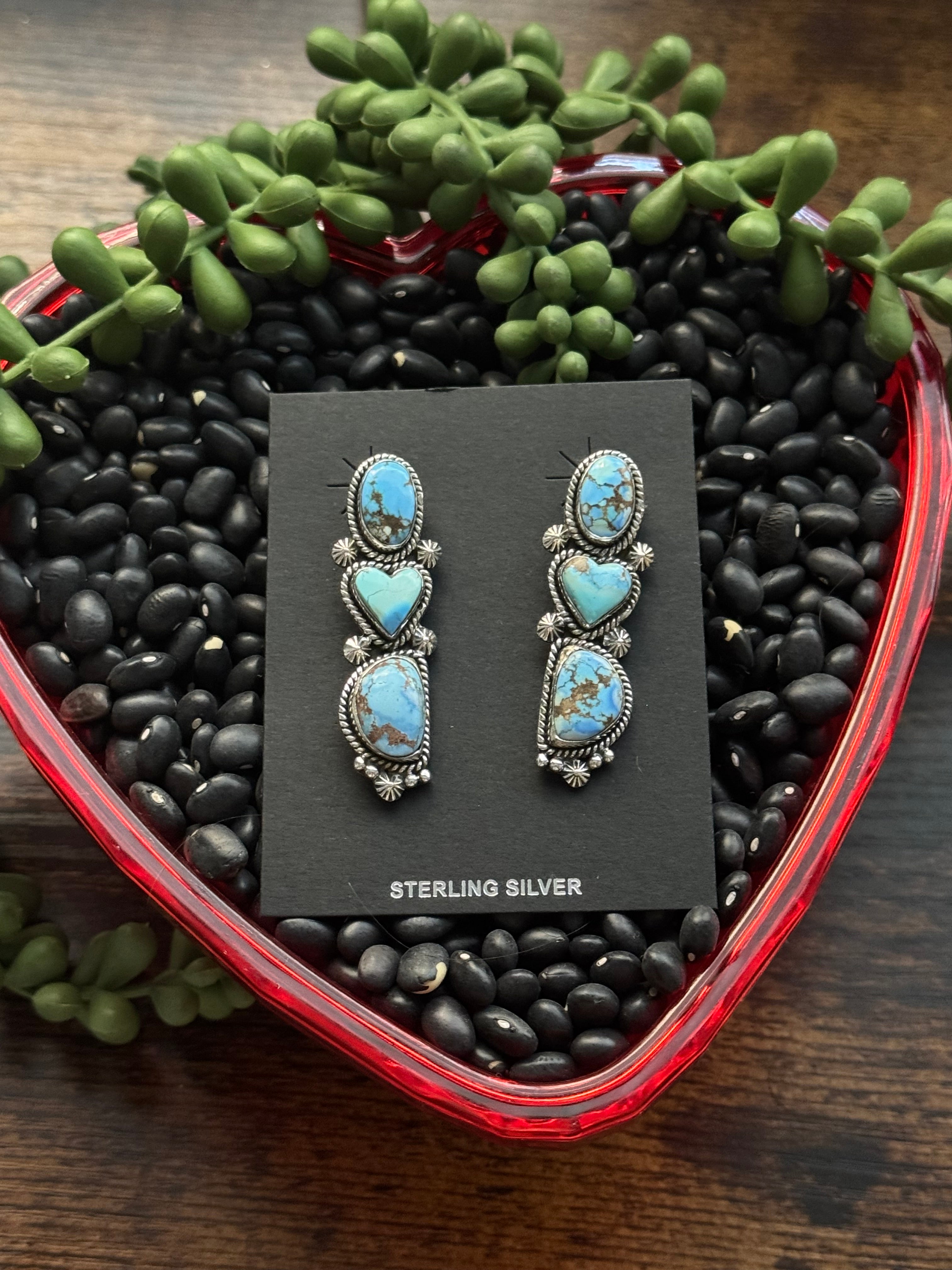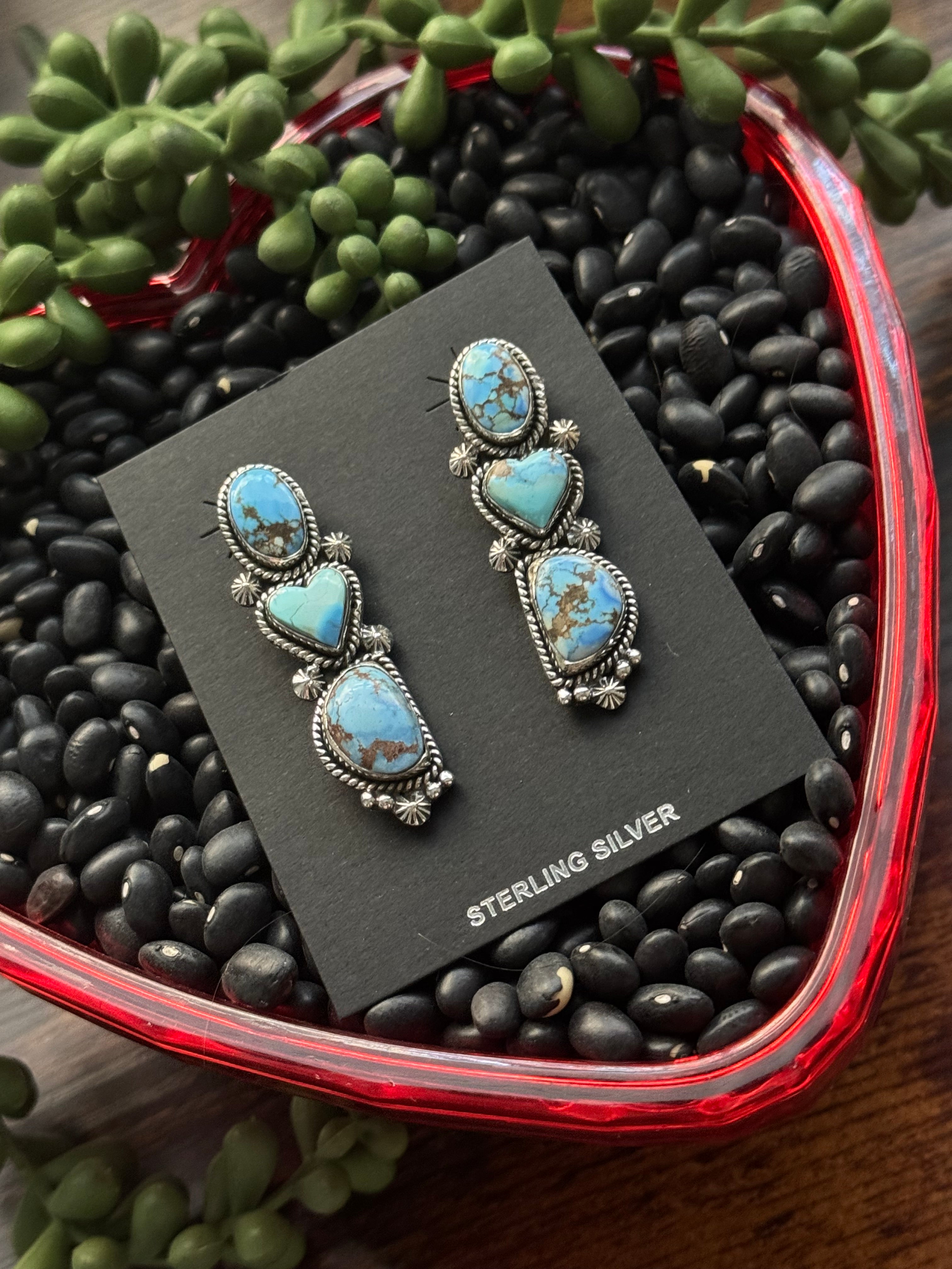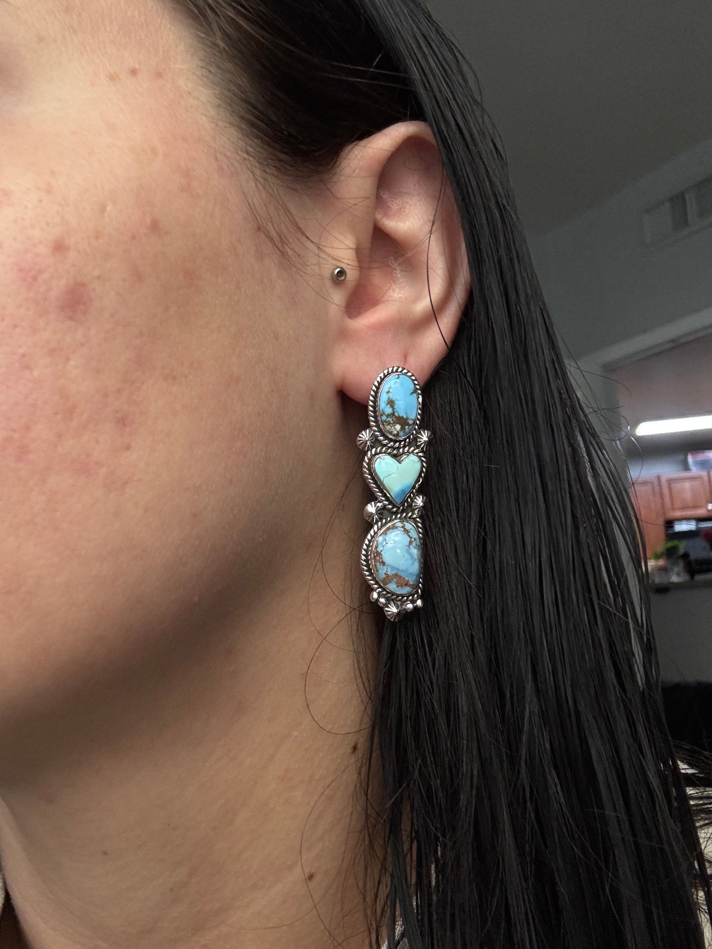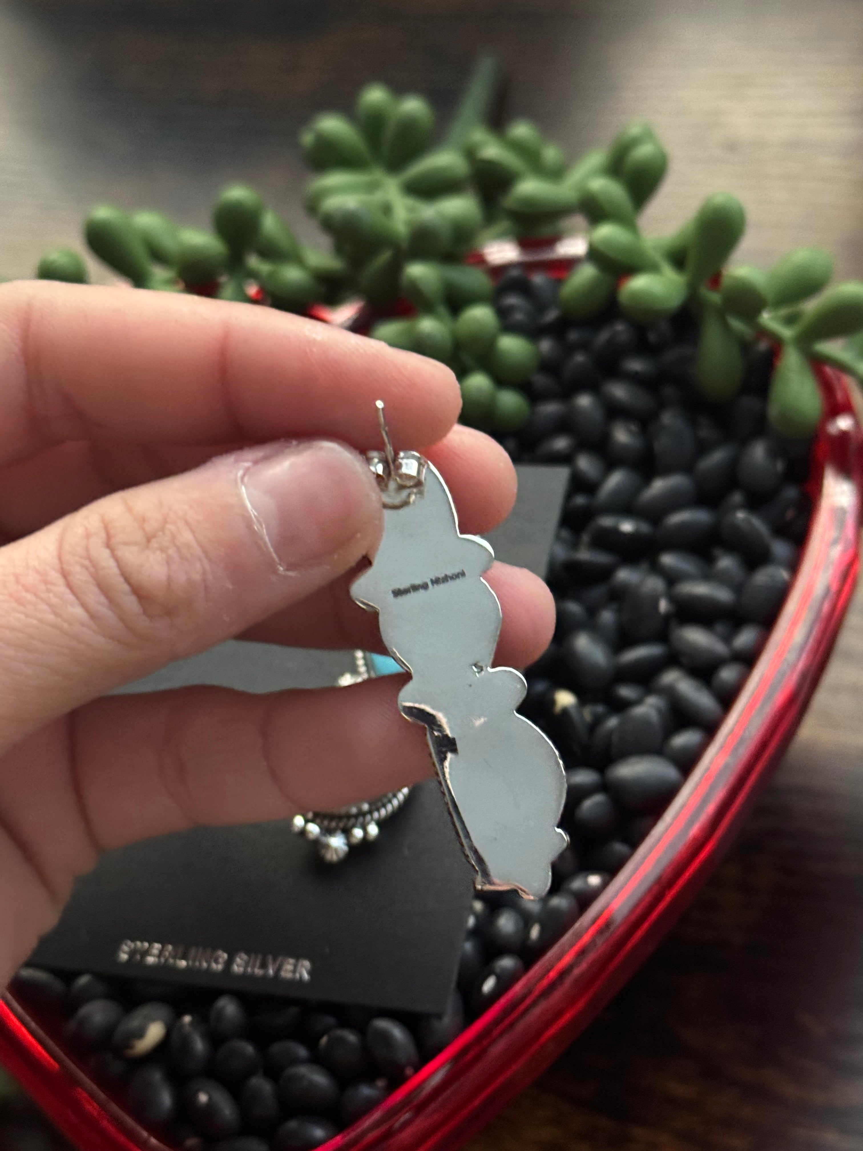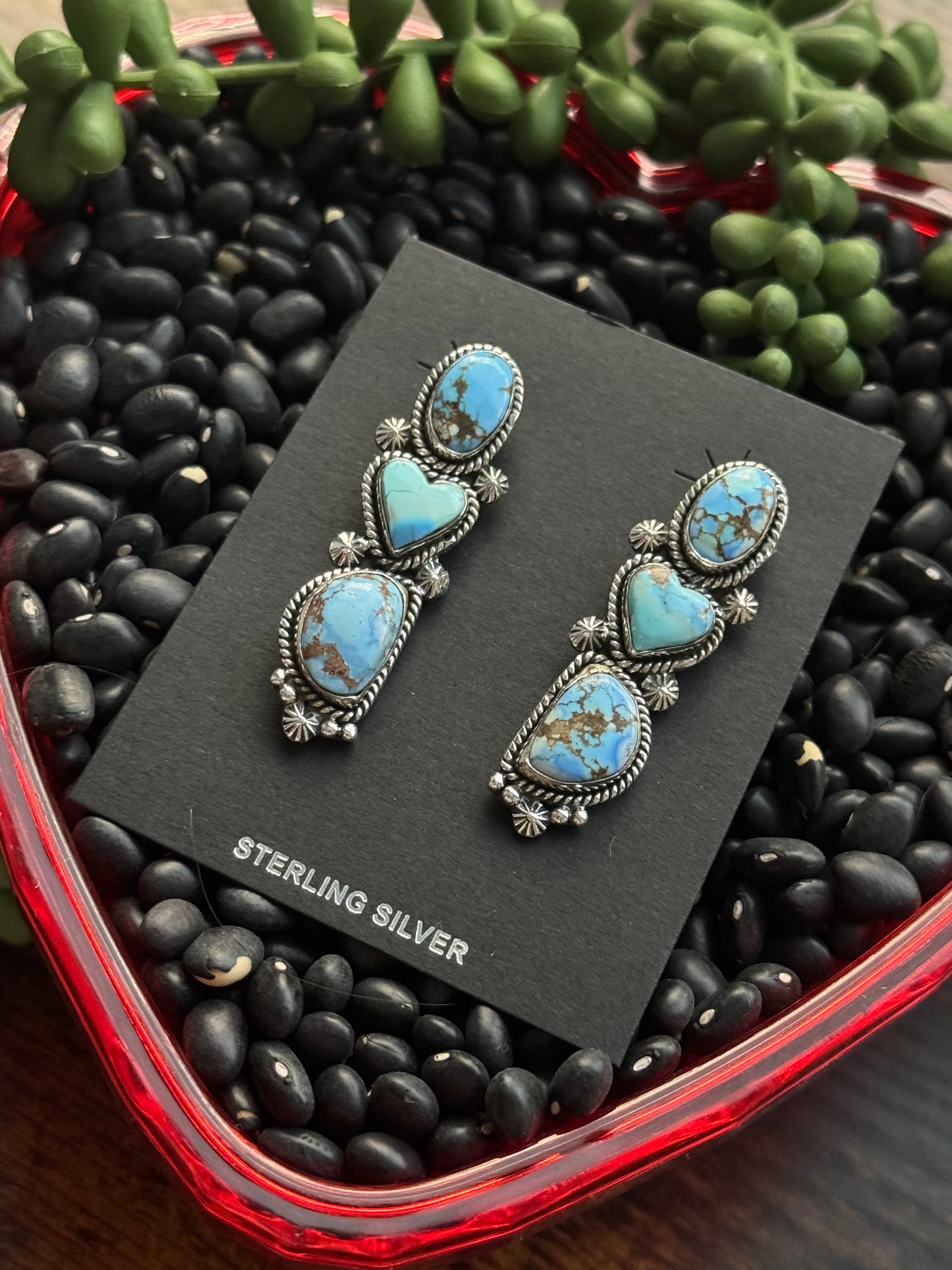 Breathtaking earrings. Southwest Handmade Golden Hills Turquoise & Sterling Silver Post Dangle Earrings. It measures just over 1 7/8 inches long and 1/2 of an inch wide. Signed by the artist and stamped sterling silver.