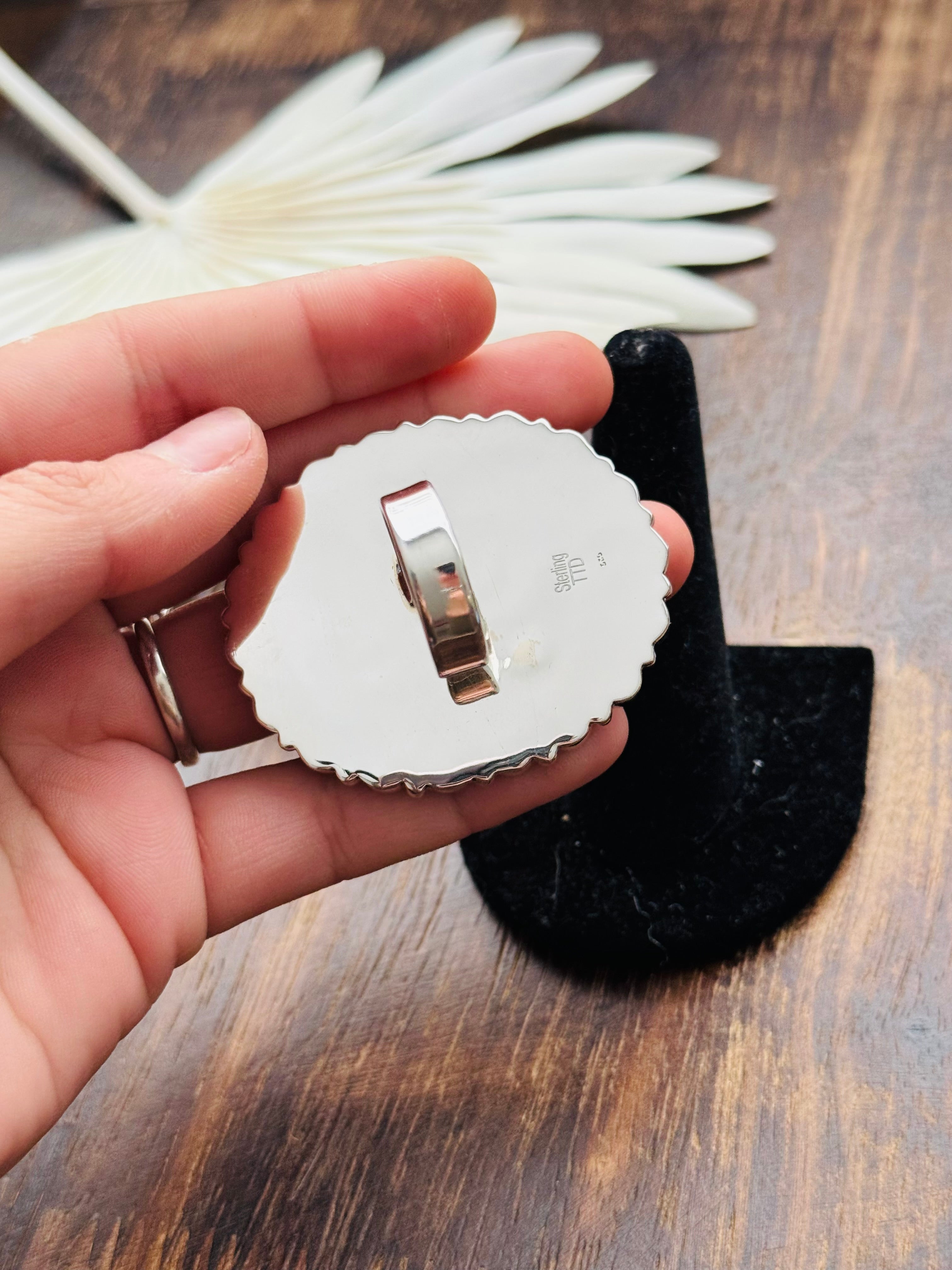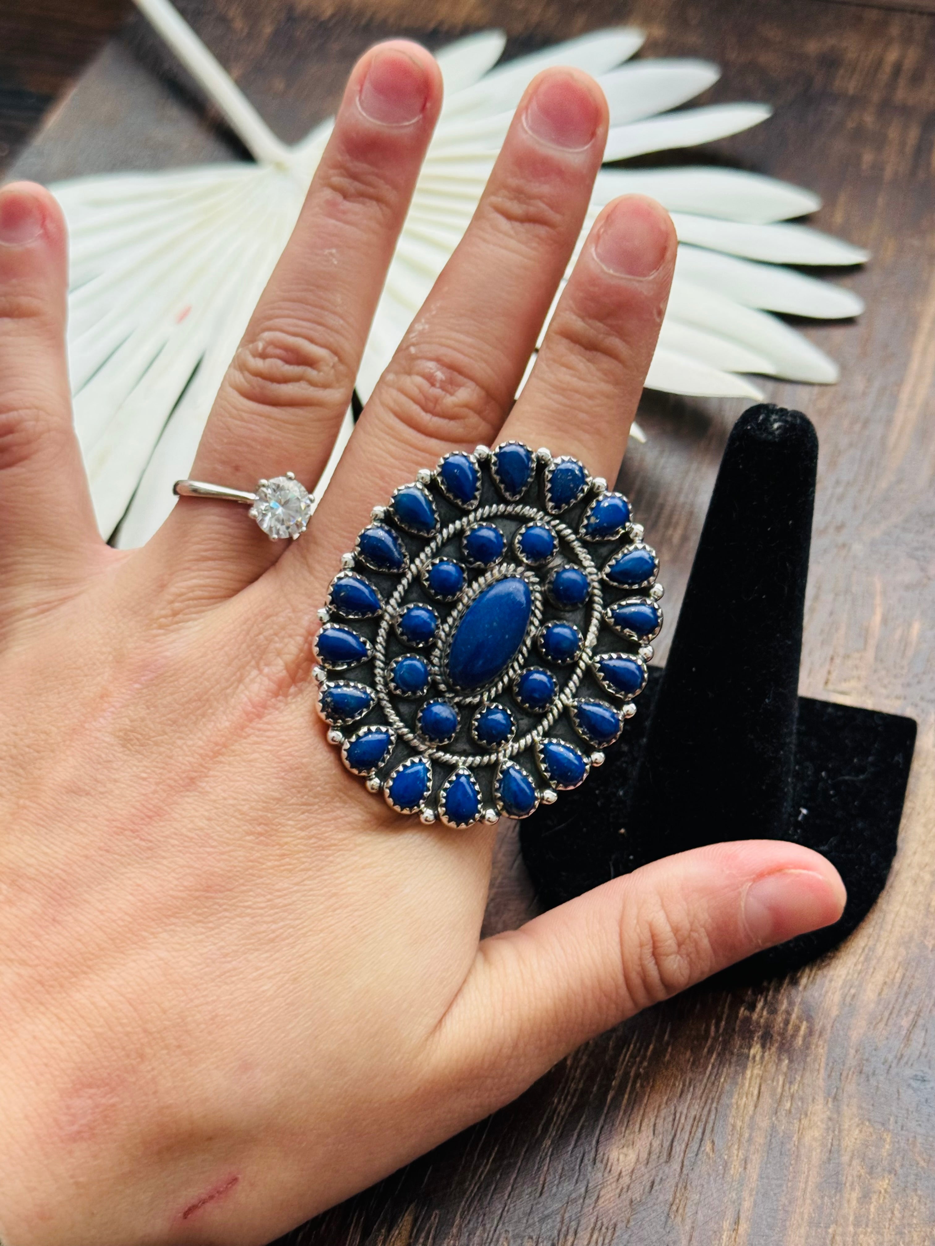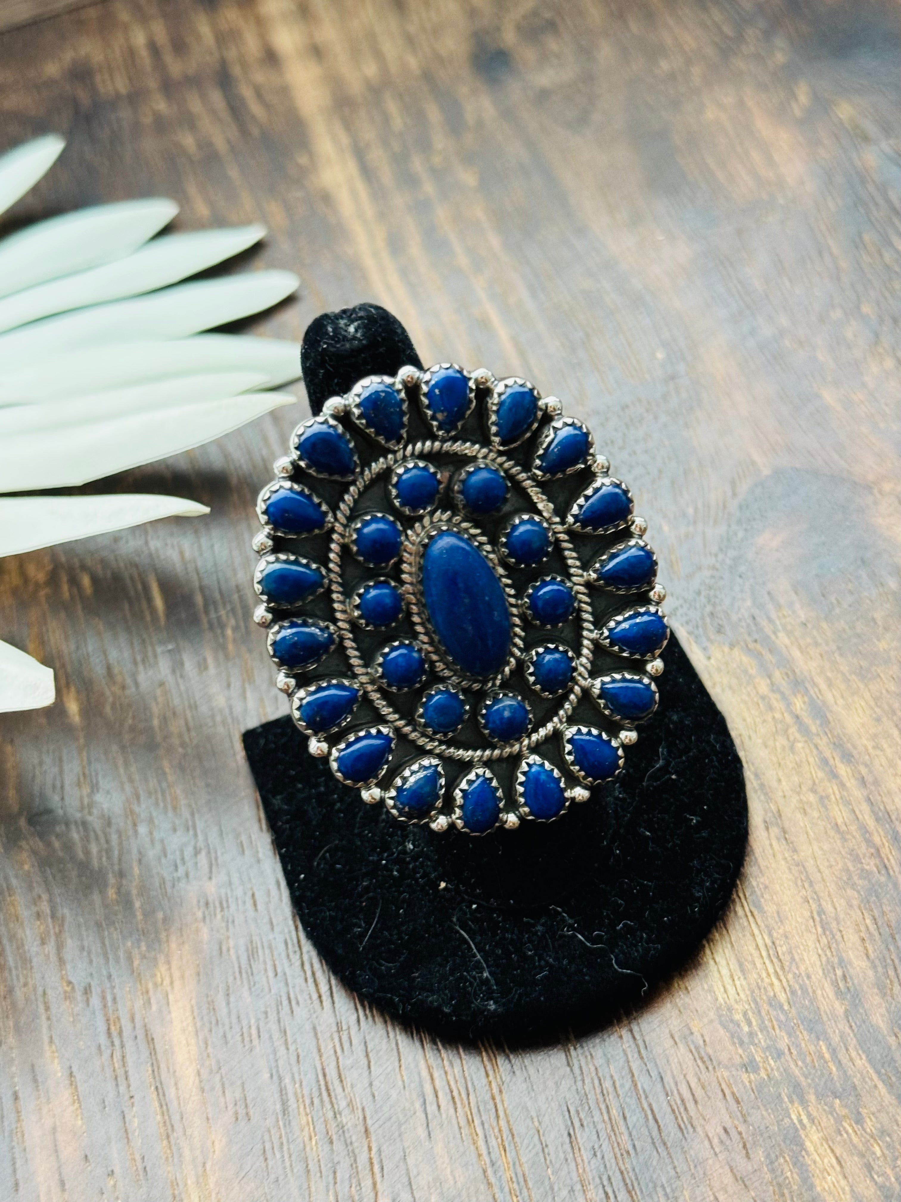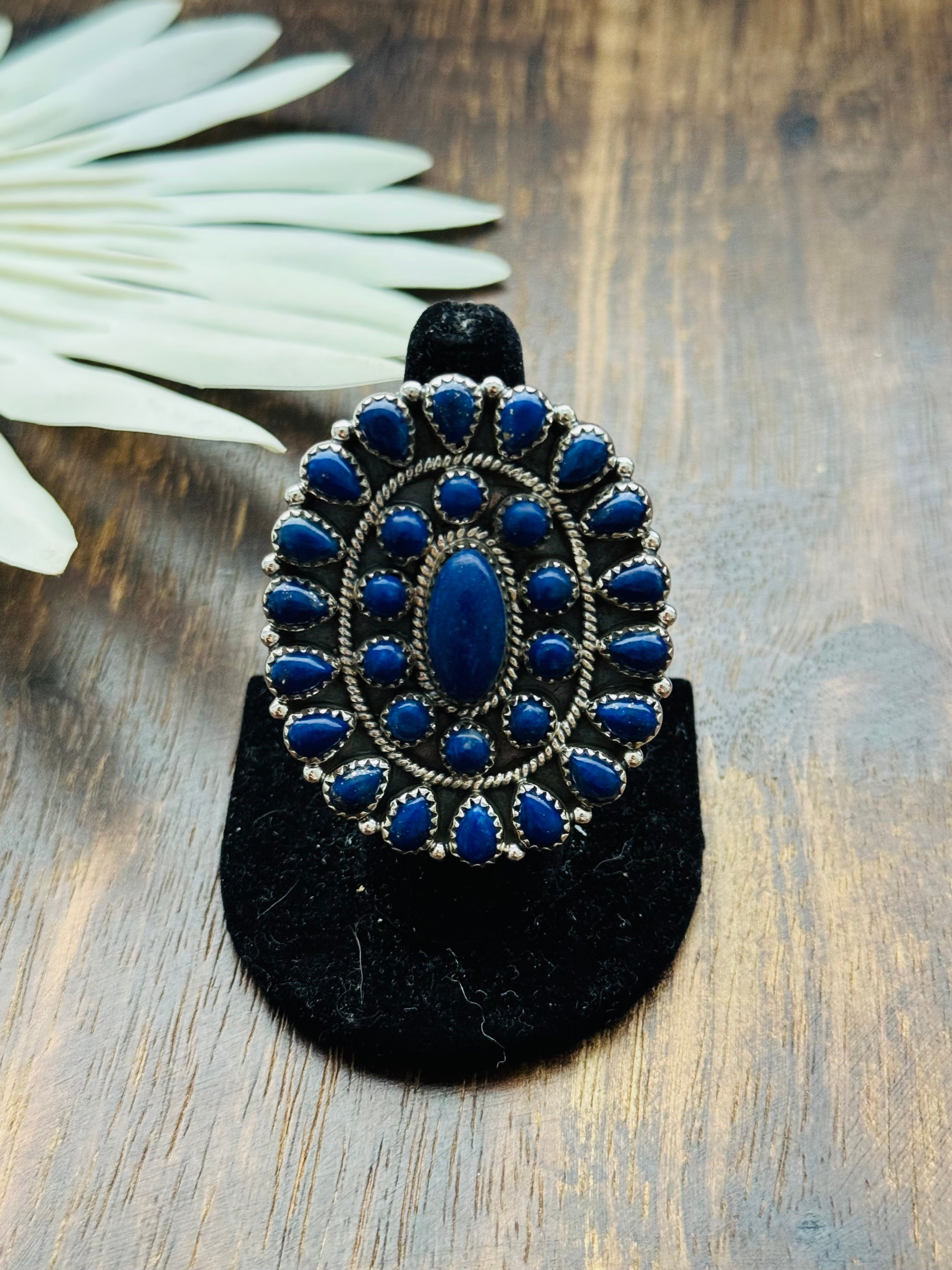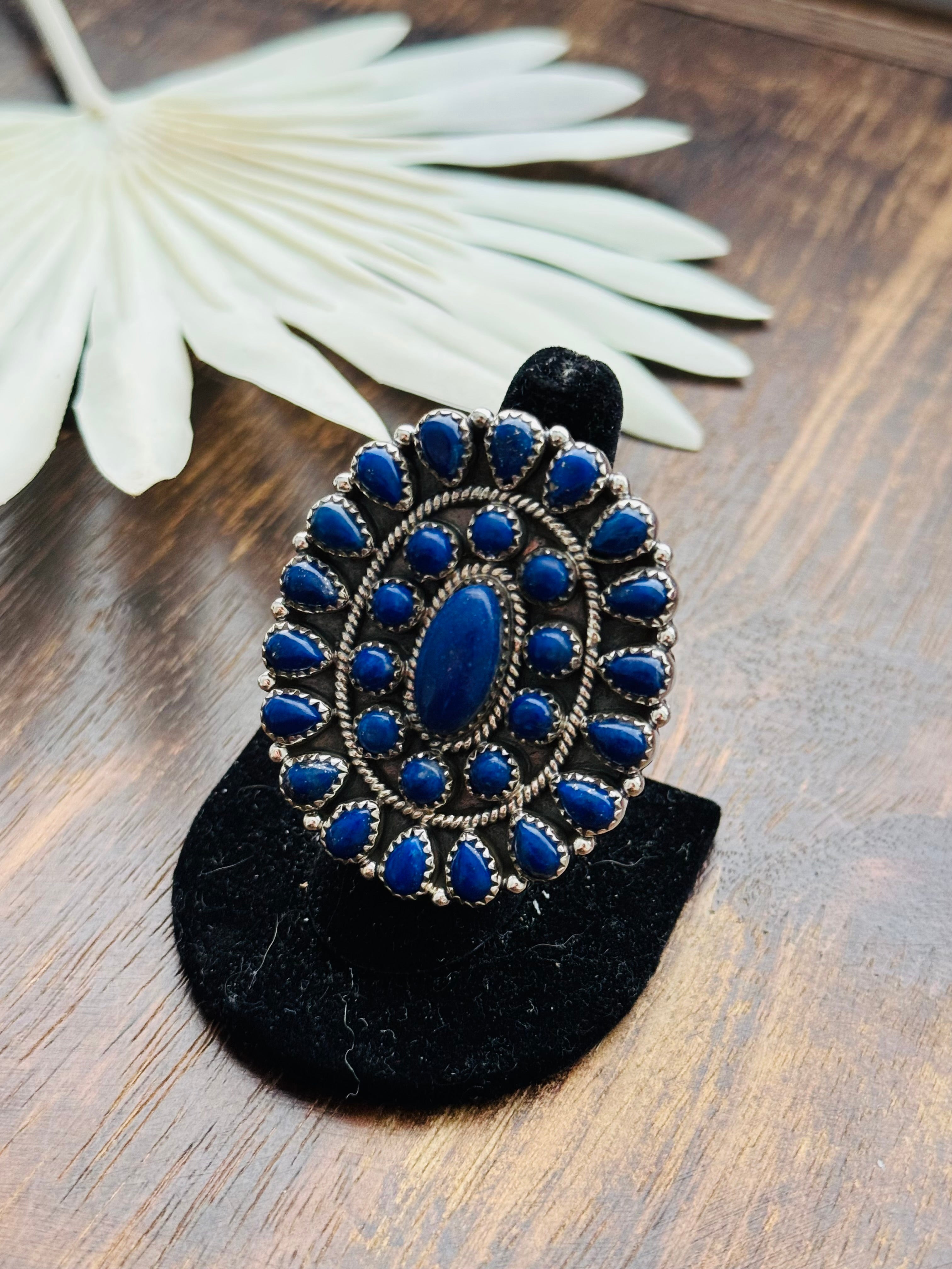 Beautiful cluster ring. Southwest Handmade Lapis & Sterling Silver Adjustable Cluster Ring. It measures 2 inches long and 1 3/4 inches wide. Signed by the artist and stamped sterling silver.