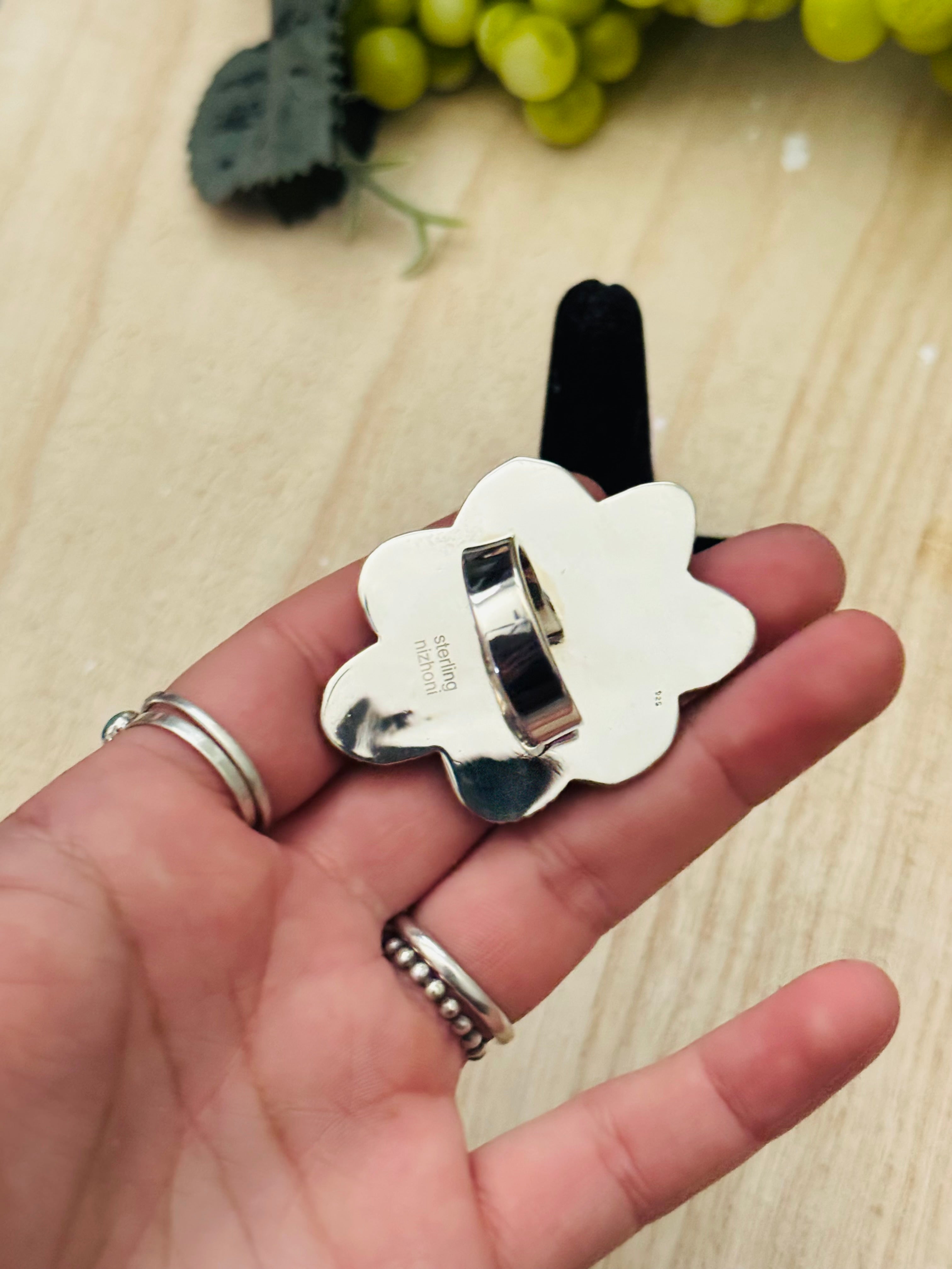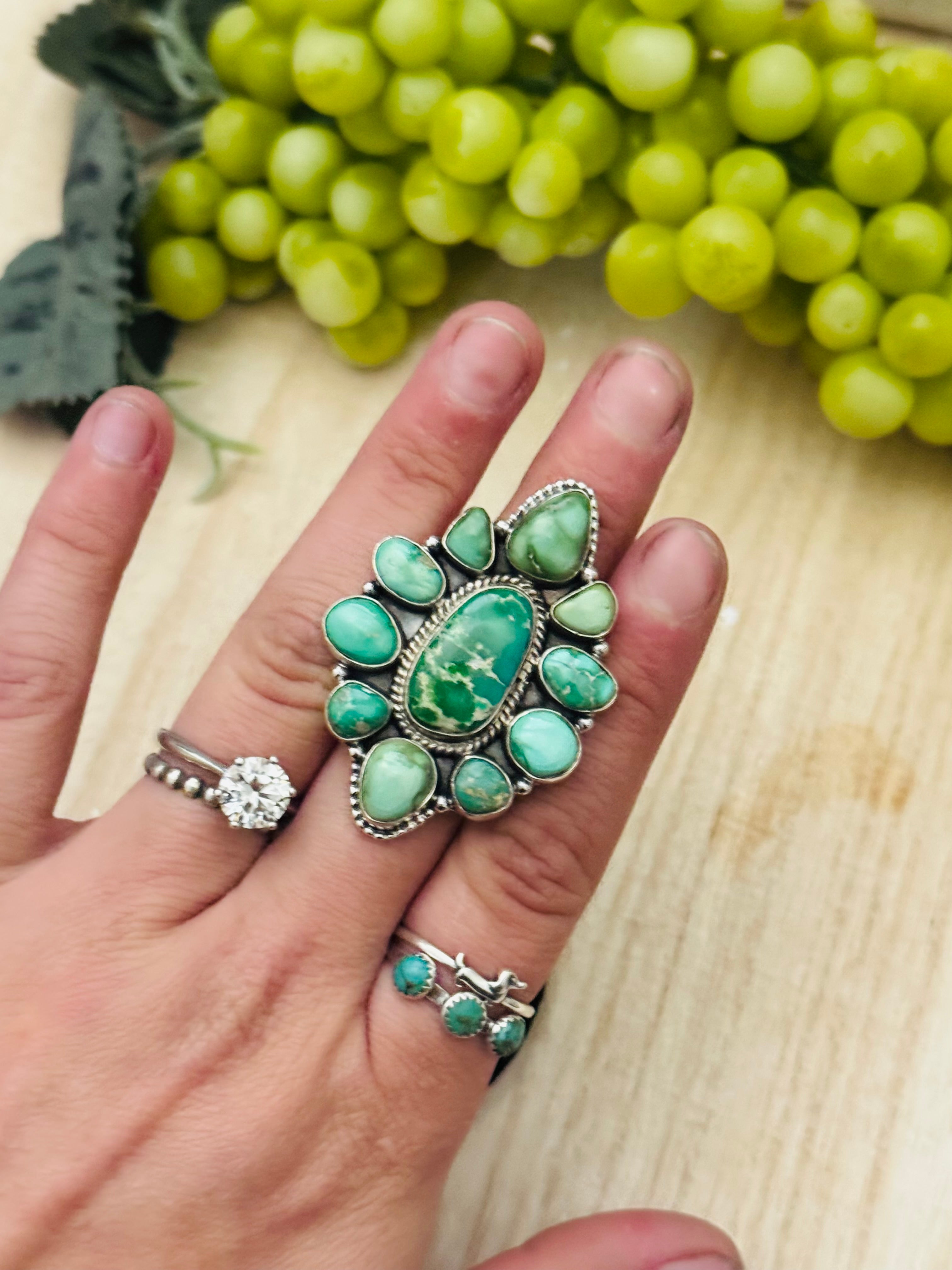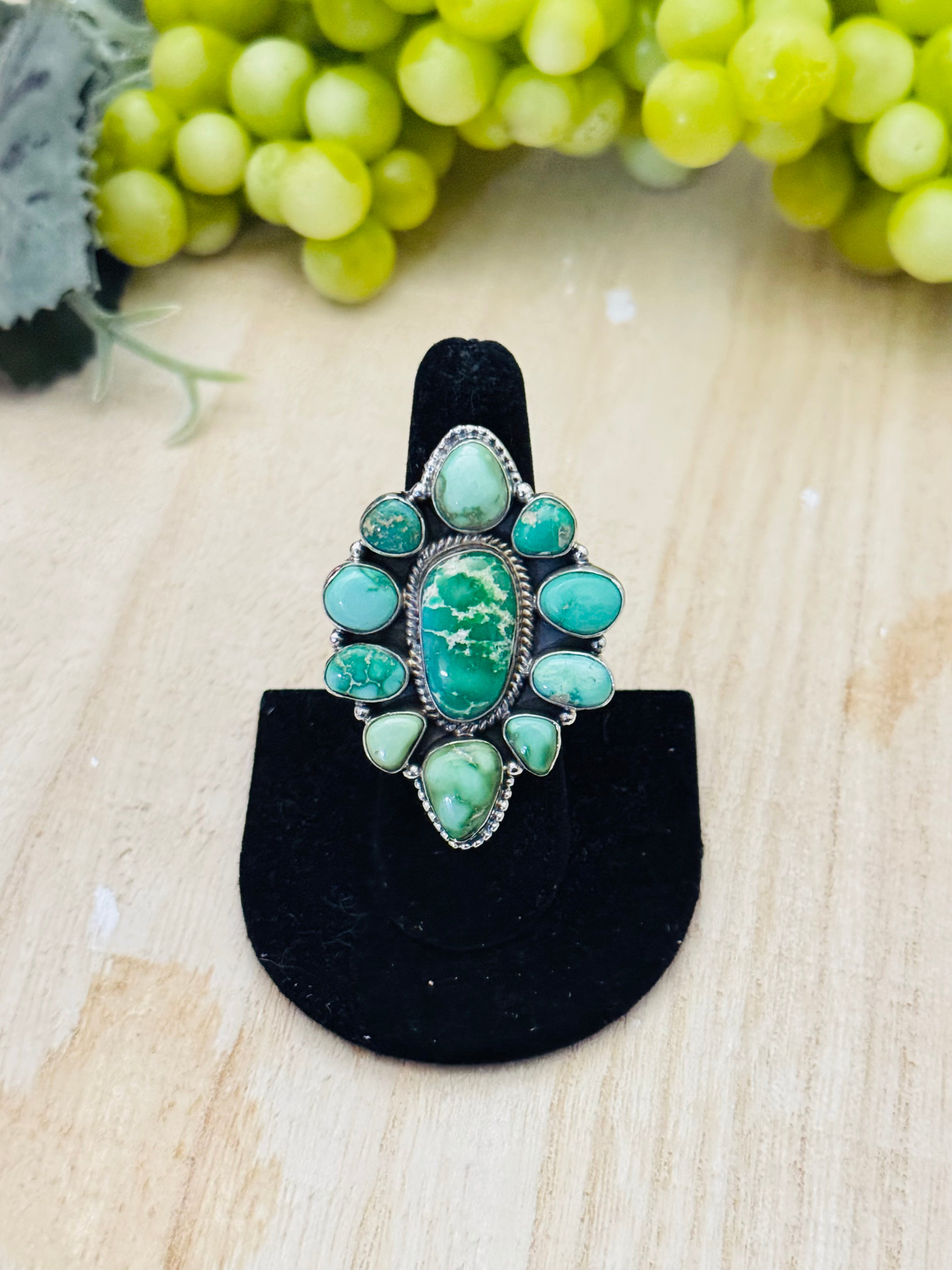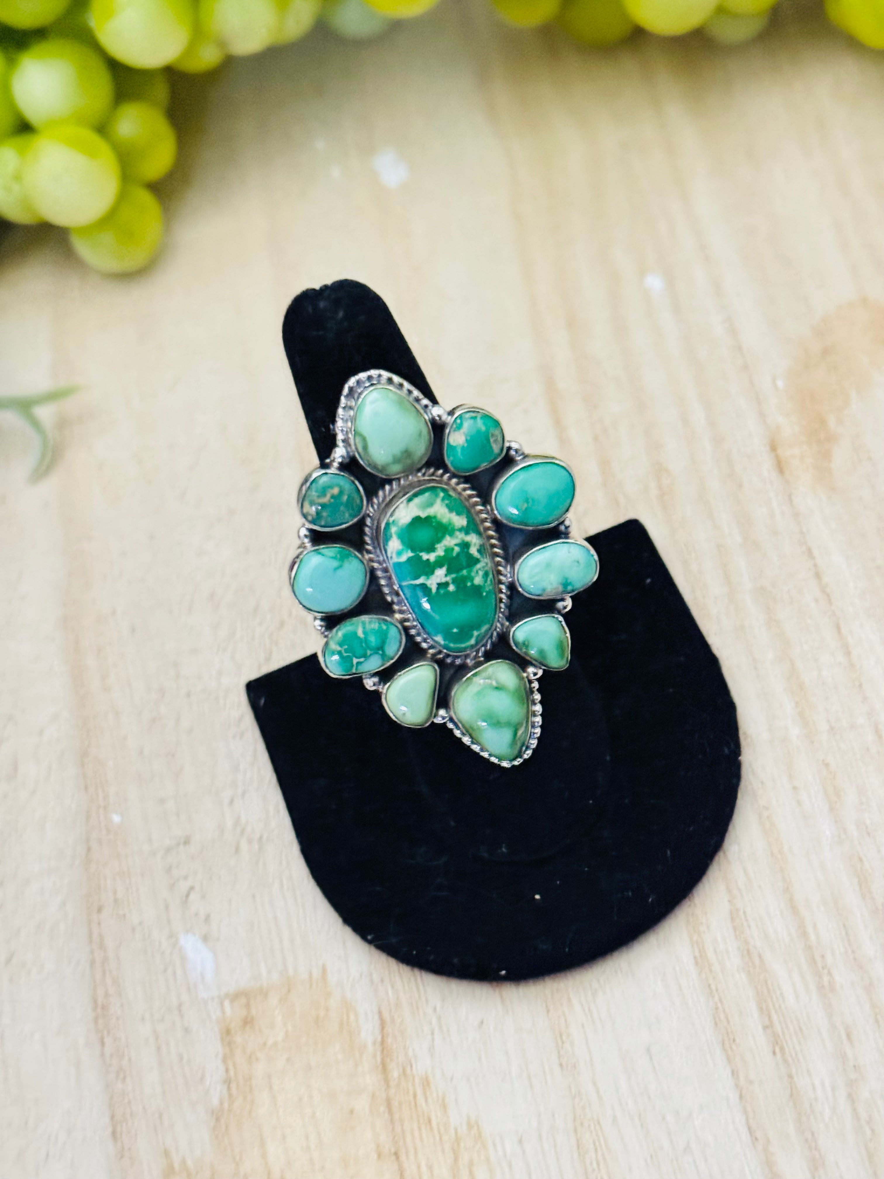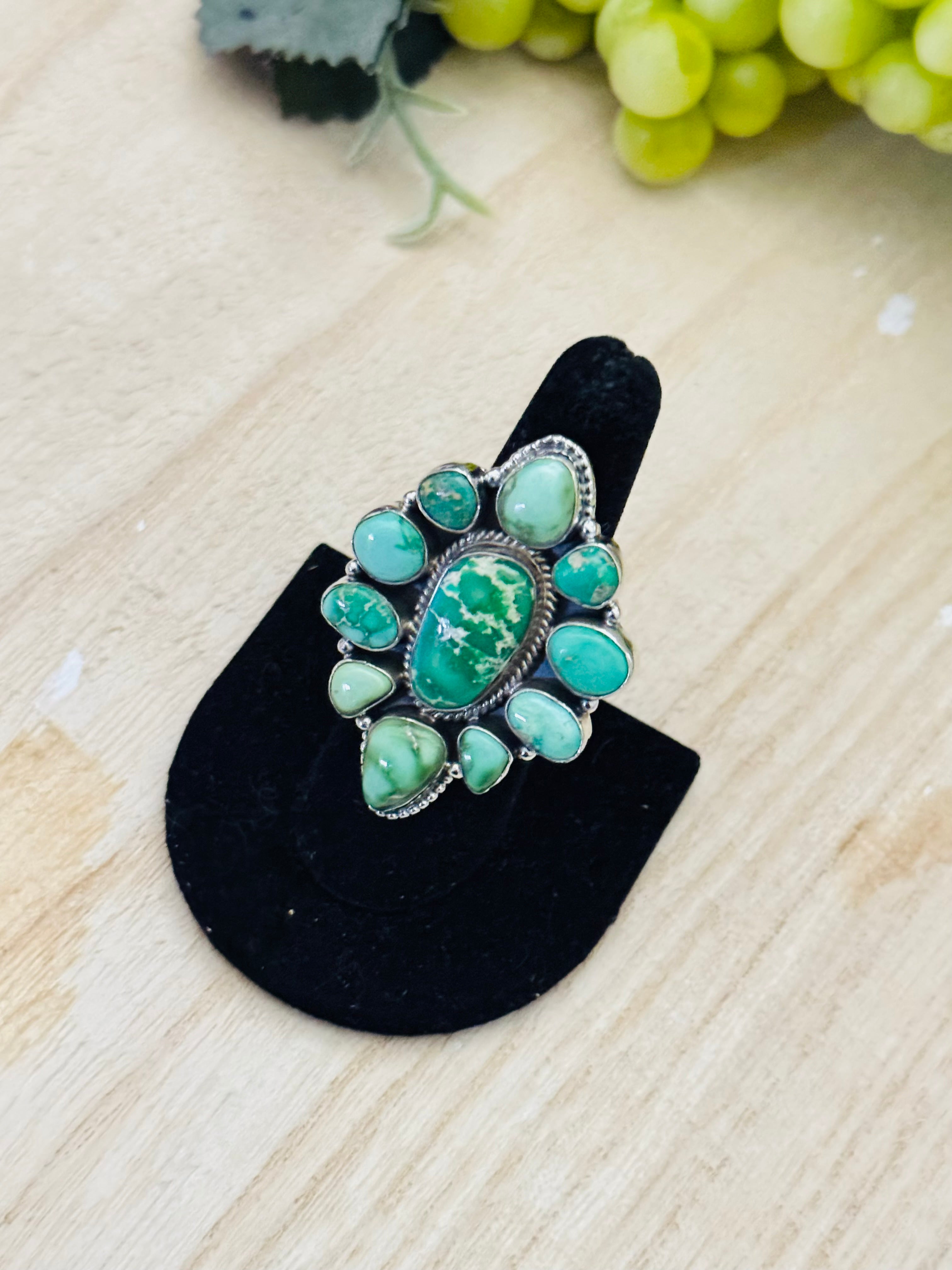 Beautiful ring. Southwest Handmade Emerald Valley Turquoise & Sterling Silver Adjustable Cluster Ring. It measures 1 7/8 inches long and 1 3/8 inches wide. Signed by the artist and stamped sterling silver.