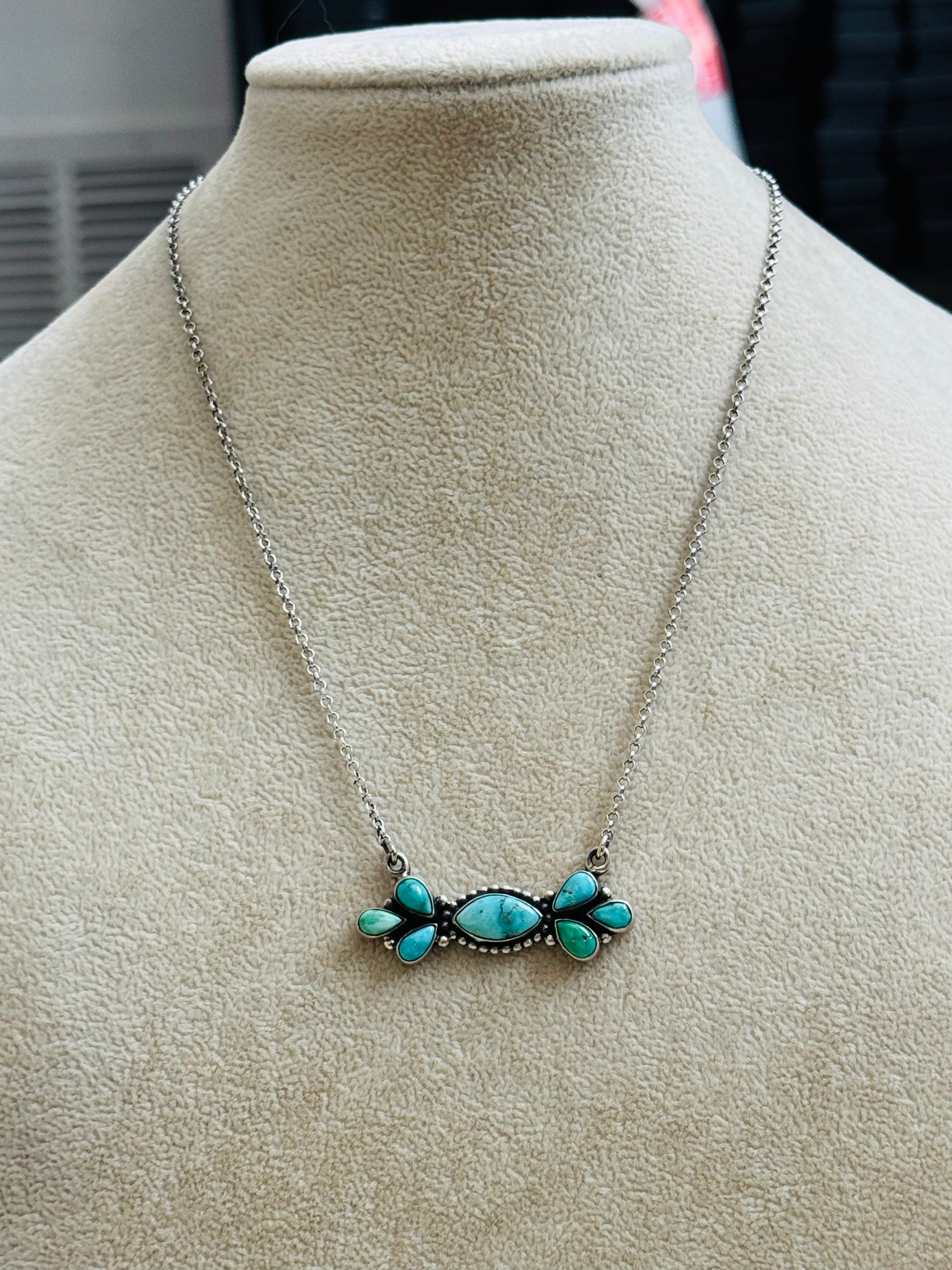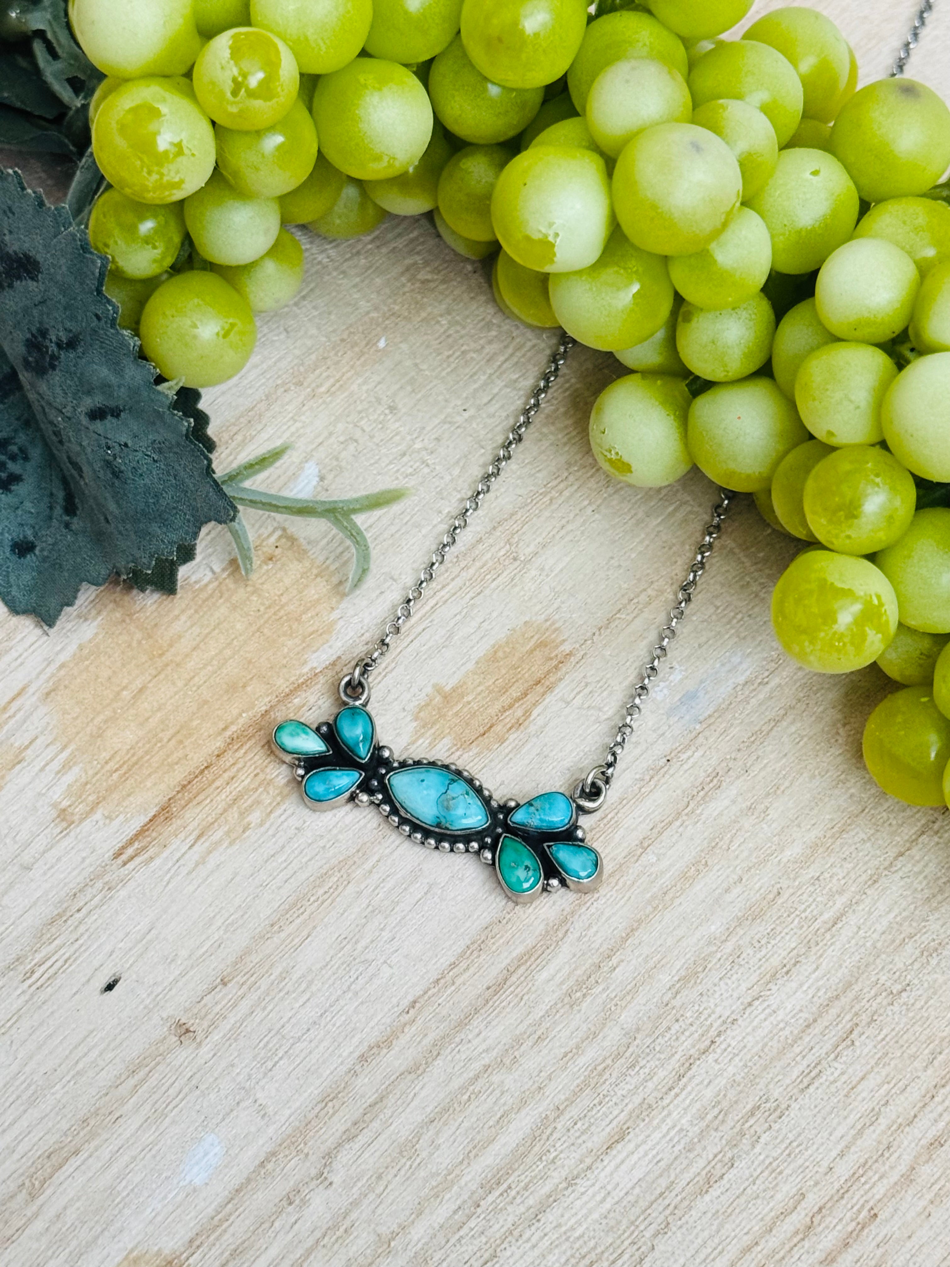 Beautiful necklace. Southwest Handmade Emerald Valley Turquoise & Sterling Silver Cluster Necklace. It measures 18 inches long with hang while the chain by itself measures 17 inches long but can be adjusted down. Signed by the artist and stamped sterling silver.