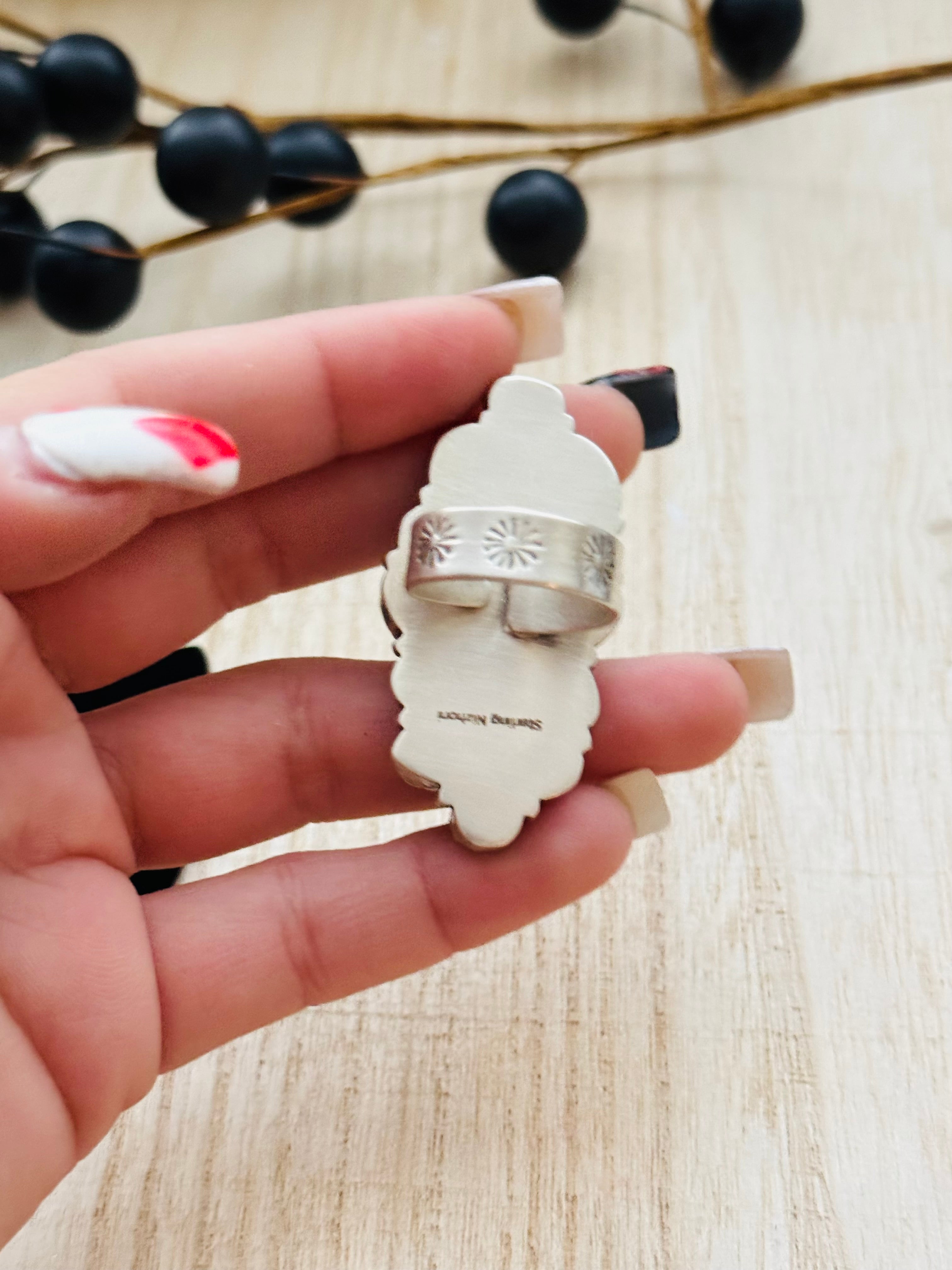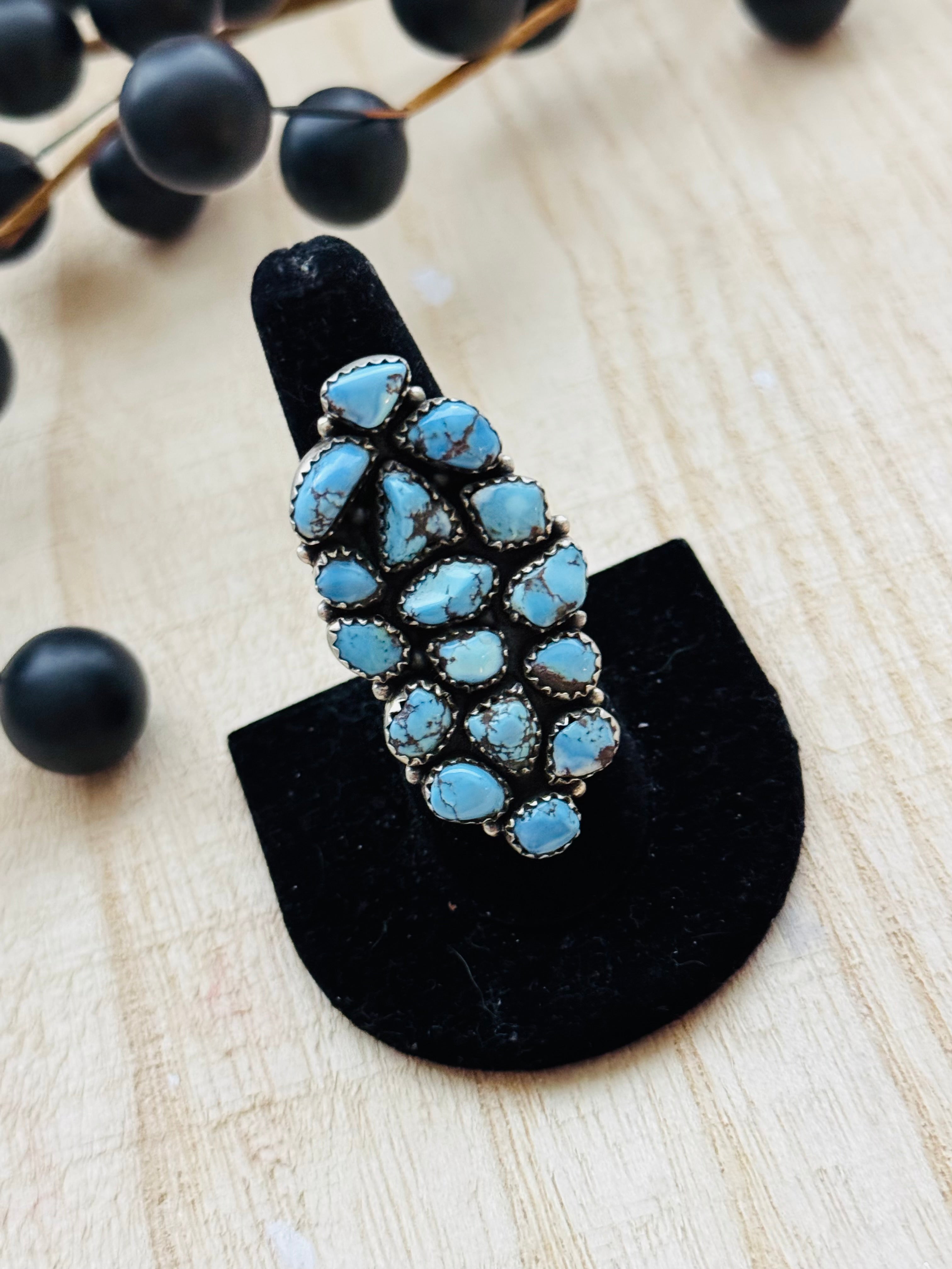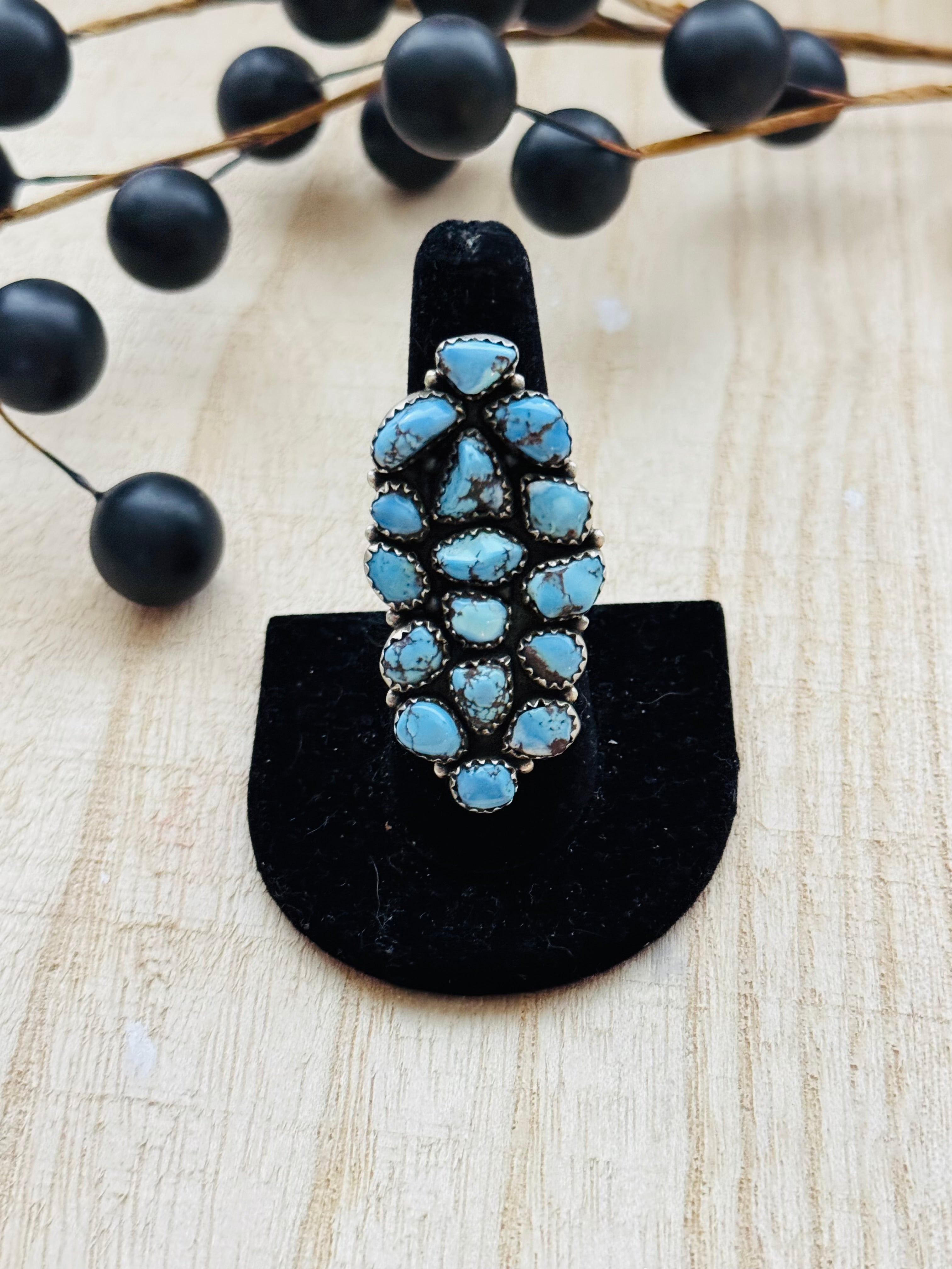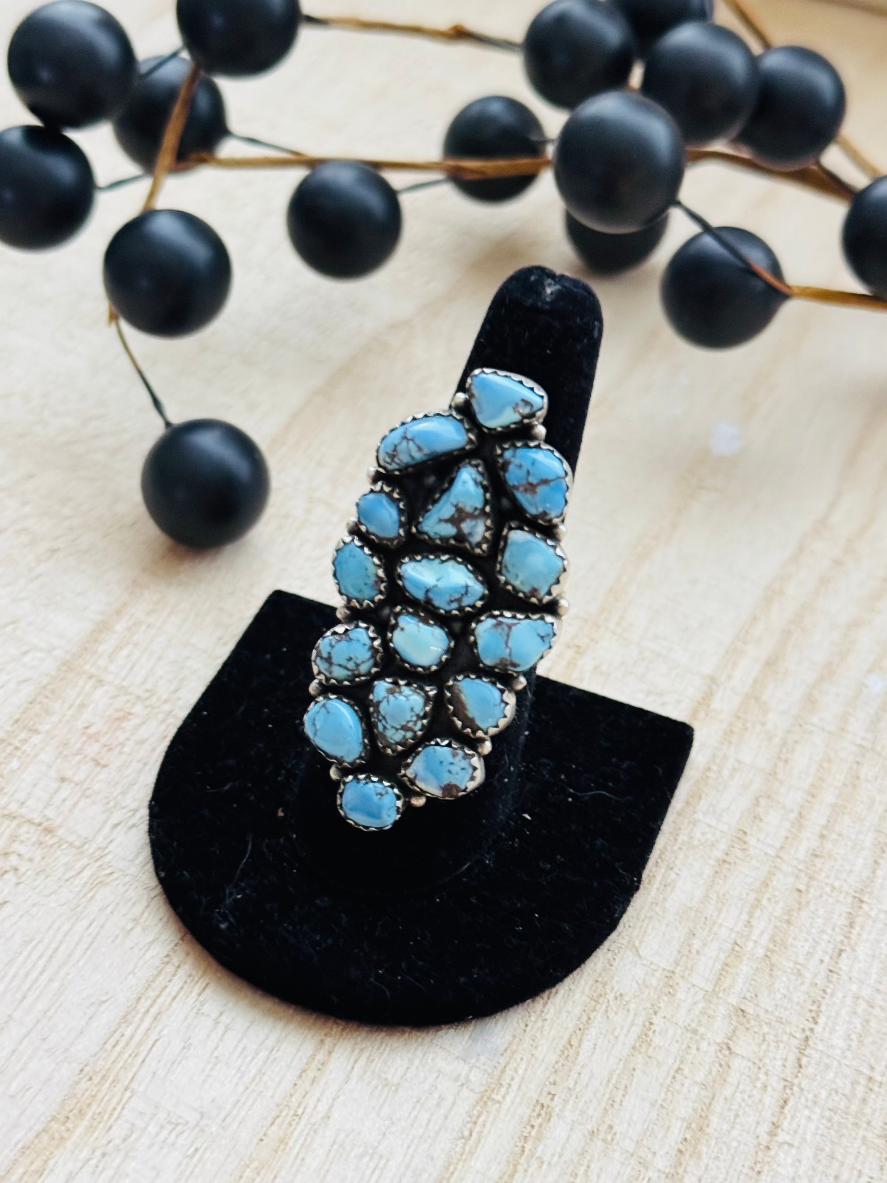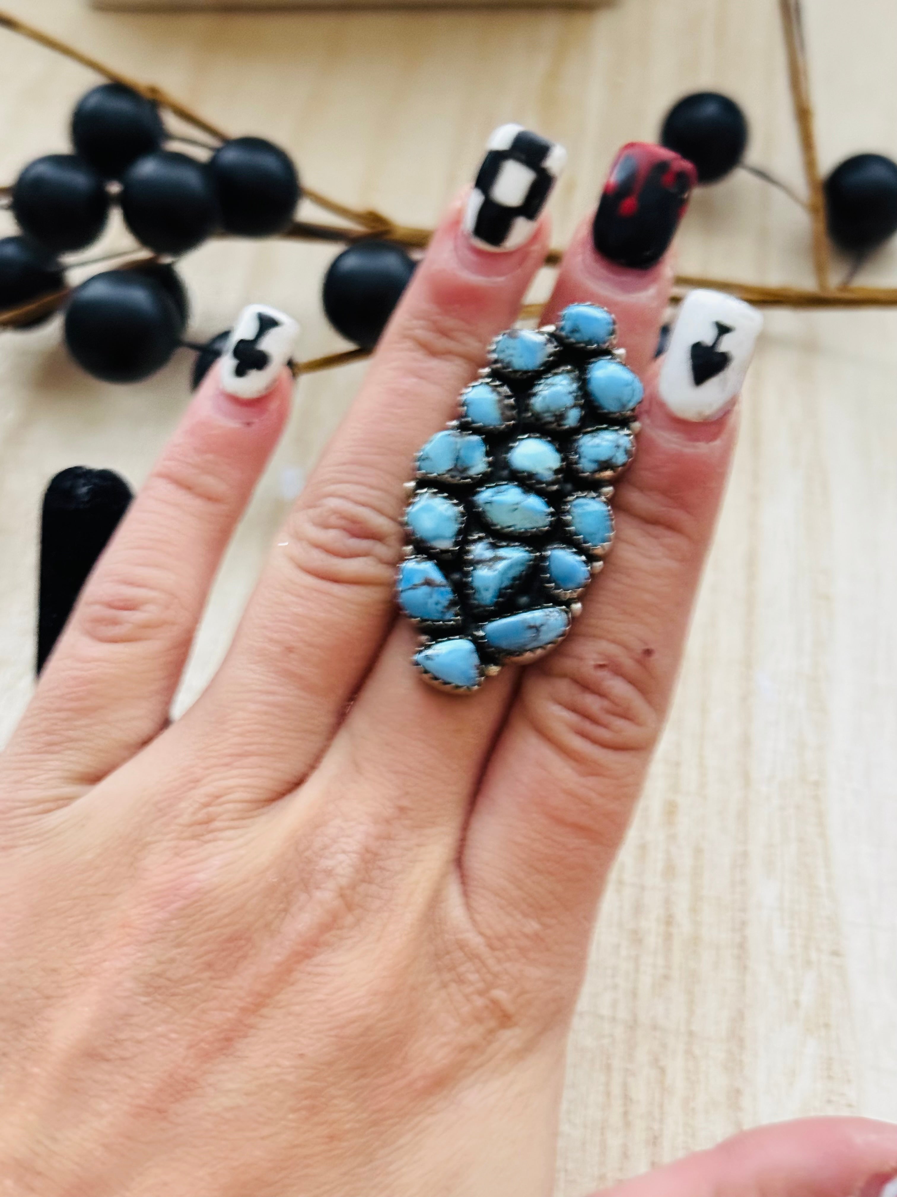 Beautiful ring. Southwest Handmade Golden Hills Turquoise & Sterling Silver Adjustable Cluster Ring. It measures 2 inches long and 1 inch wide. Signed by the artist and stamped sterling silver.