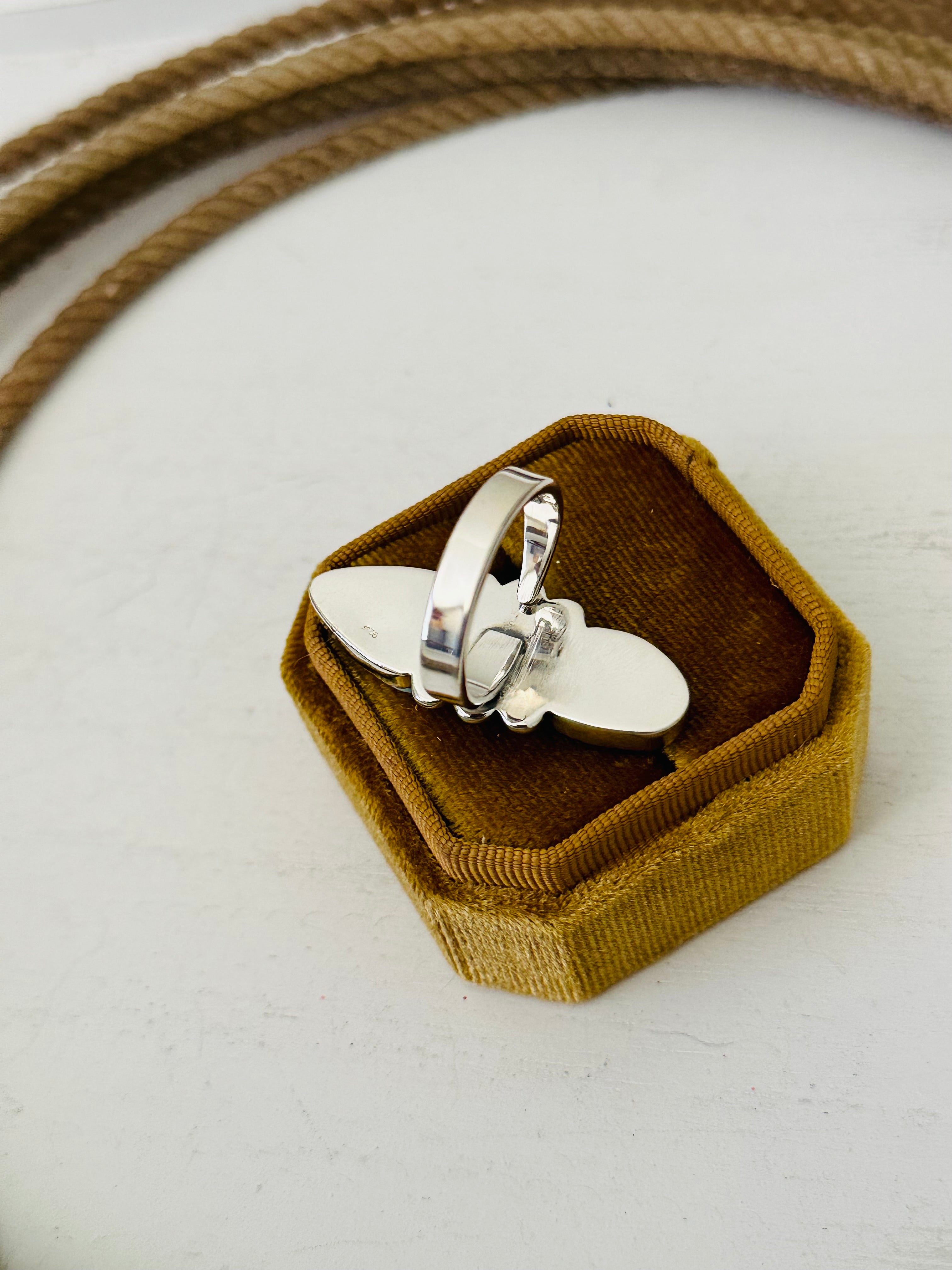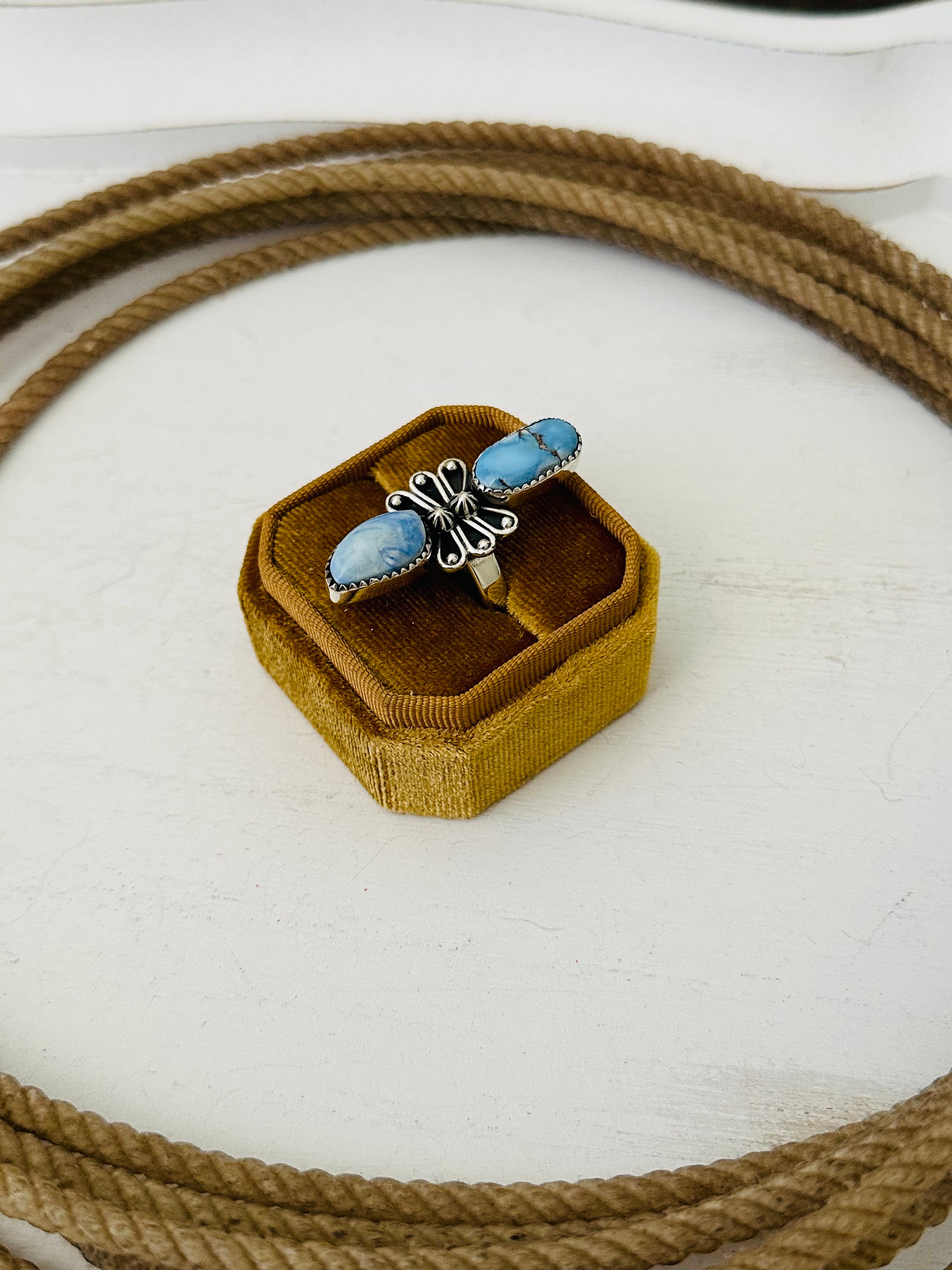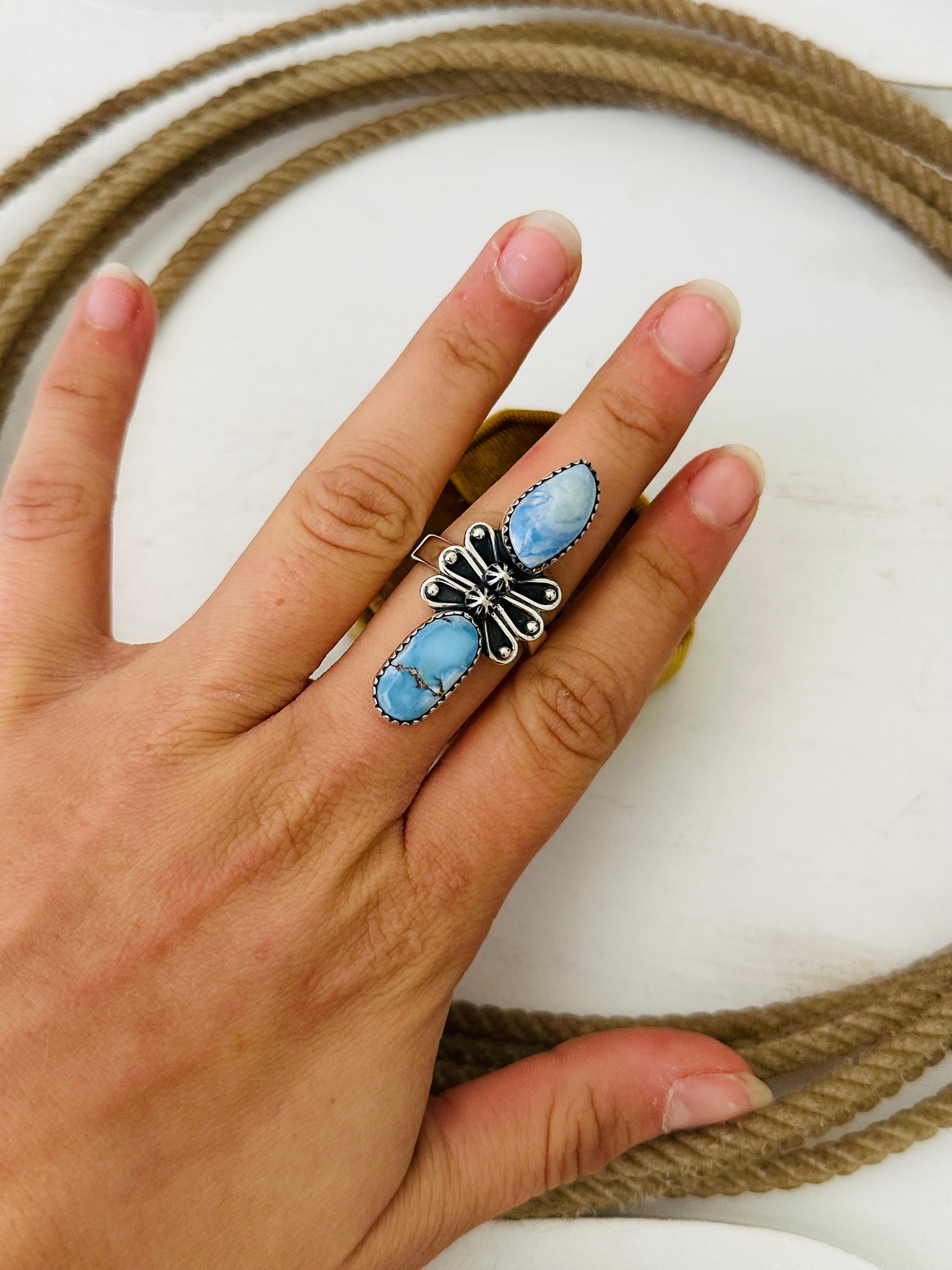 Beautiful ring. Southwest Handmade Golden Hills Turquoise & Sterling Silver Adjustable Ring. It measures 1 3/4 inches long and 5/8 of an inch wide. Signed by the artist and stamped sterling silver.