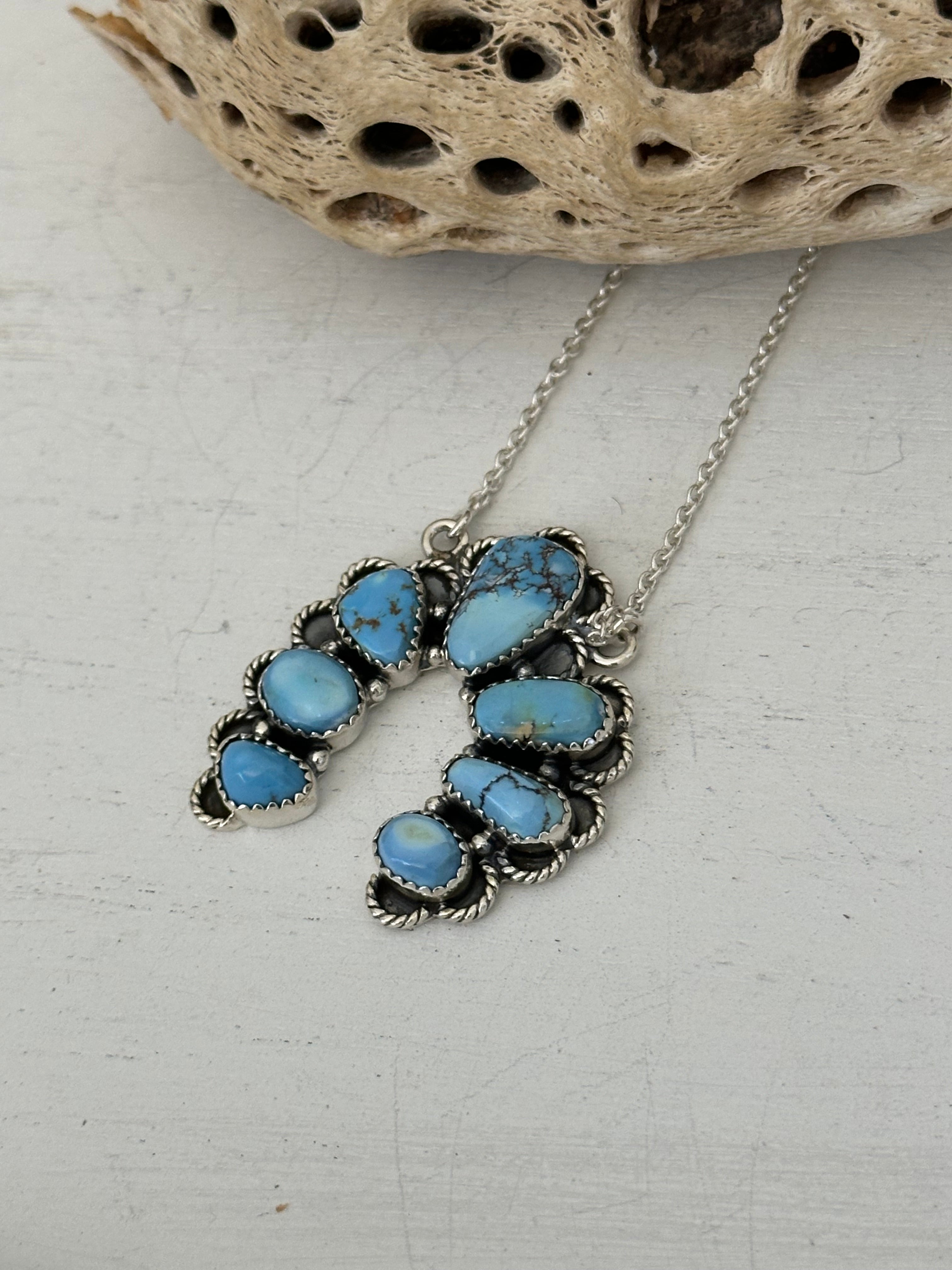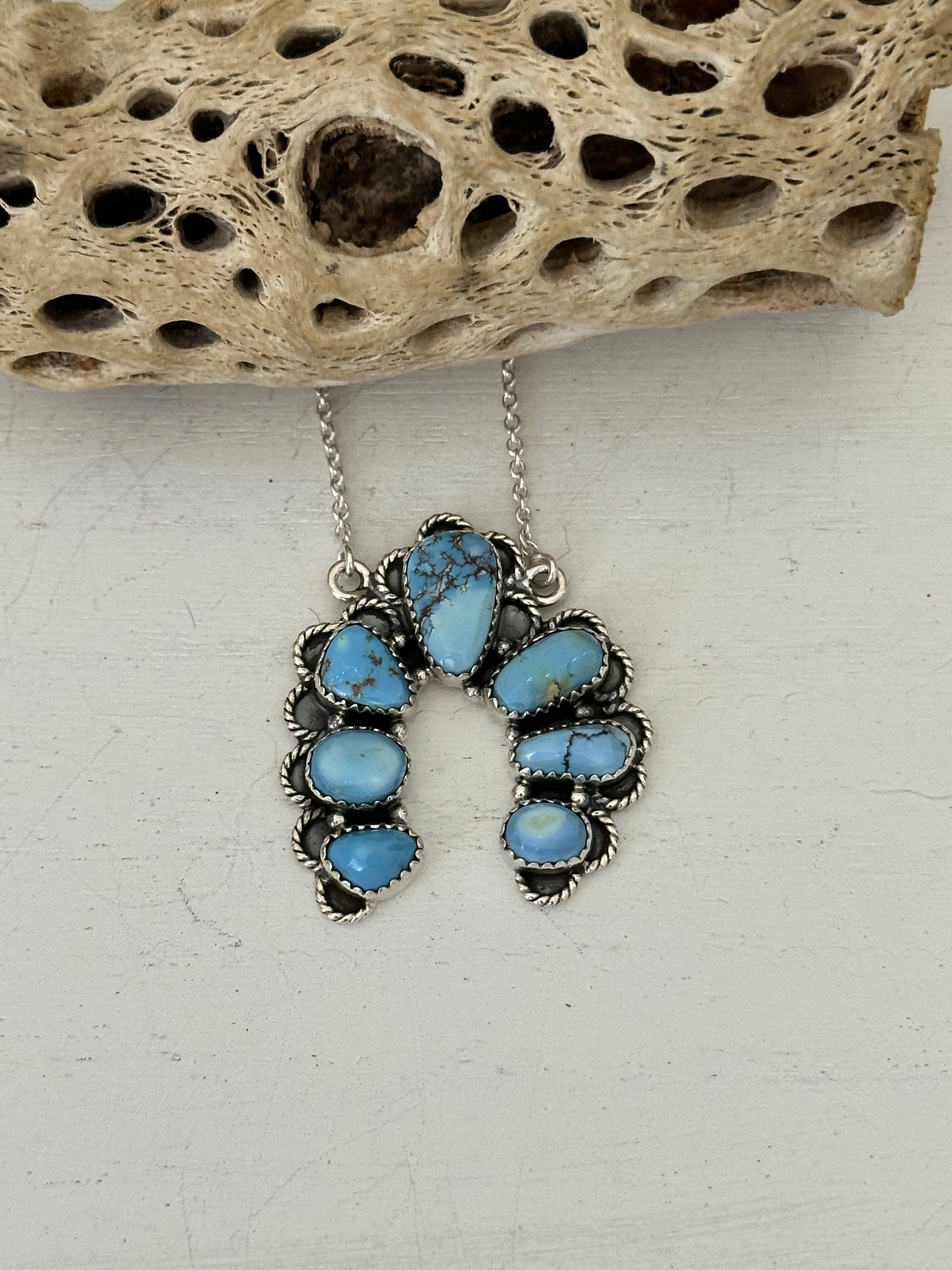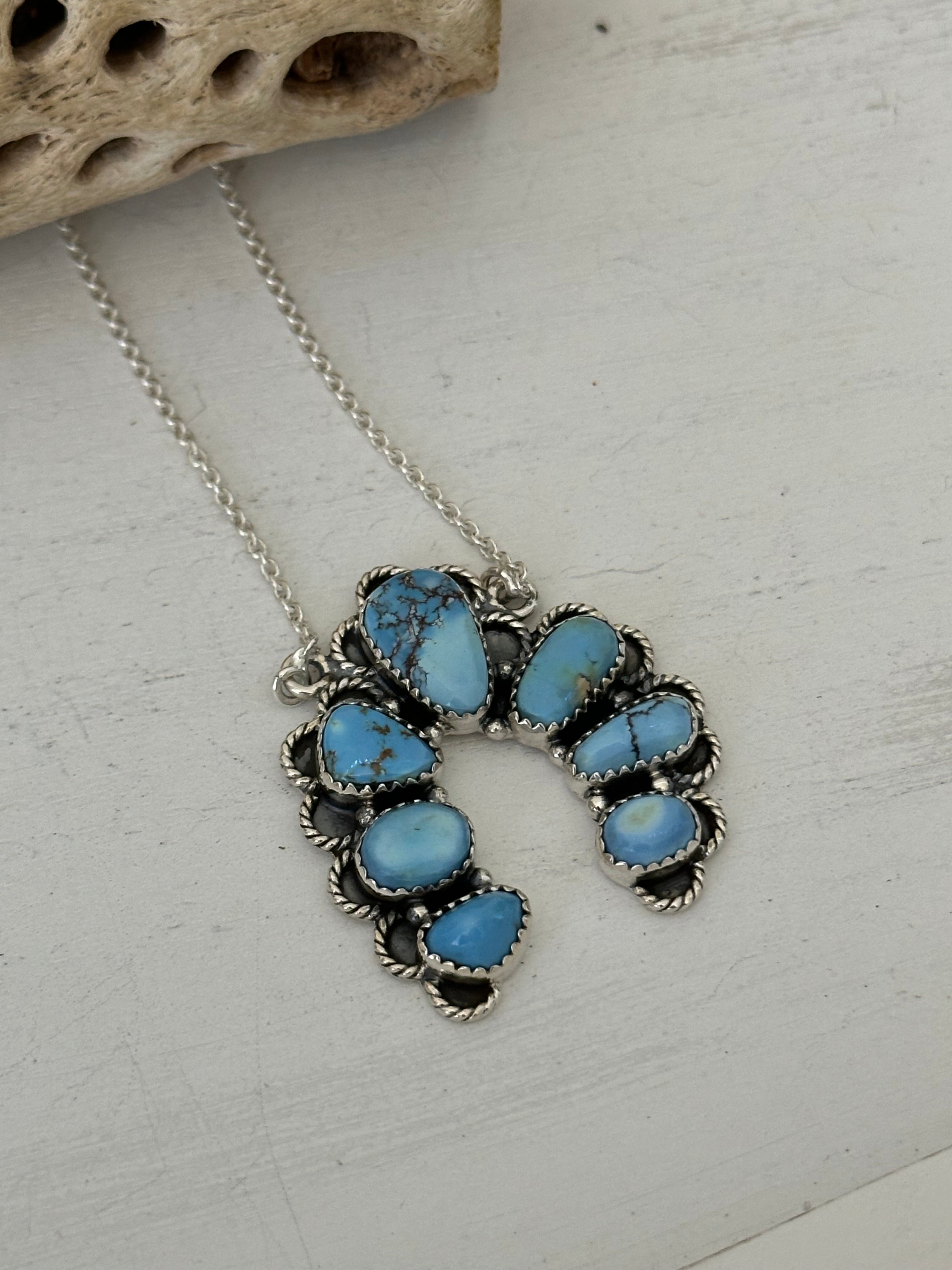 Beautiful necklace. Southwest Handmade Golden Hills Turquoise & Sterling Silver Cluster Naja Necklace. It measures 22 inches long with hang while the chain by itself measures 19 inches long but can be adjusted down to 16 1/2 inches long. Signed by the artist and stamped sterling silver.