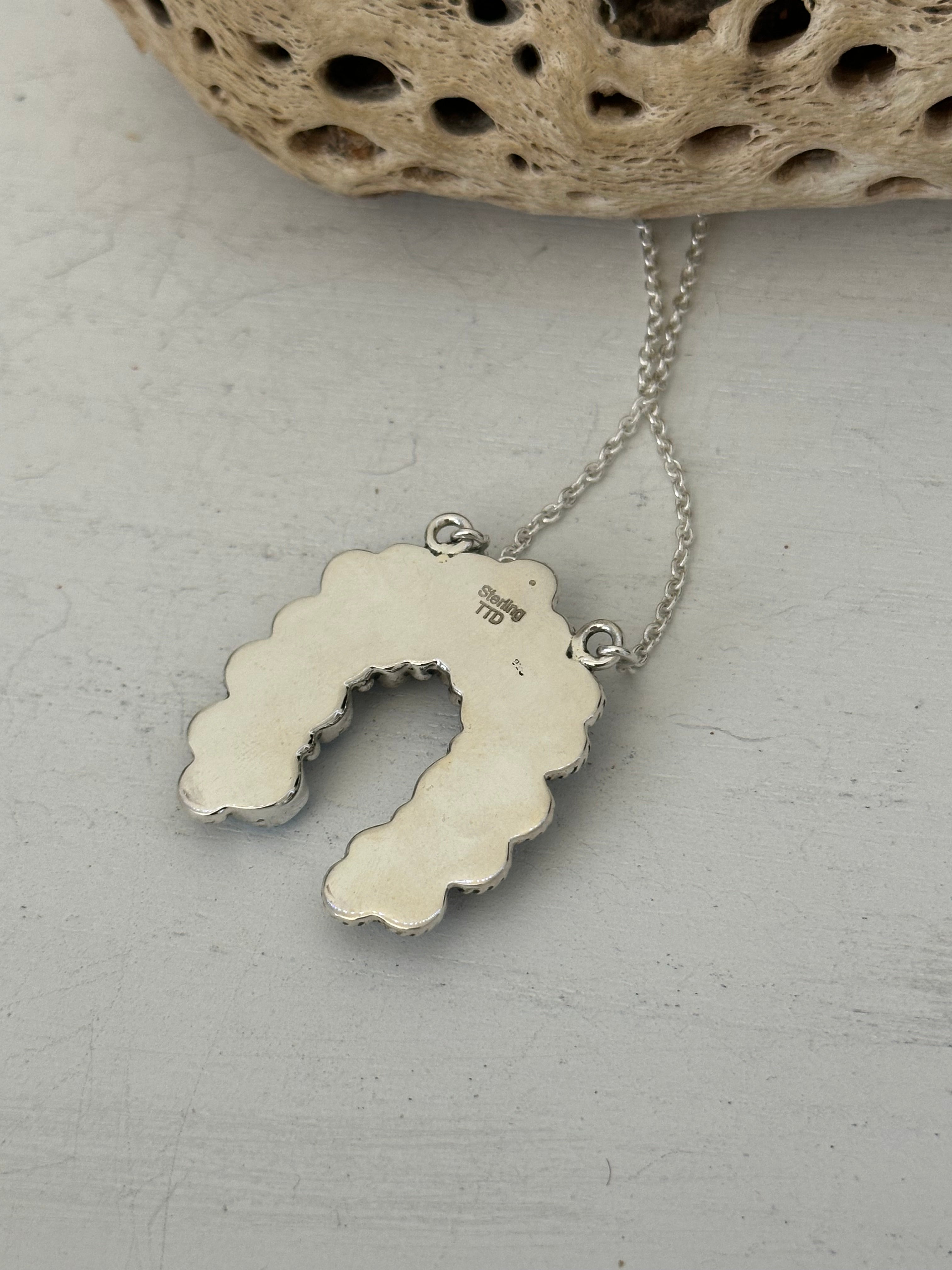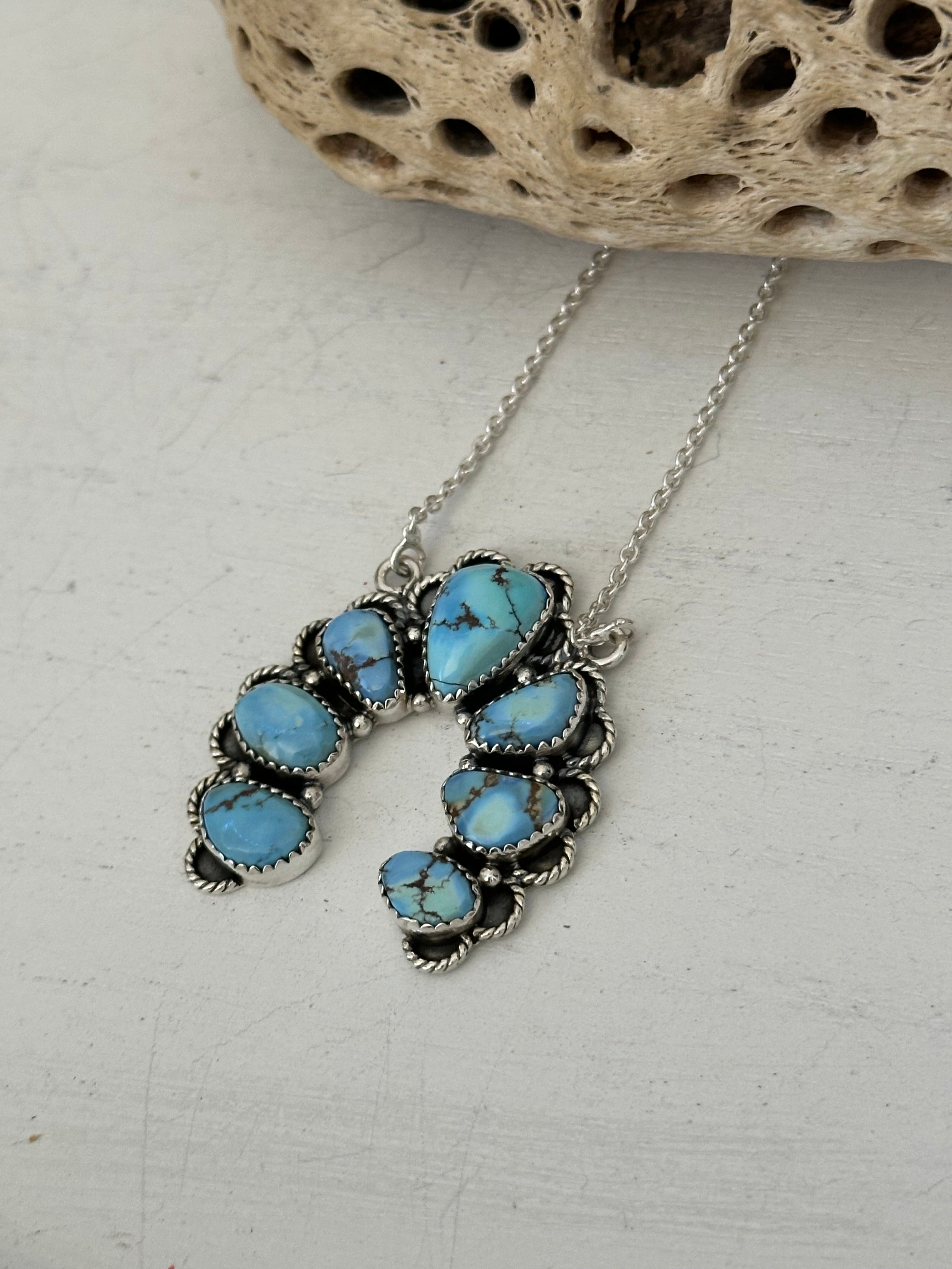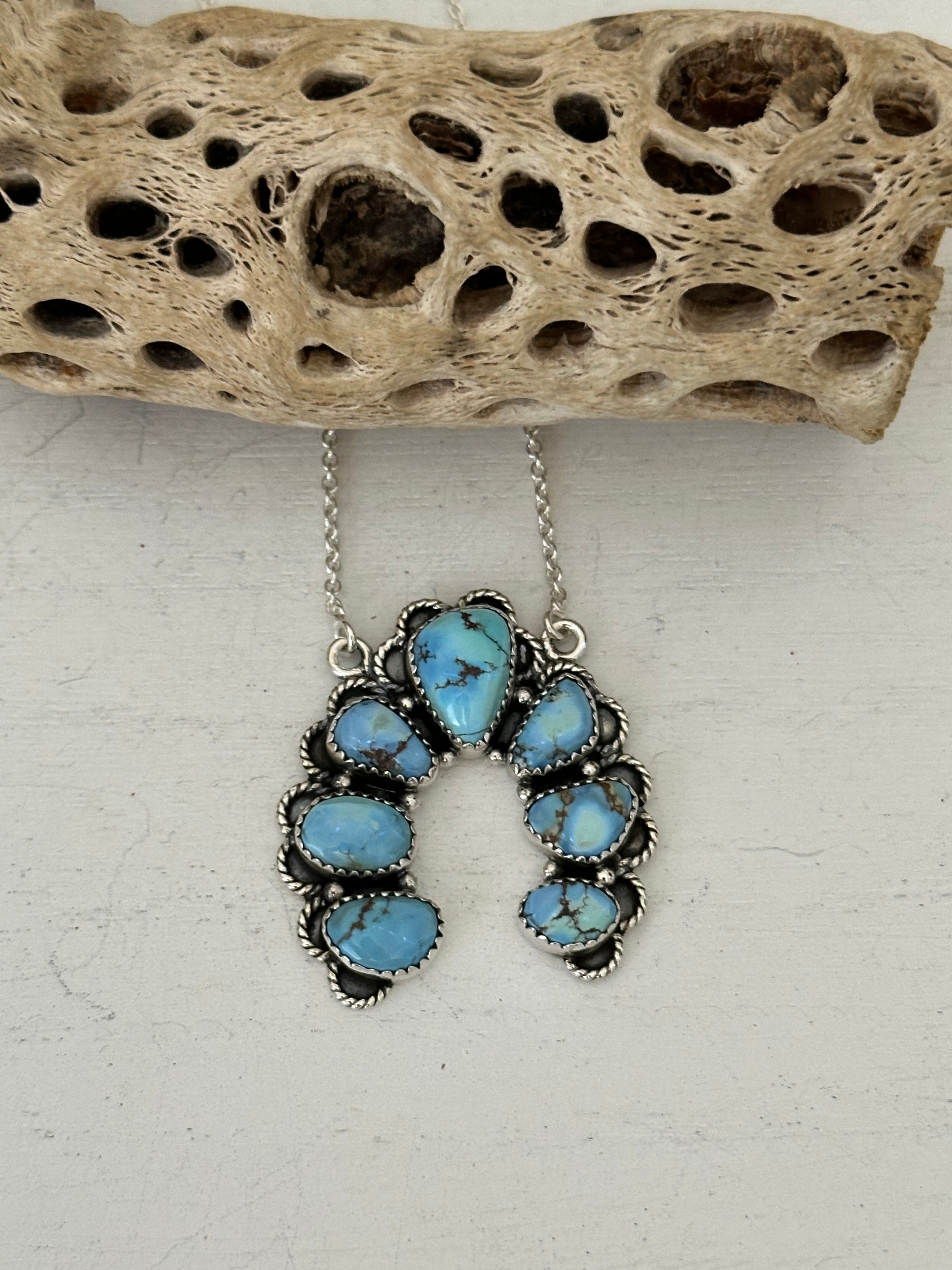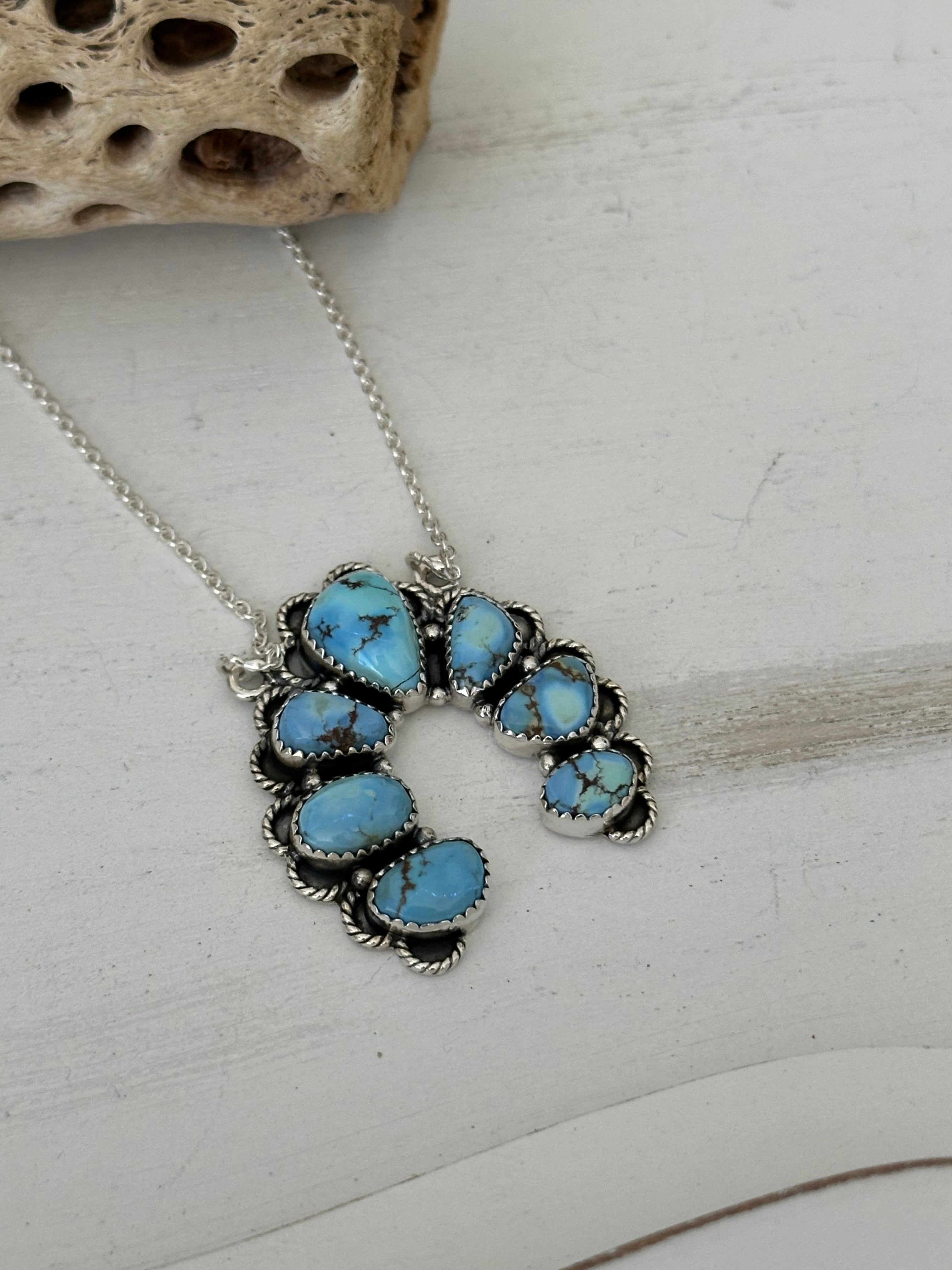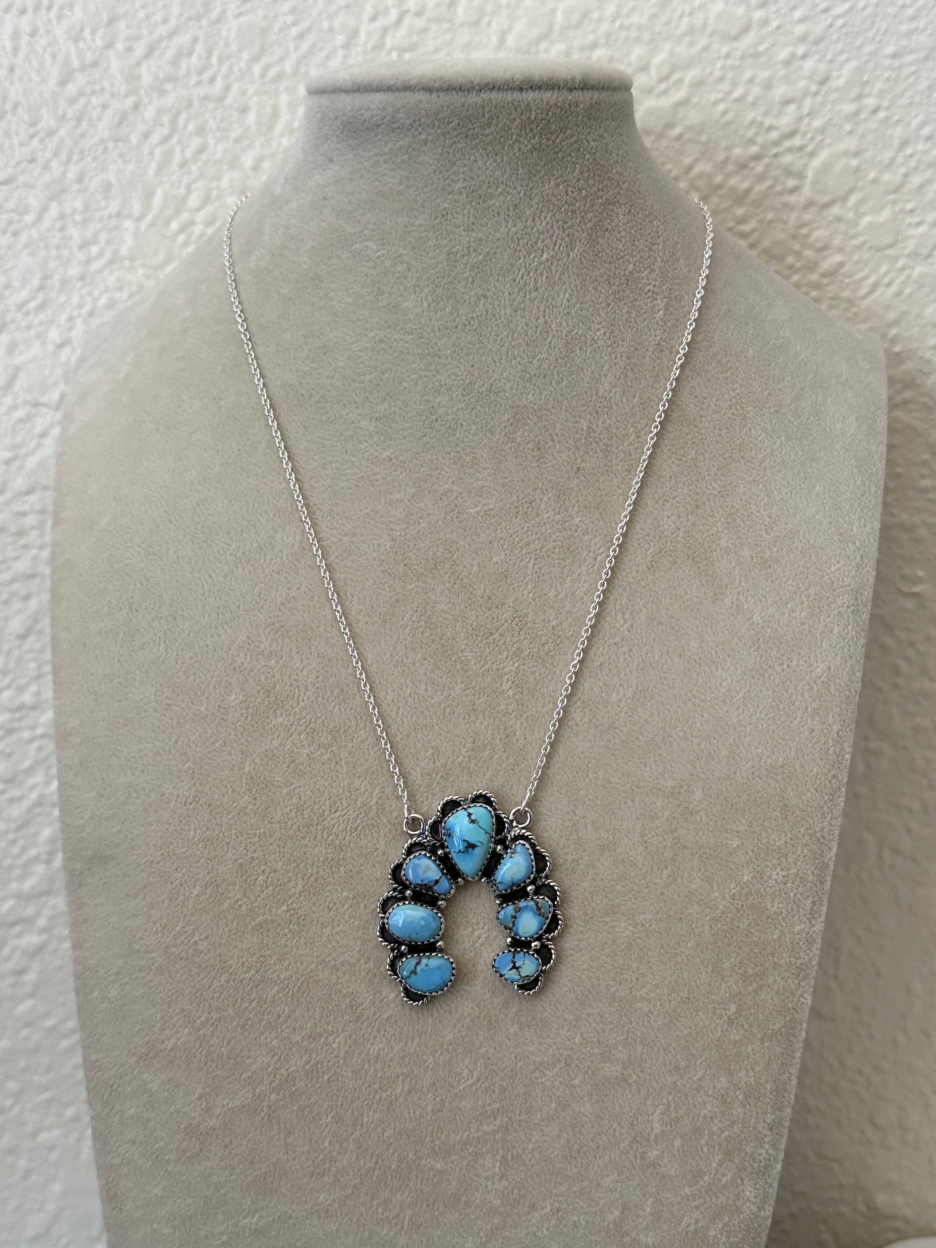 Beautiful necklace. Southwest Handmade Golden Hills Turquoise & Sterling Silver Cluster Naja Necklace. It measures 22 inches long with hang while the chain by itself measures 19 inches long but can be adjusted down to 16 1/2 inches long. Signed by the artist and stamped sterling silver.