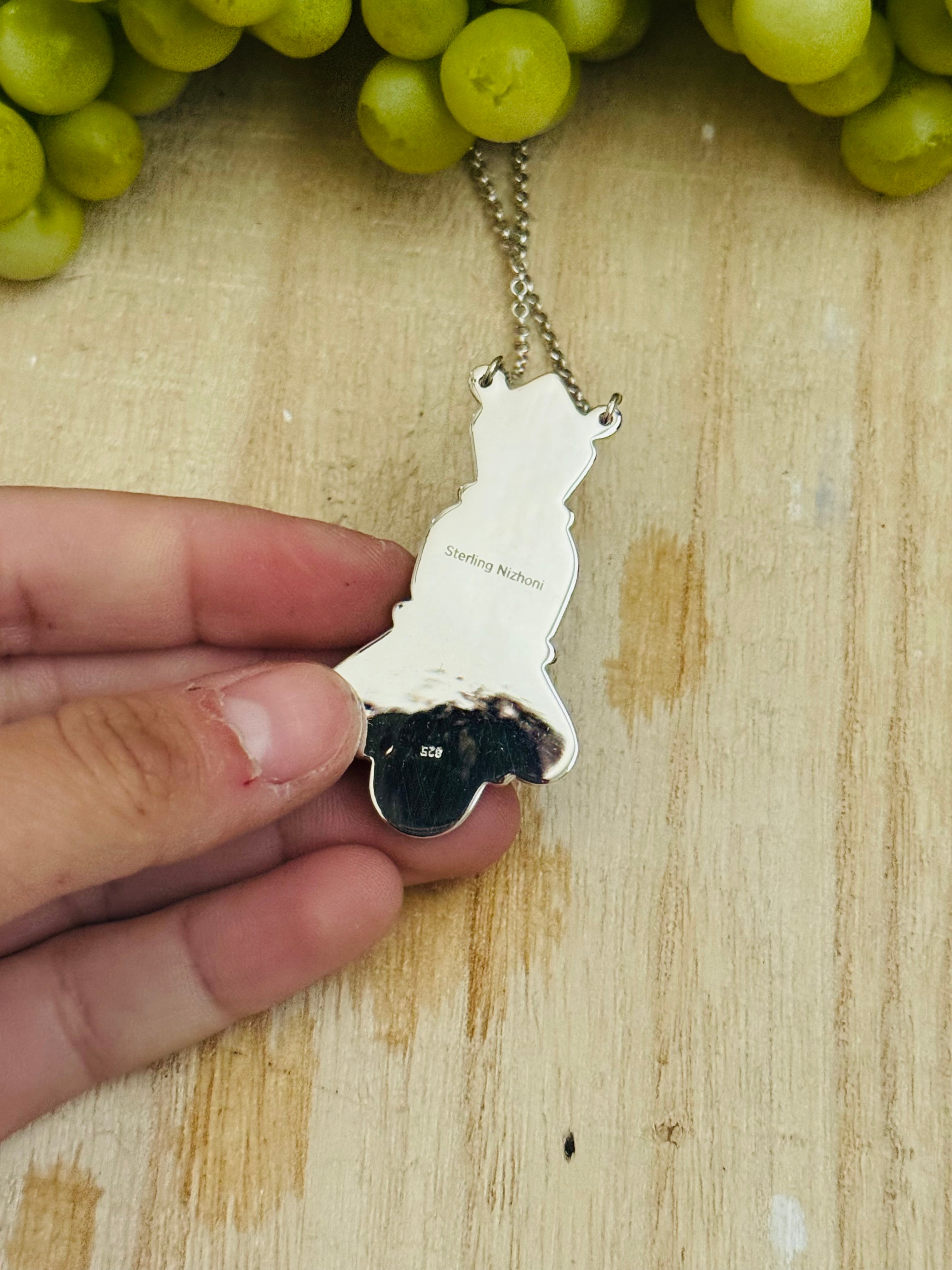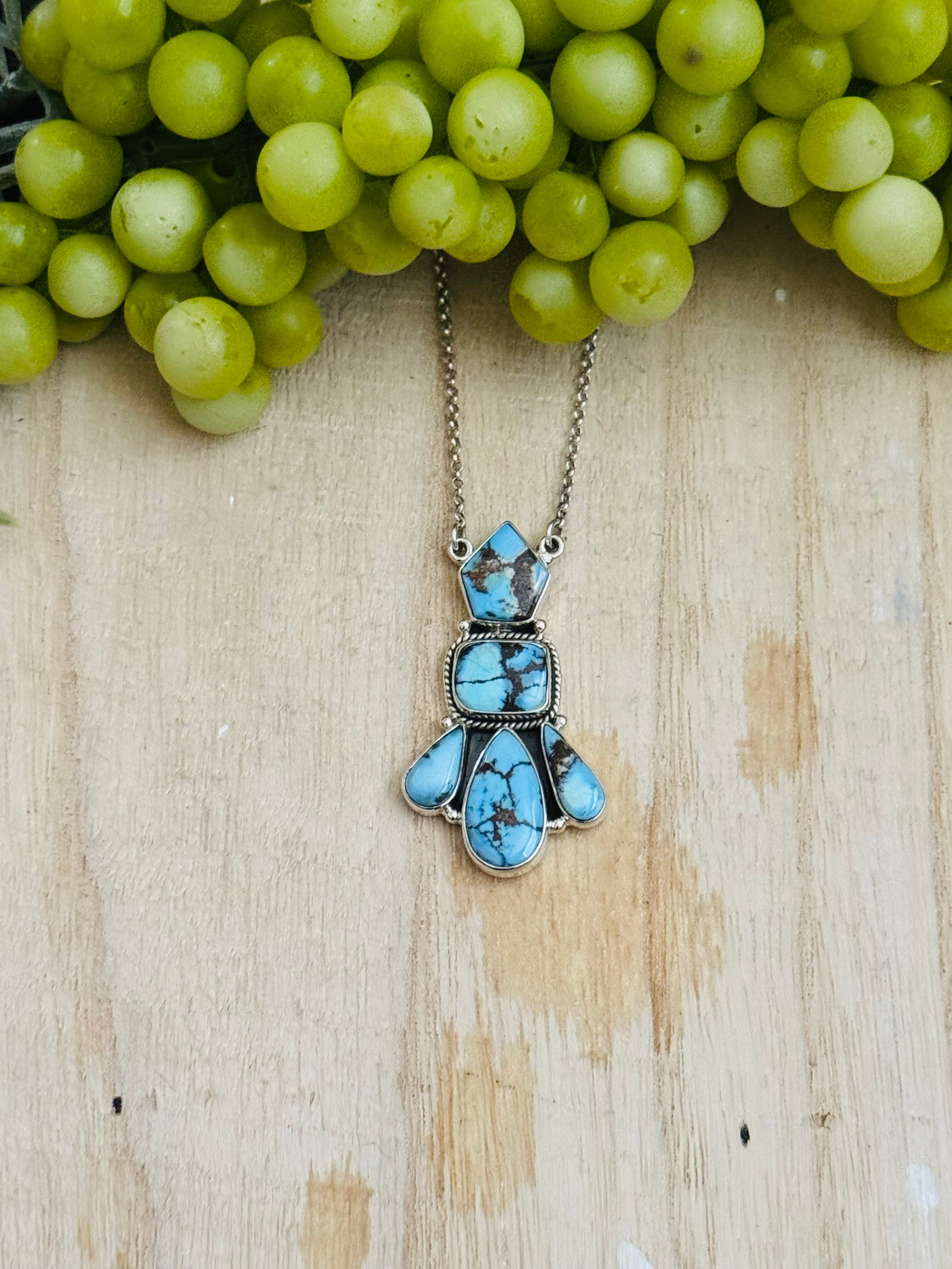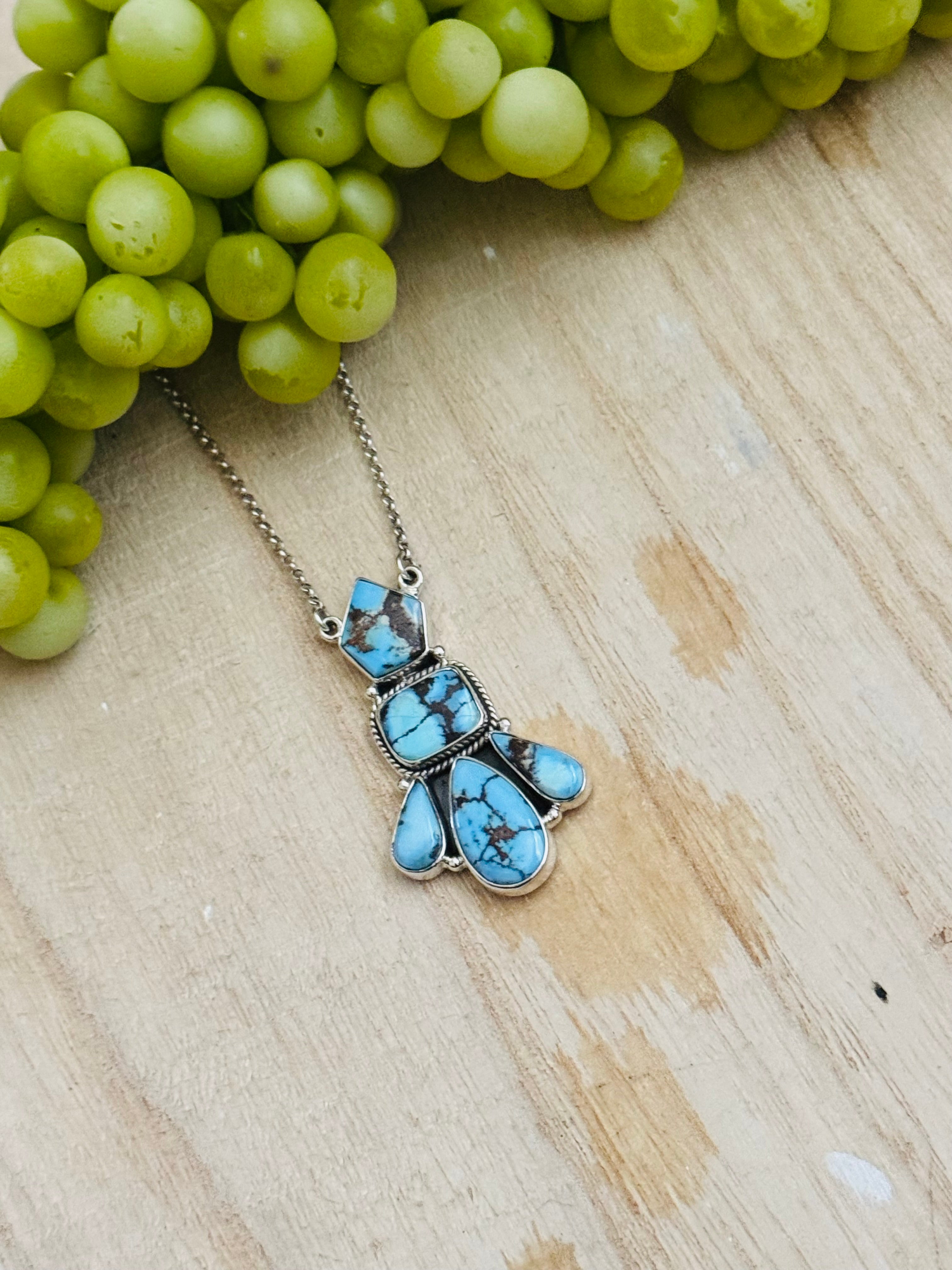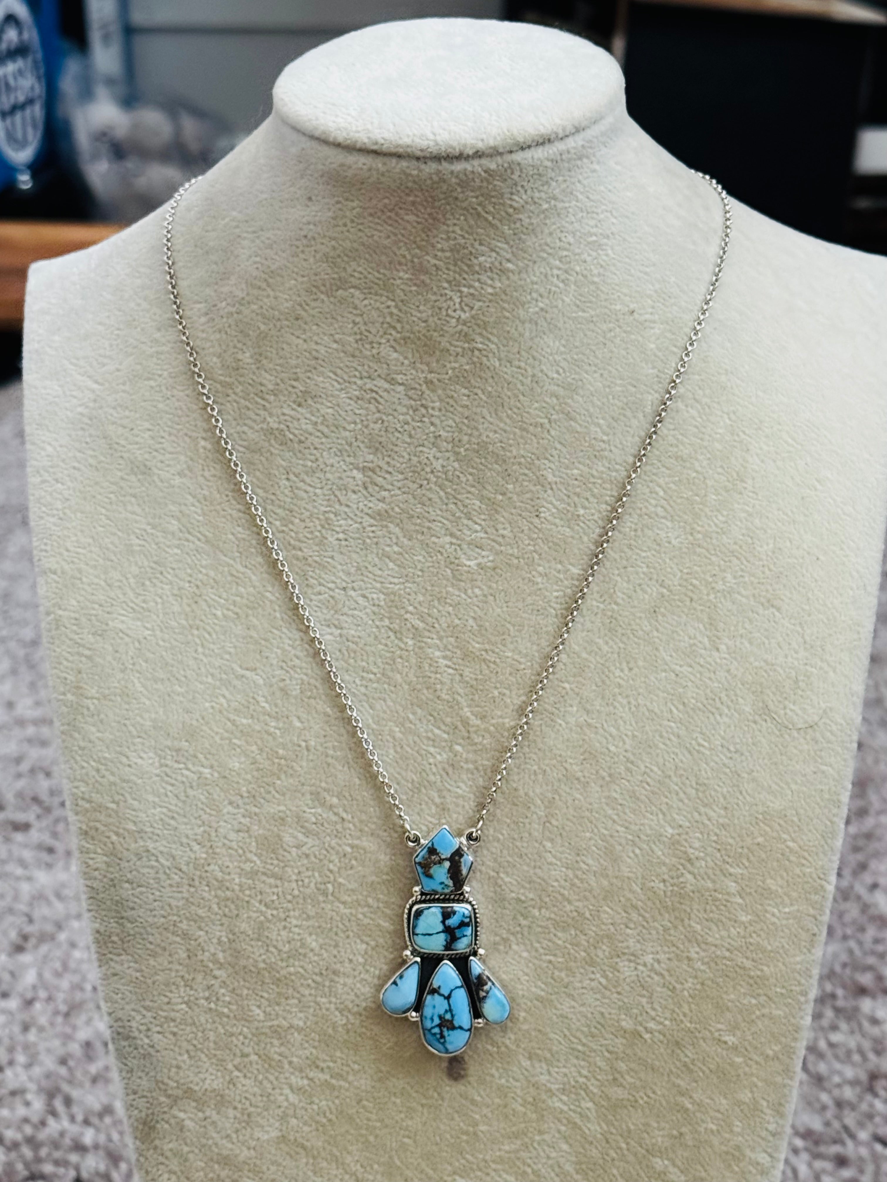 Beautiful necklace. Southwest Handmade Golden Hills Turquoise & Sterling Silver Cluster Necklace. It measures 22 inches long with hang while the chain by itself measures 18 inches long but can be adjusted down. Signed by the artist and stamped sterling silver.