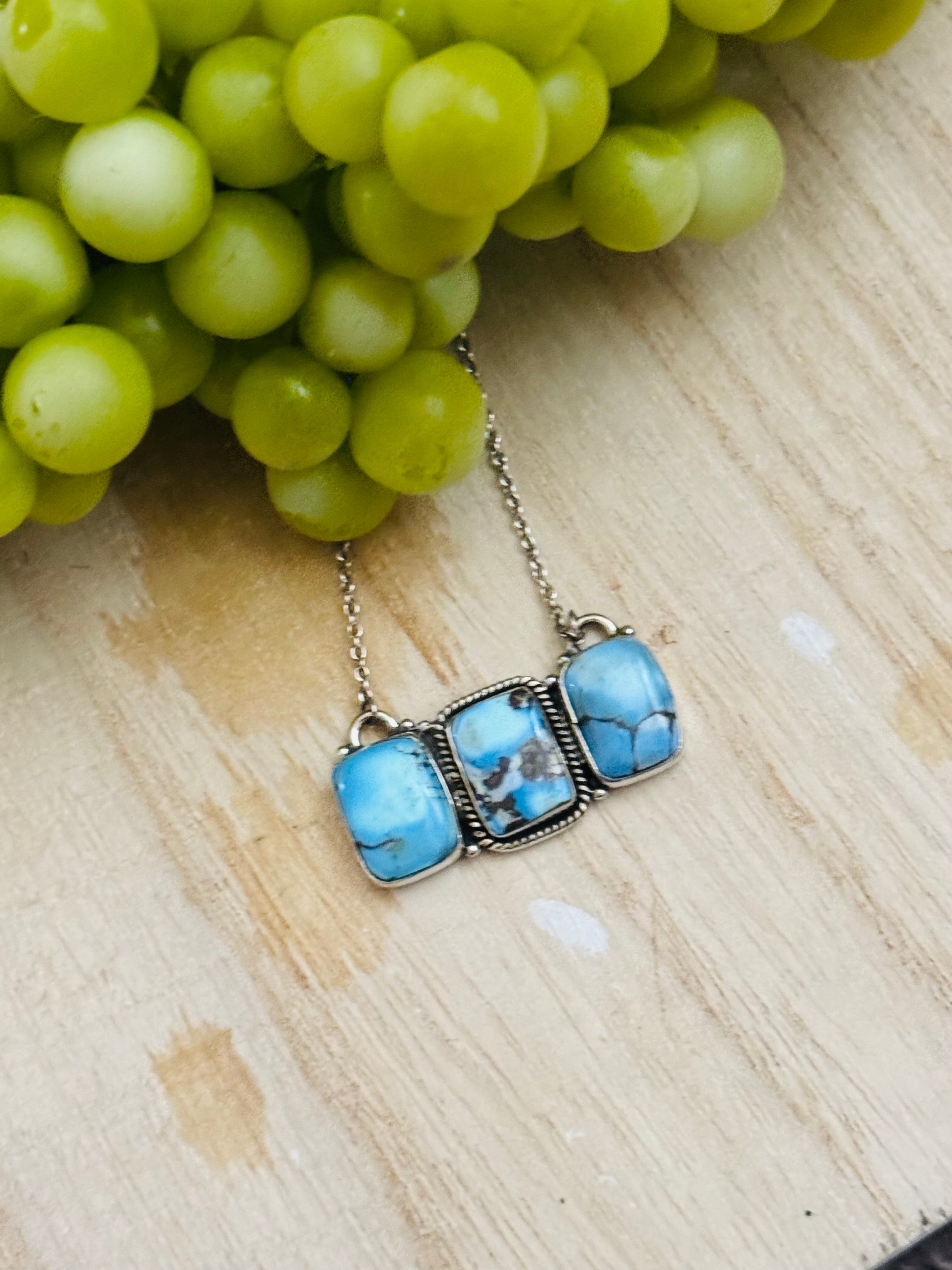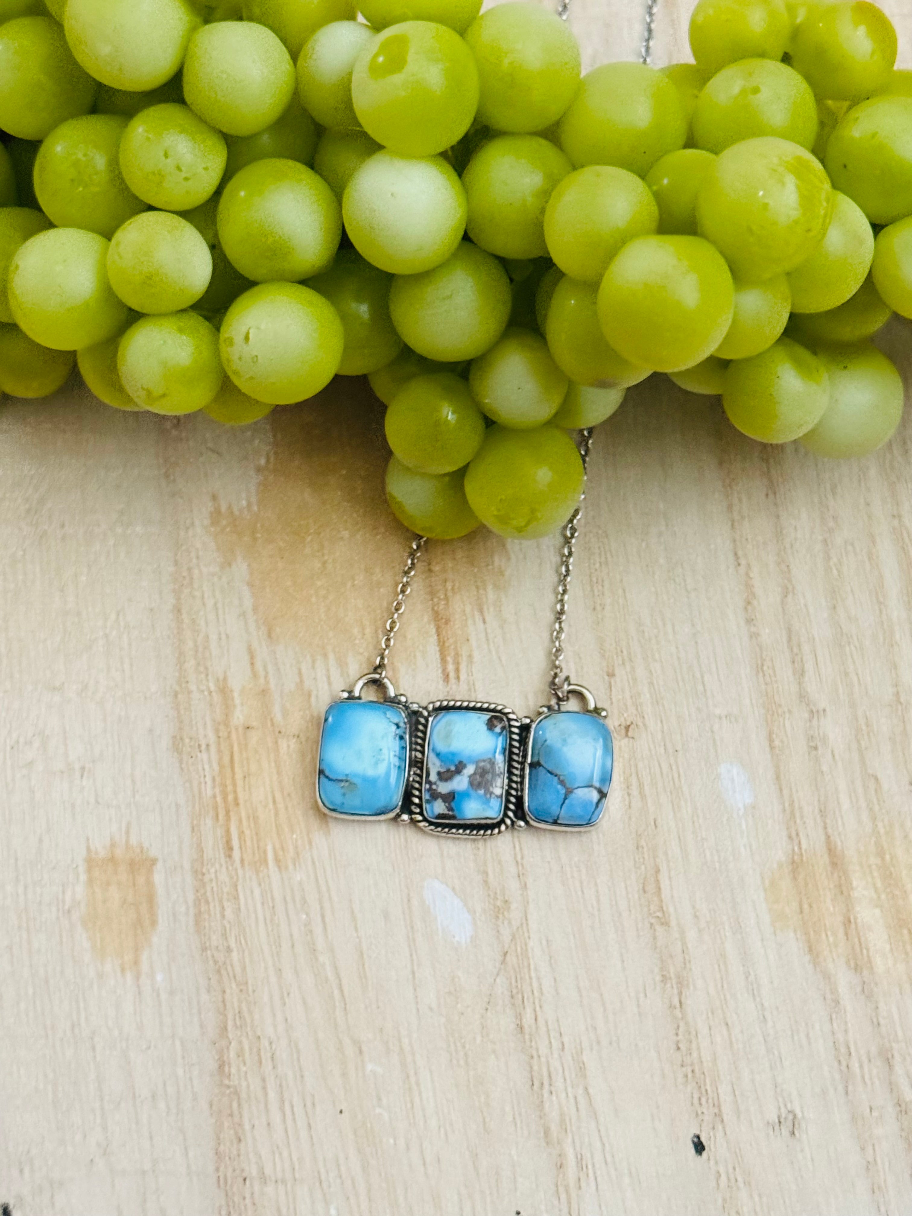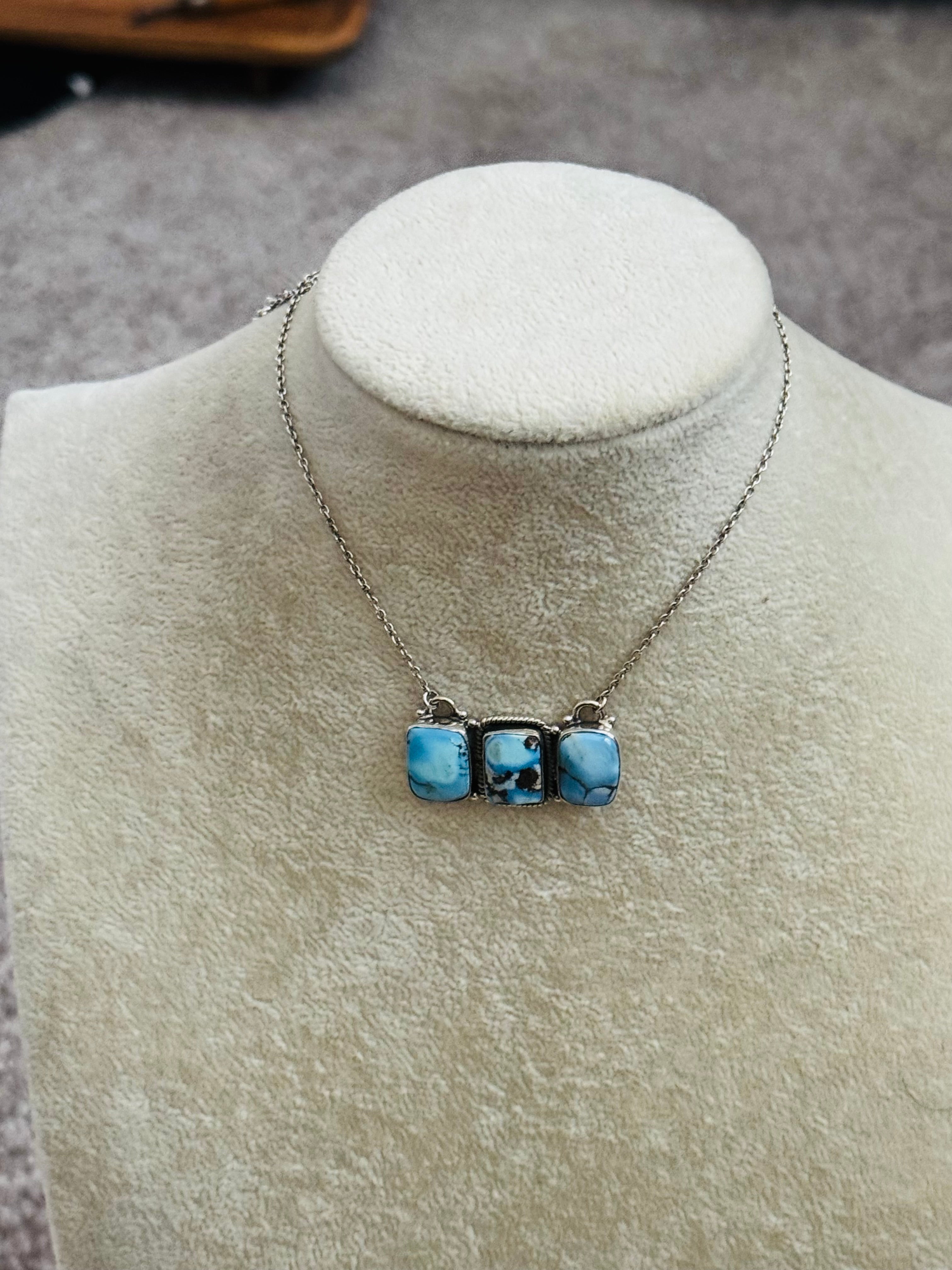 Beautiful necklace. Southwest Handmade Golden Hills Turquoise & Sterling Silver Cluster Necklace. It measures 19 inches long with hang while the chain by itself measures 18 inches long but can be adjusted down. Signed by the artist and stamped sterling silver. Stones will differ due to natural stones.