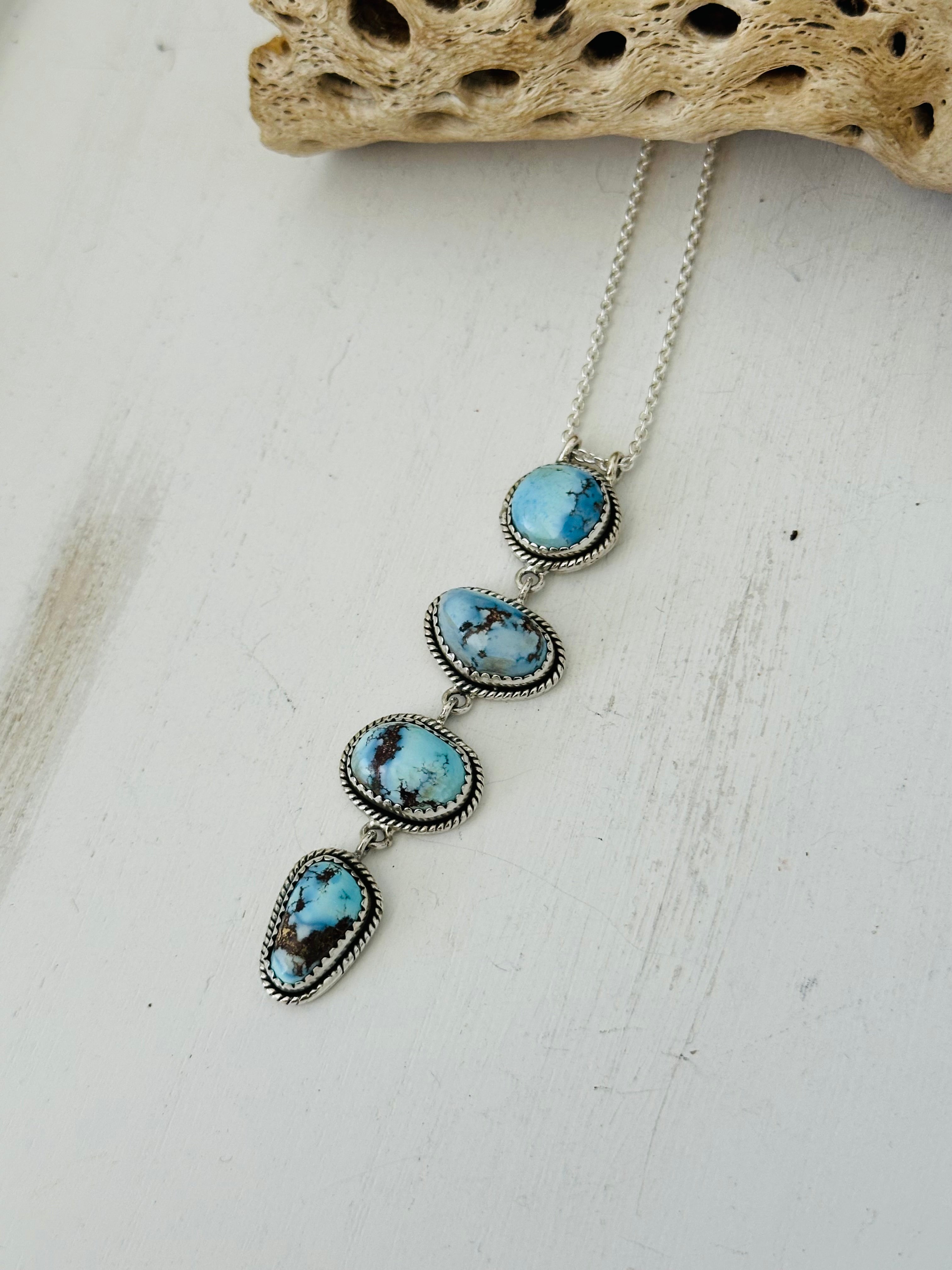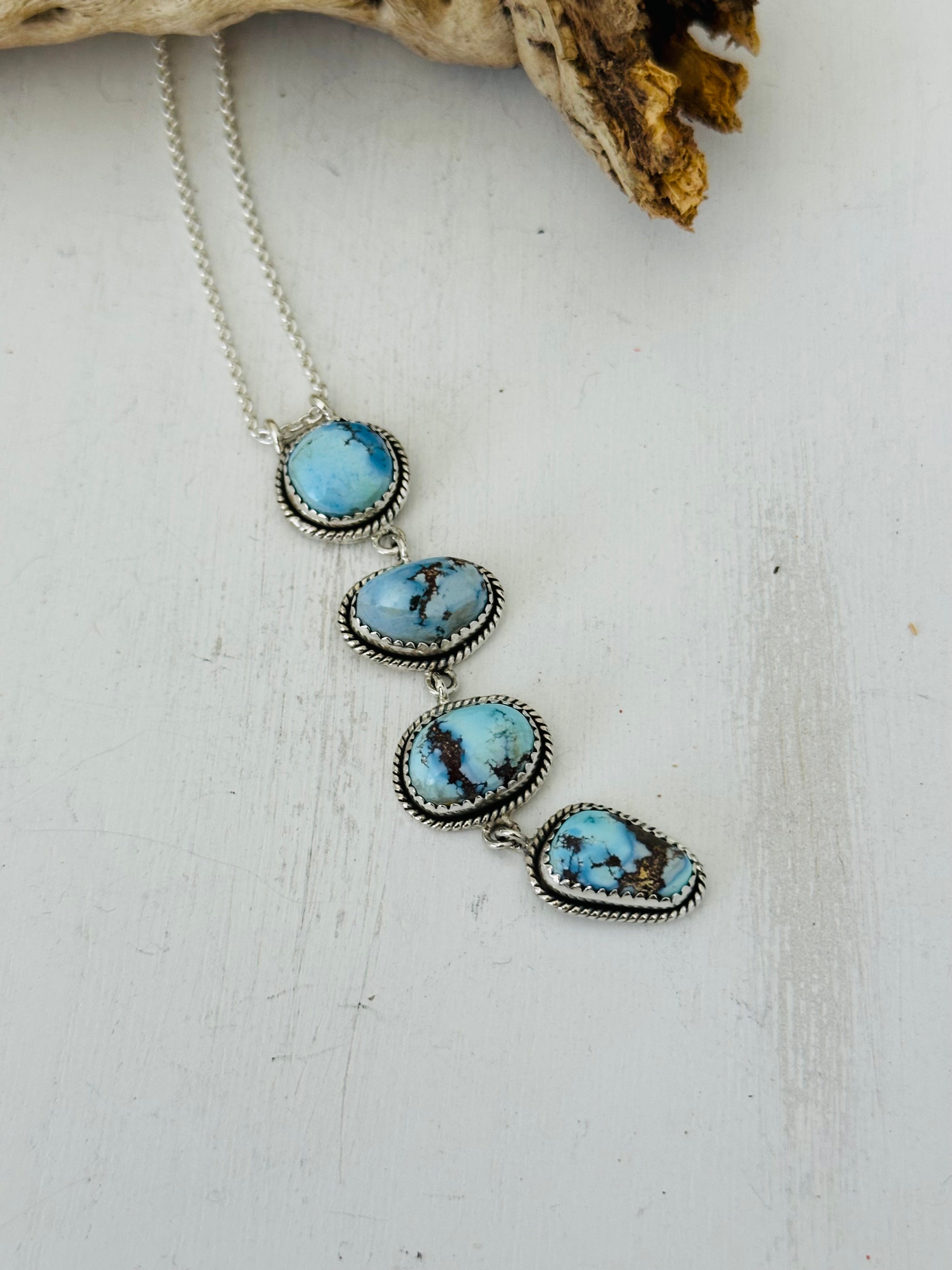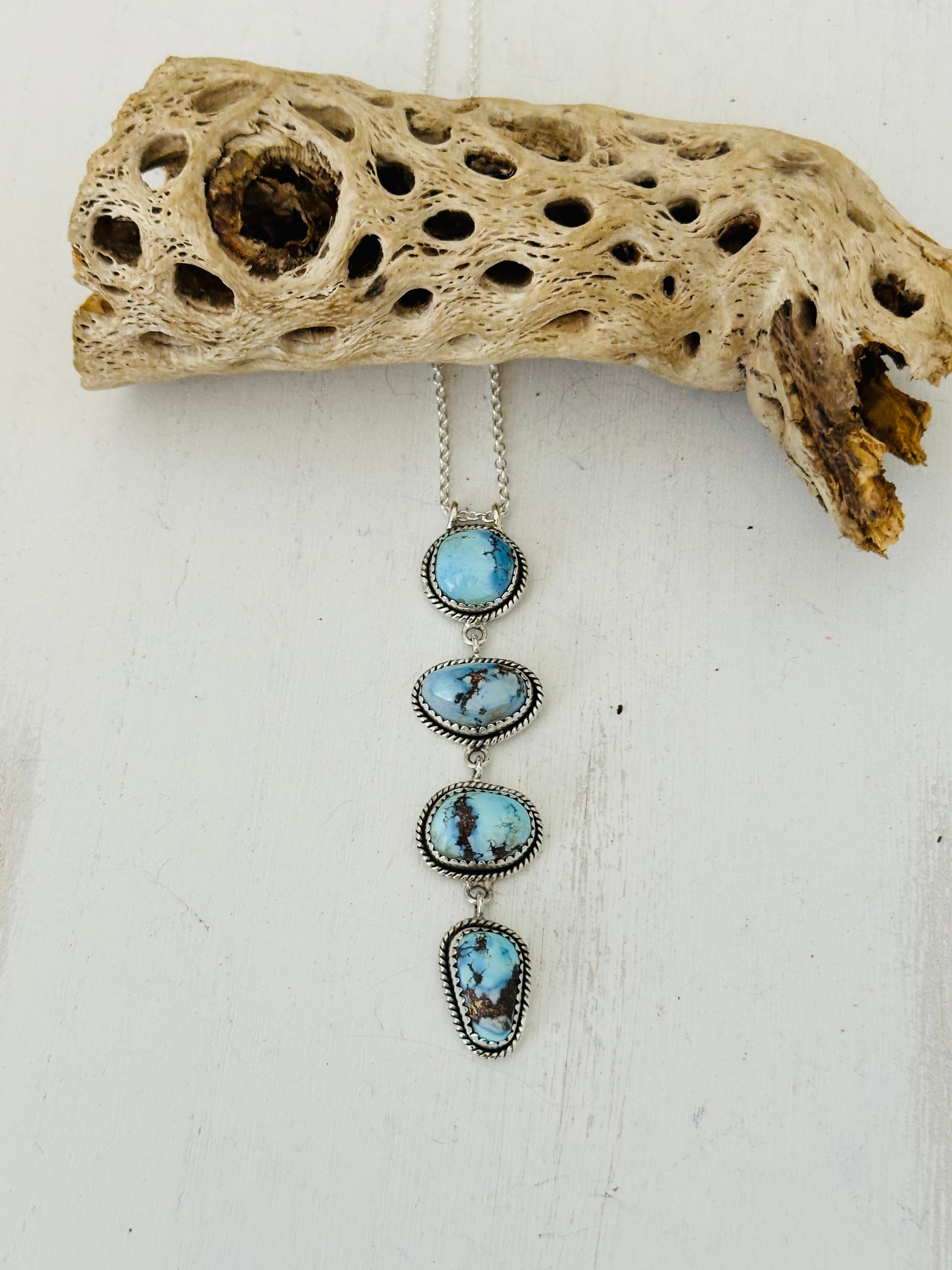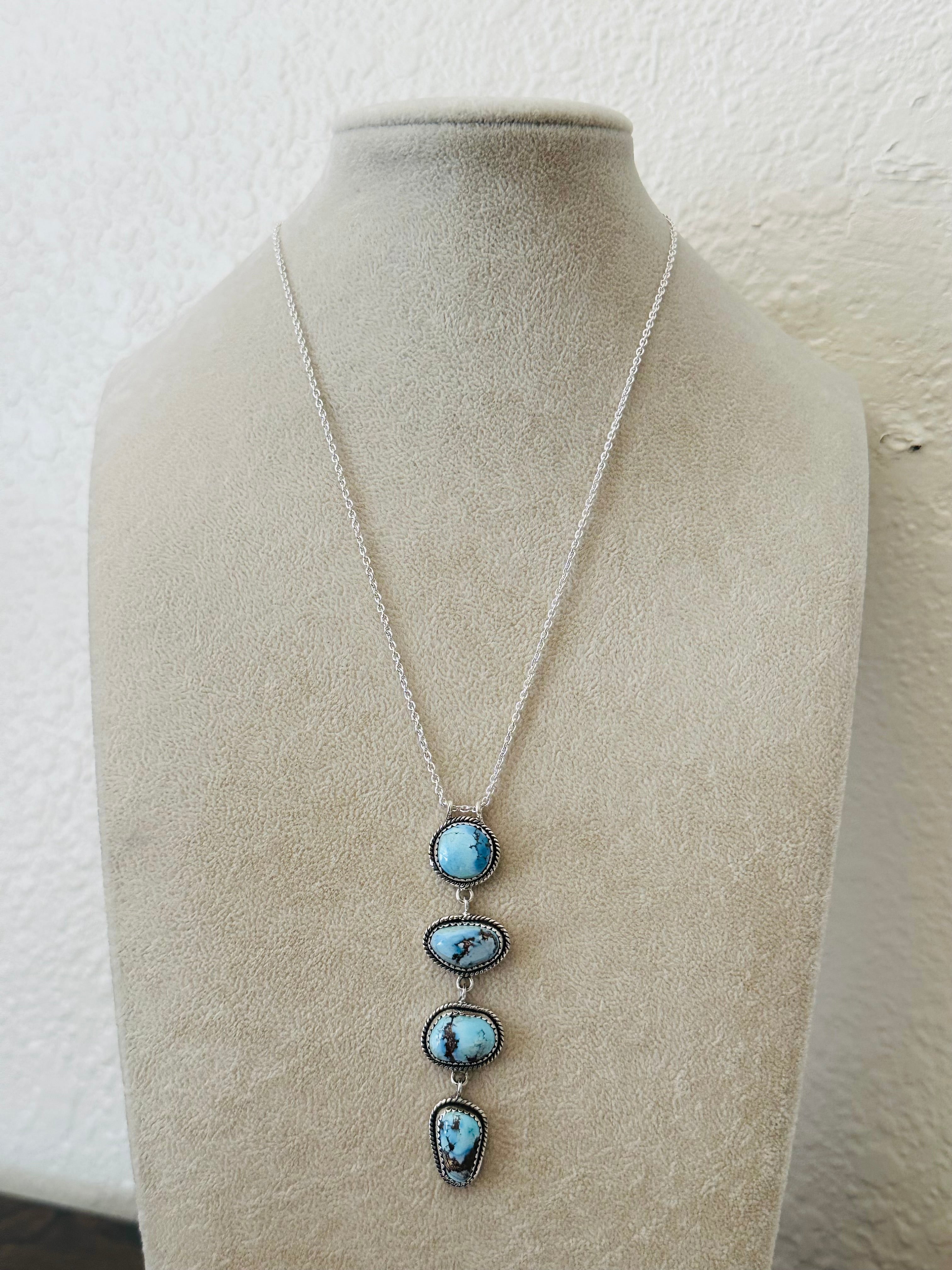 Beautiful necklace. Southwest Handmade Golden Hills Turquoise & Sterling Silver Necklace. It measures 25 1/2 inches long with hang while the chain by itself measures 19 inches long but can be adjusted down to 16 1/2 inches long. Signed by the artist and stamped sterling silver.