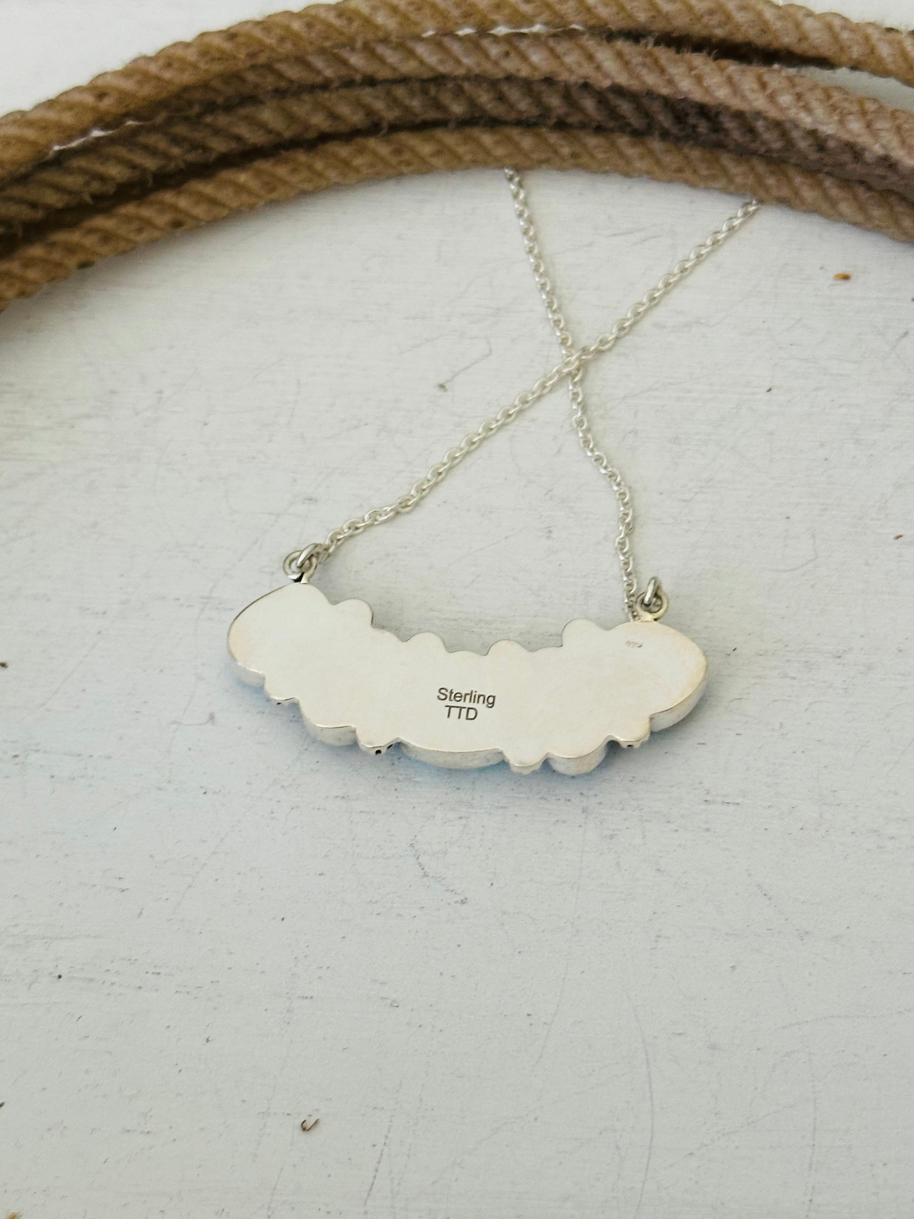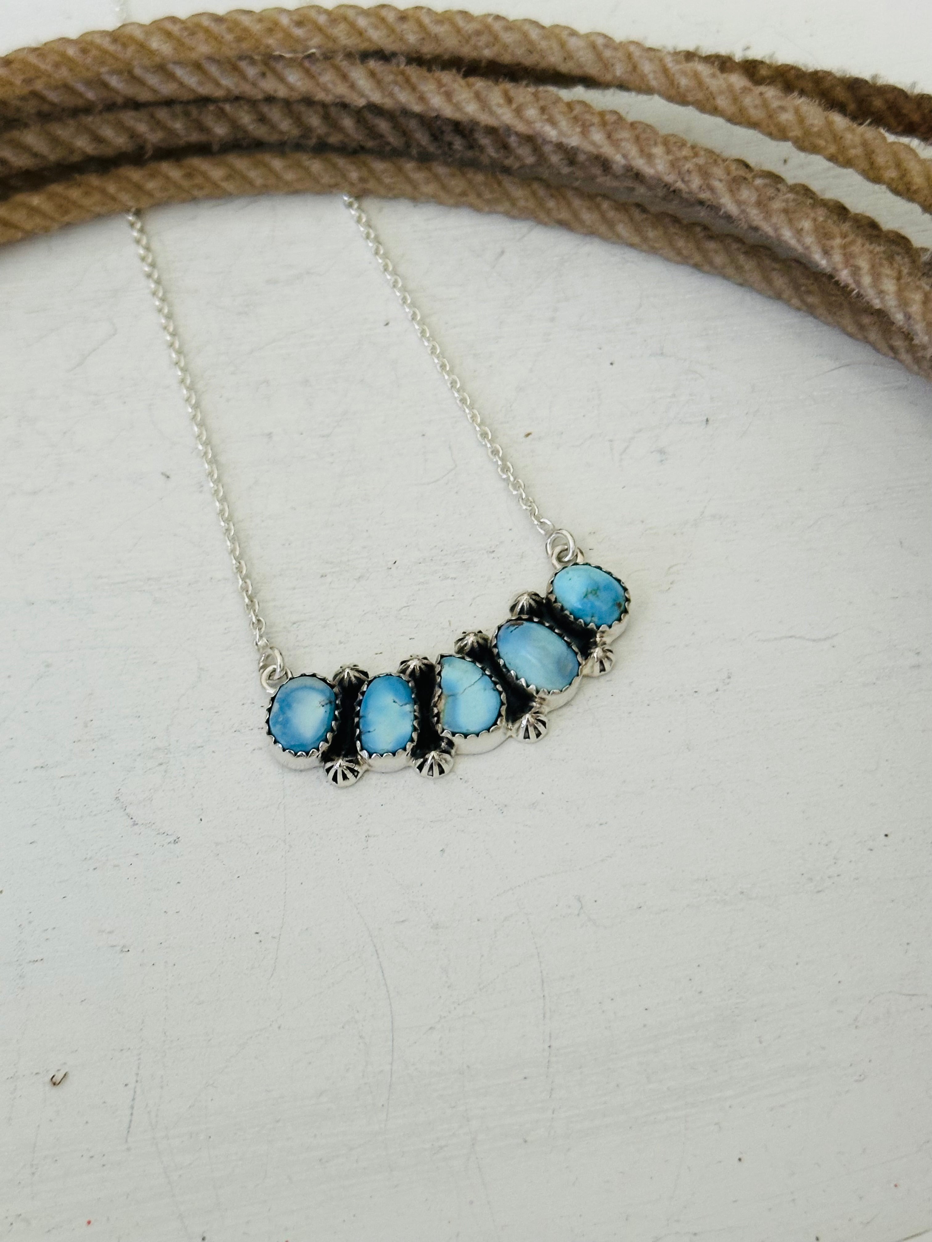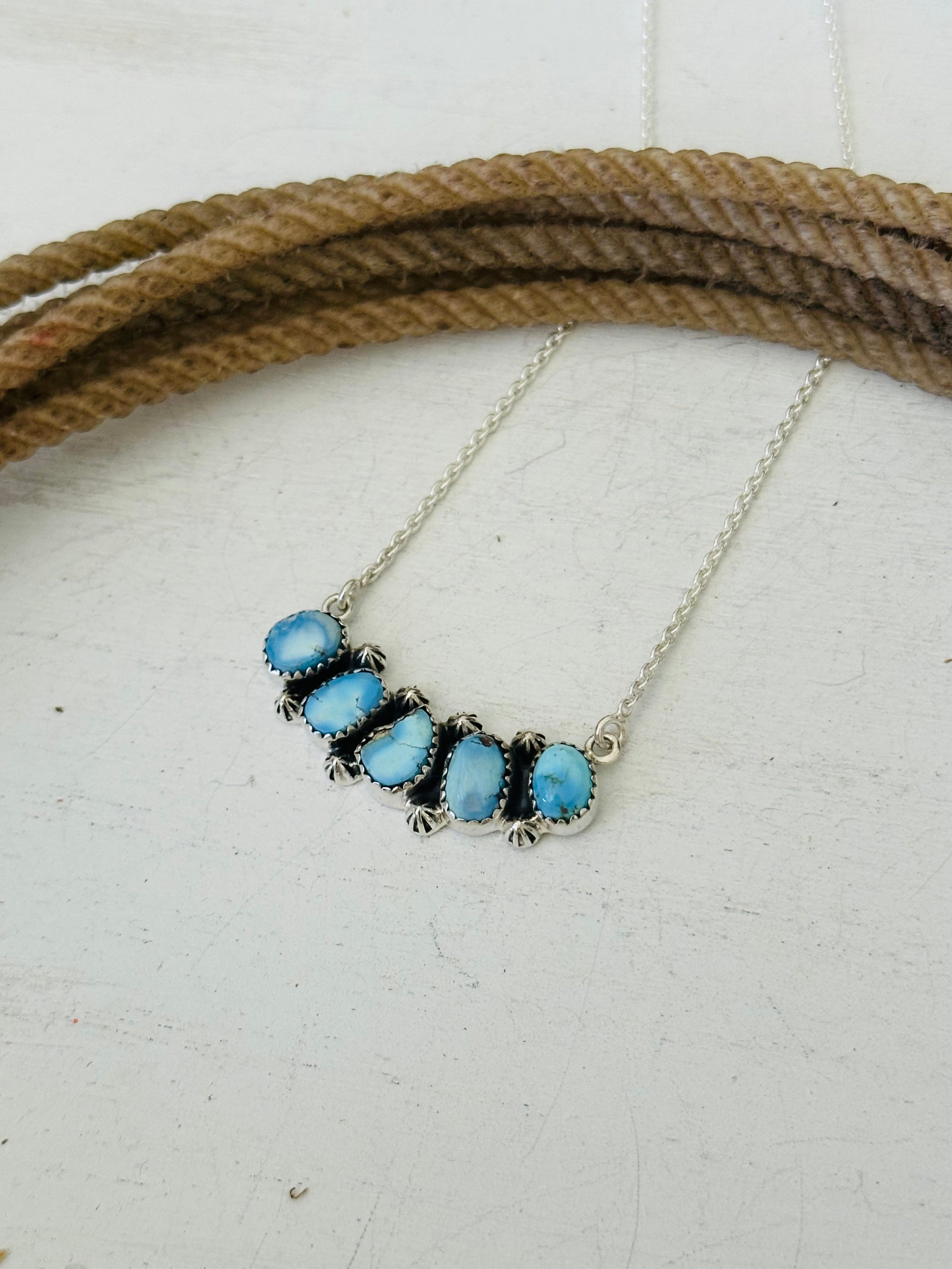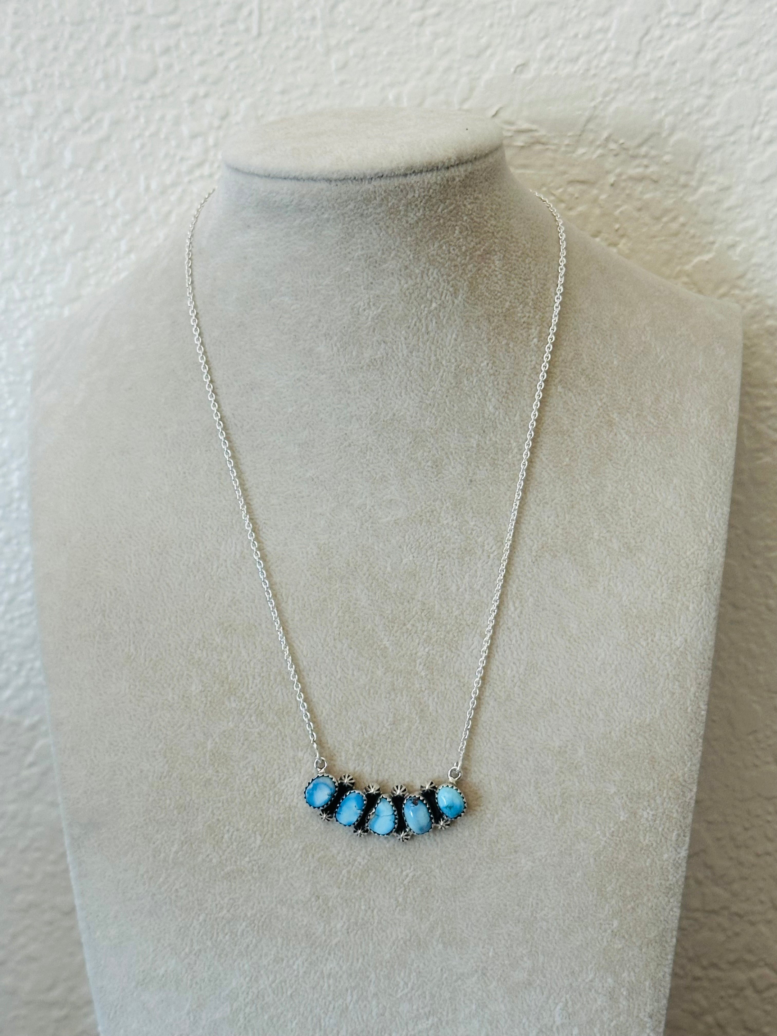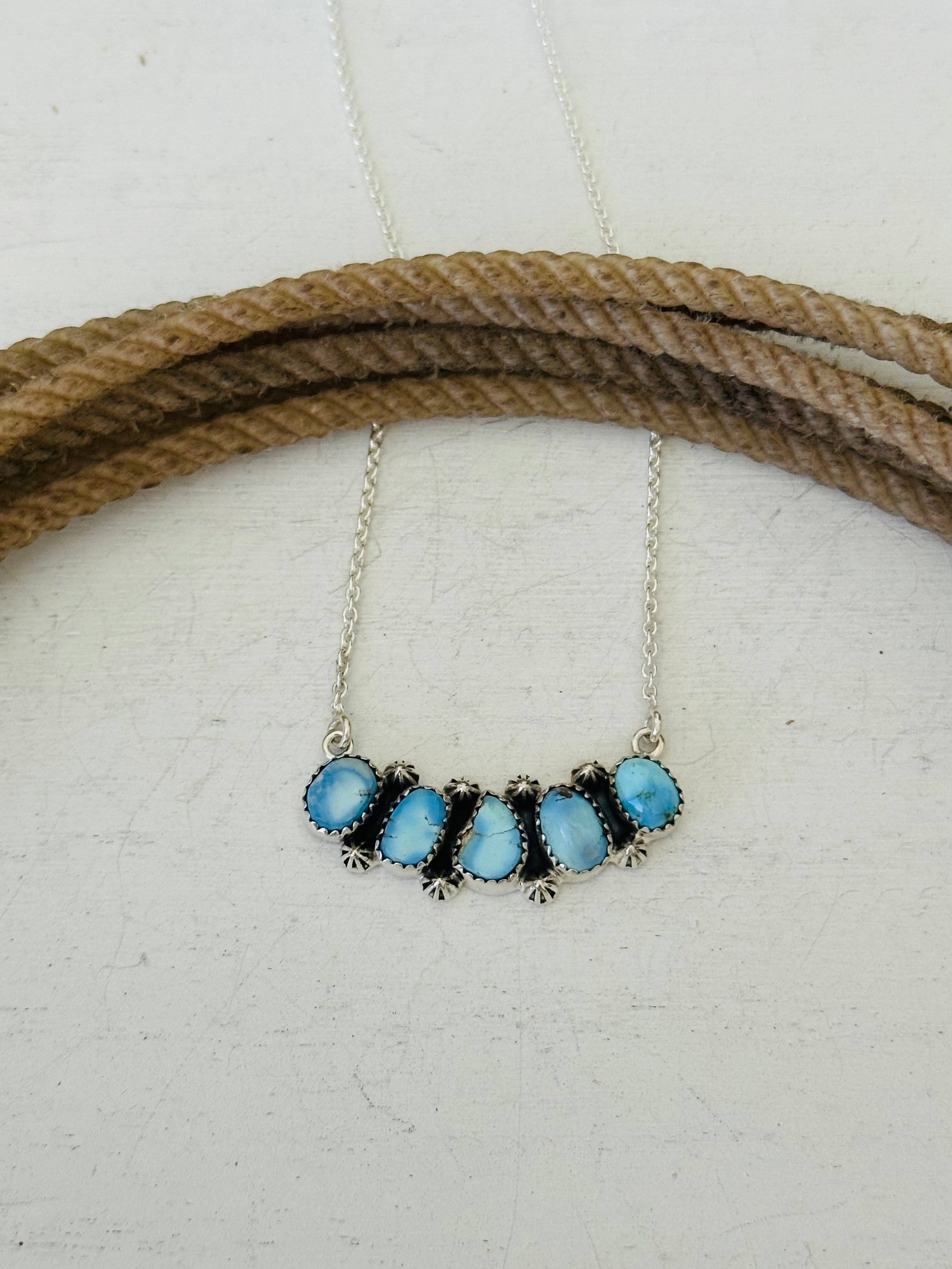 Beautiful necklace. Southwest Handmade Golden Hills Turquoise & Sterling Silver Necklace. It measures 20 1/2 inches long with hang while the chain by itself measures 19 inches long but can be adjusted down to 16 1/2 inches long. Signed by the artist and stamped sterling silver.
